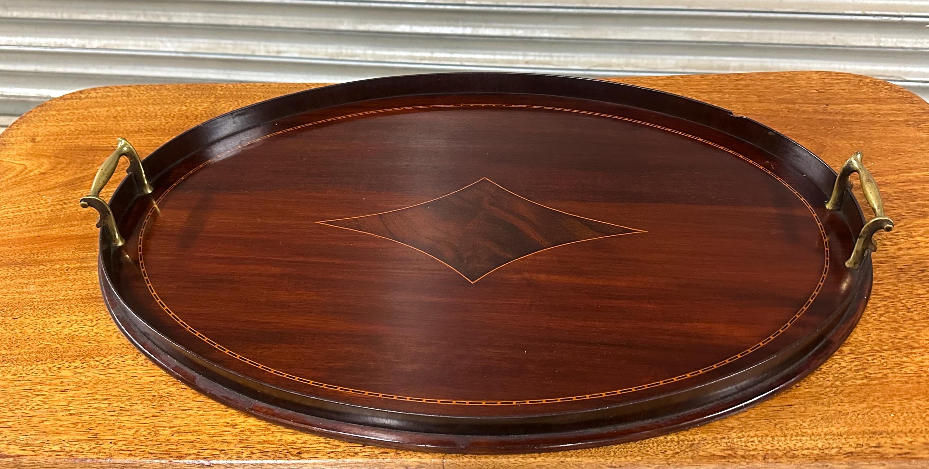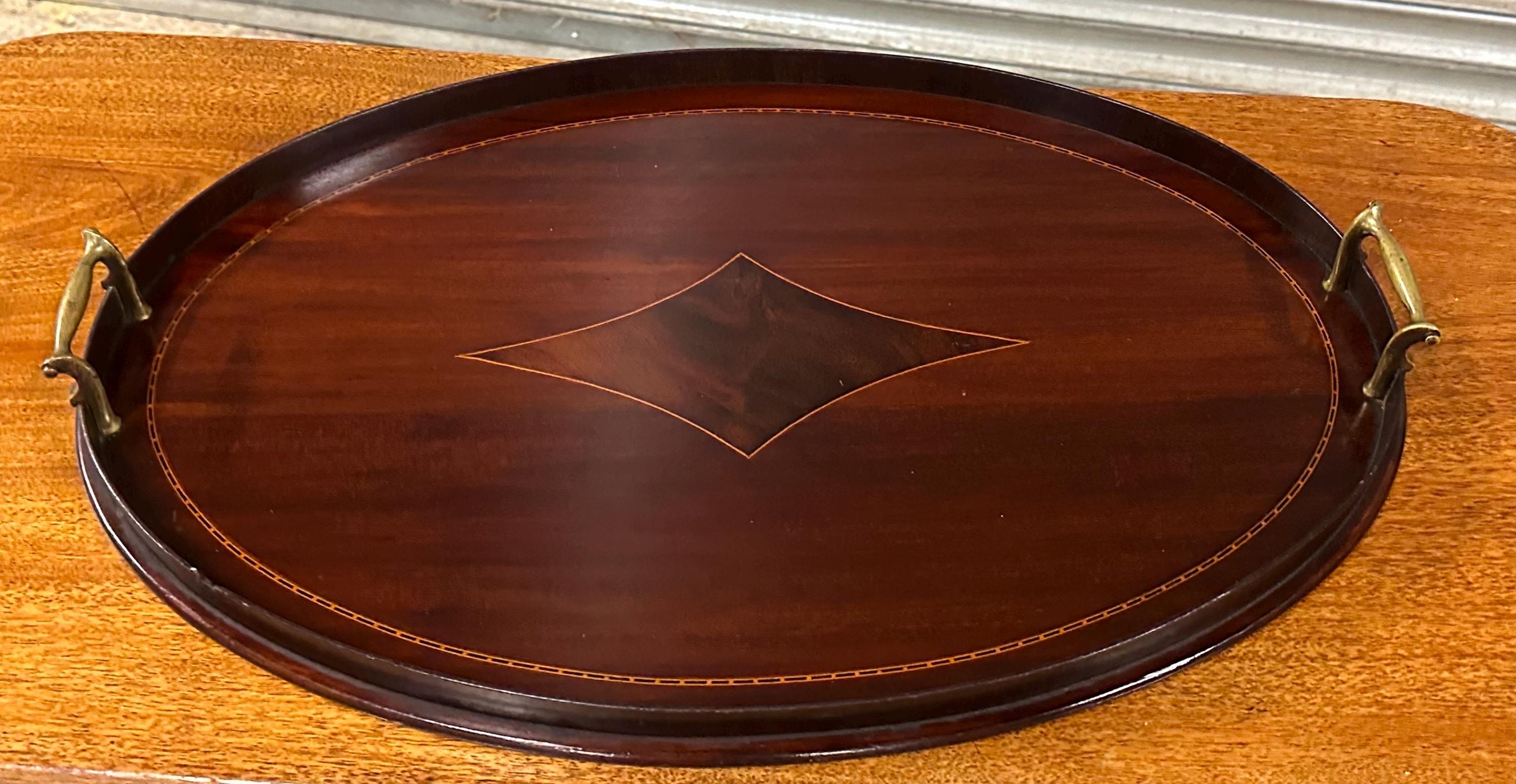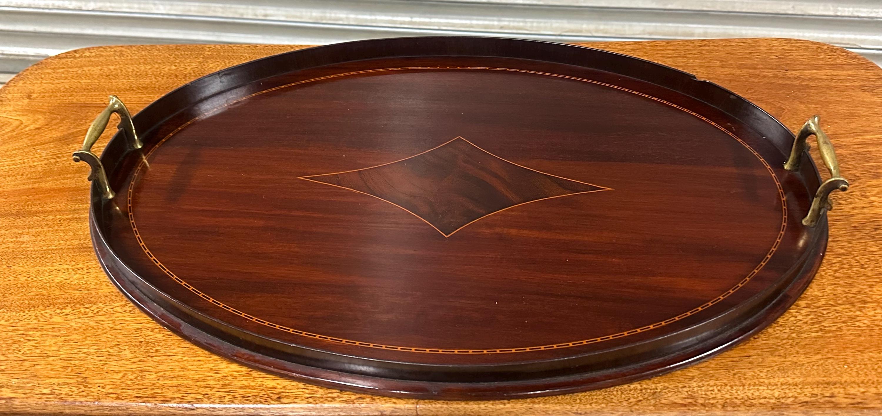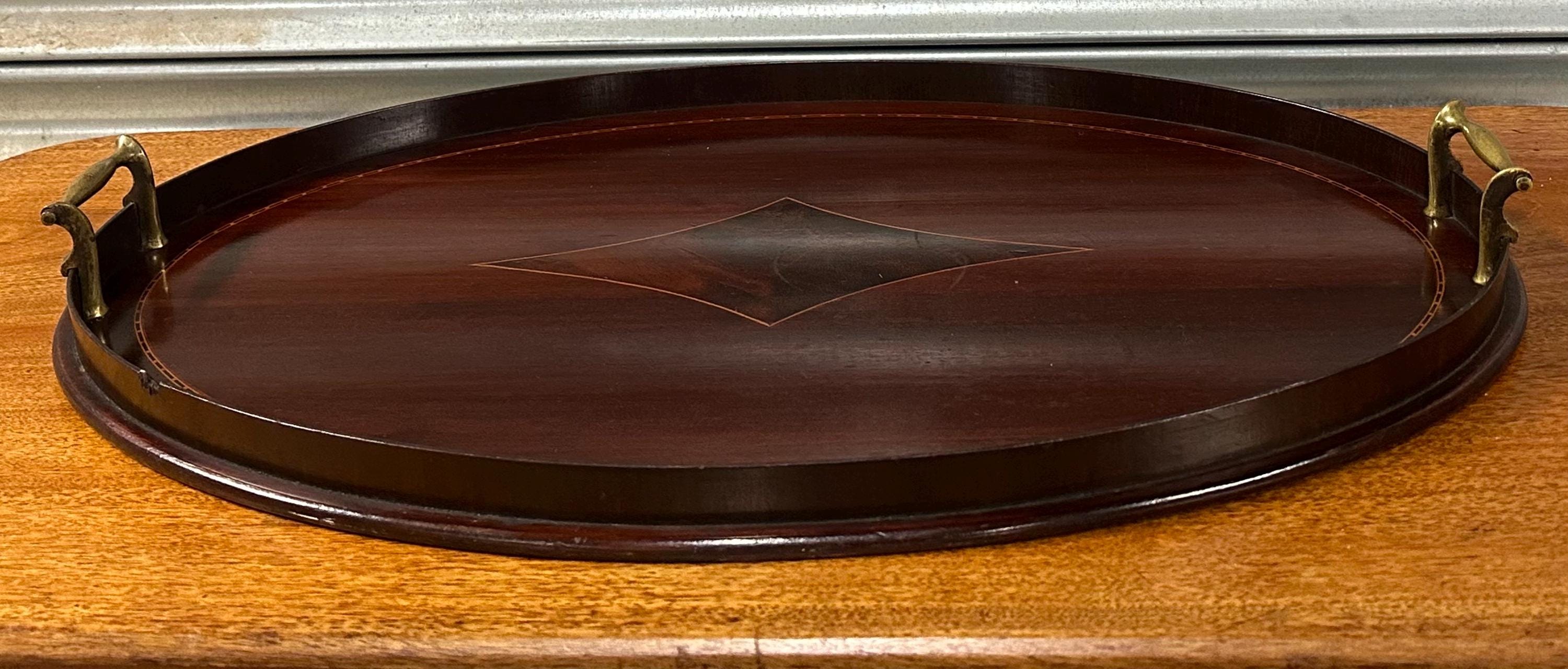 A handsome antique Edwardian oval mahogany serving tray, featuring elegant satinwood-style line inlay and a central diamond motif, finished with a raised gallery edge and original brass carrying handles to either side.