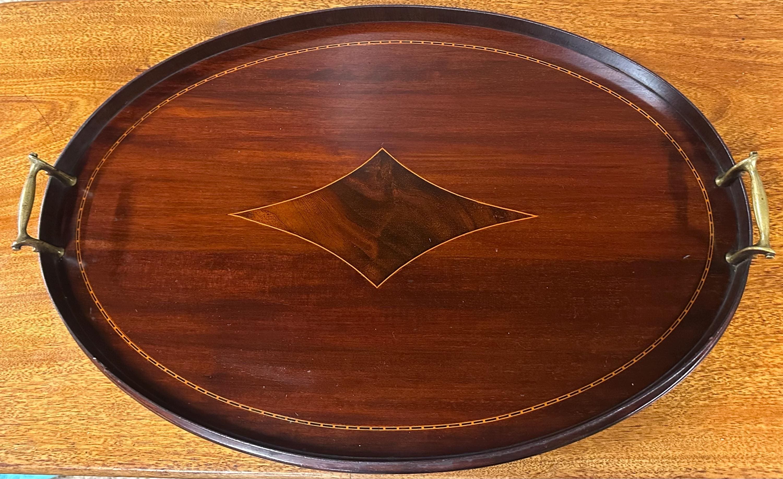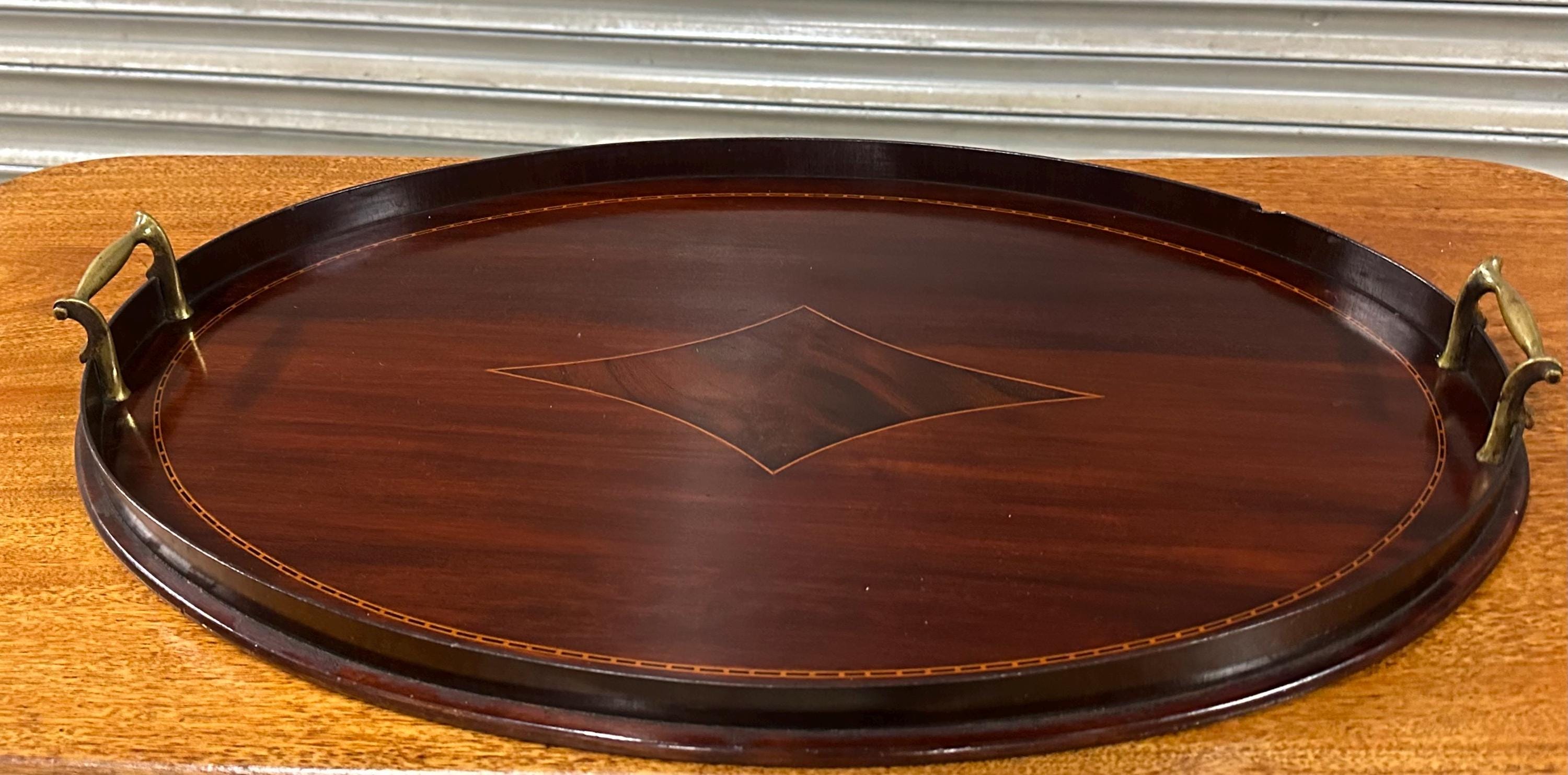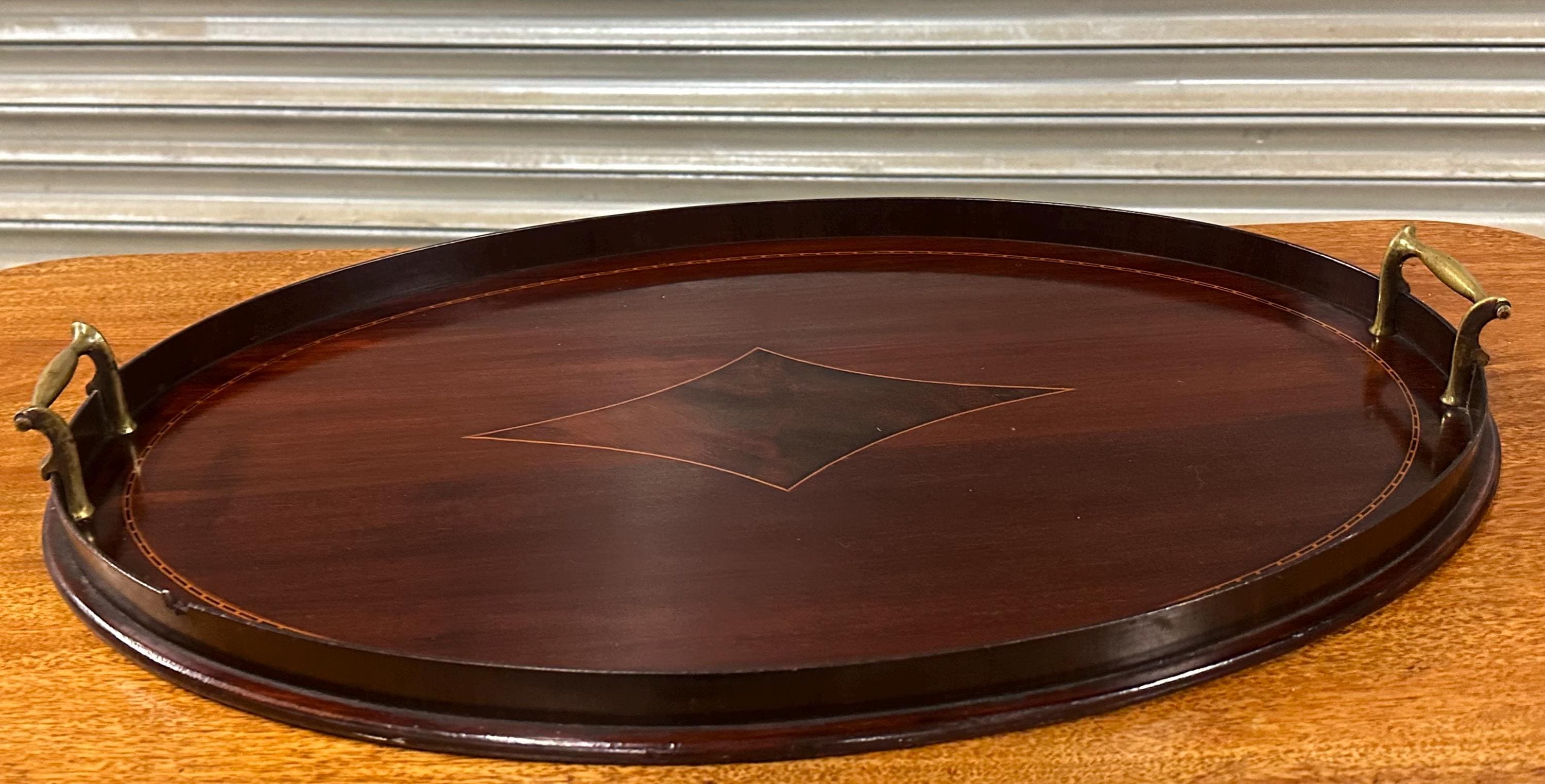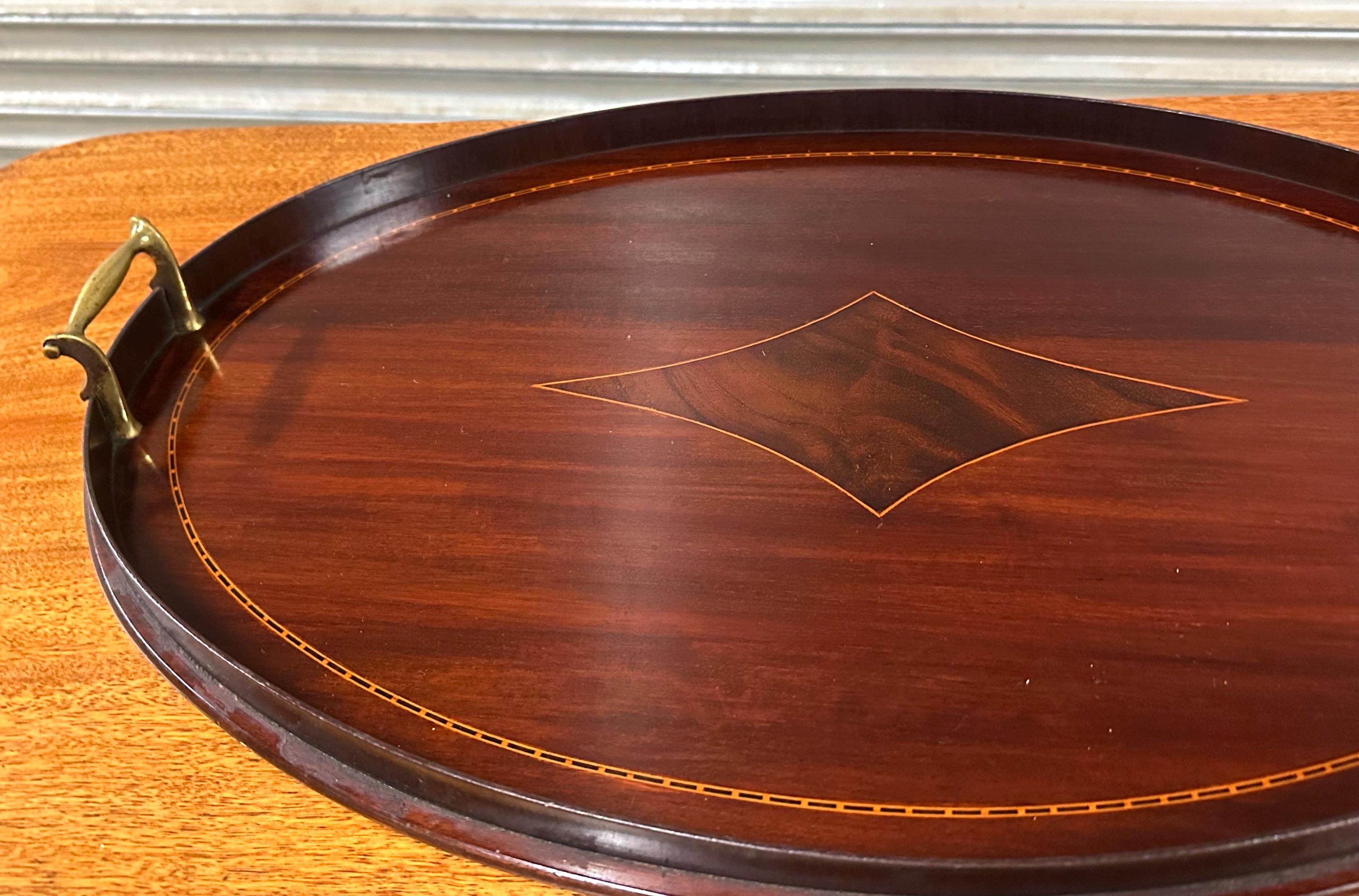 A handsome antique Edwardian oval mahogany serving tray, featuring elegant satinwood-style line inlay and a central diamond motif, finished with a raised gallery edge and original brass carrying handles to either side.