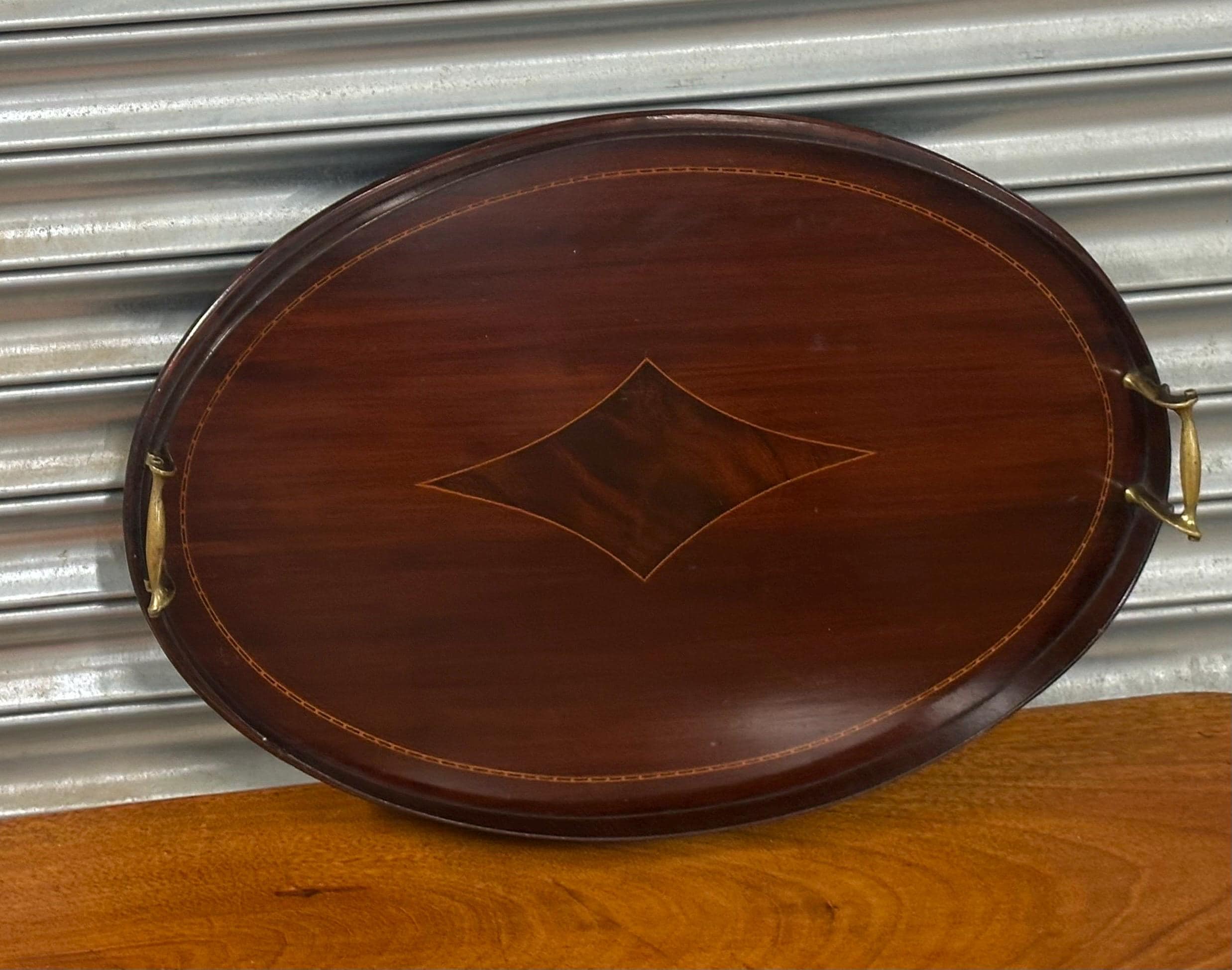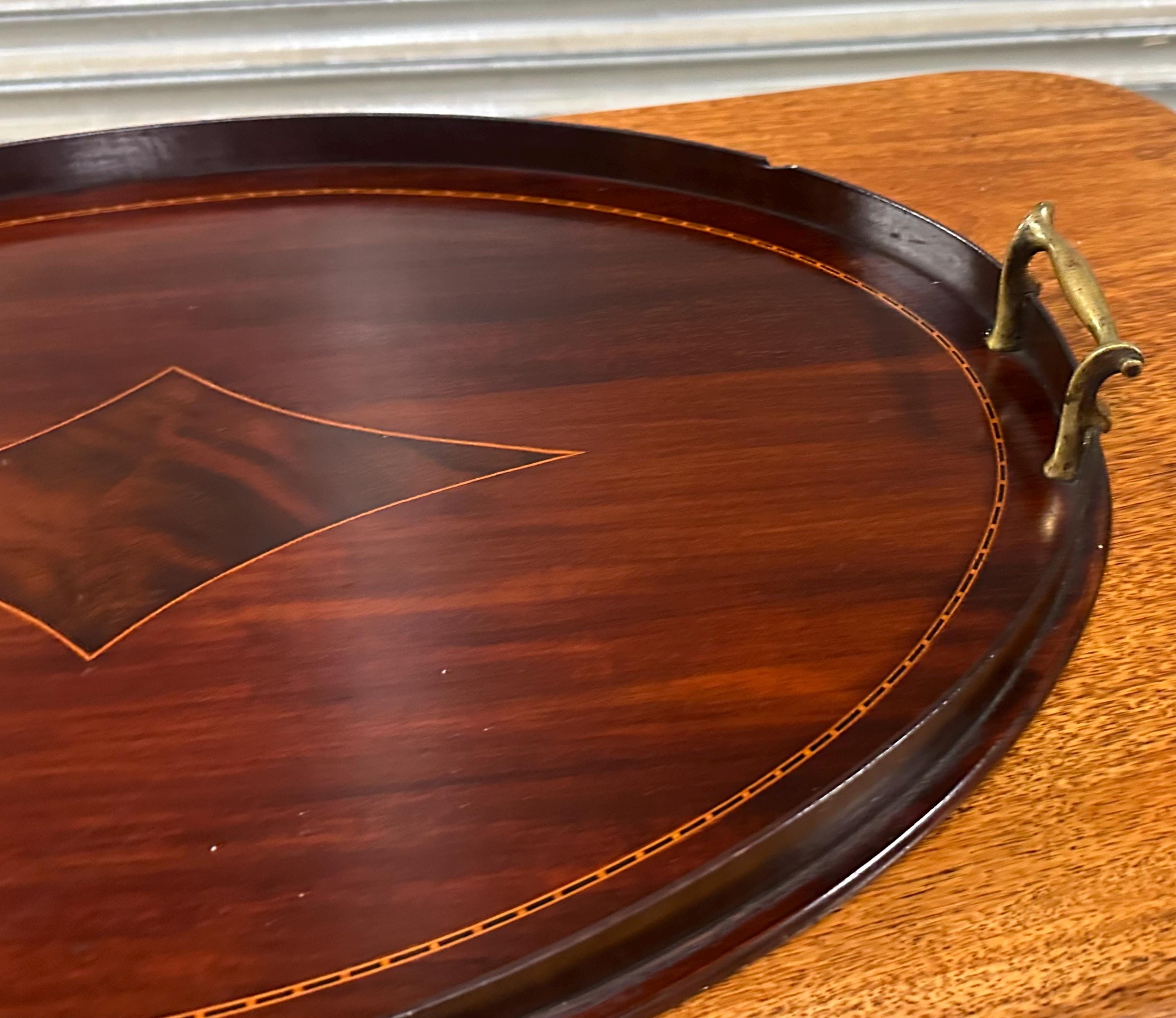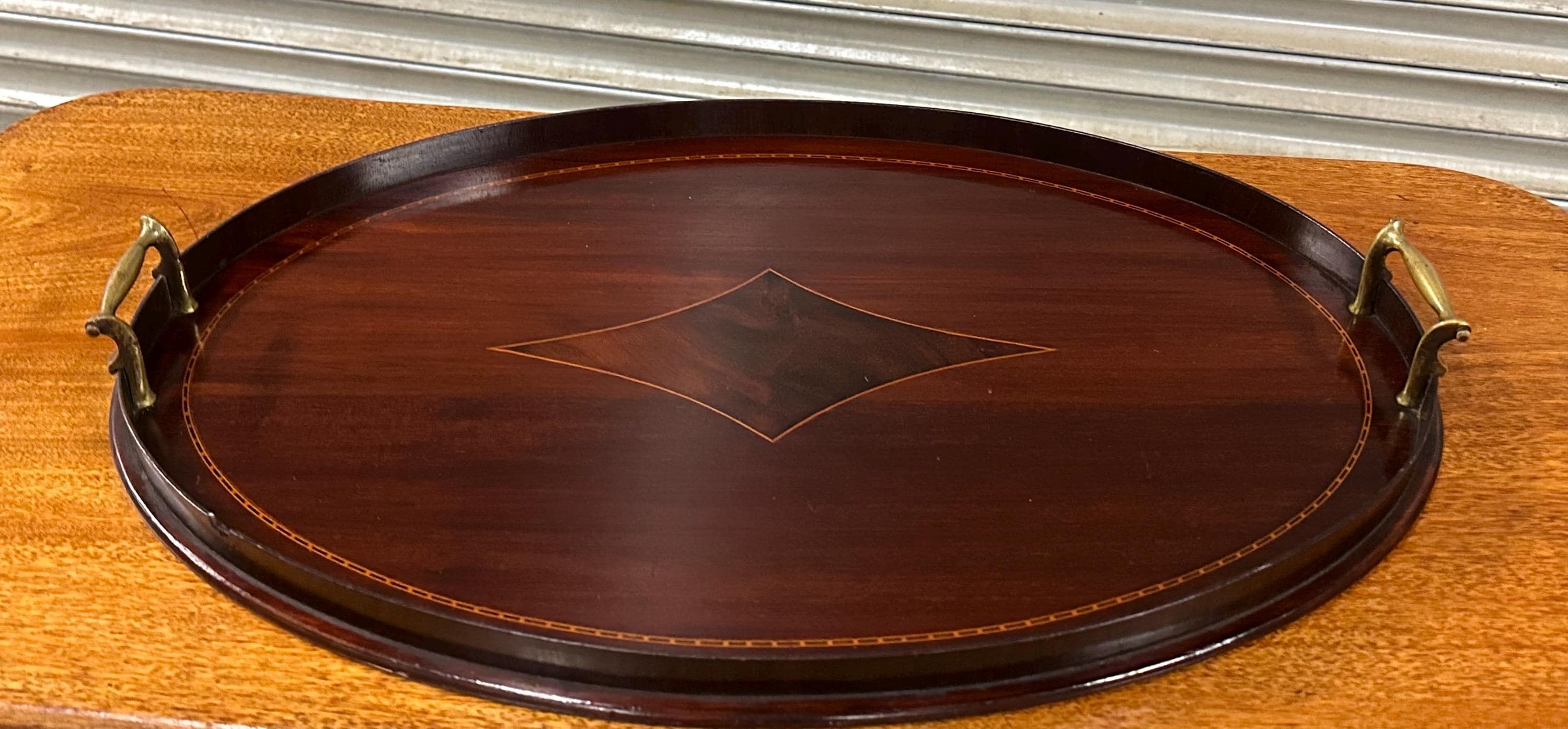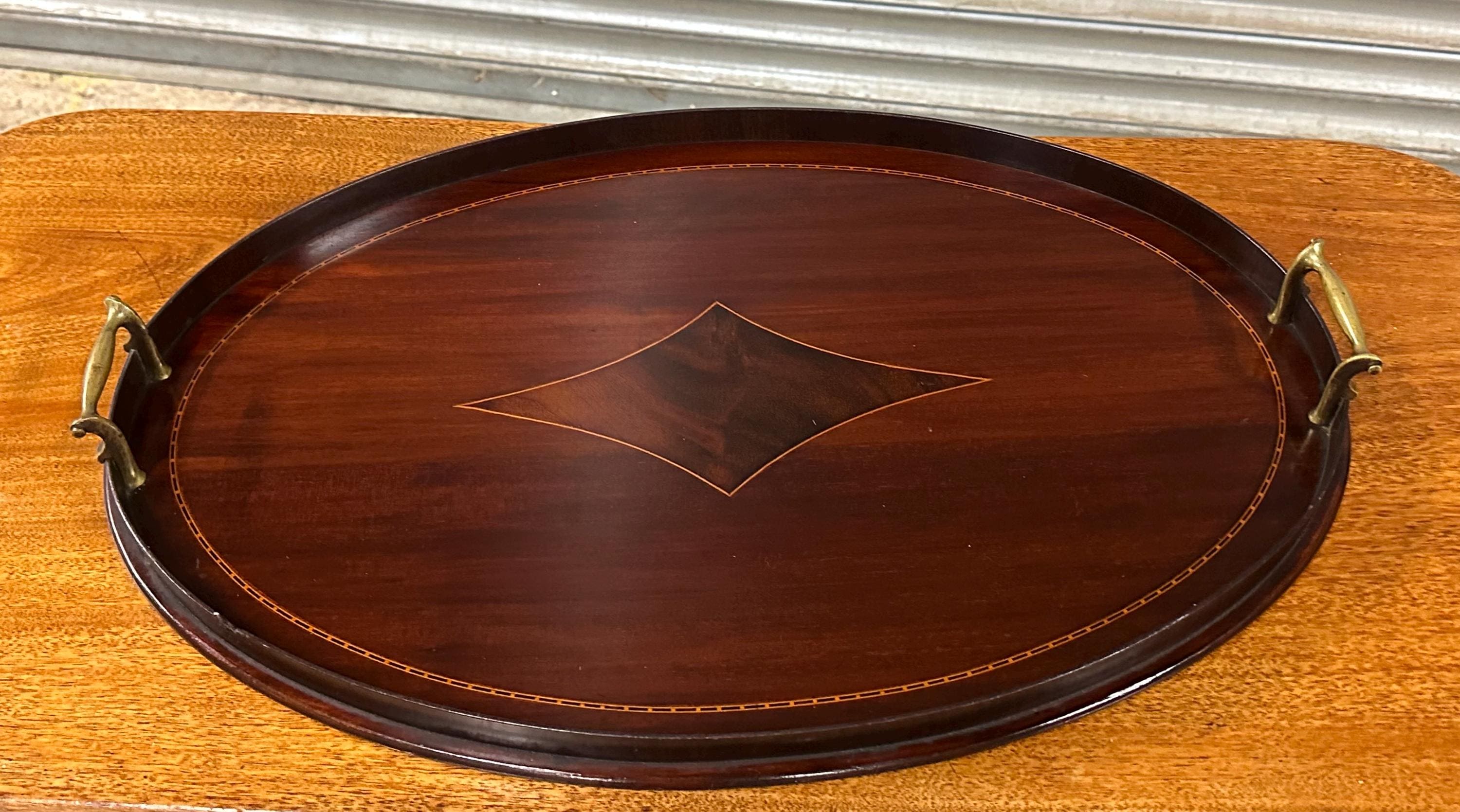 A handsome antique Edwardian oval mahogany serving tray, featuring elegant satinwood-style line inlay and a central diamond motif, finished with a raised gallery edge and original brass carrying handles to either side.