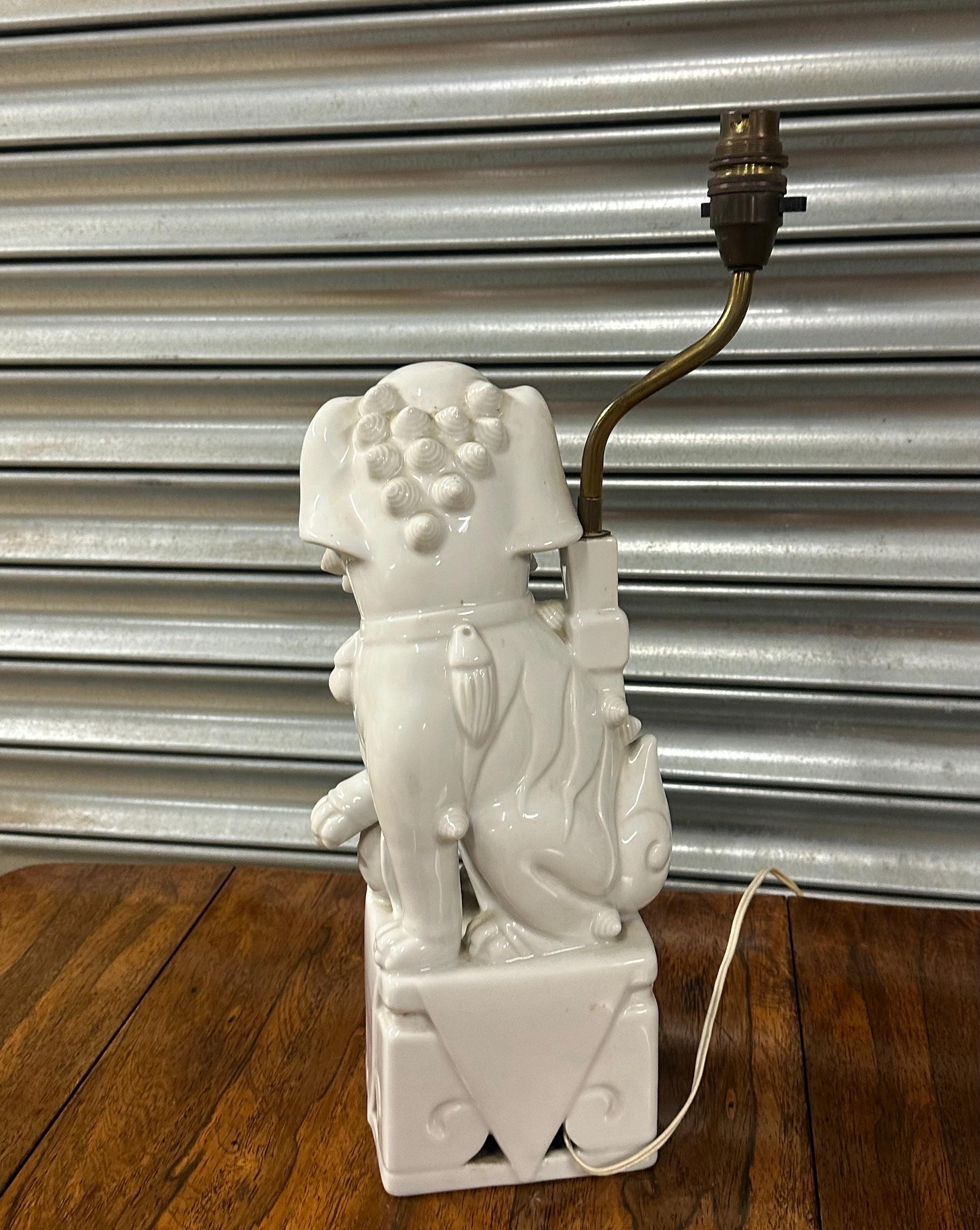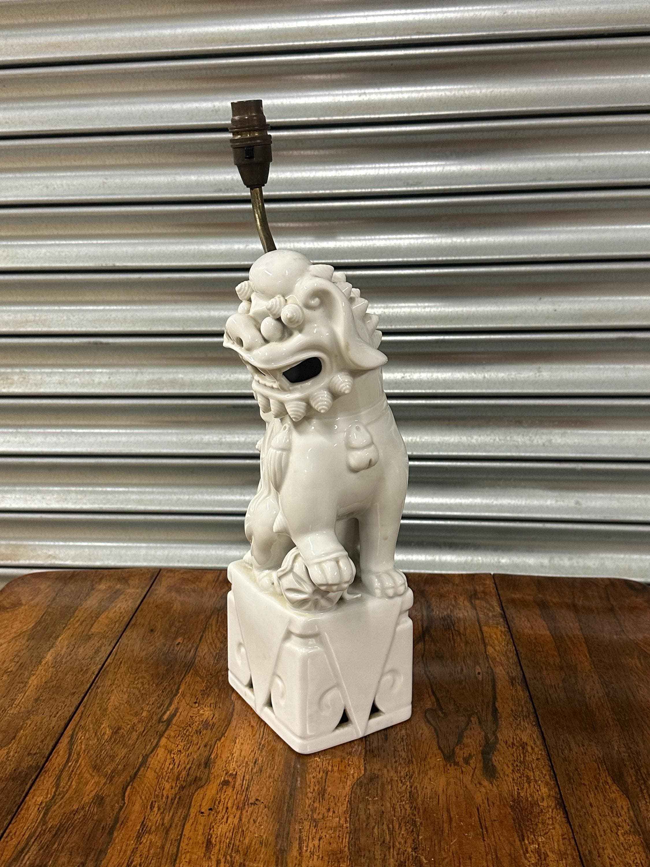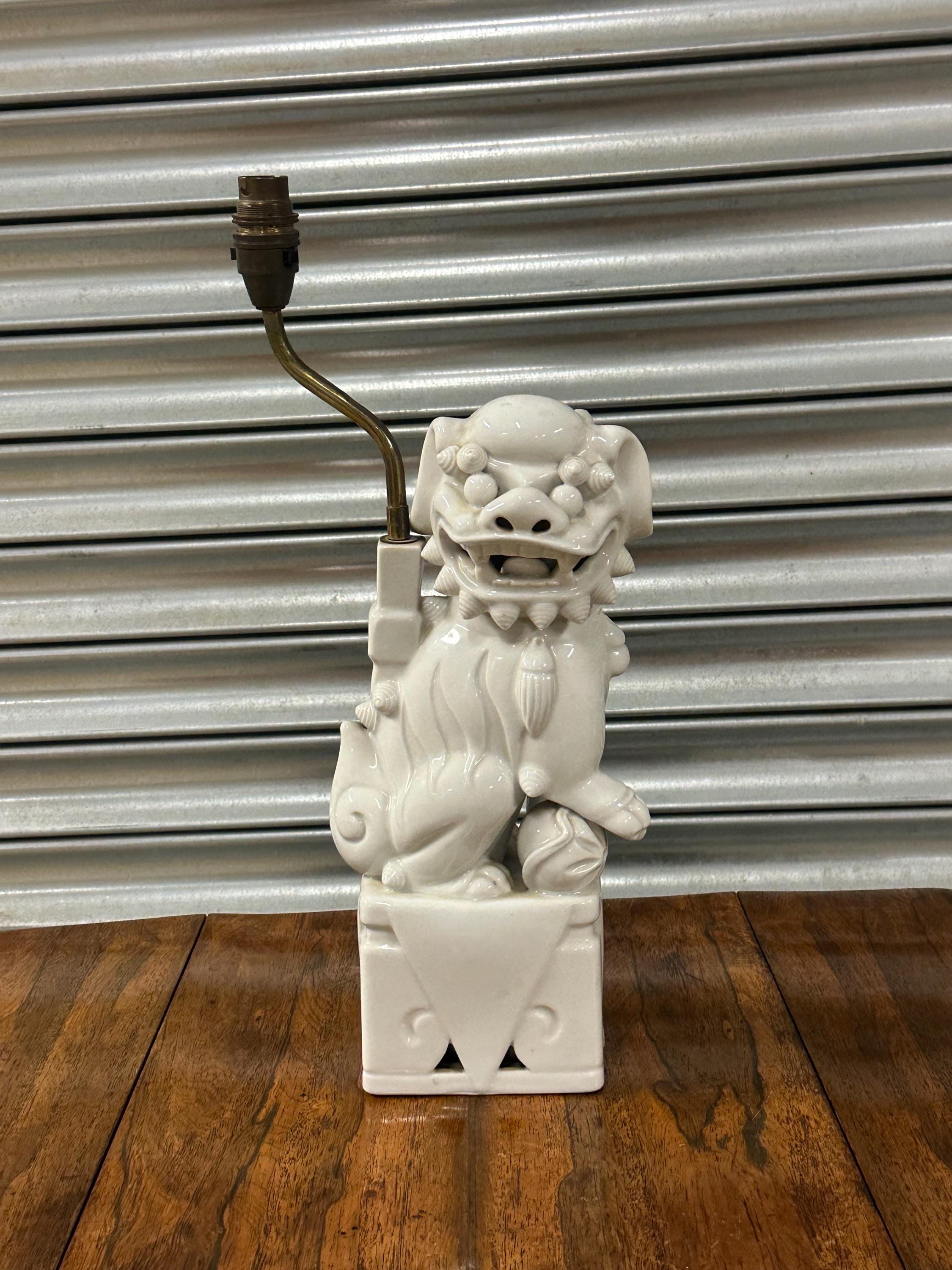 A striking vintage ceramic Foo Dog (Chinese guardian lion) table lamp base, finished in a glossy blanc-de-chine style white glaze and beautifully modelled with expressive facial features and flowing stylised fur.