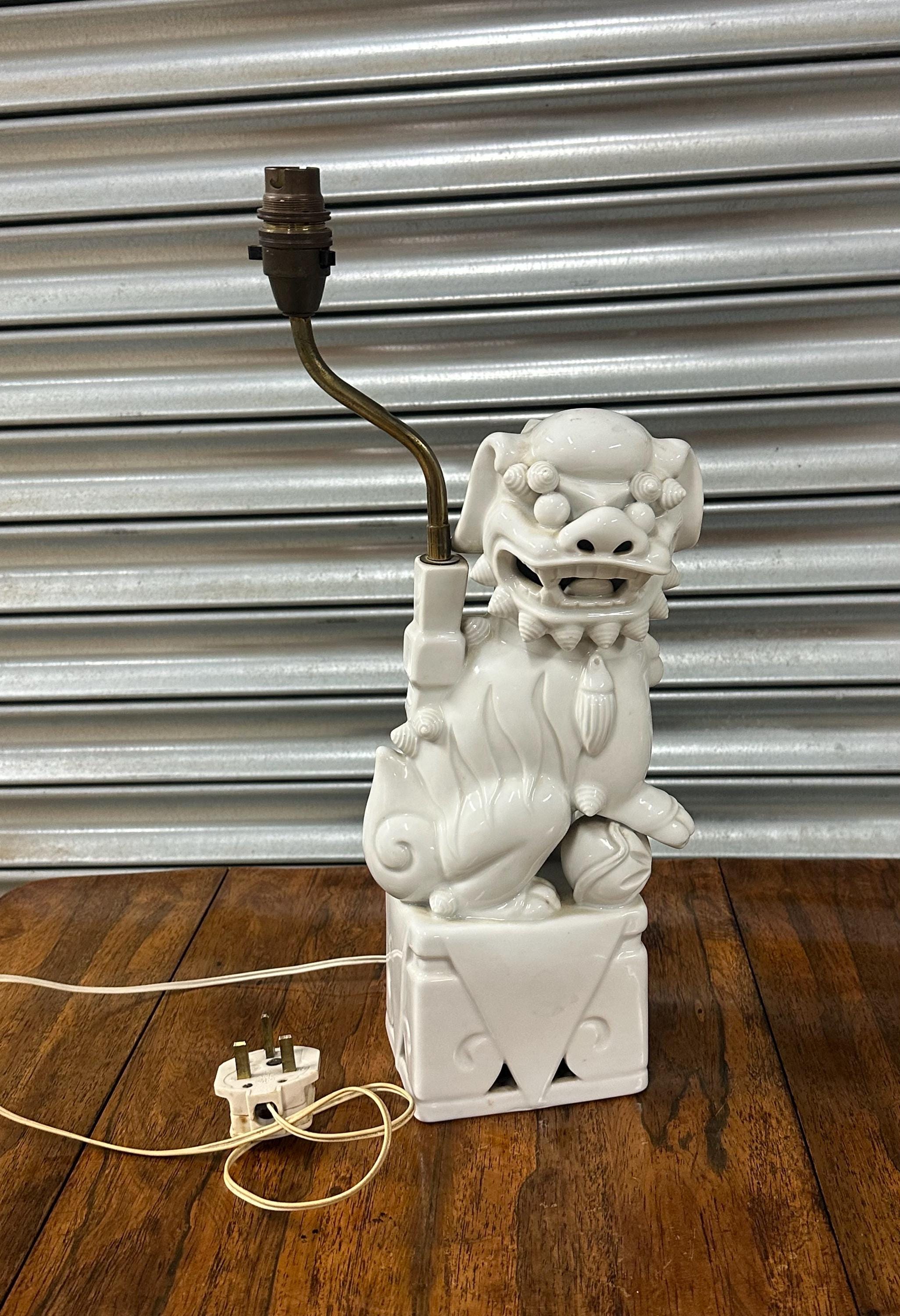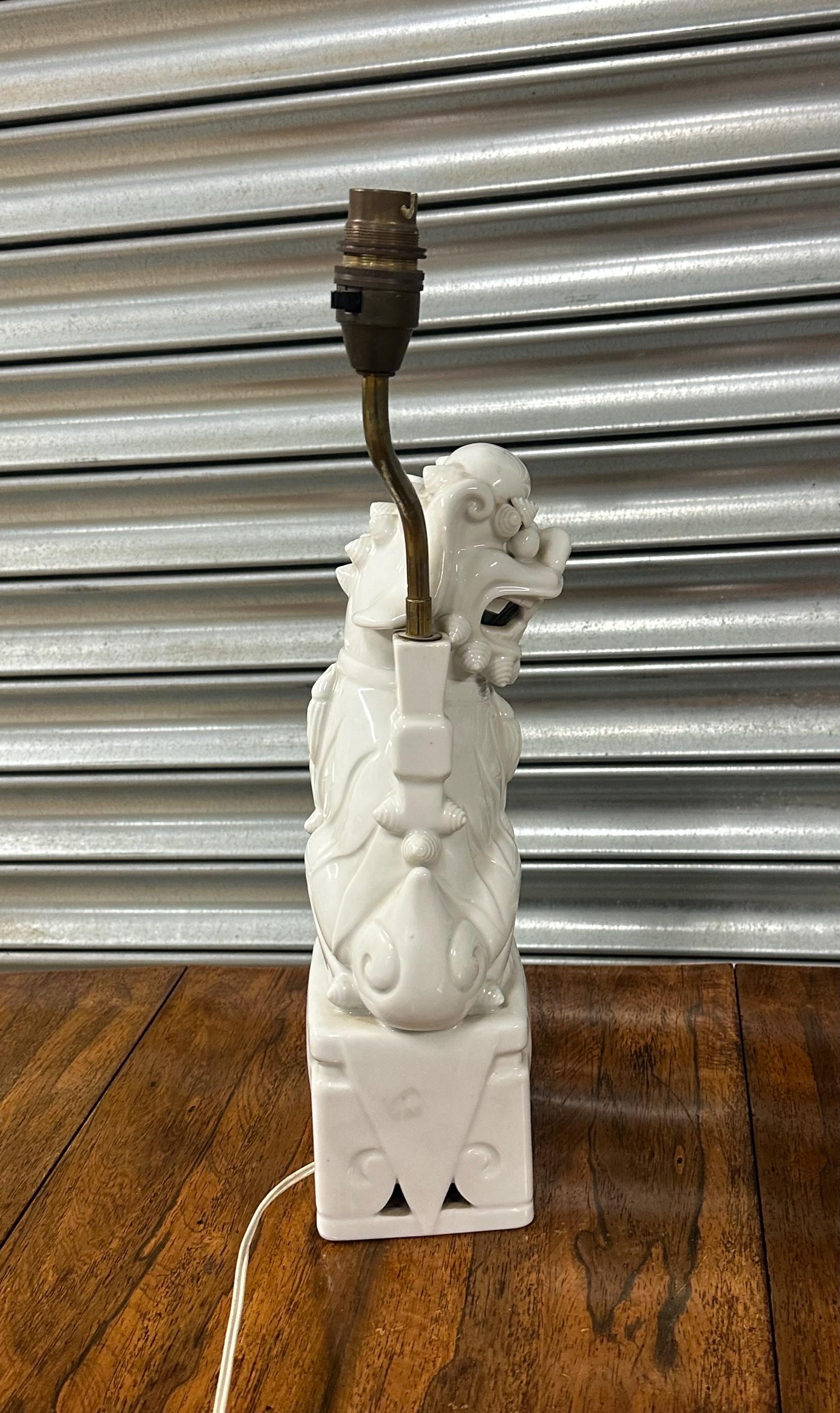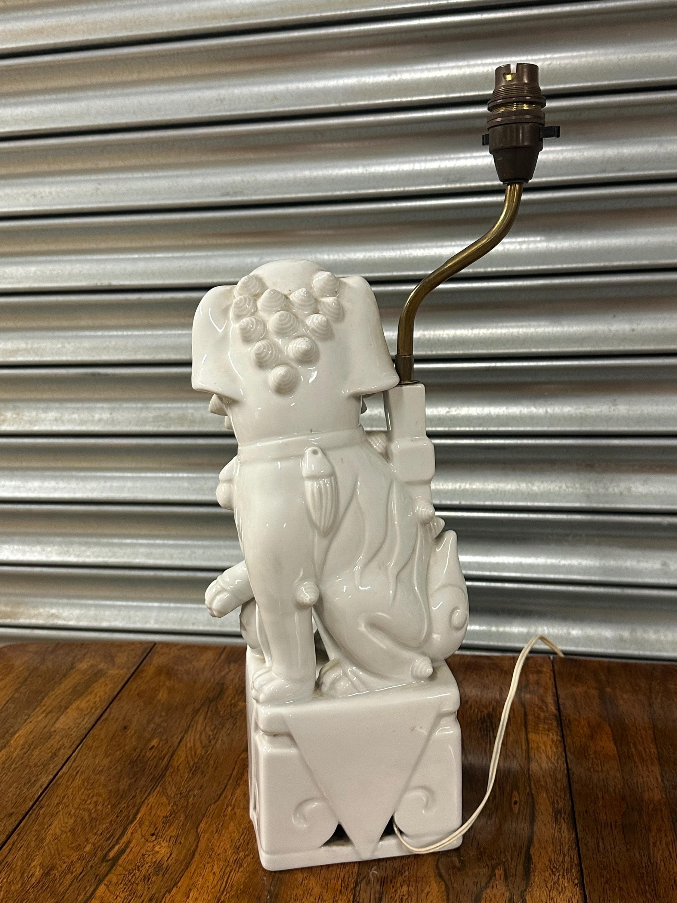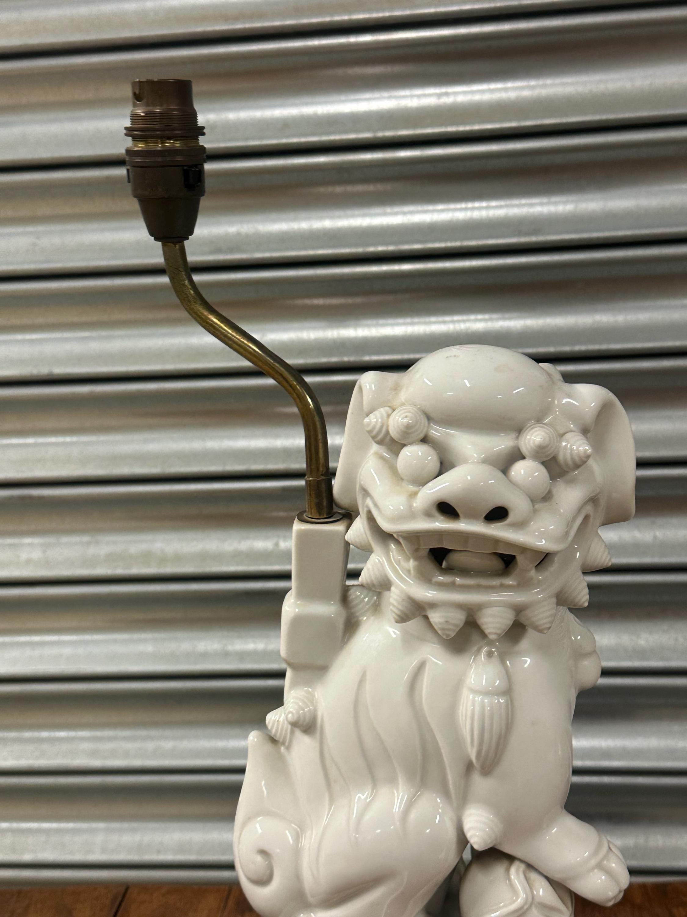 A striking vintage ceramic Foo Dog (Chinese guardian lion) table lamp base, finished in a glossy blanc-de-chine style white glaze and beautifully modelled with expressive facial features and flowing stylised fur.