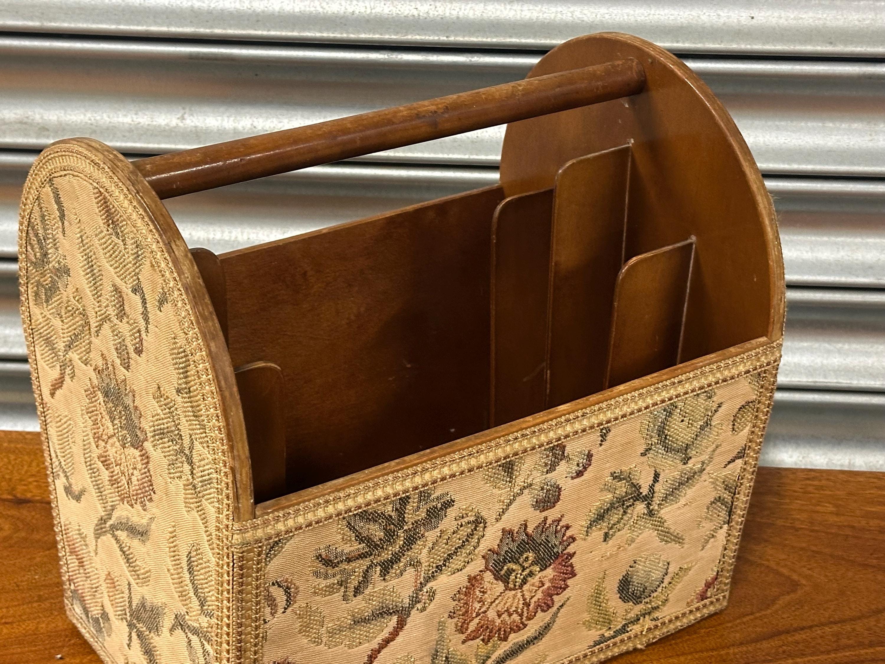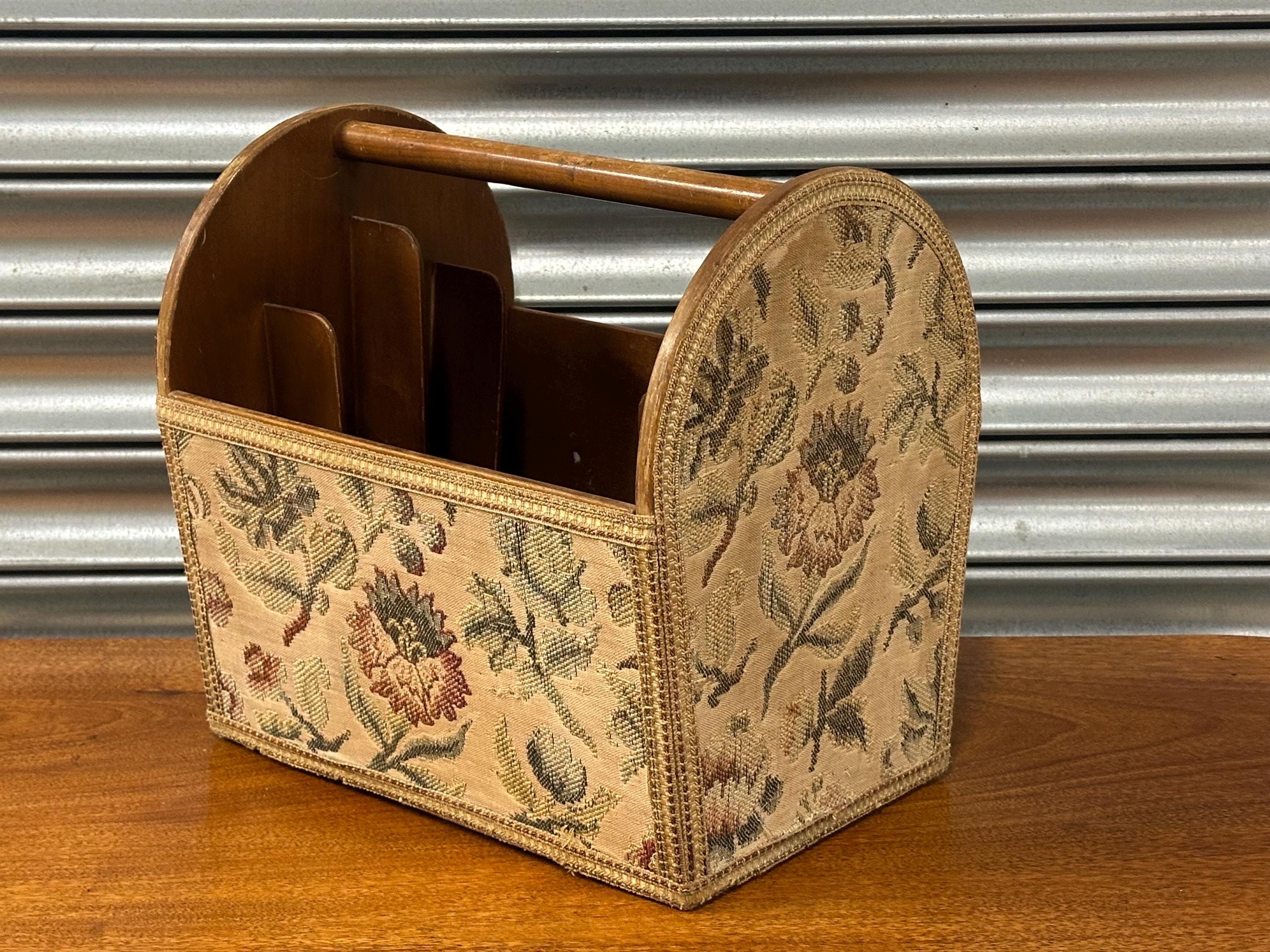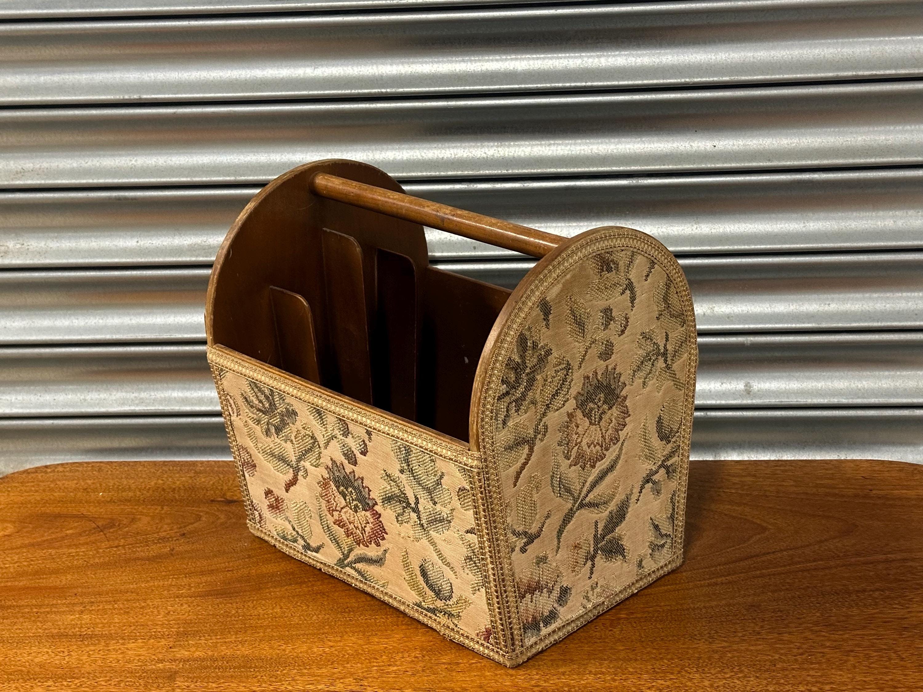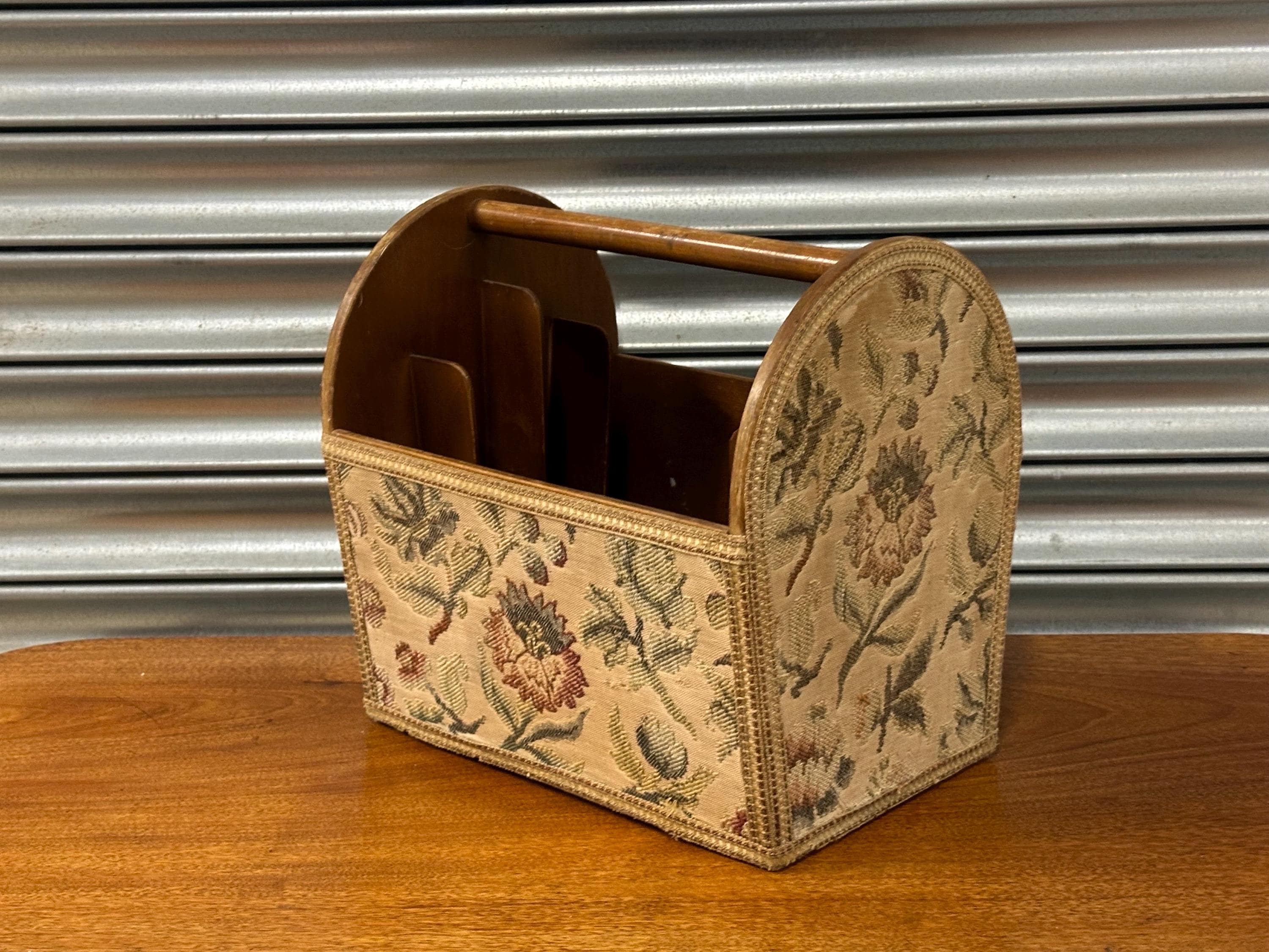 Stylish mid-century magazine / letter rack with original floral tapestry front and wooden carry handle. Features multiple internal dividers – perfect for magazines, paperwork or desk organisation. Solidly made with lovely vintage character. Great retro home accent.
