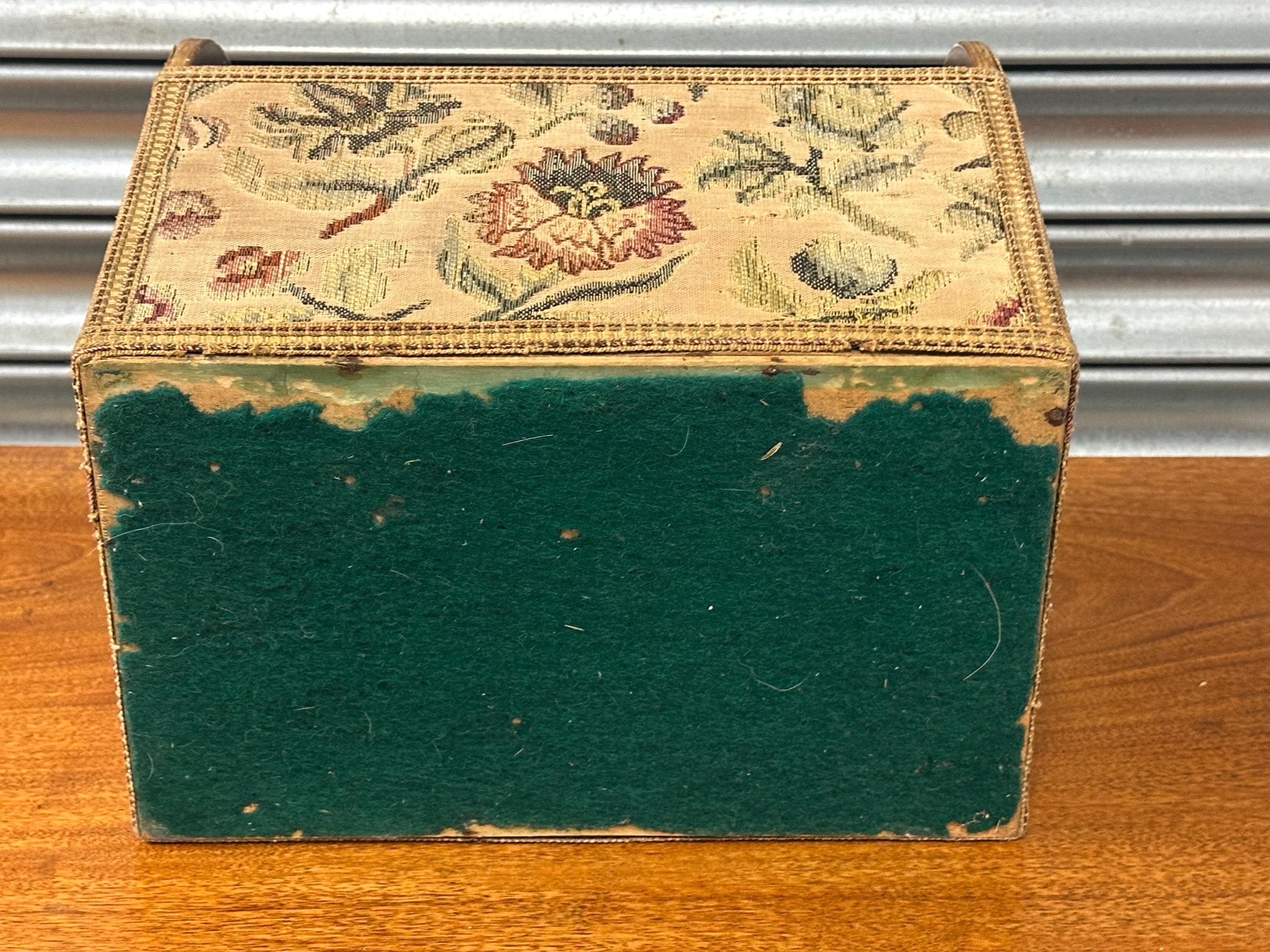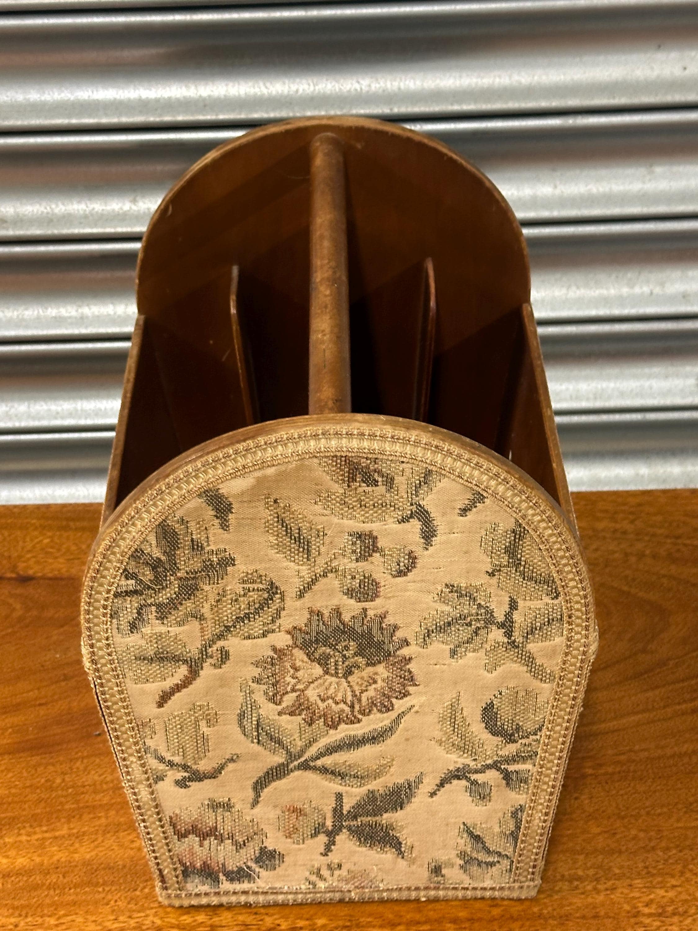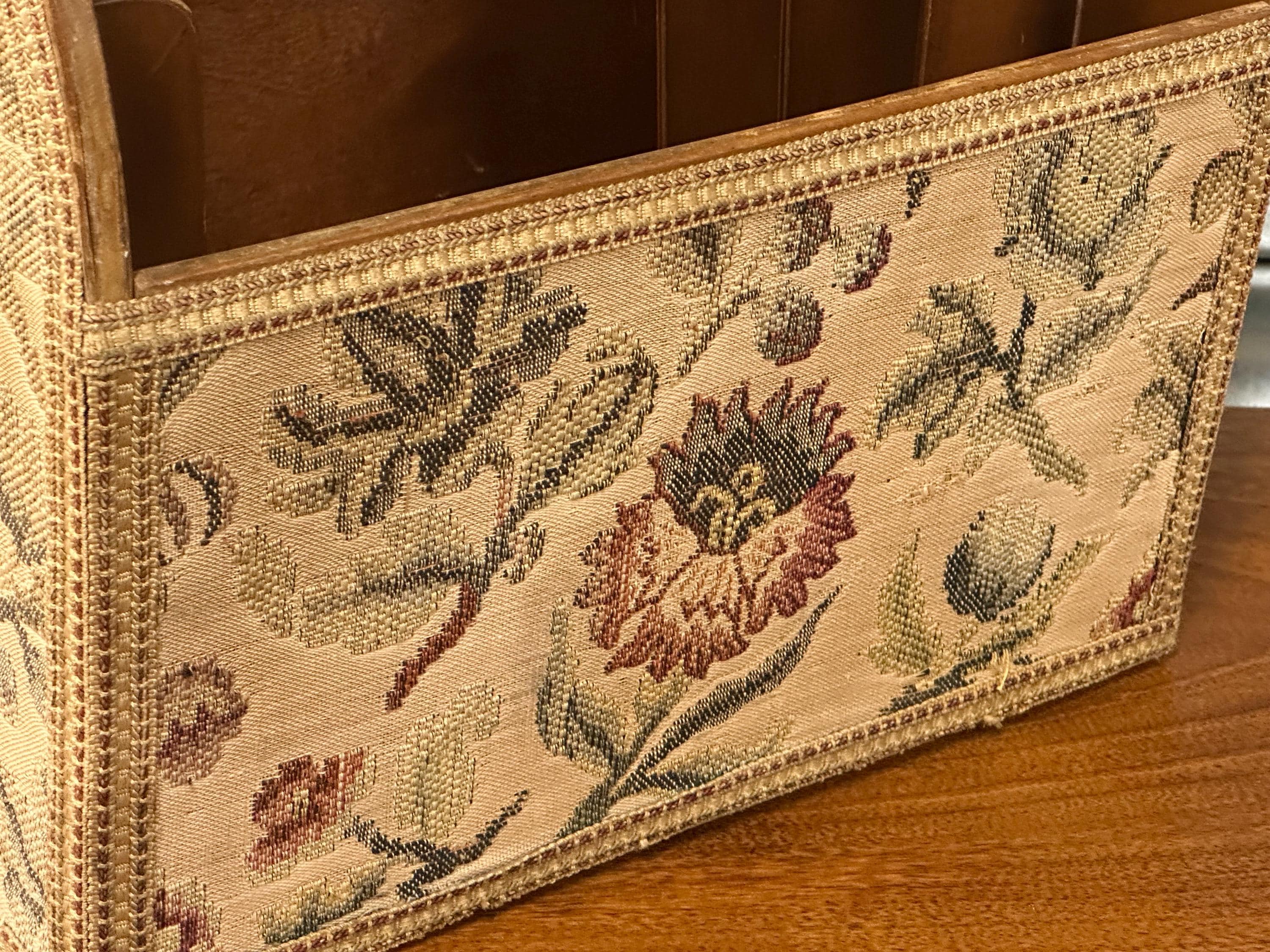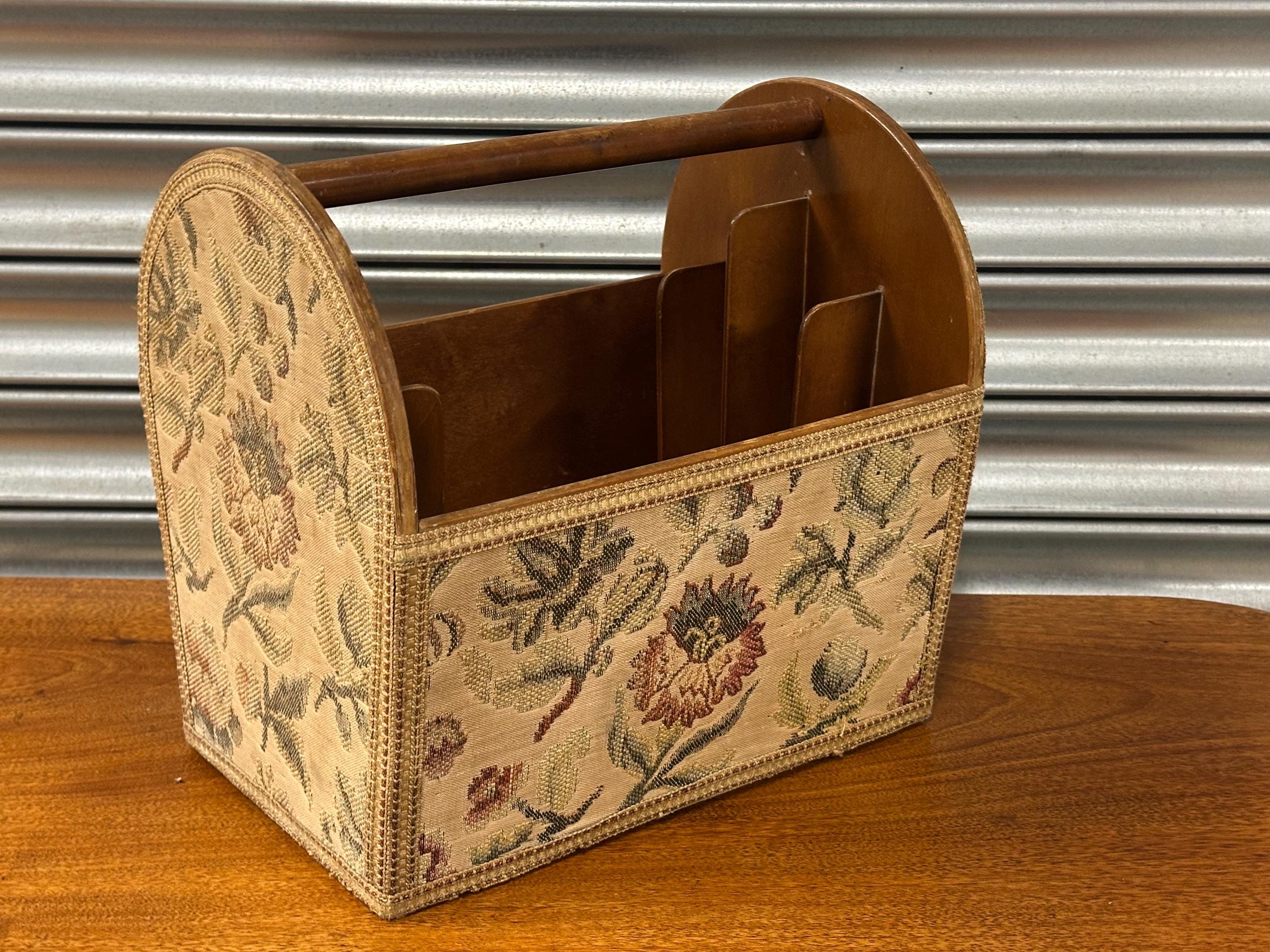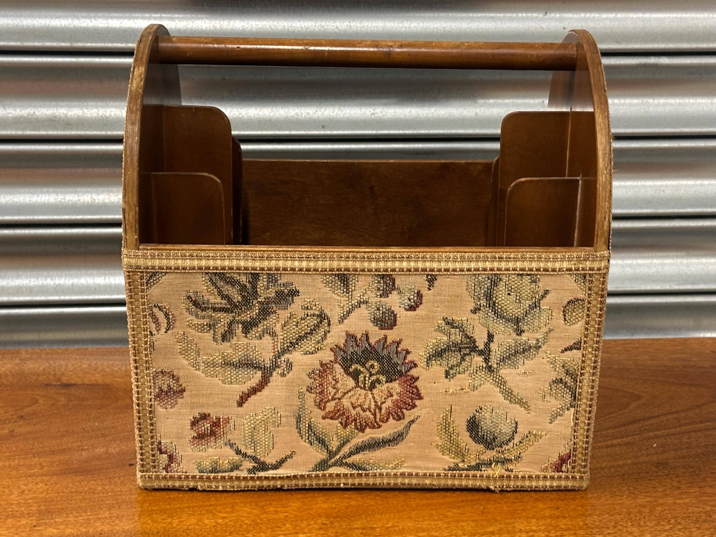 Stylish mid-century magazine / letter rack with original floral tapestry front and wooden carry handle. Features multiple internal dividers – perfect for magazines, paperwork or desk organisation. Solidly made with lovely vintage character. Great retro home accent.