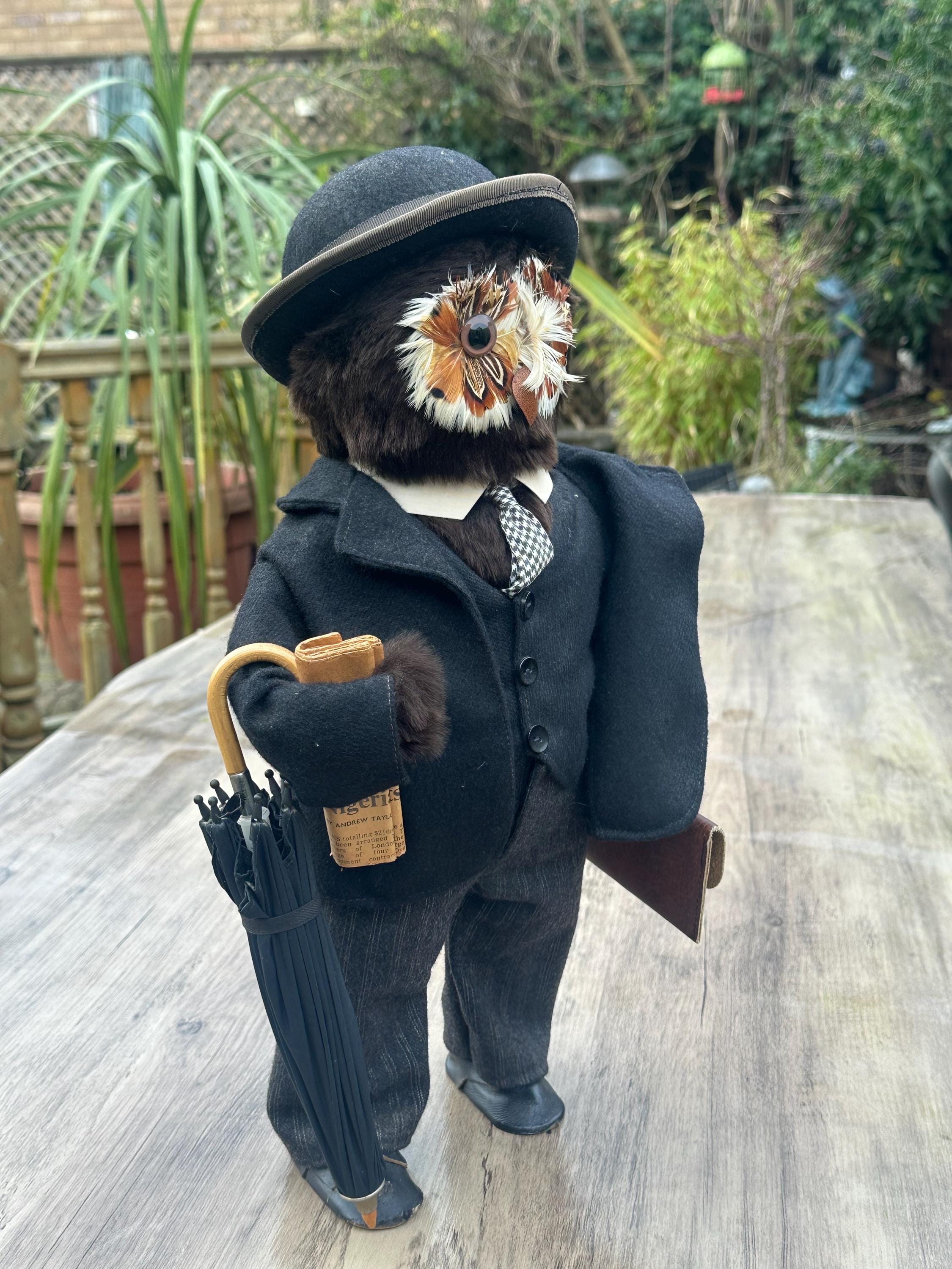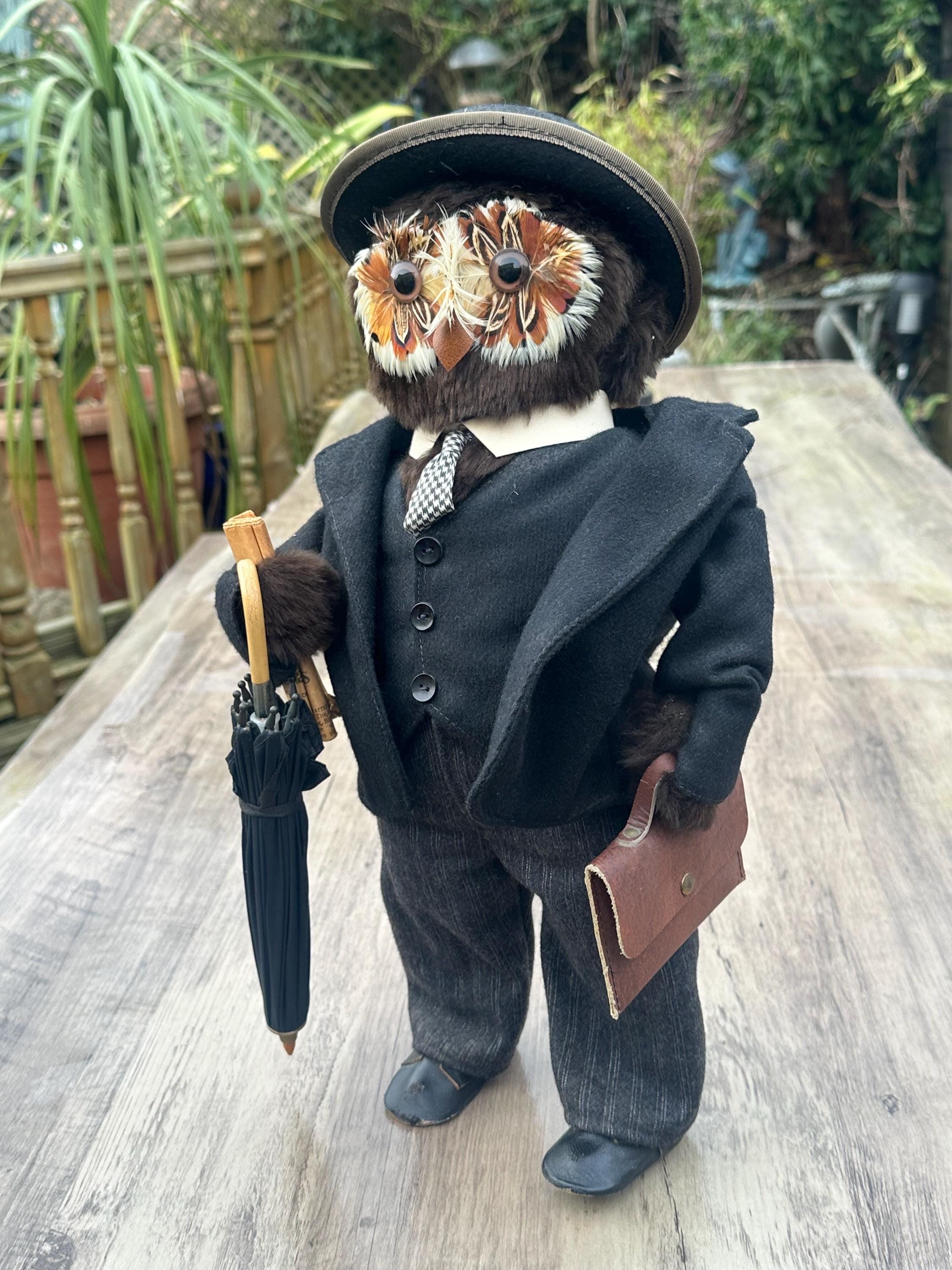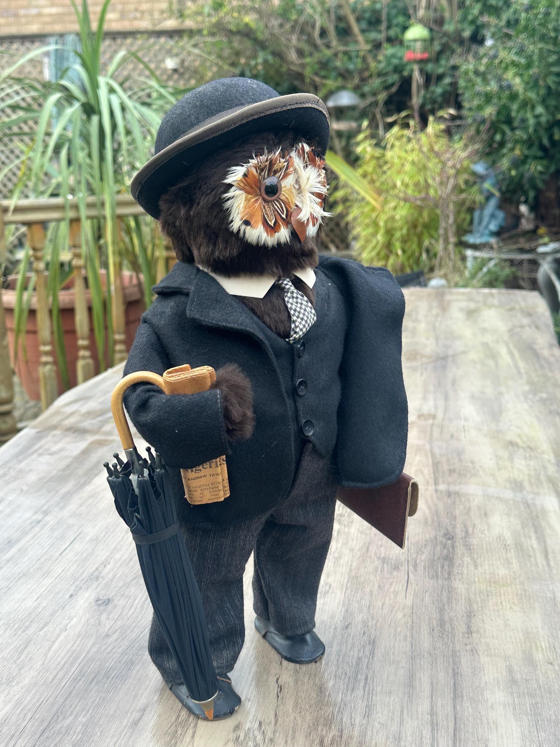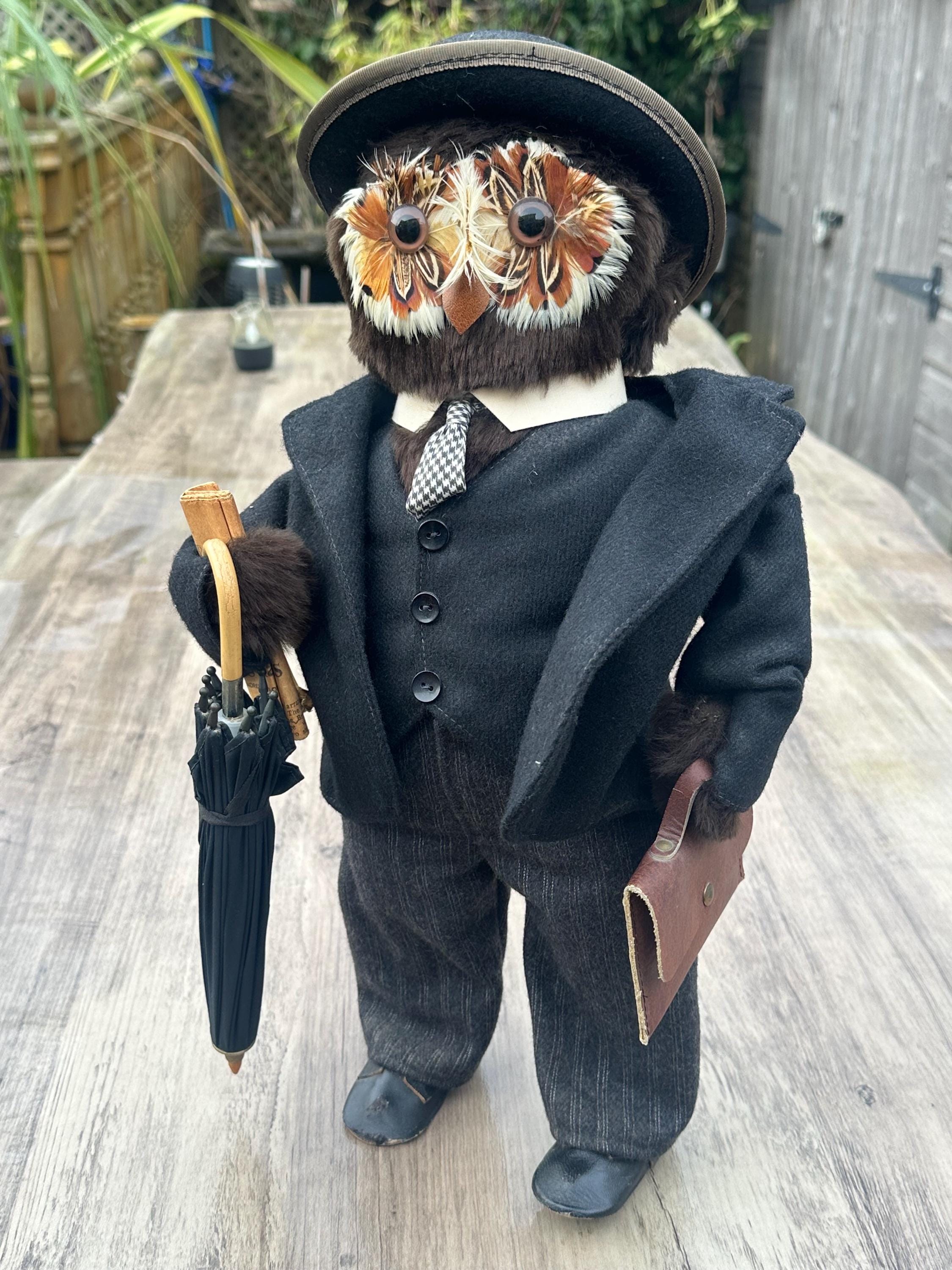 A wonderfully characterful Abercrombie & Fitch “The Stockbroker” owl, dressed as a traditional gentleman banker complete with bowler hat, tailored jacket, waistcoat, tie, pinstripe trousers and smart shoes.