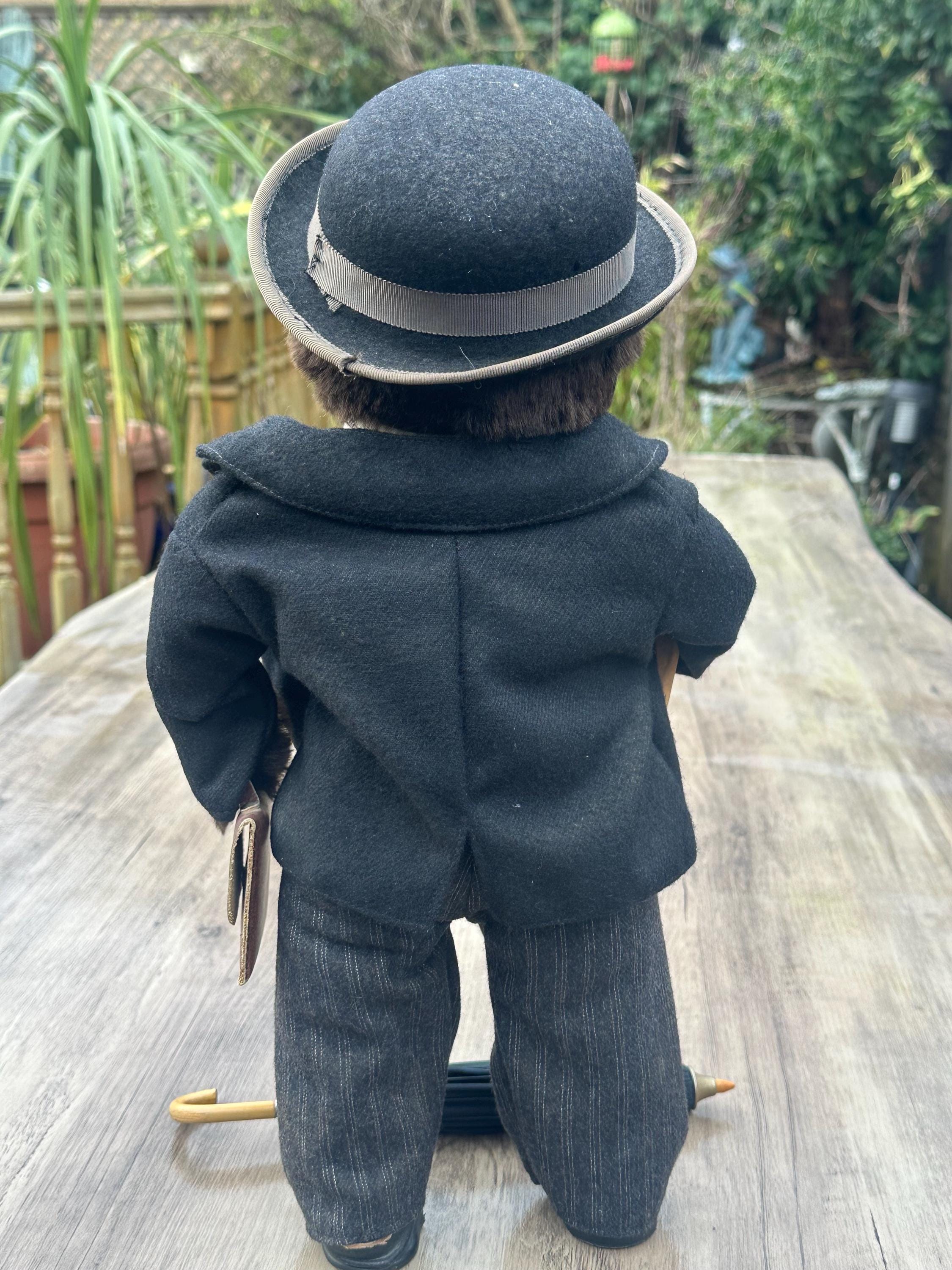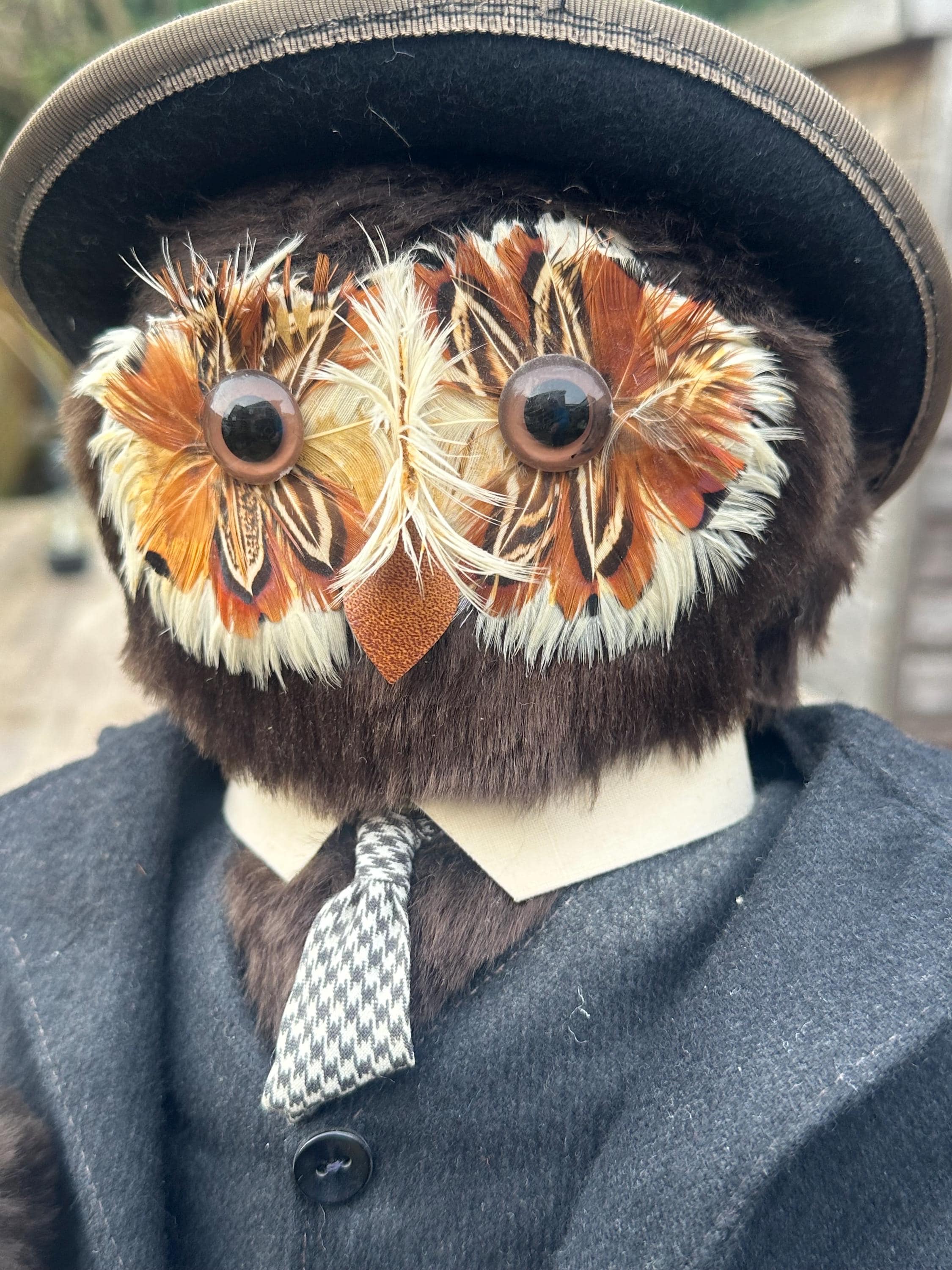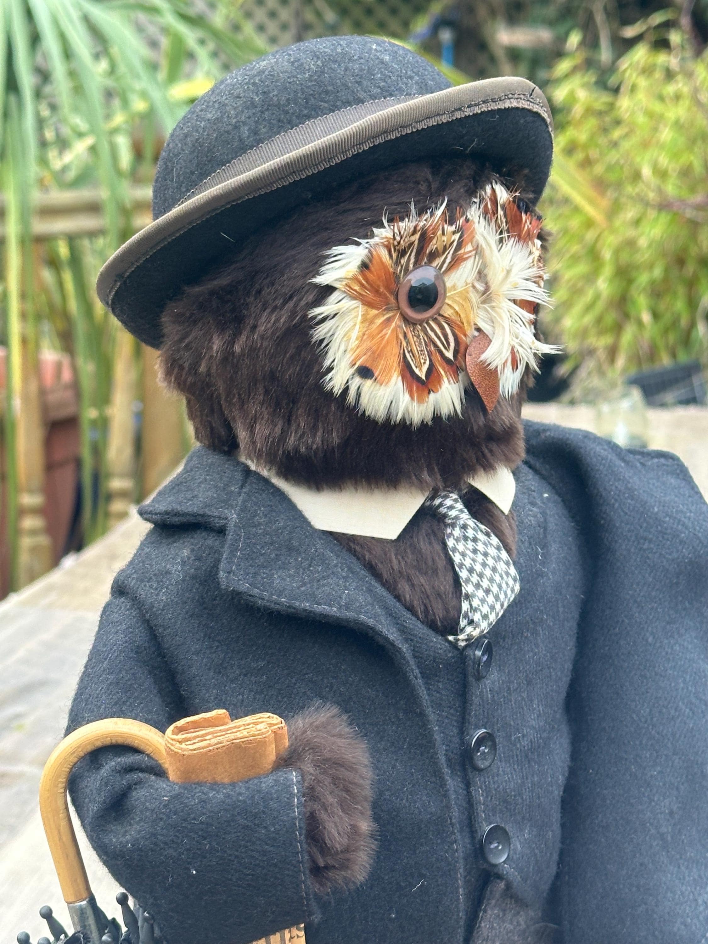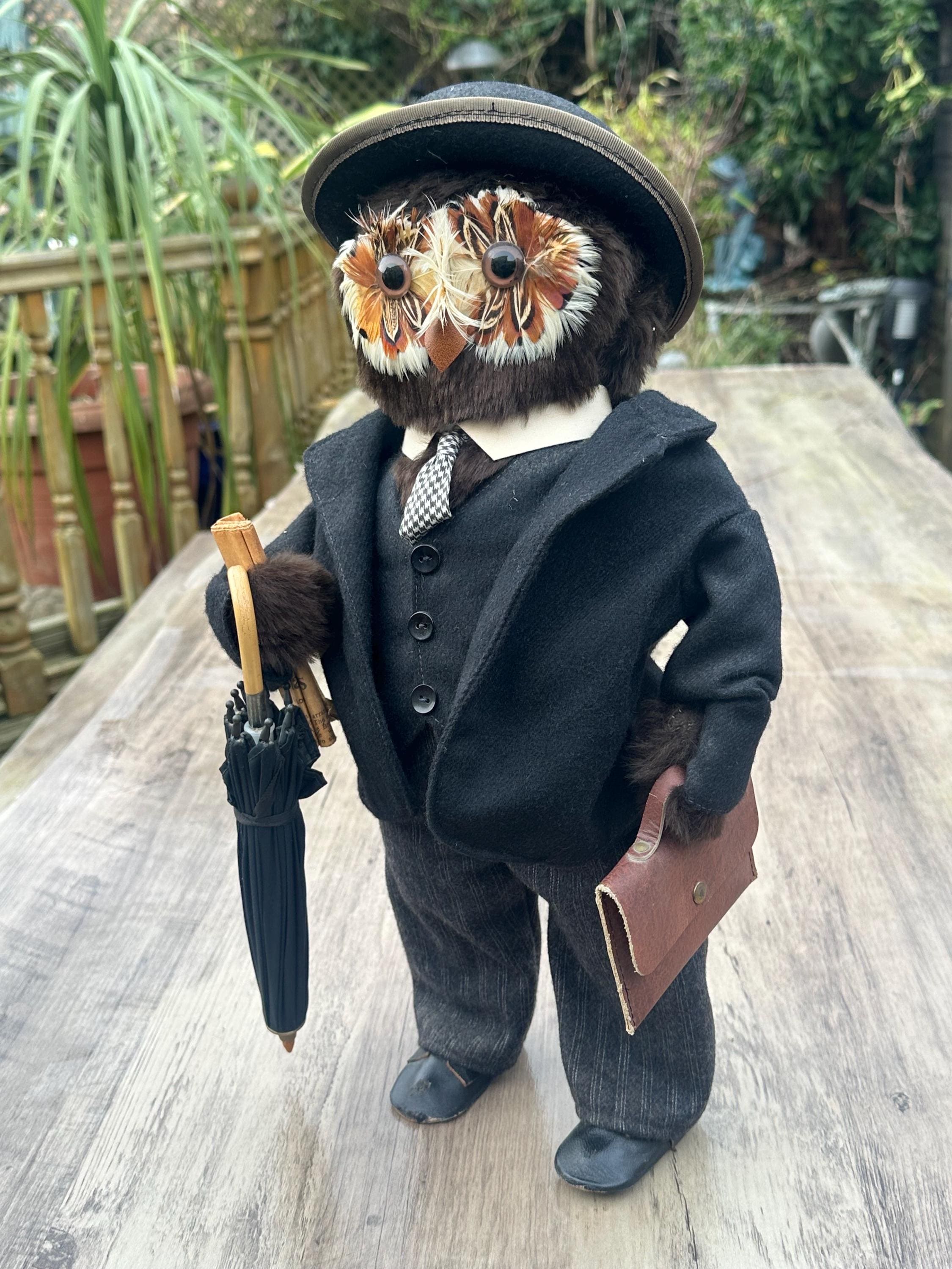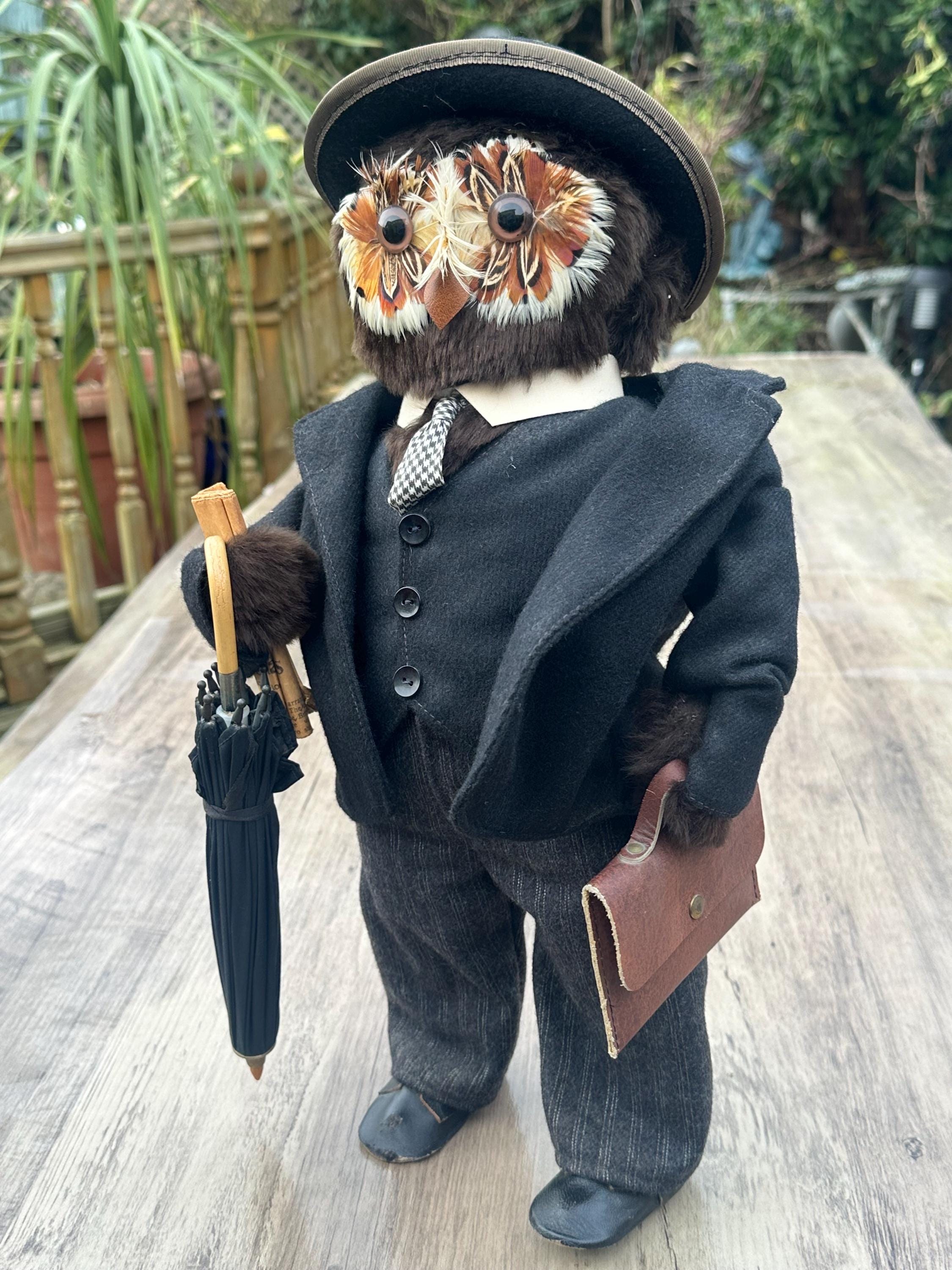 A wonderfully characterful Abercrombie & Fitch “The Stockbroker” owl, dressed as a traditional gentleman banker complete with bowler hat, tailored jacket, waistcoat, tie, pinstripe trousers and smart shoes.