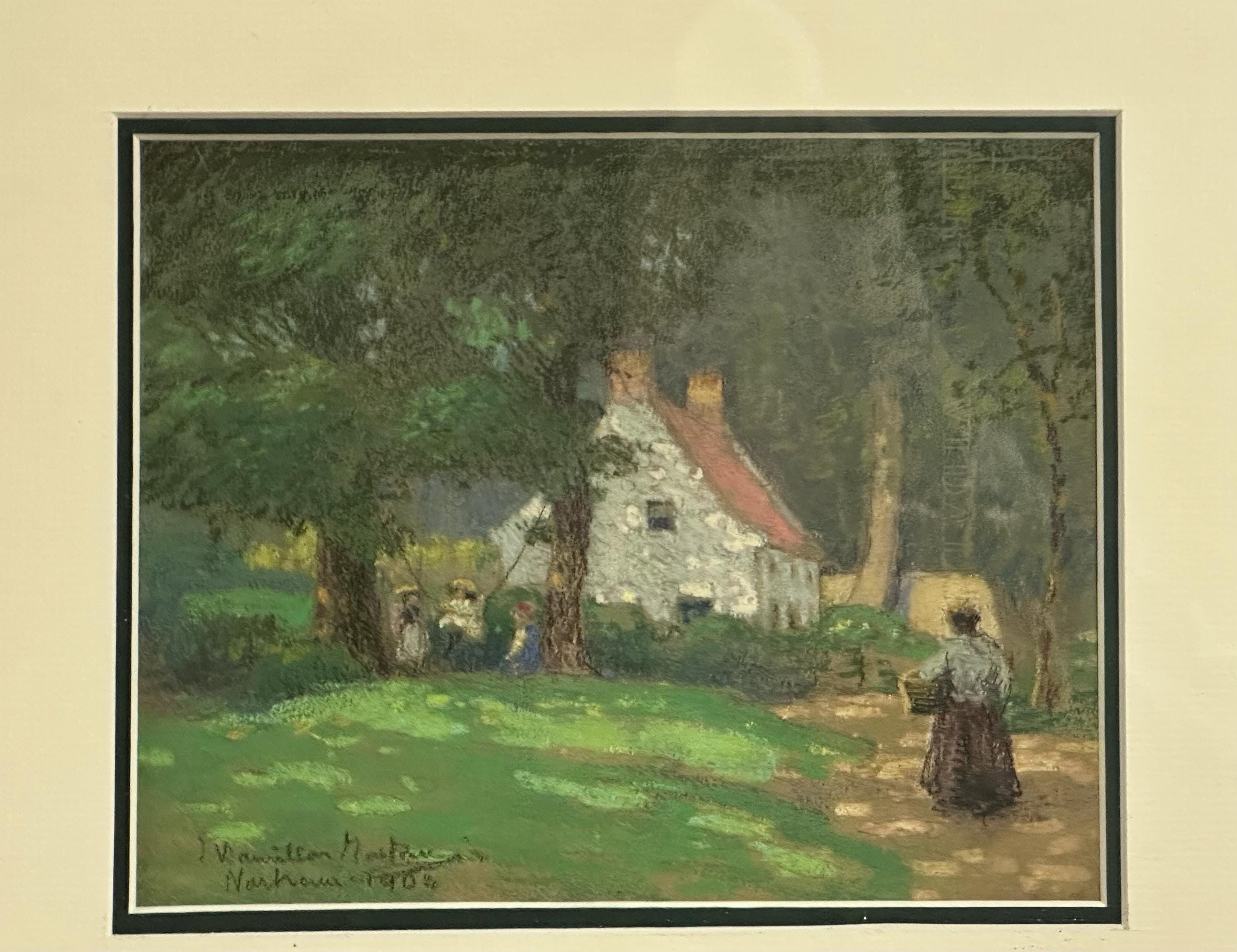 Charming early 20th-century artwork dated 1904, depicting a peaceful rural cottage scene with figures beneath mature trees. The composition shows a traditional whitewashed cottage with a red roof, surrounded by greenery, with villagers in period dress adding gentle narrative and movement.