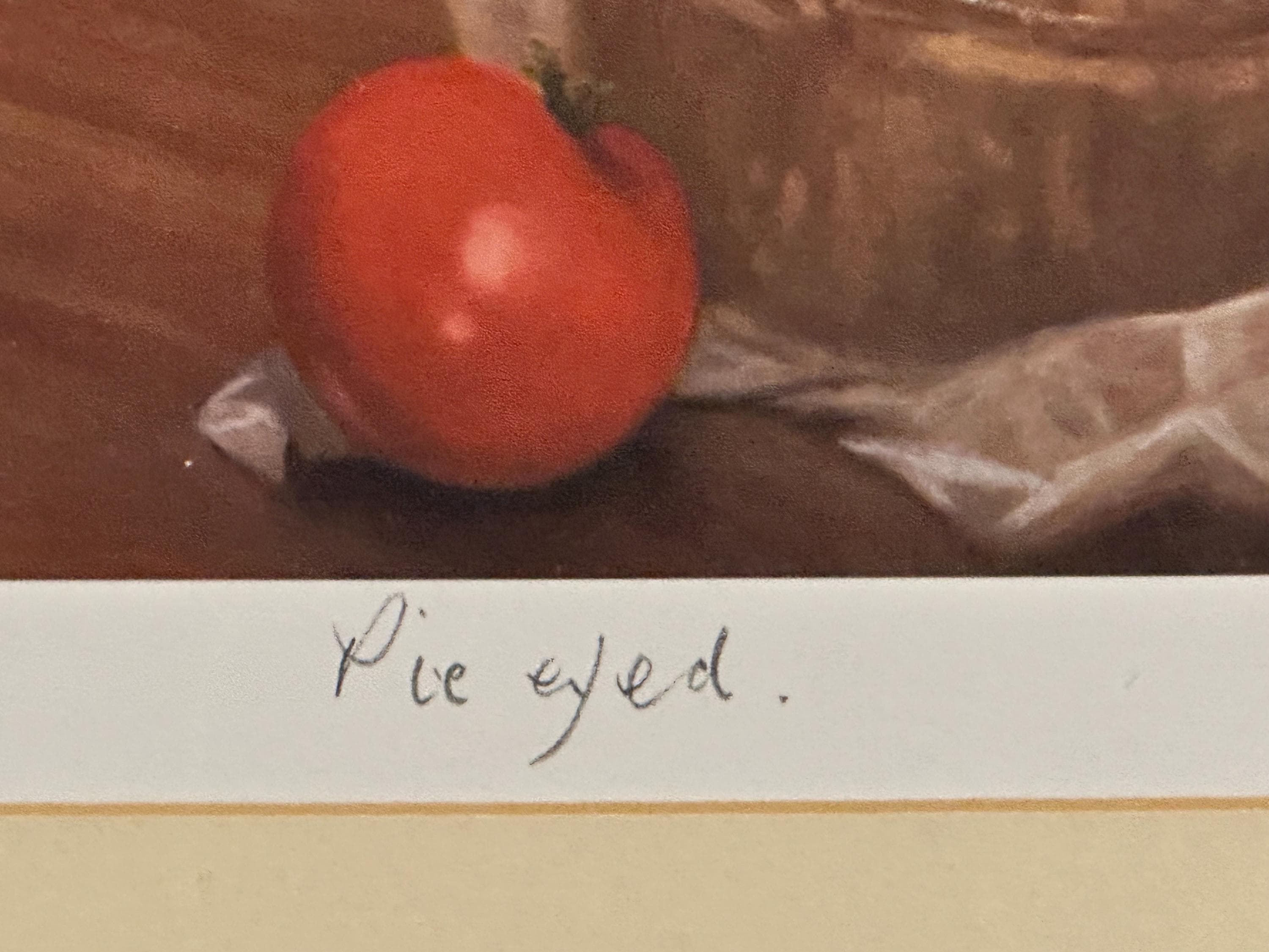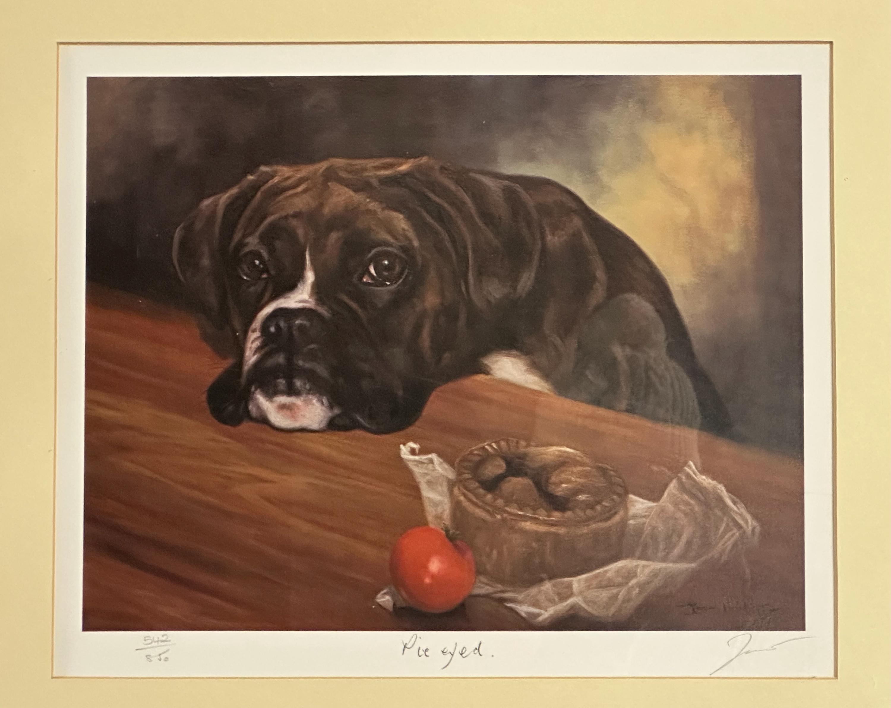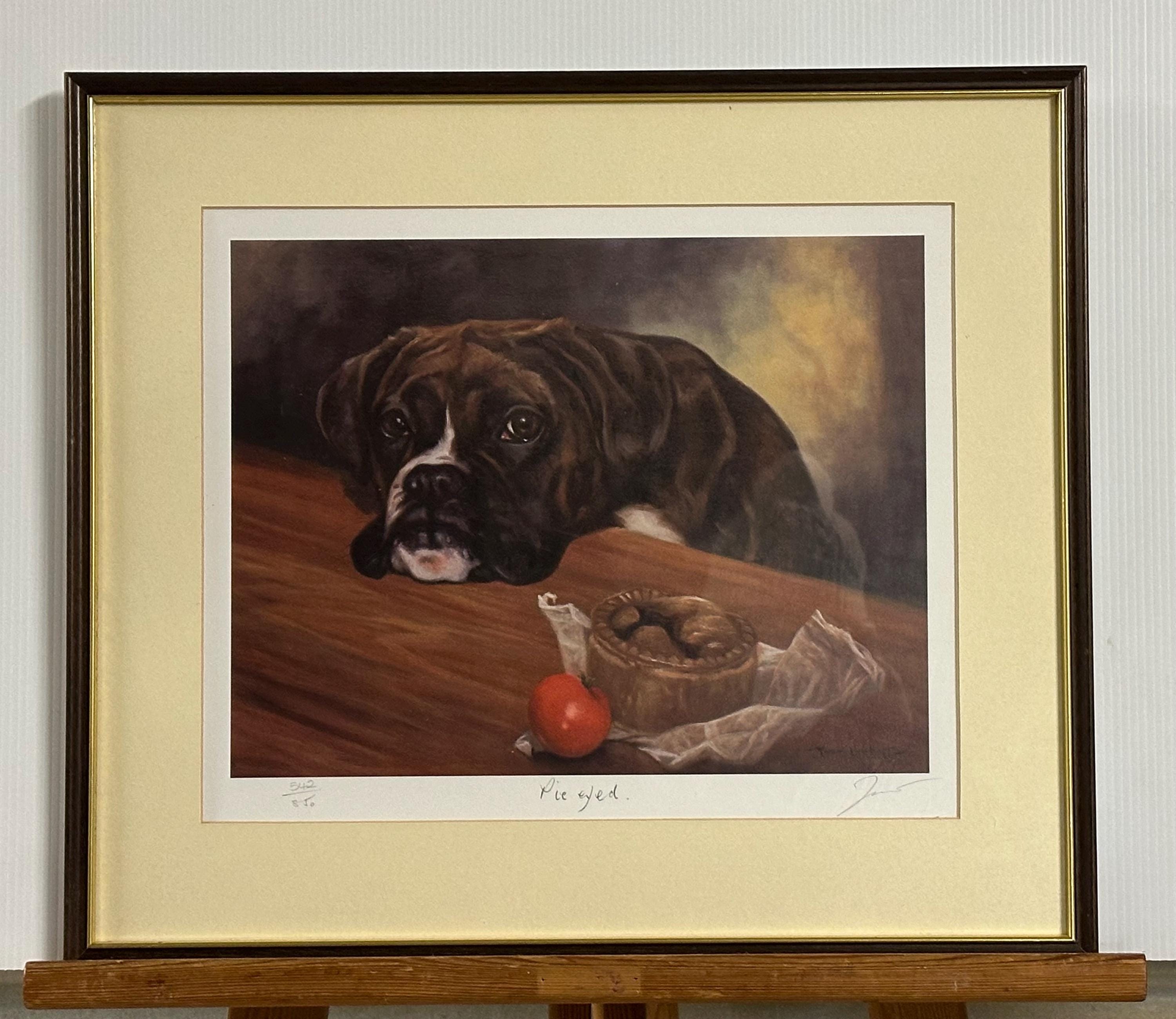 Charming limited edition print titled âPie Eyedâ by renowned British animal artist John Trickett, featuring a soulful Boxer dog gazing longingly at a pork pie and tomato â a wonderfully characterful and humorous composition.