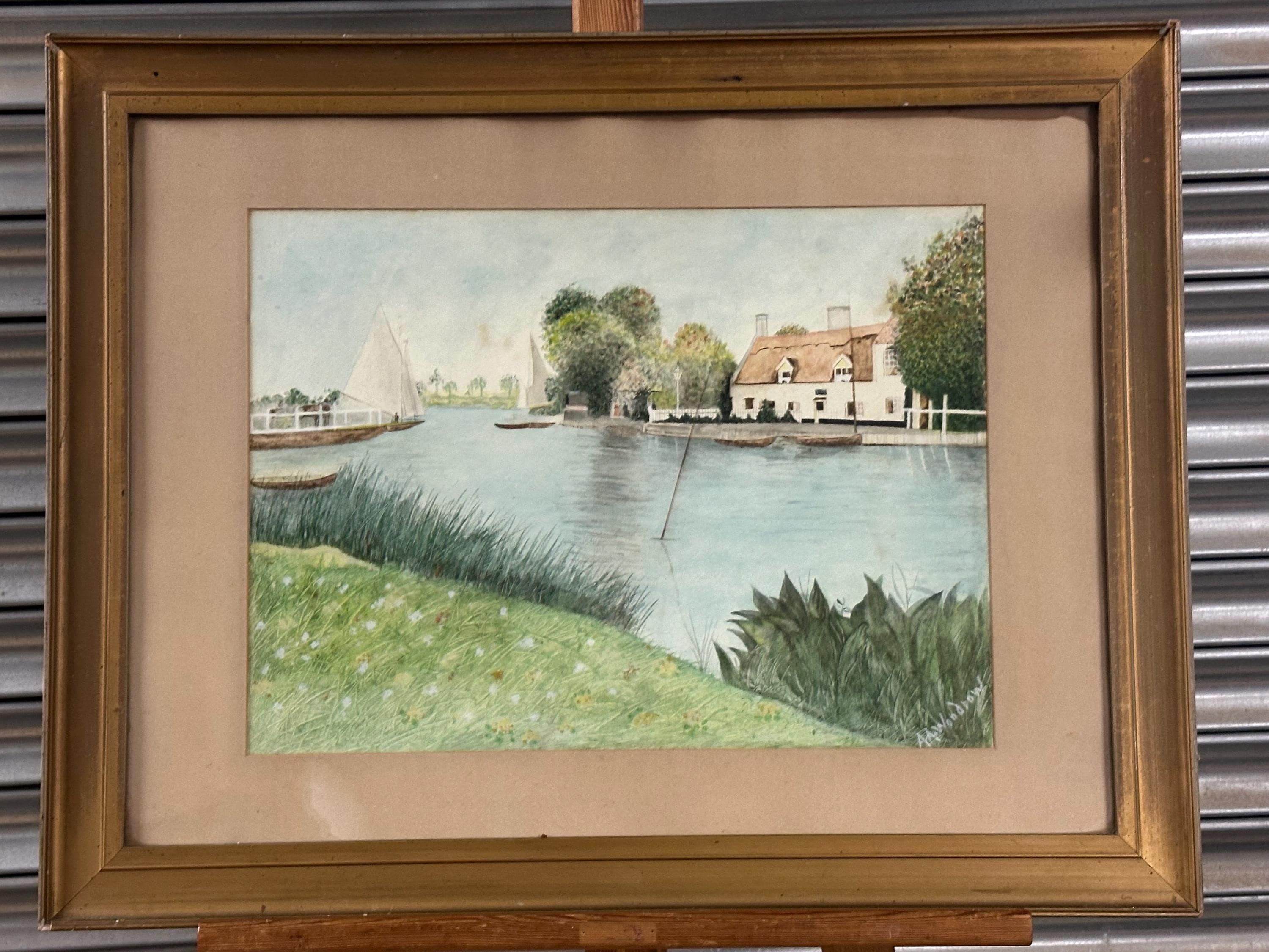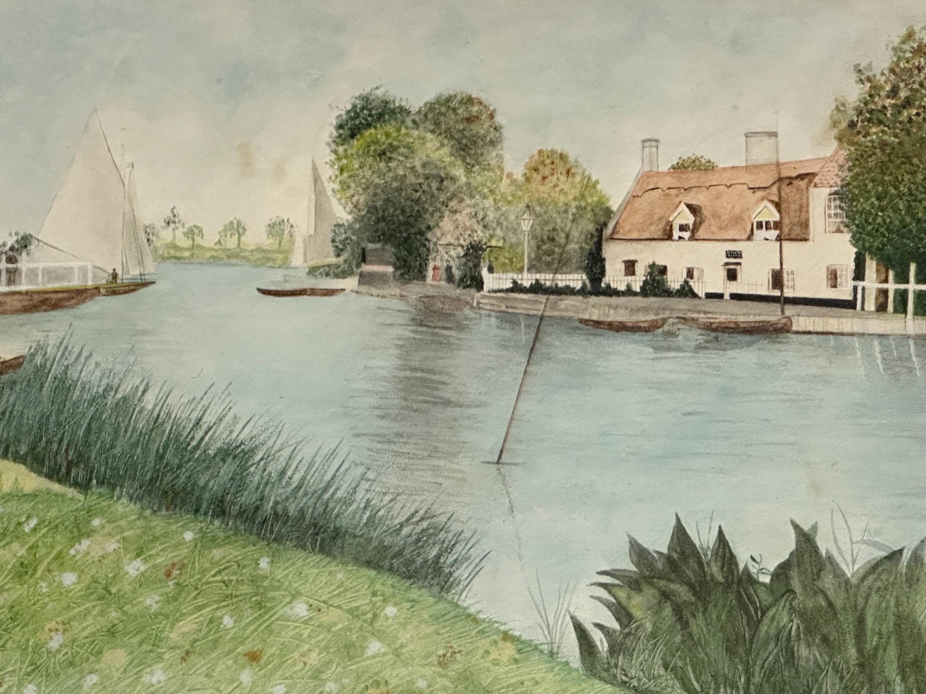 Charming original vintage watercolour depicting a tranquil riverside scene at Horning, Norfolk, showing the Ferry Inn, sailing boats and traditional waterside cottages. Soft, delicate brushwork and gentle natural tones beautifully capture the peaceful atmosphere of the Norfolk Broads.