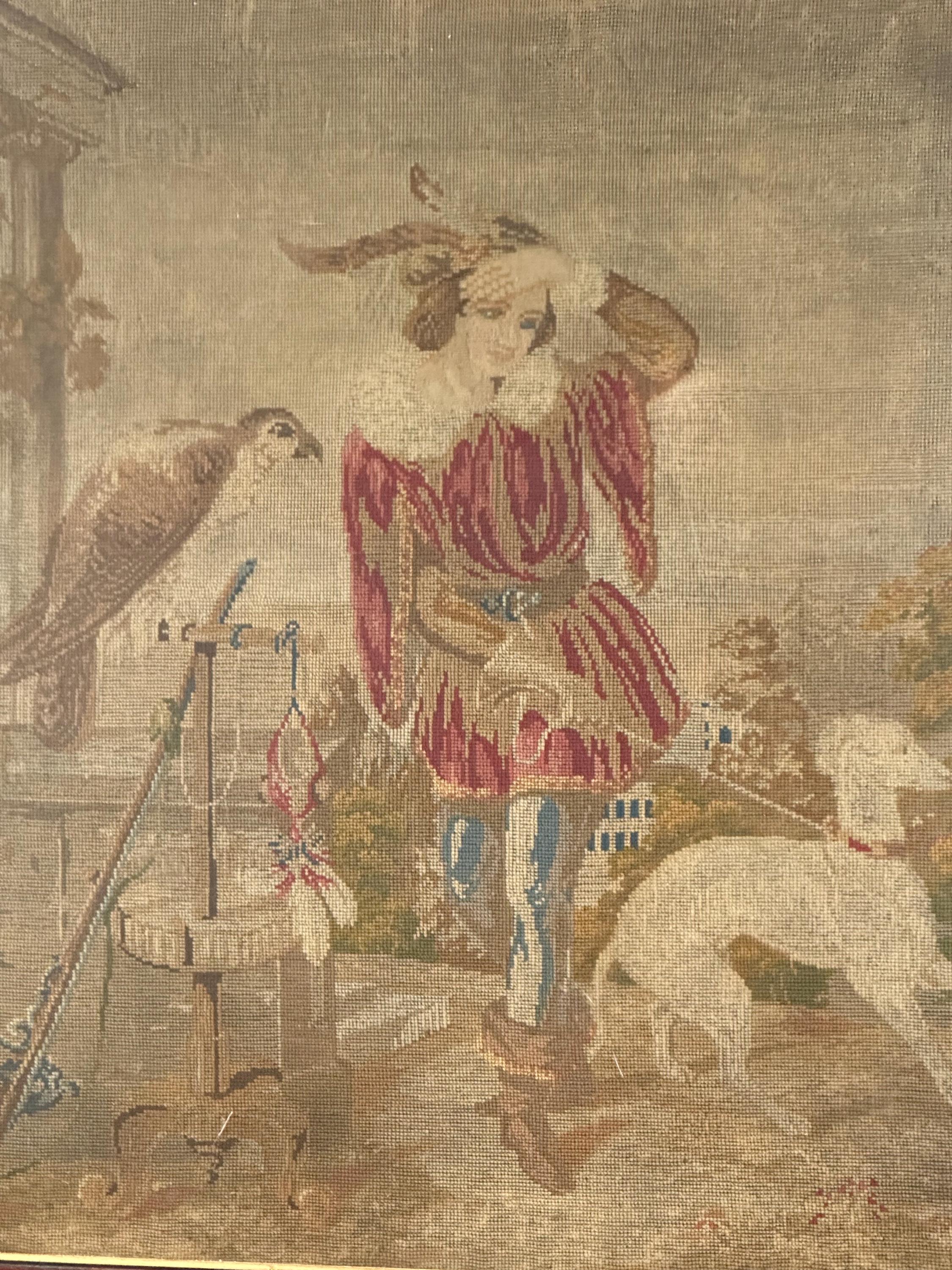 A beautiful original Victorian woolwork picture, depicting a traditional rural sporting scene featuring a falconer accompanied by his greyhound, set within a romantic countryside landscape.