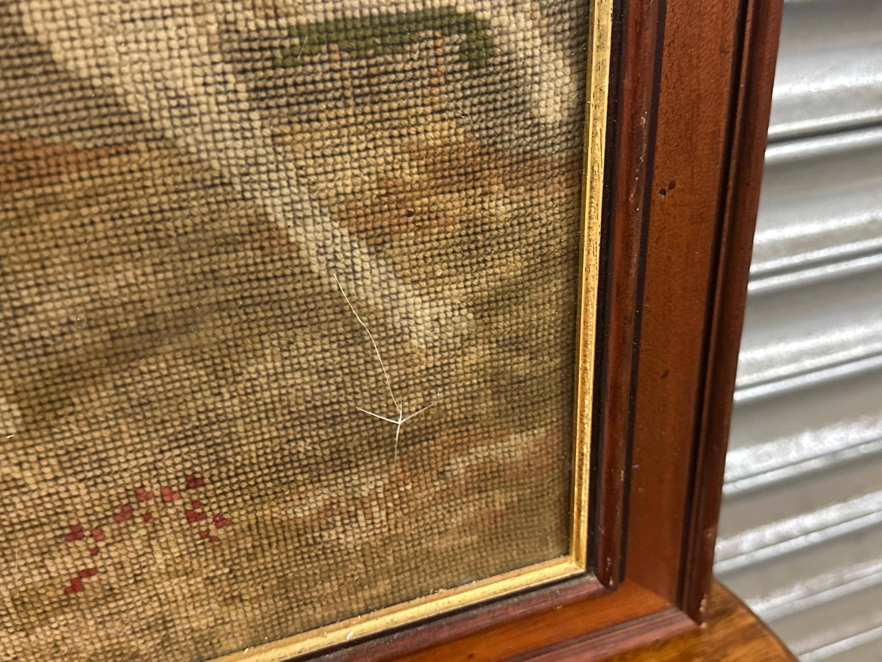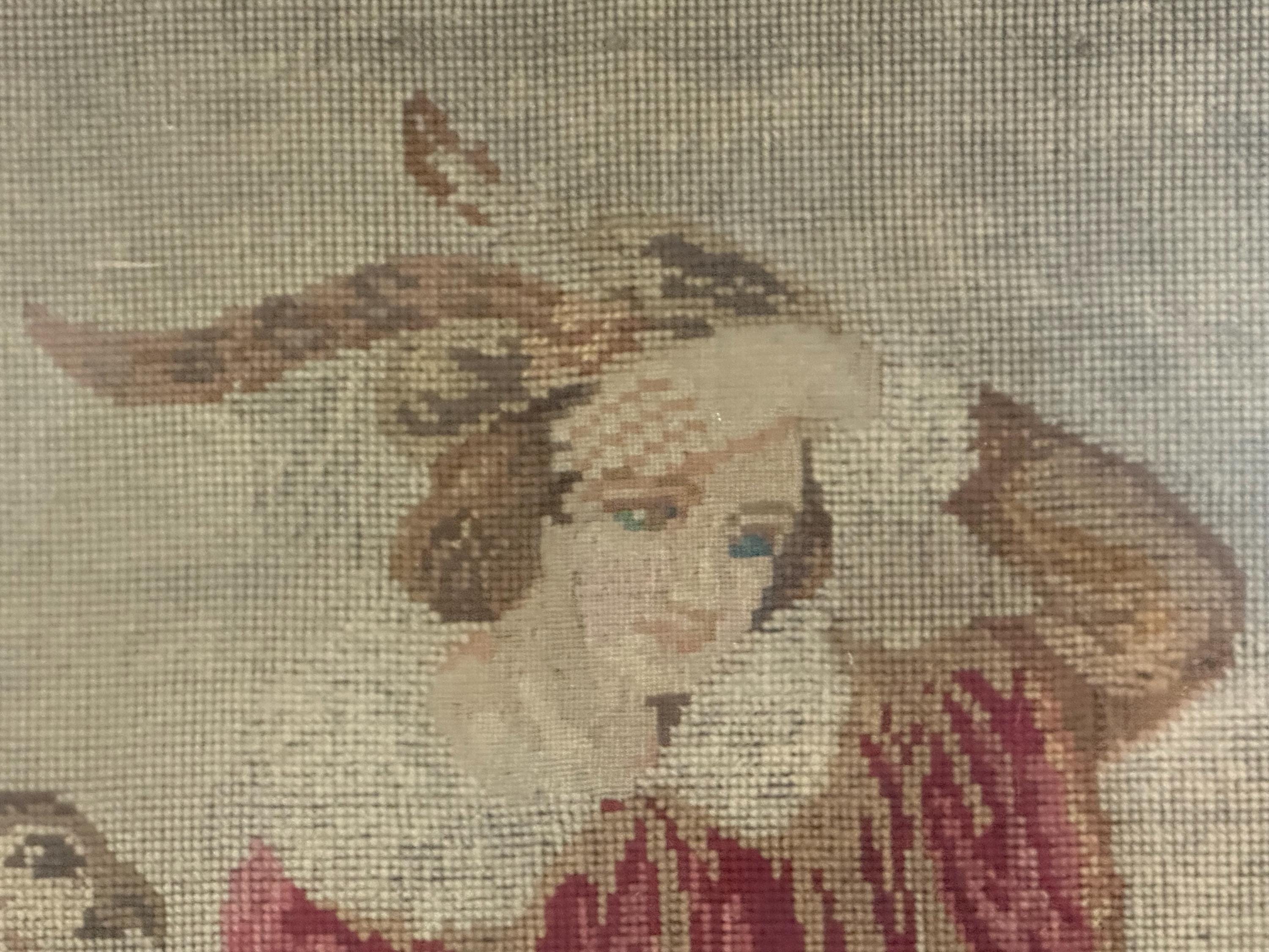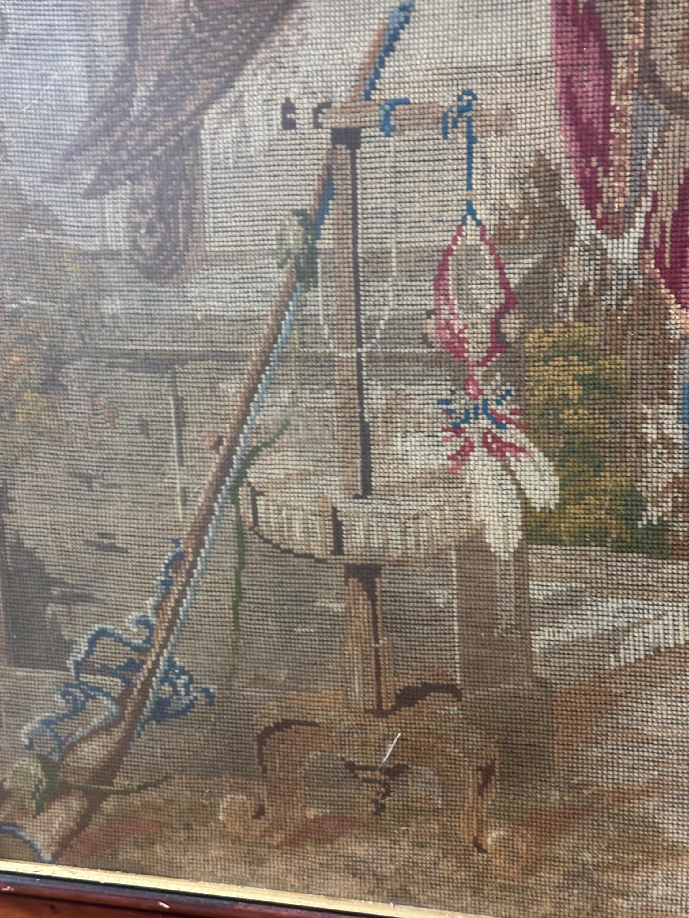 Richly coloured and finely worked, this charming textile artwork captures the elegance and nostalgia of 19th-century country life. The detailed figures, sweeping sky and pastoral setting make this a particularly decorative and collectible example of Victorian needlework.