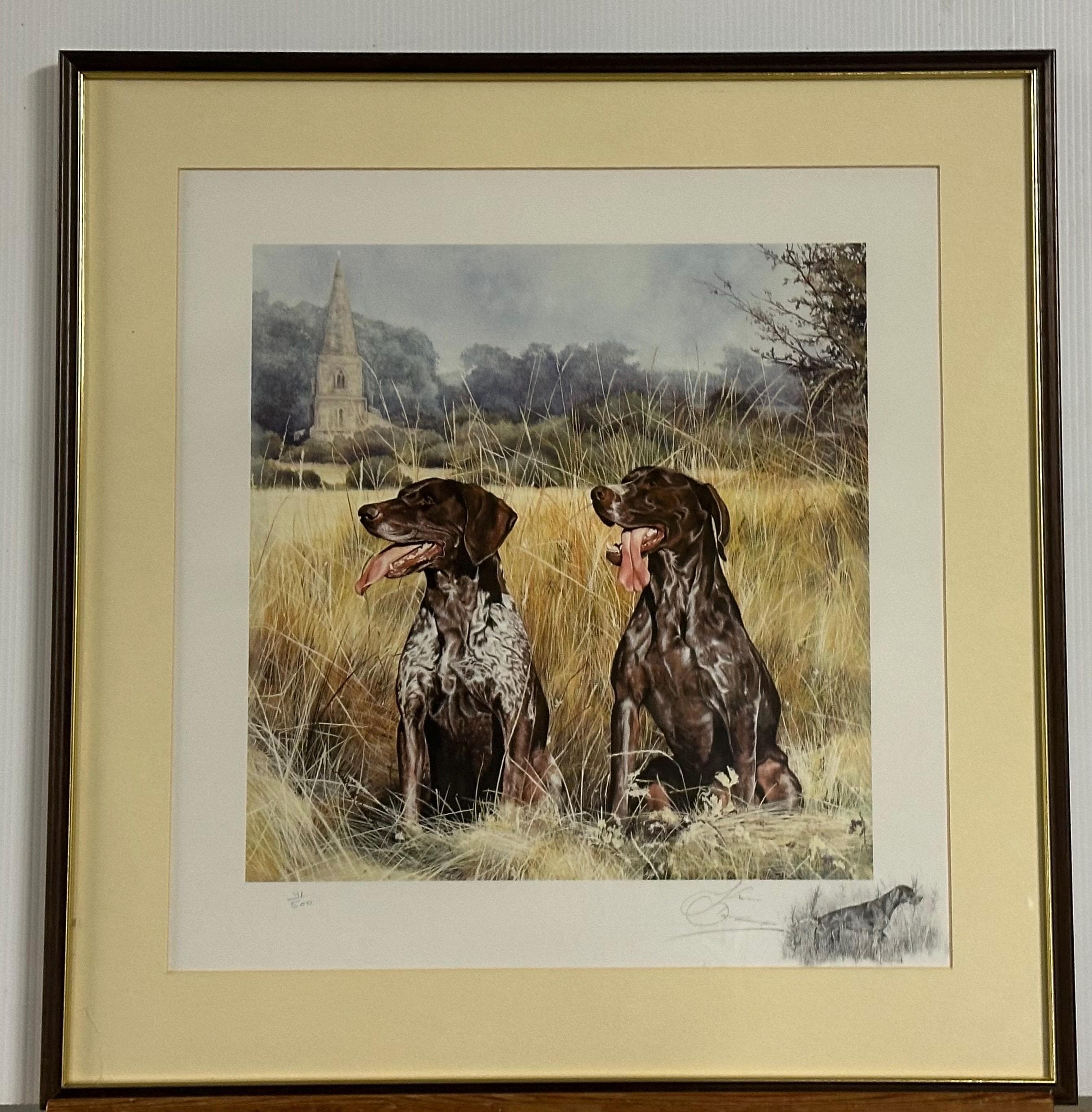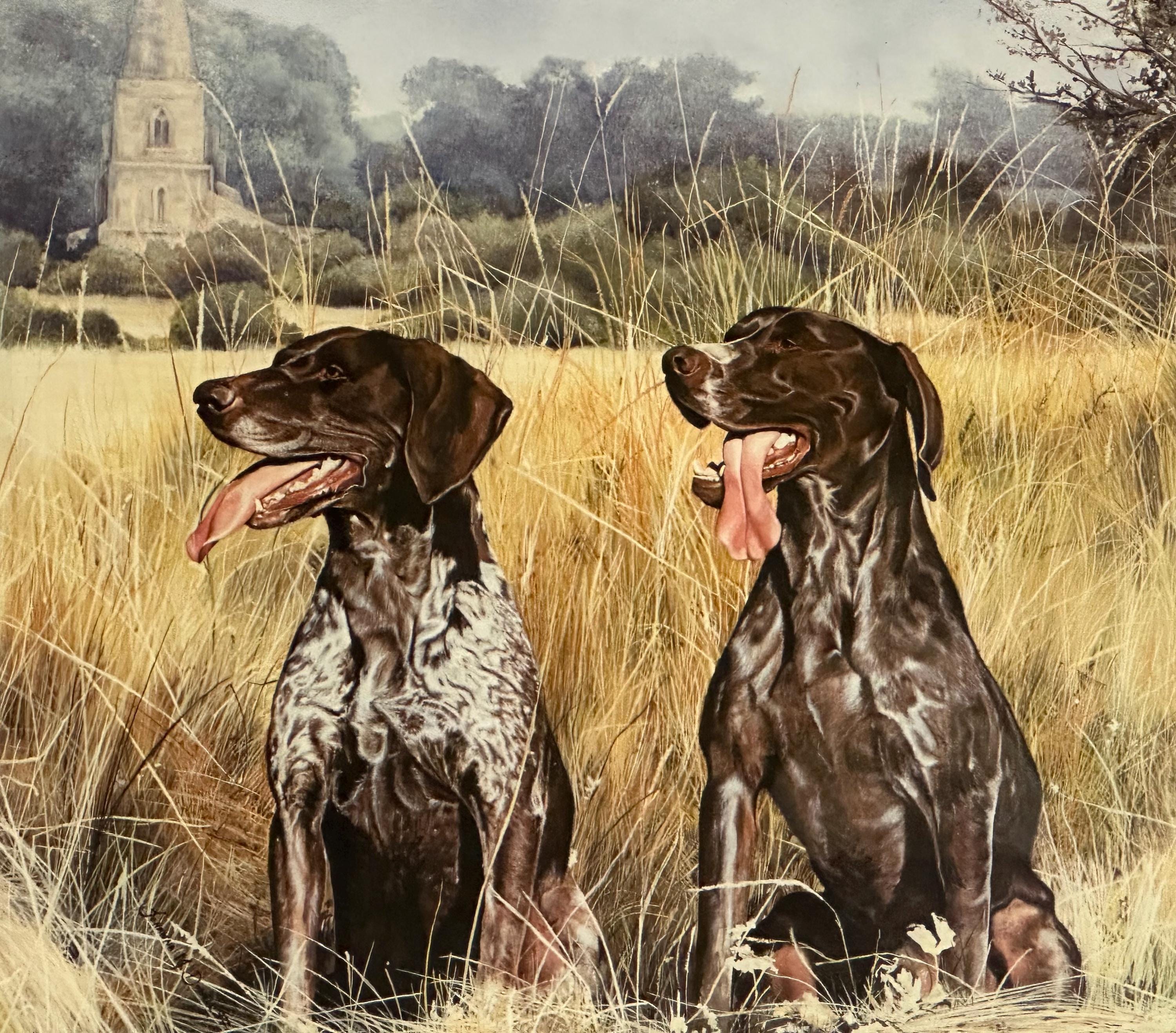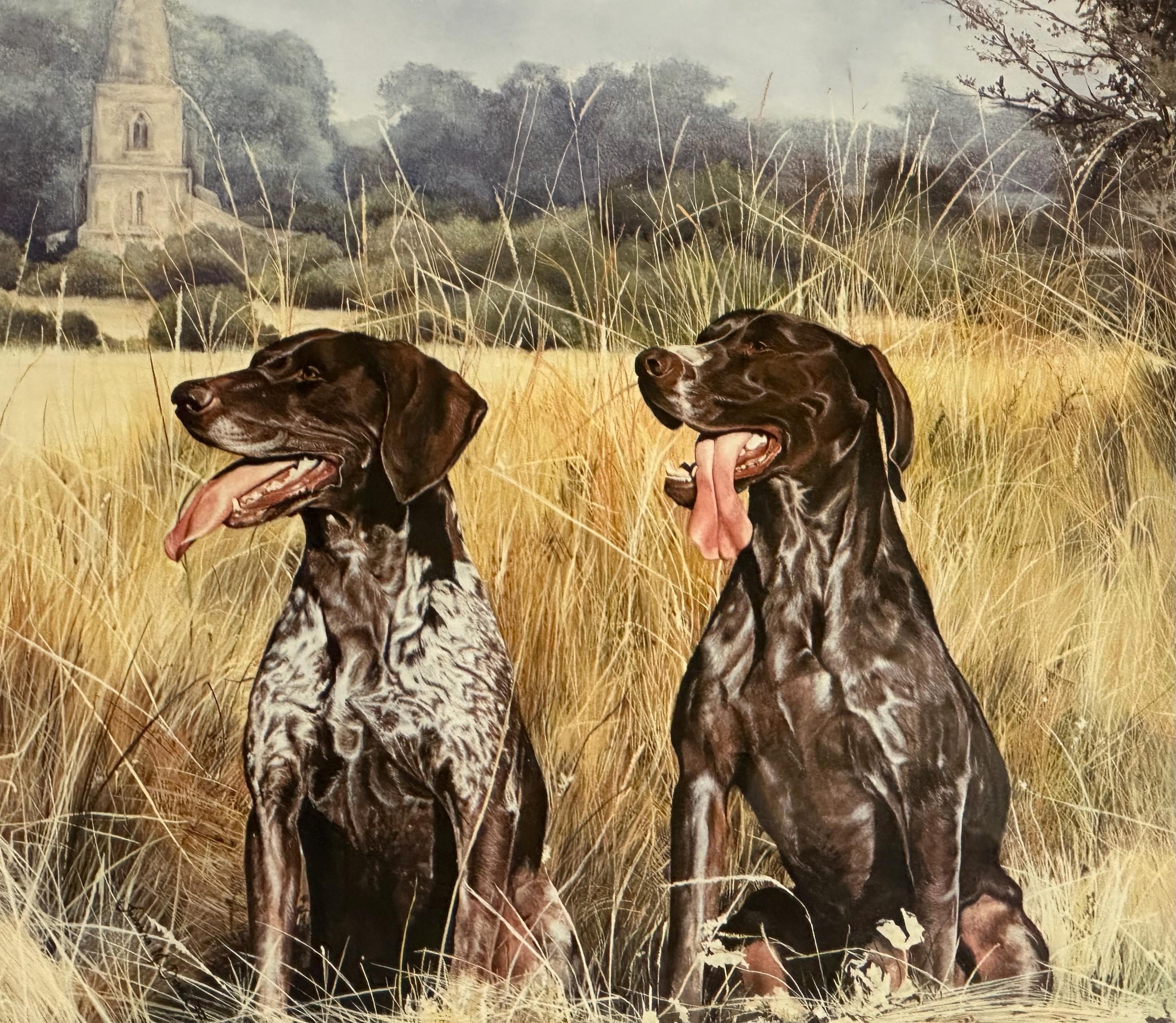Beautiful limited edition print by Johanna Dowell, depicting two German Short-Haired Pointers seated alertly in tall meadow grasses, set against a tranquil English countryside landscape with a church spire in the distance. Dowell’s skillful realism and attention to anatomy and expression capture the intelligence, strength, and character of this classic sporting breed.