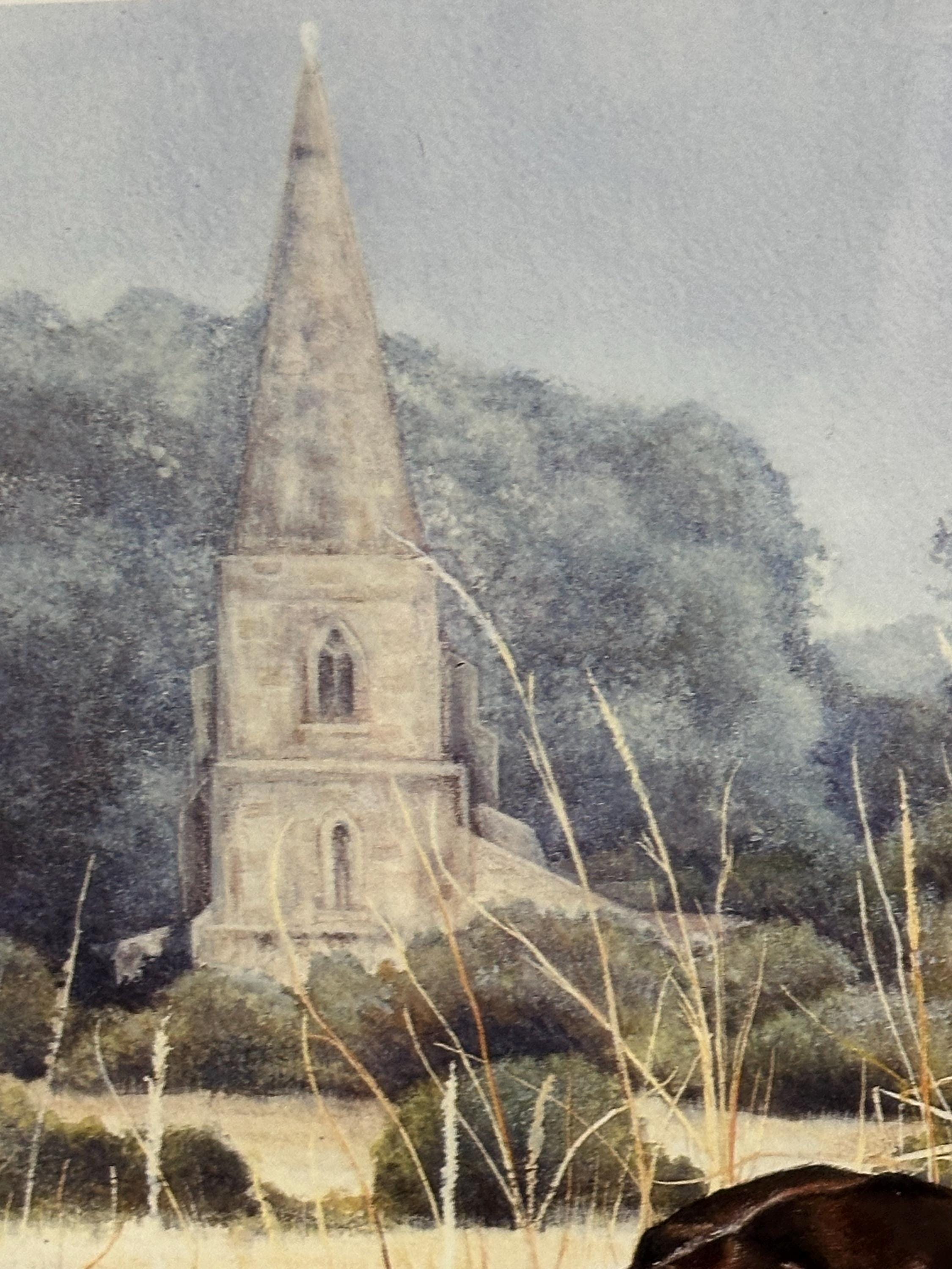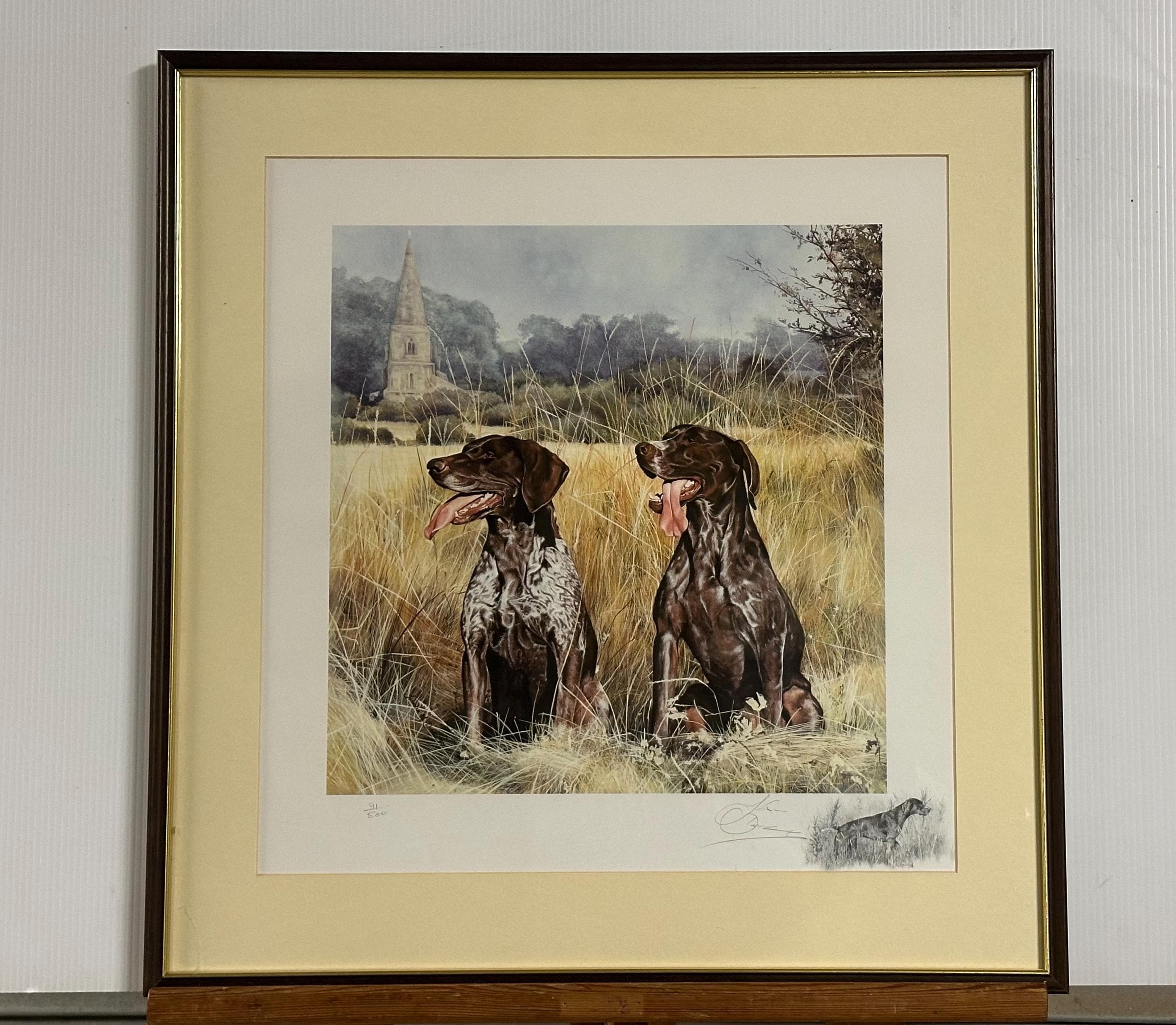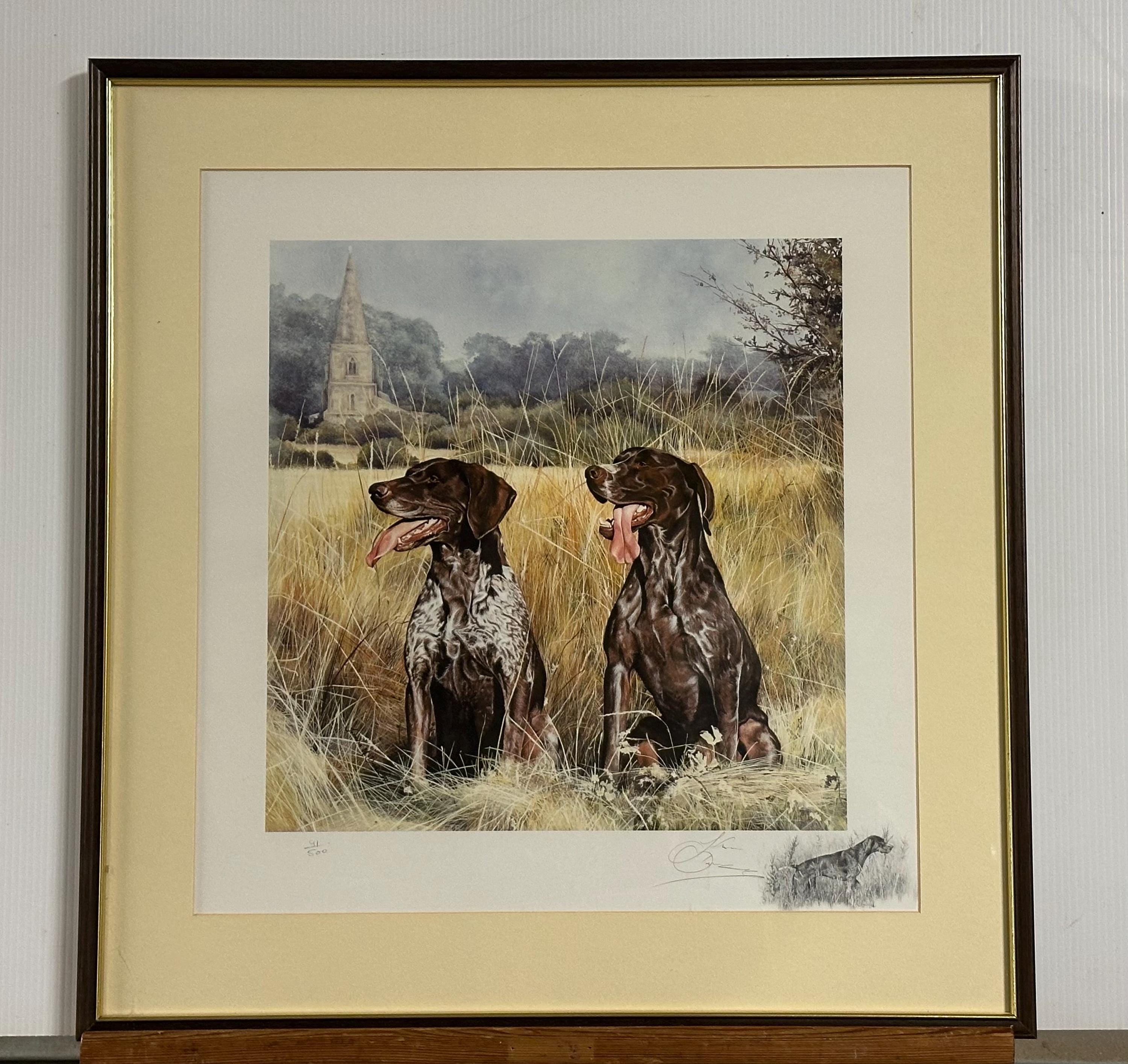 Beautiful limited edition print by Johanna Dowell, depicting two German Short-Haired Pointers seated alertly in tall meadow grasses, set against a tranquil English countryside landscape with a church spire in the distance. Dowell’s skillful realism and attention to anatomy and expression capture the intelligence, strength, and character of this classic sporting breed.