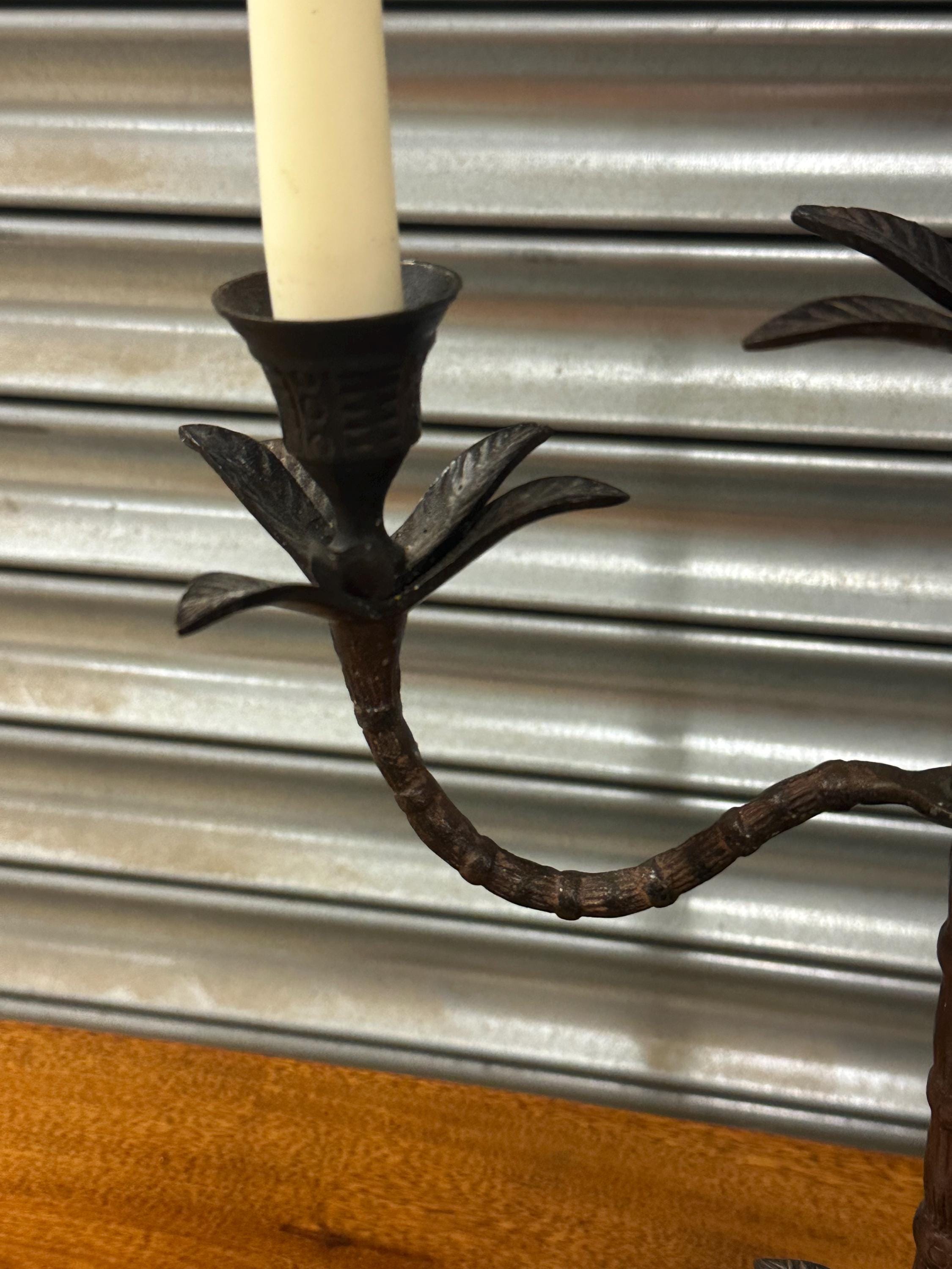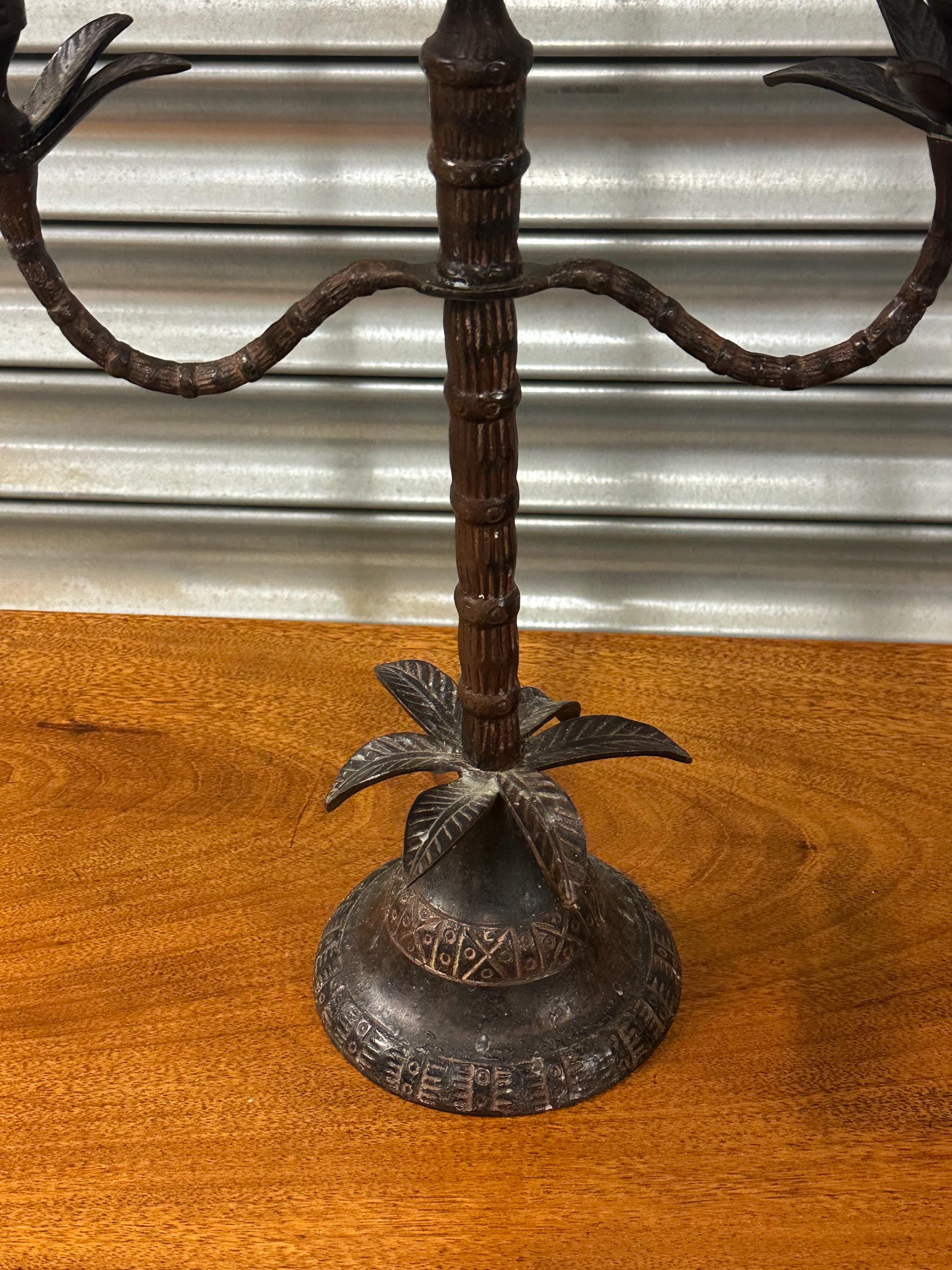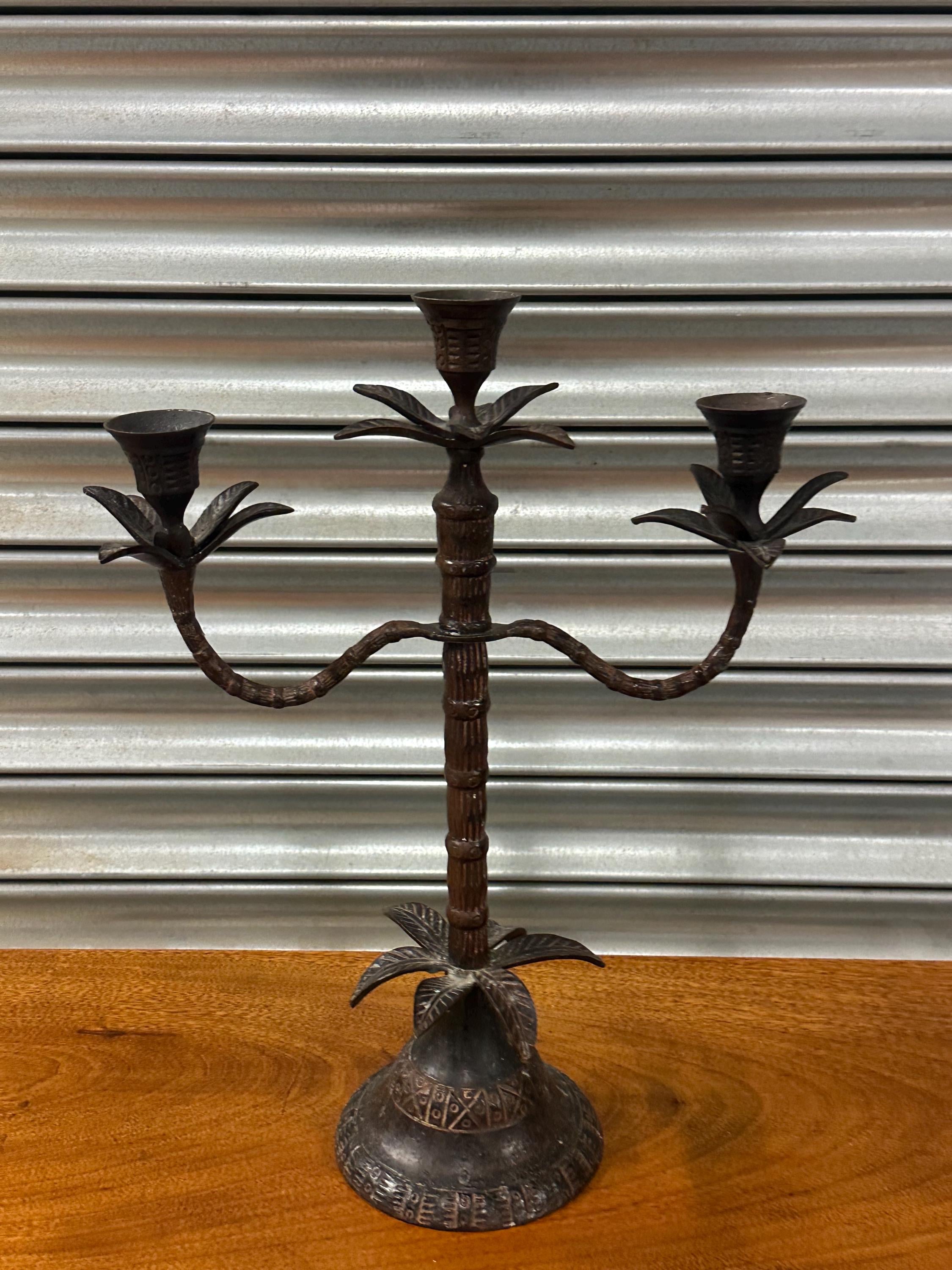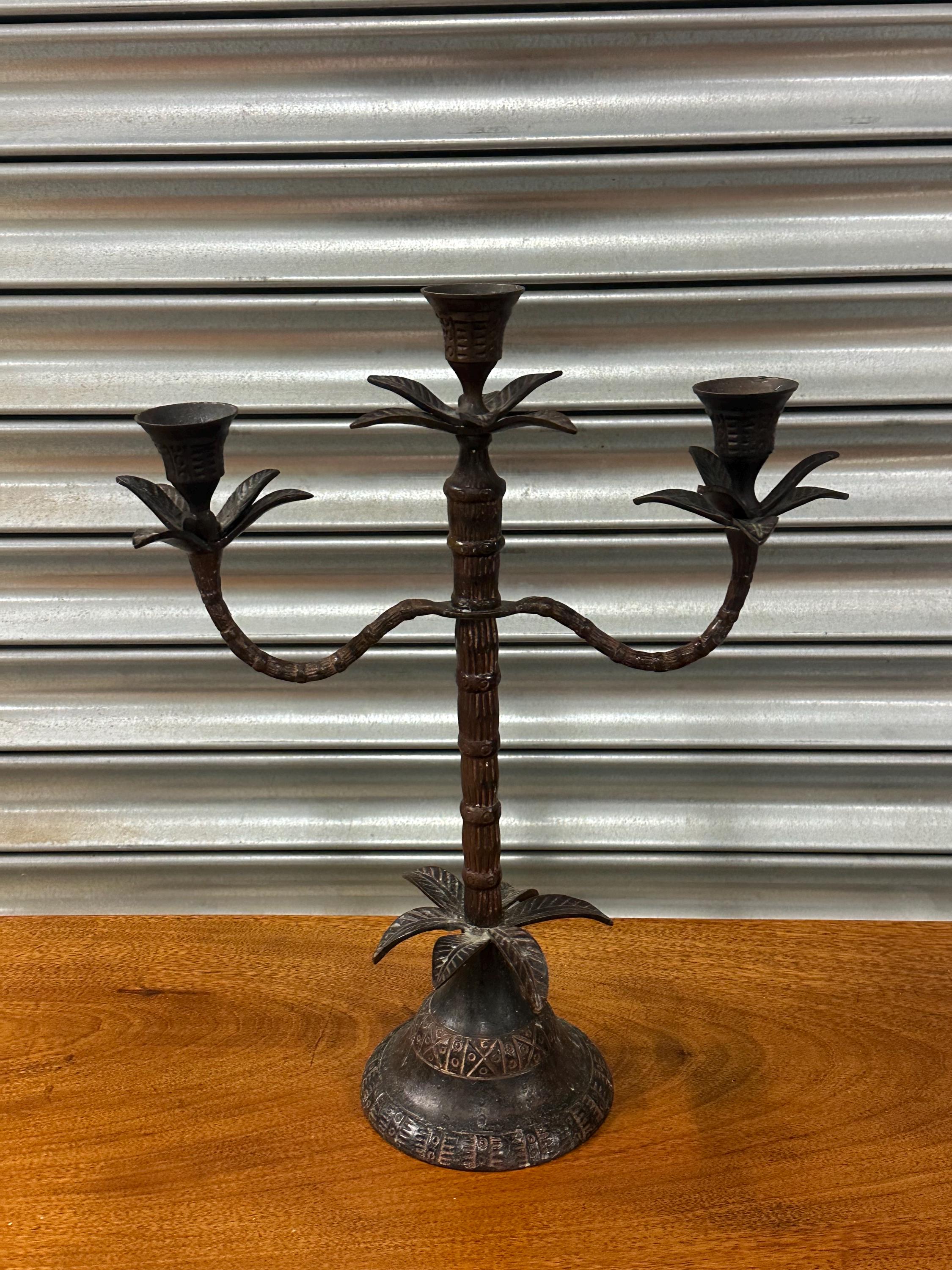 🌿 Antique Circa 1920’s Bronze Three-Arm Candelabra, Decorative Palm Leaf Design