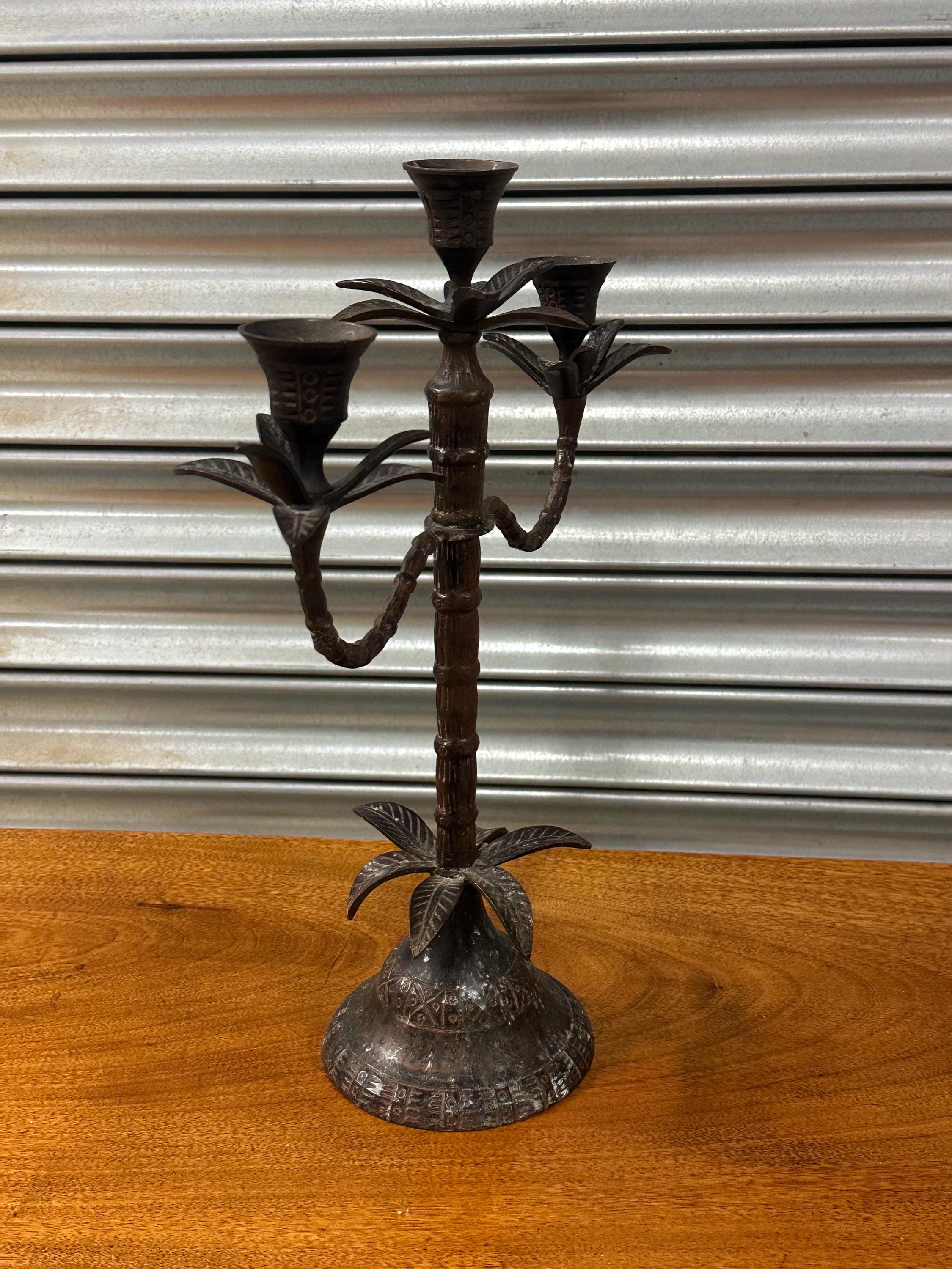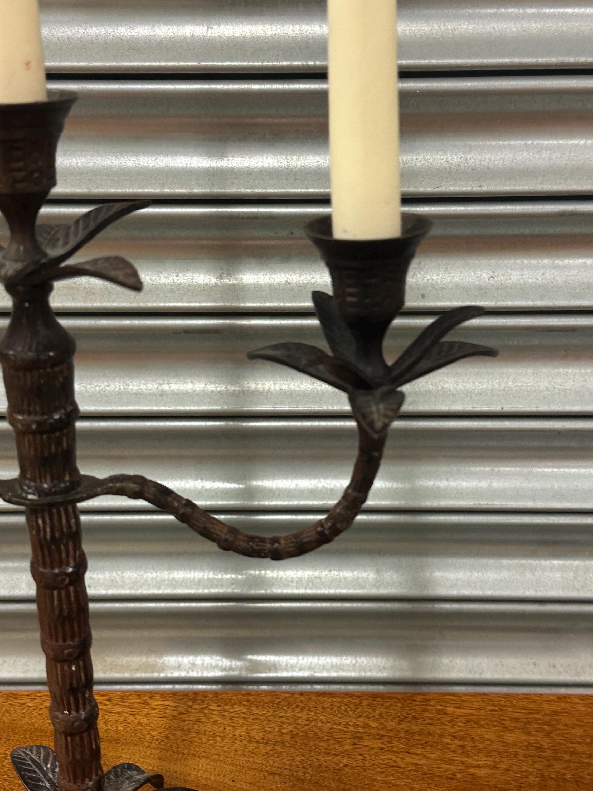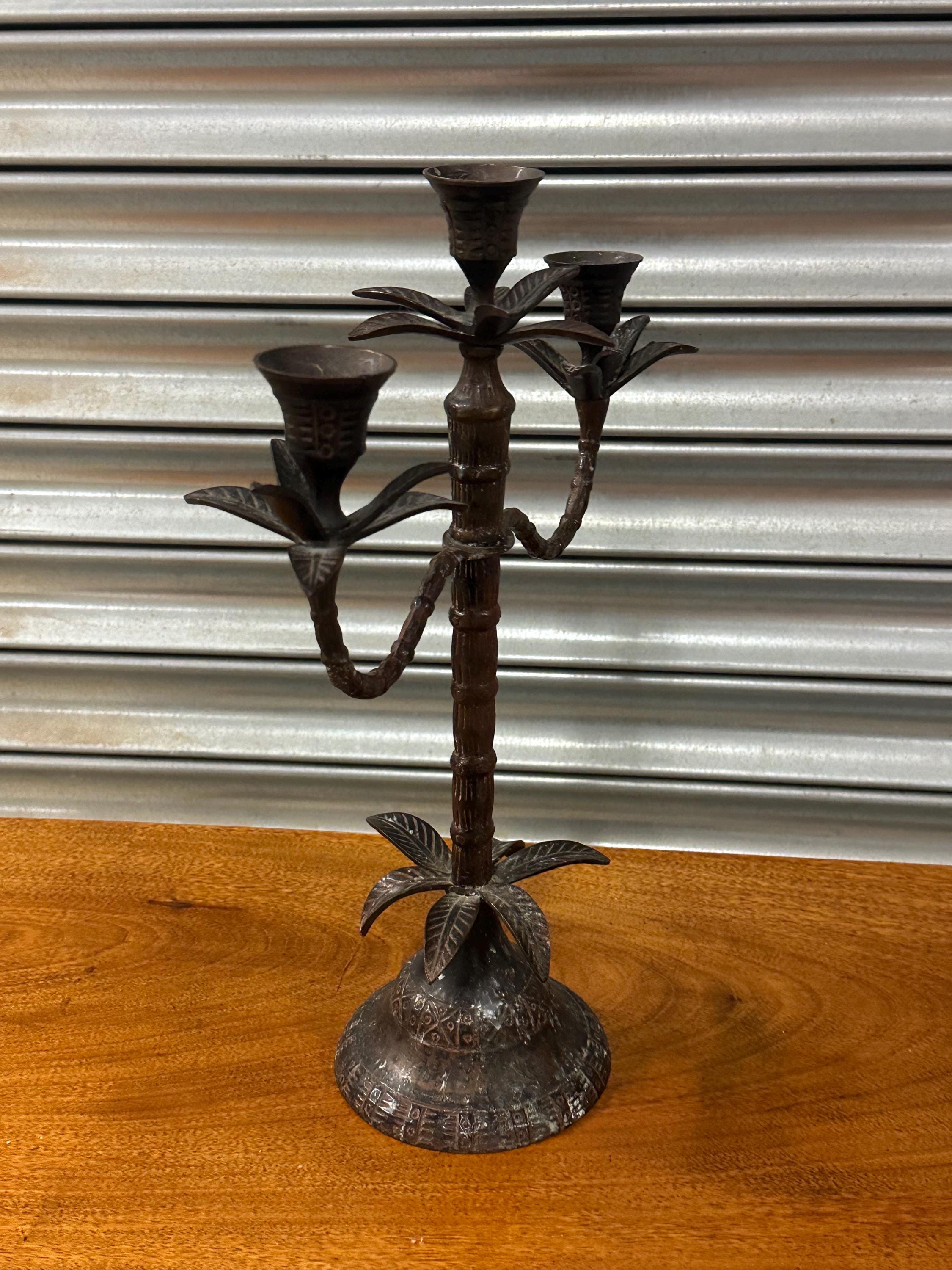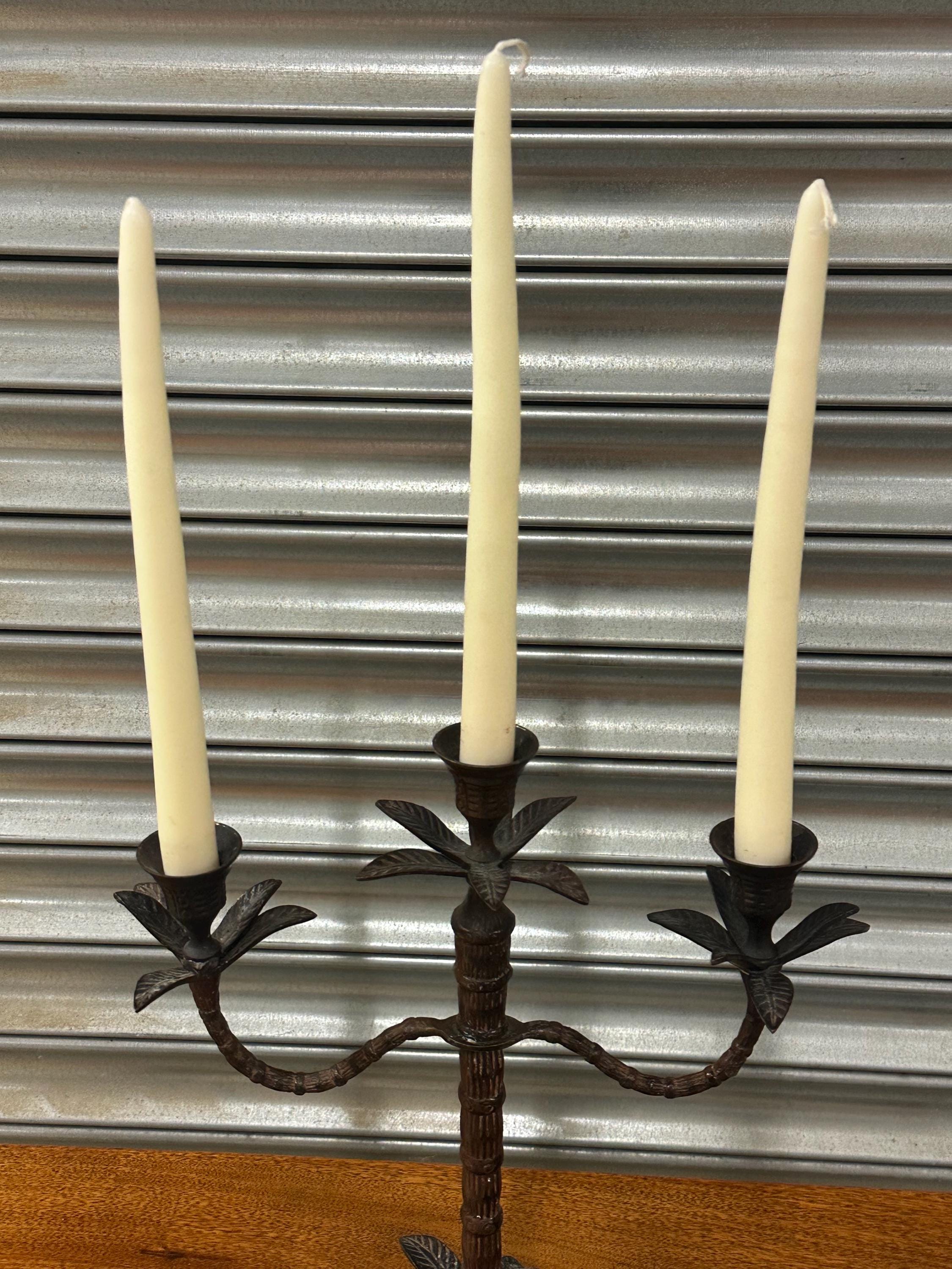🌿 Antique Circa 1920’s Bronze Three-Arm Candelabra, Decorative Palm Leaf Design