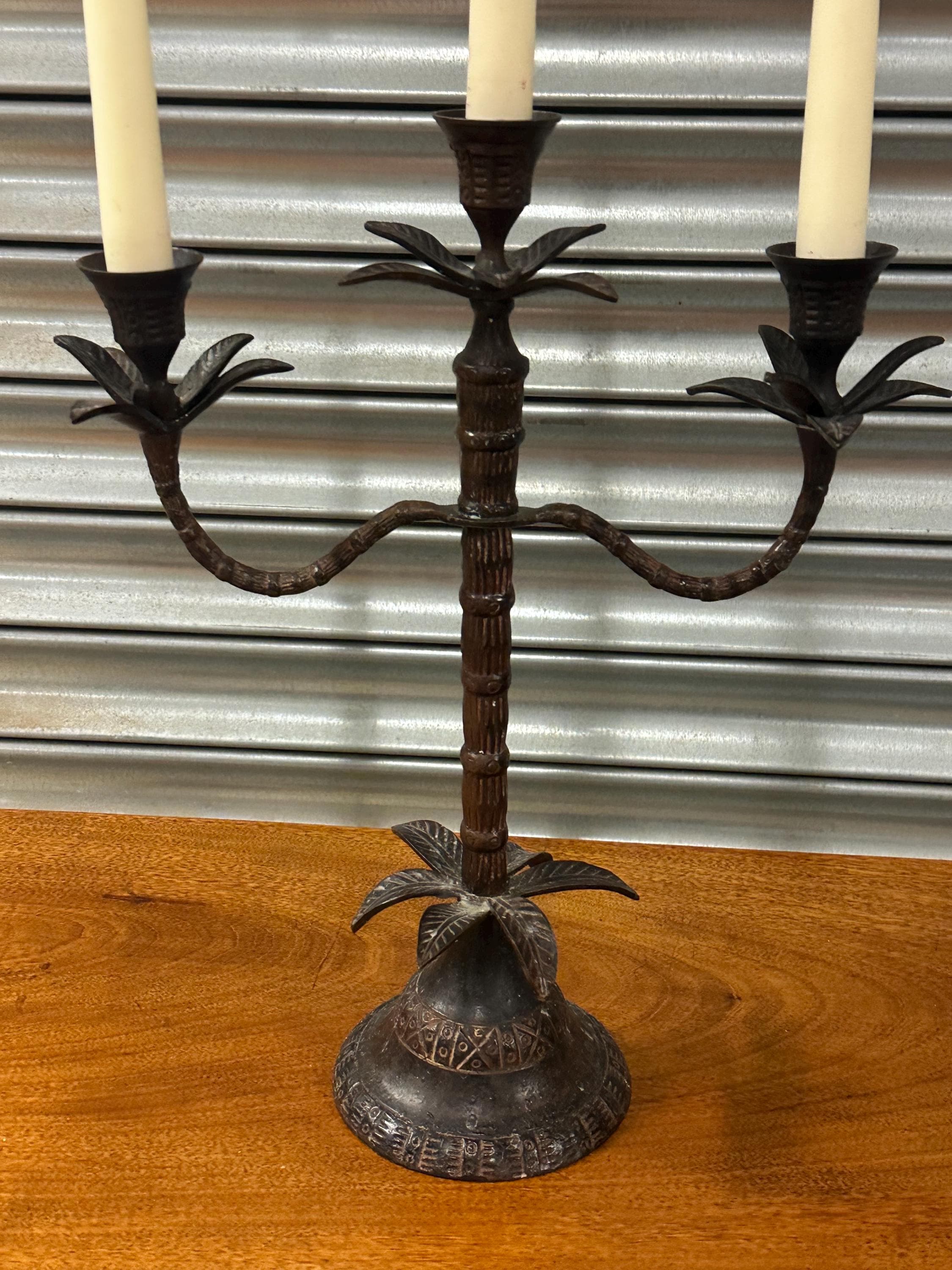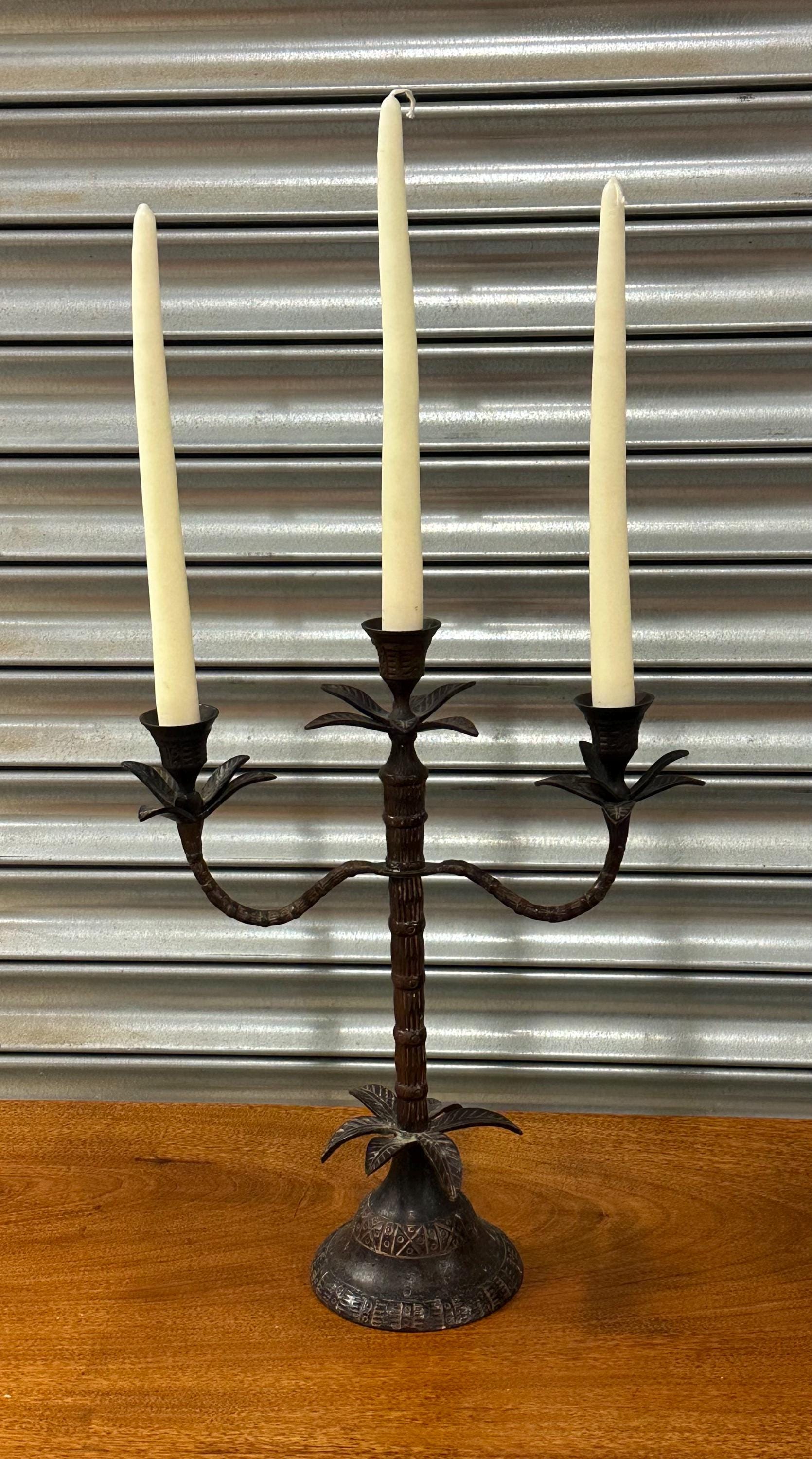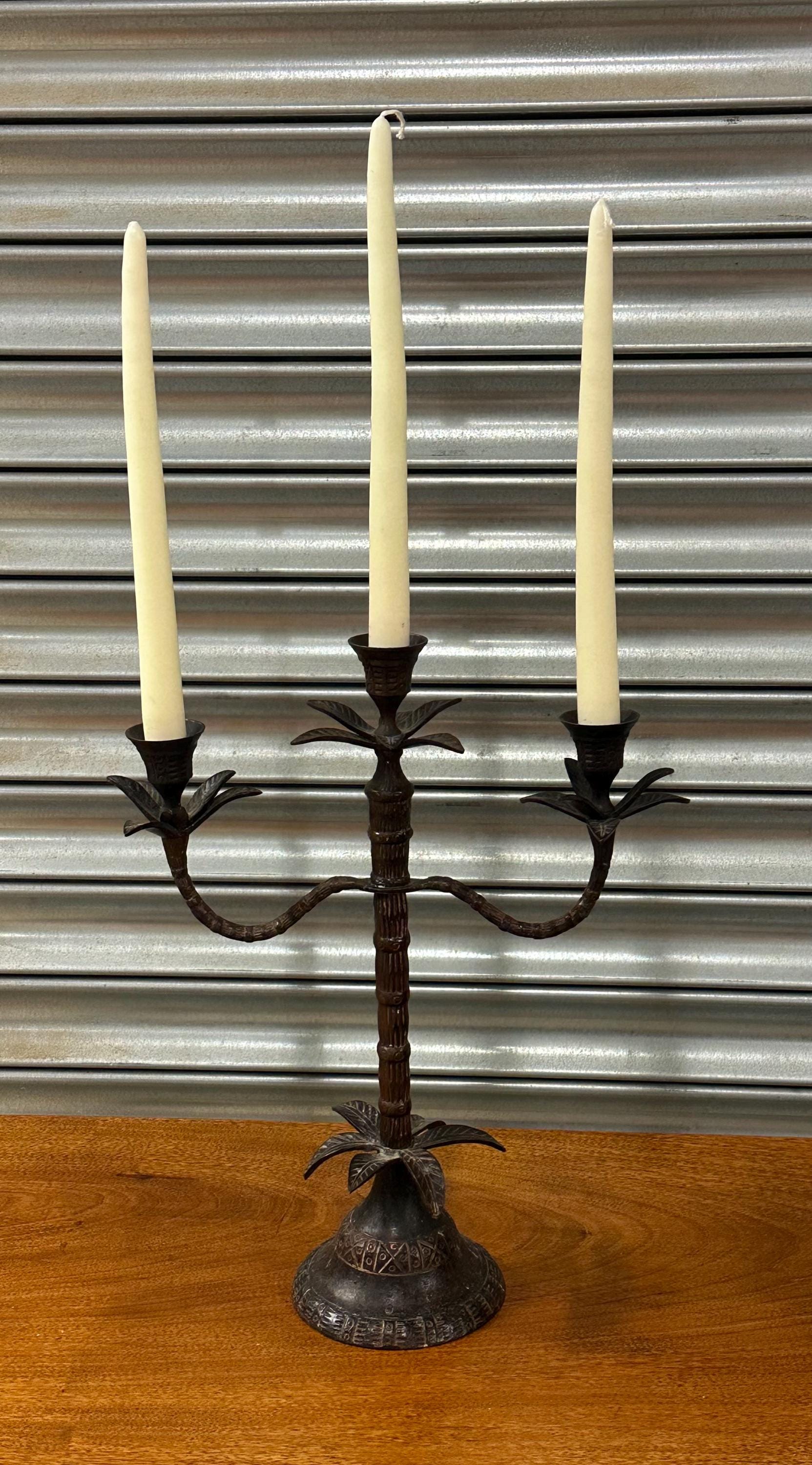 A striking vintage bronze candelabra featuring three gracefully curved candle arms around a central stem, beautifully detailed with palm-style leaves and textured decoration throughout.