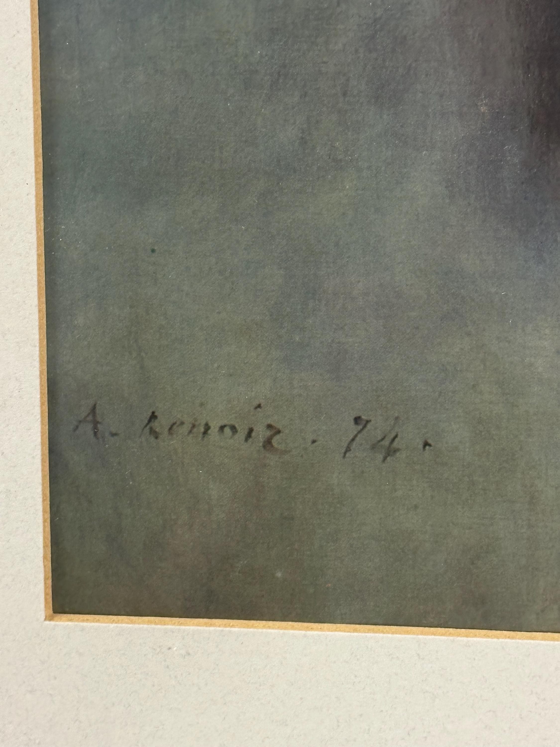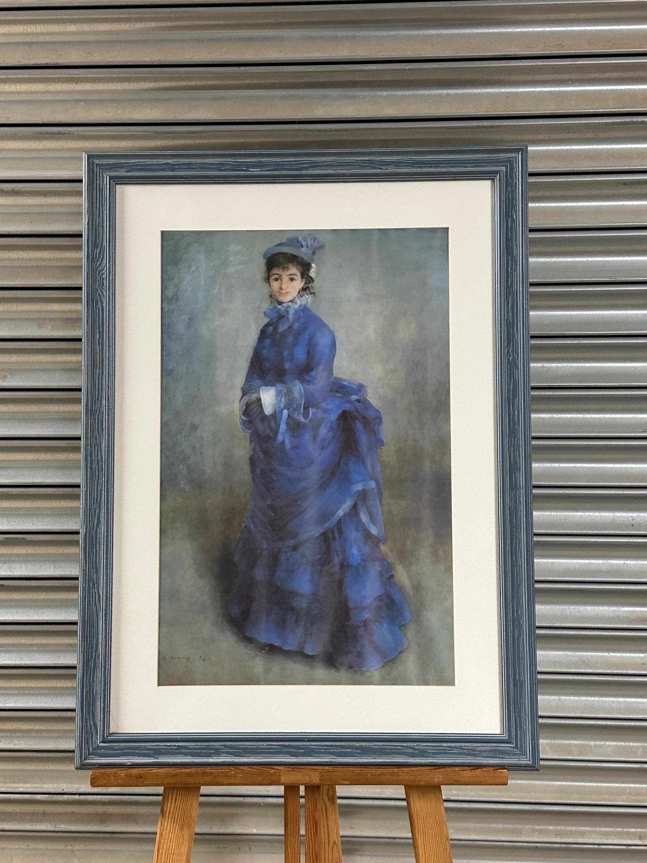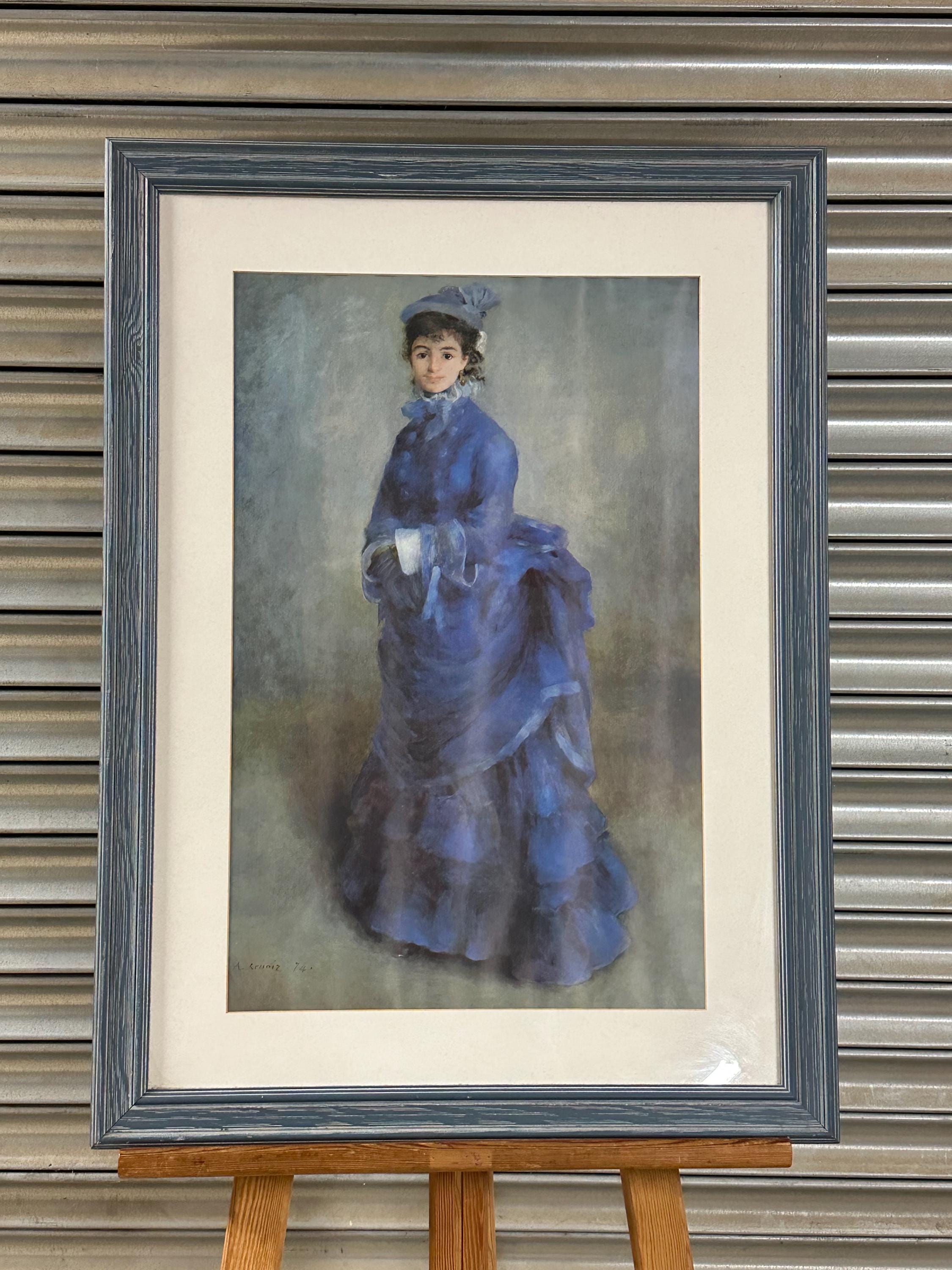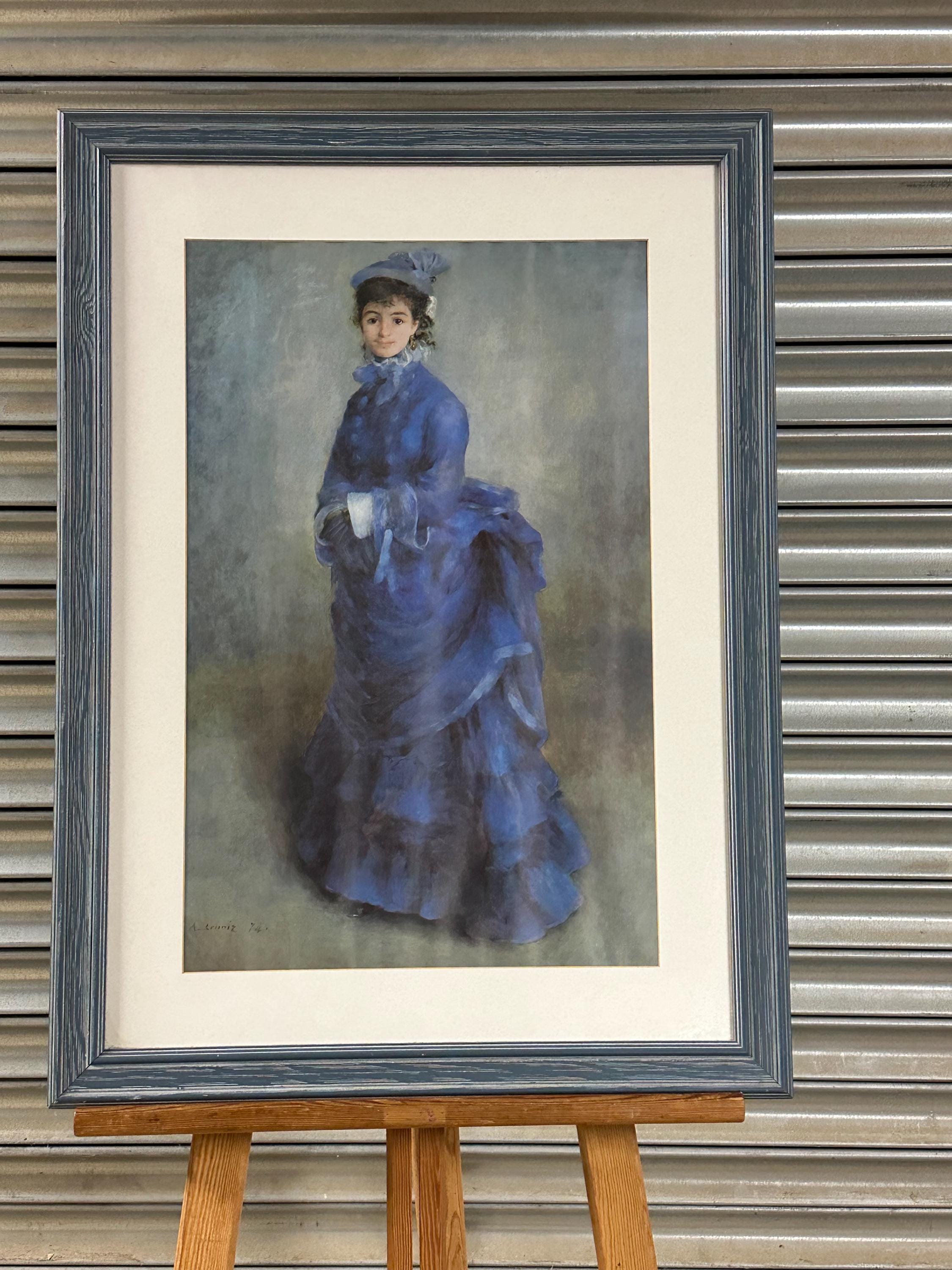 Beautiful framed art print after Pierre-Auguste Renoir, depicting an elegant young lady in a flowing blue dress, a classic Impressionist subject full of softness, movement and charm.