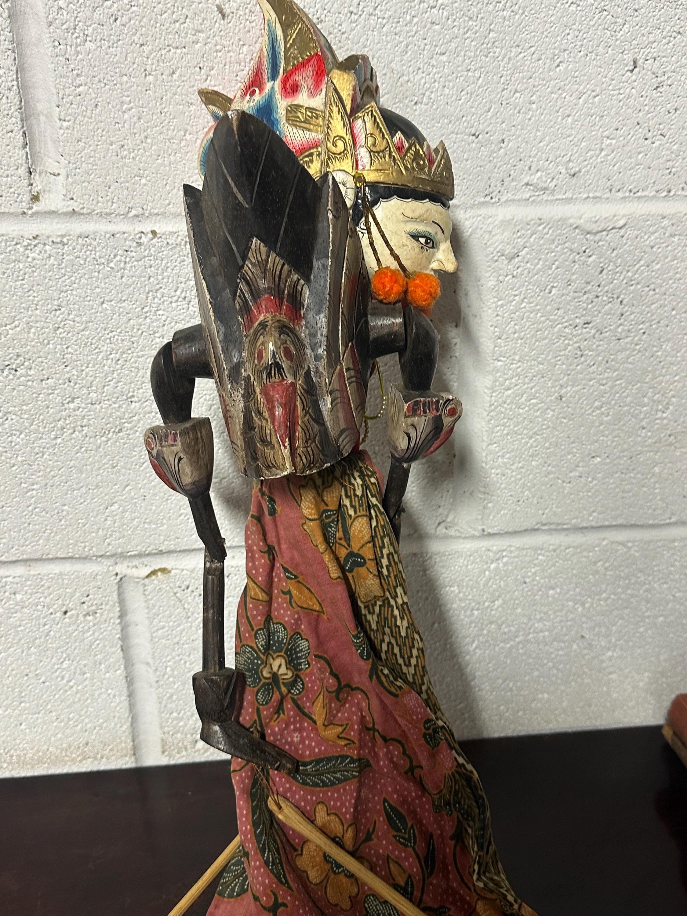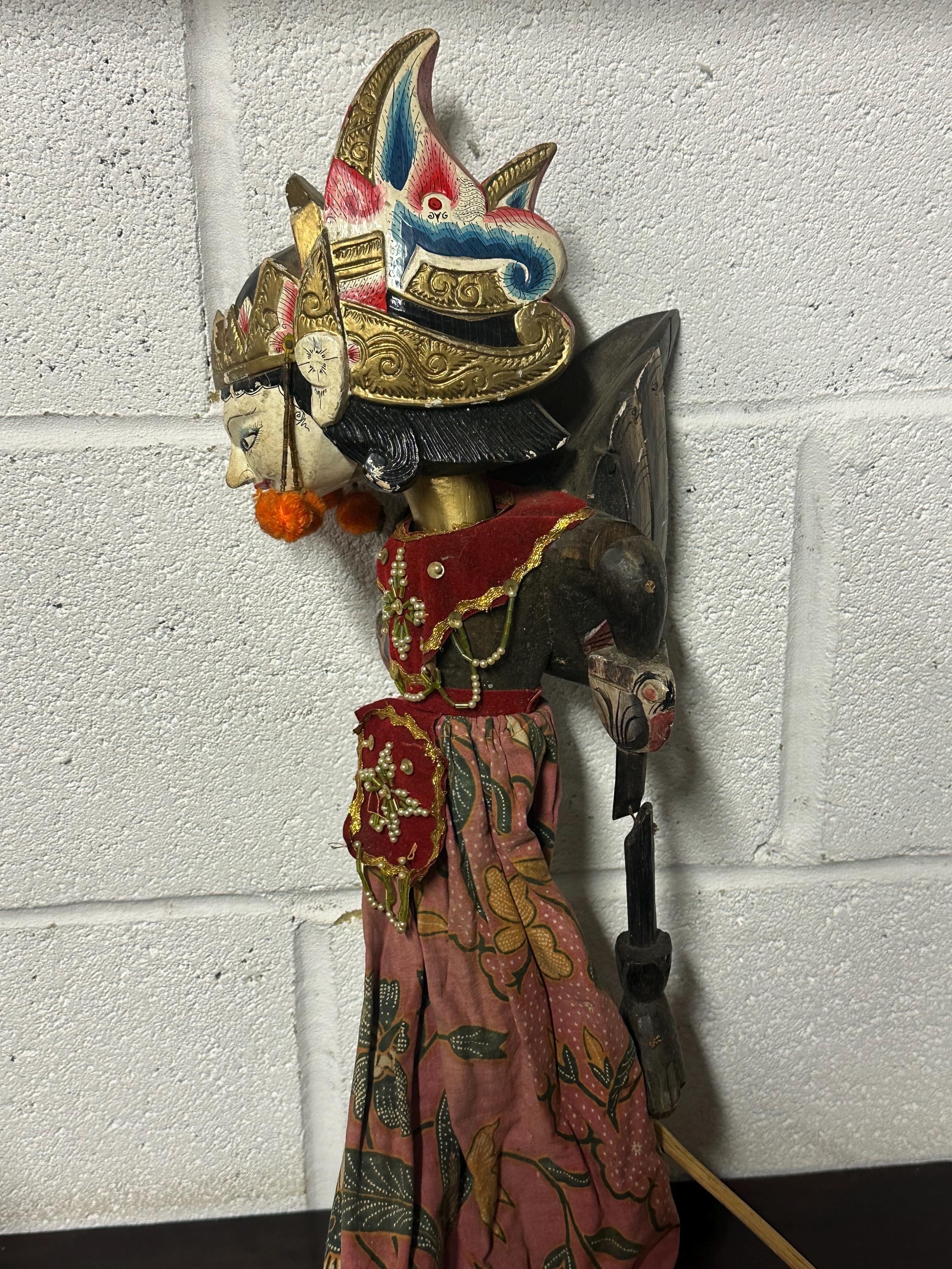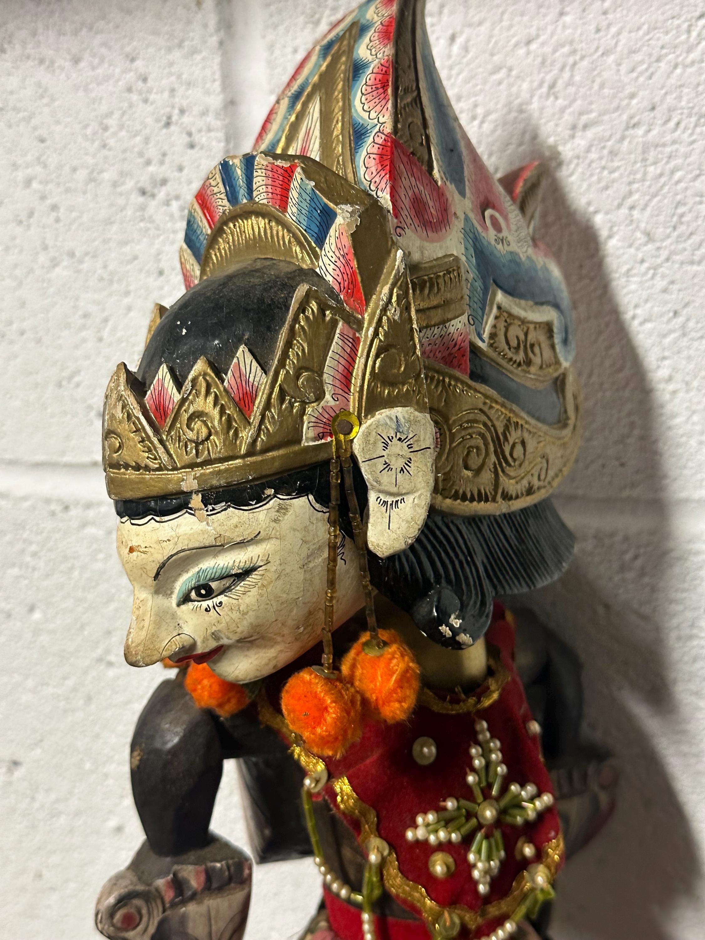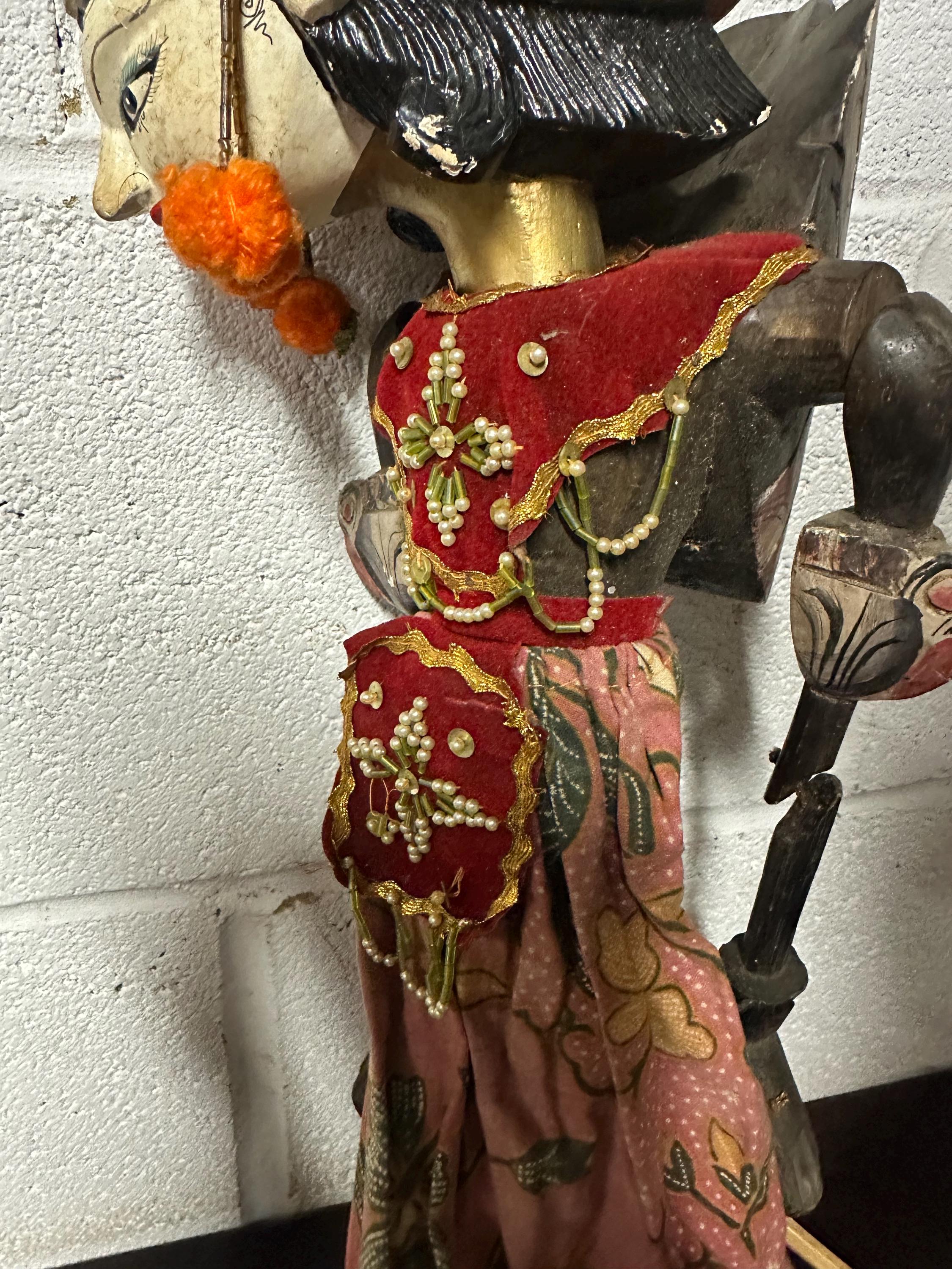 A beautifully detailed vintage Indonesian wooden rod puppet, hand-carved and hand-painted in the traditional Wayang Golek style.