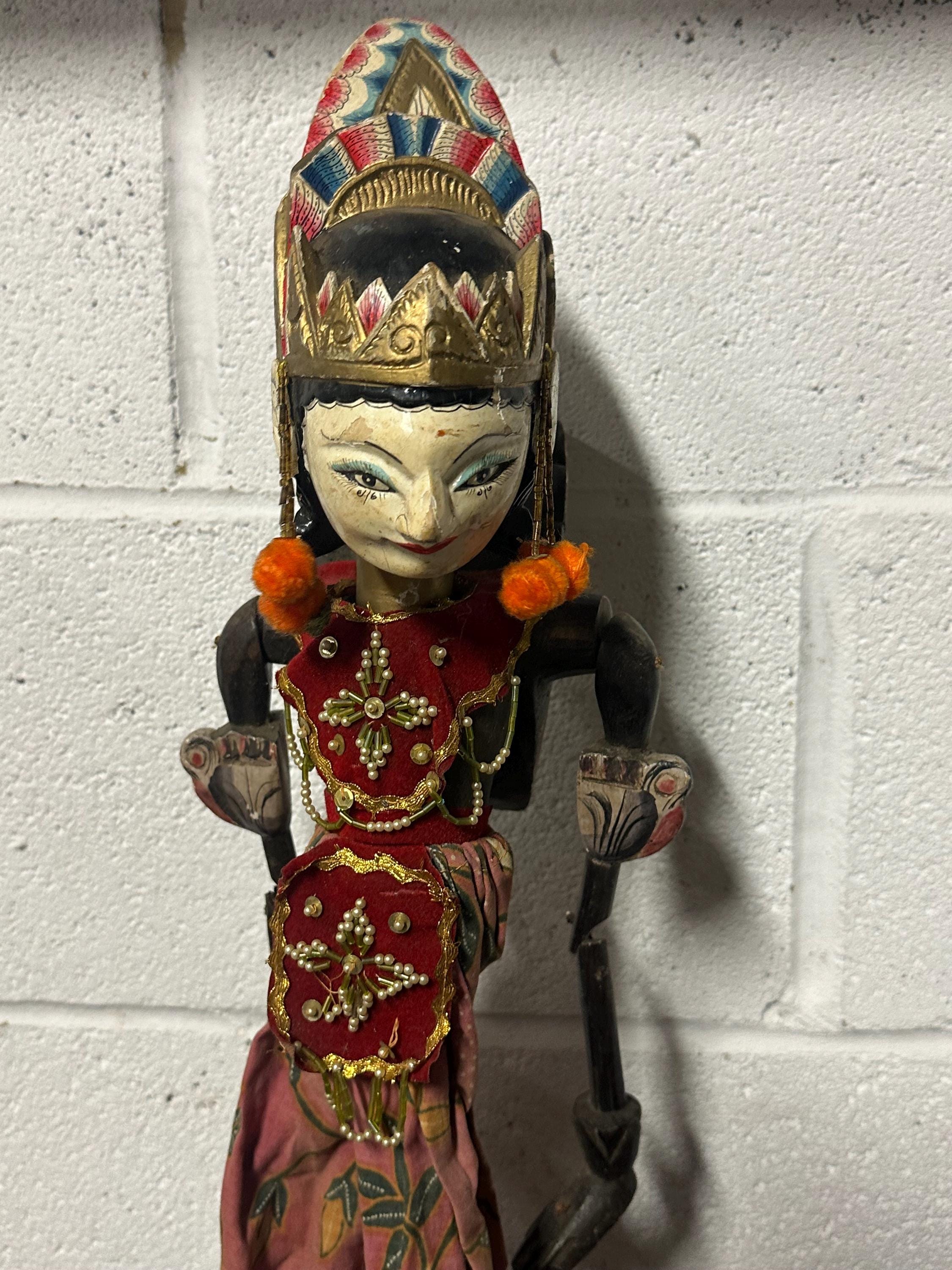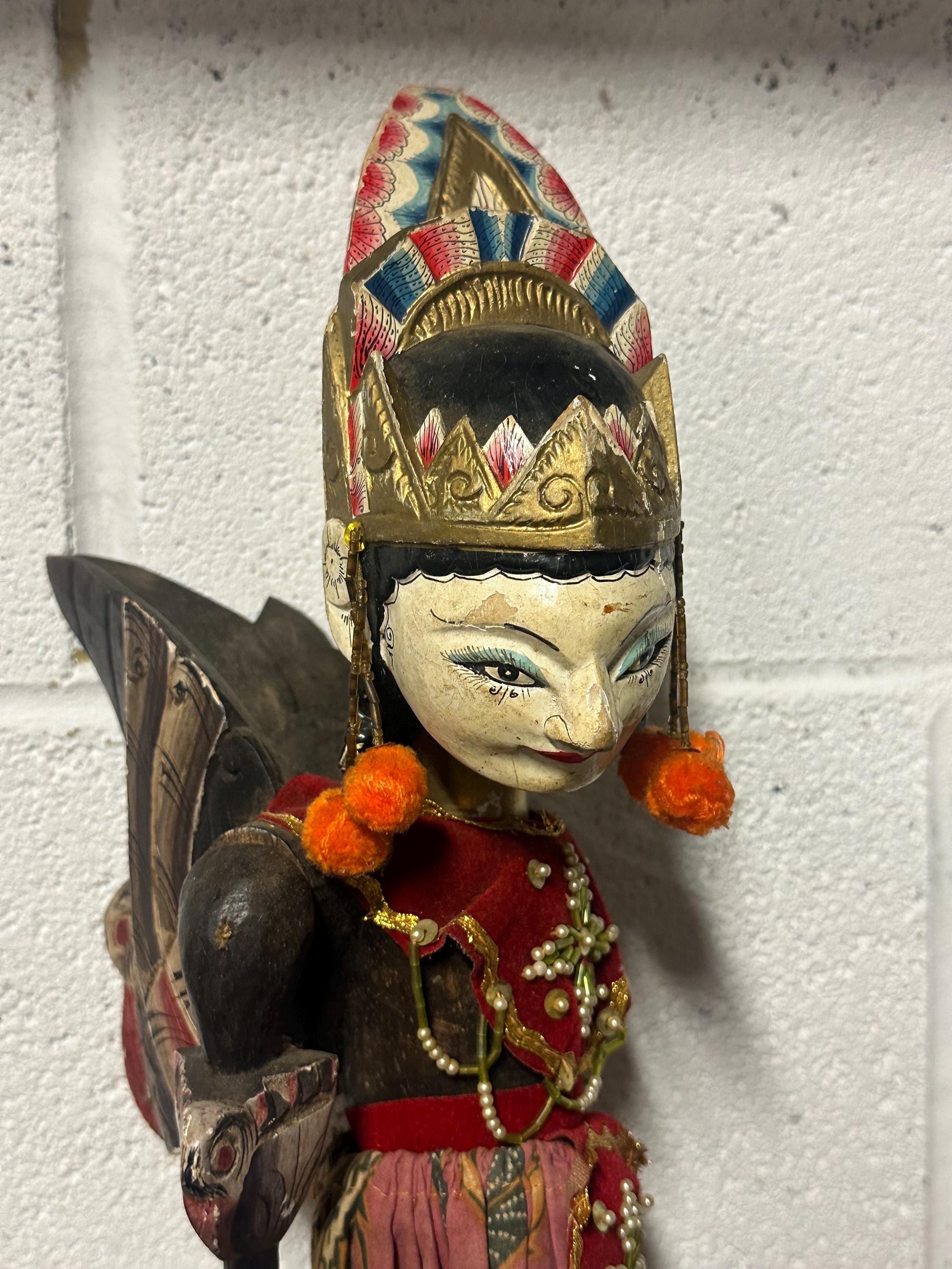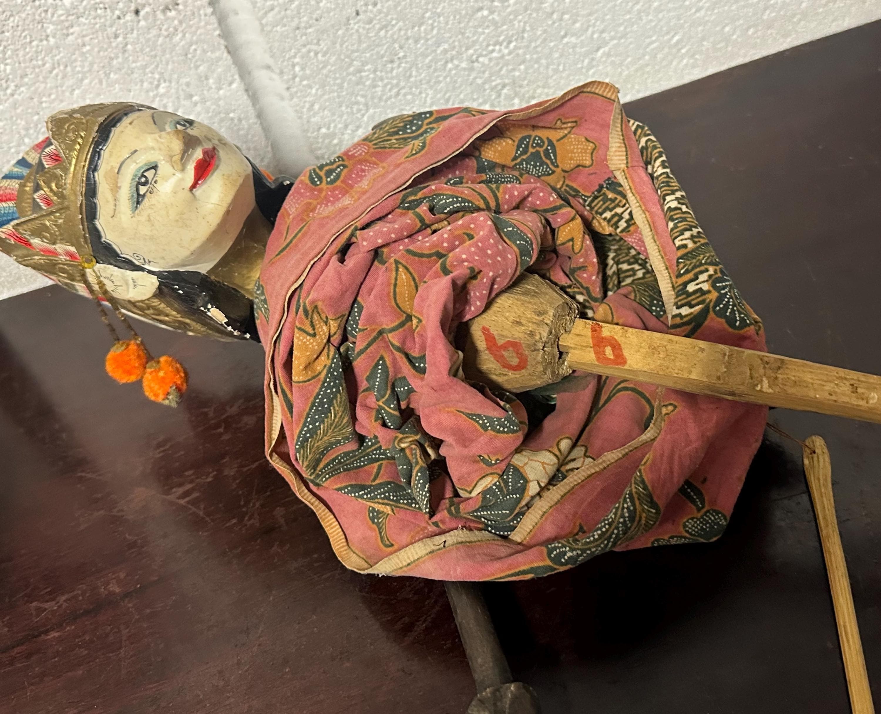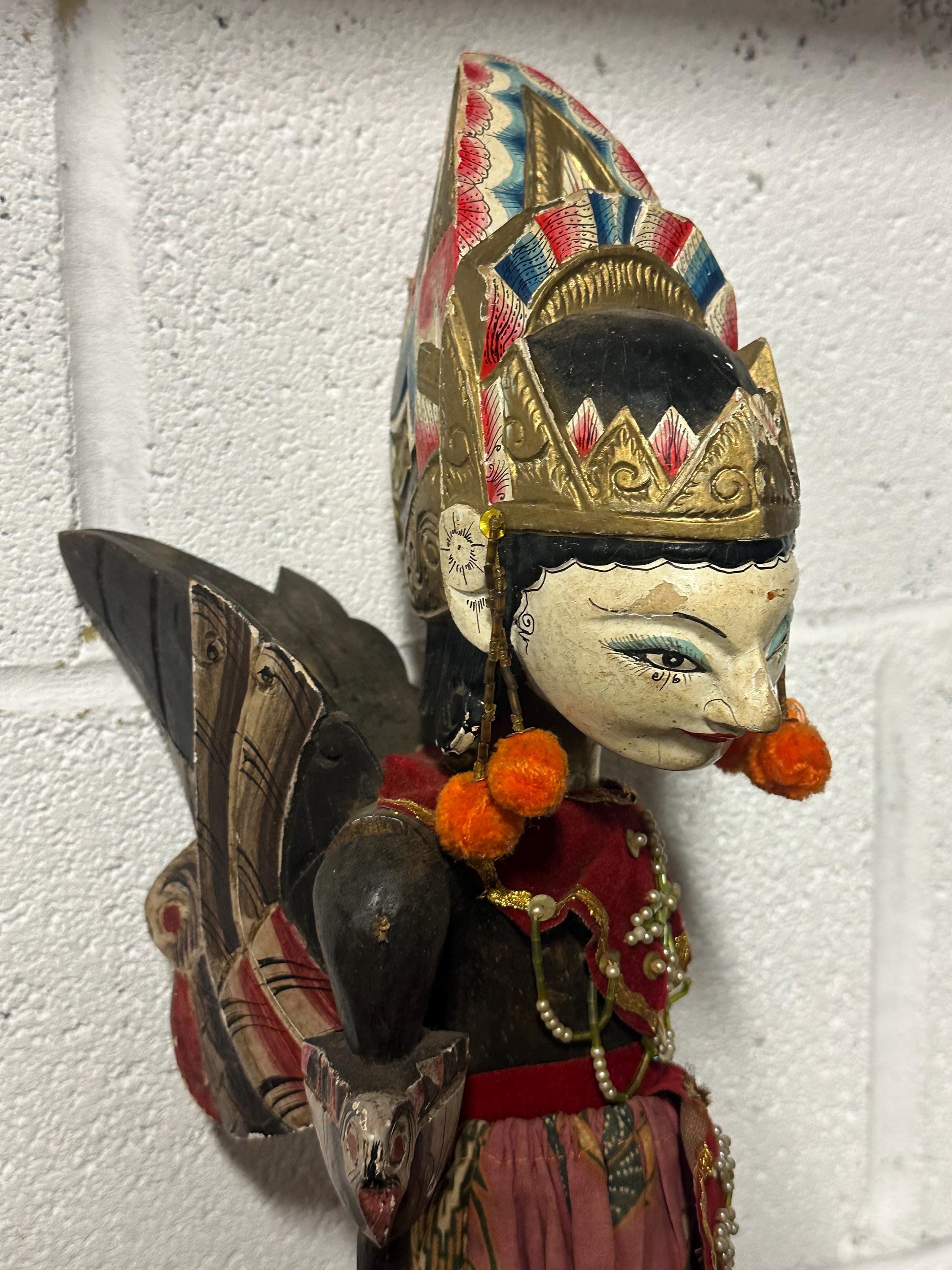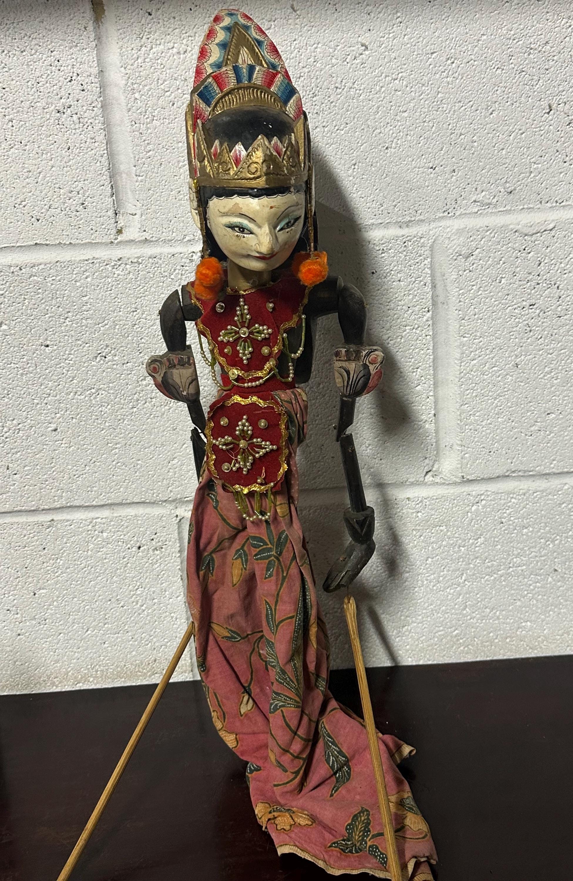 A beautifully detailed vintage Indonesian wooden rod puppet, hand-carved and hand-painted in the traditional Wayang Golek style.