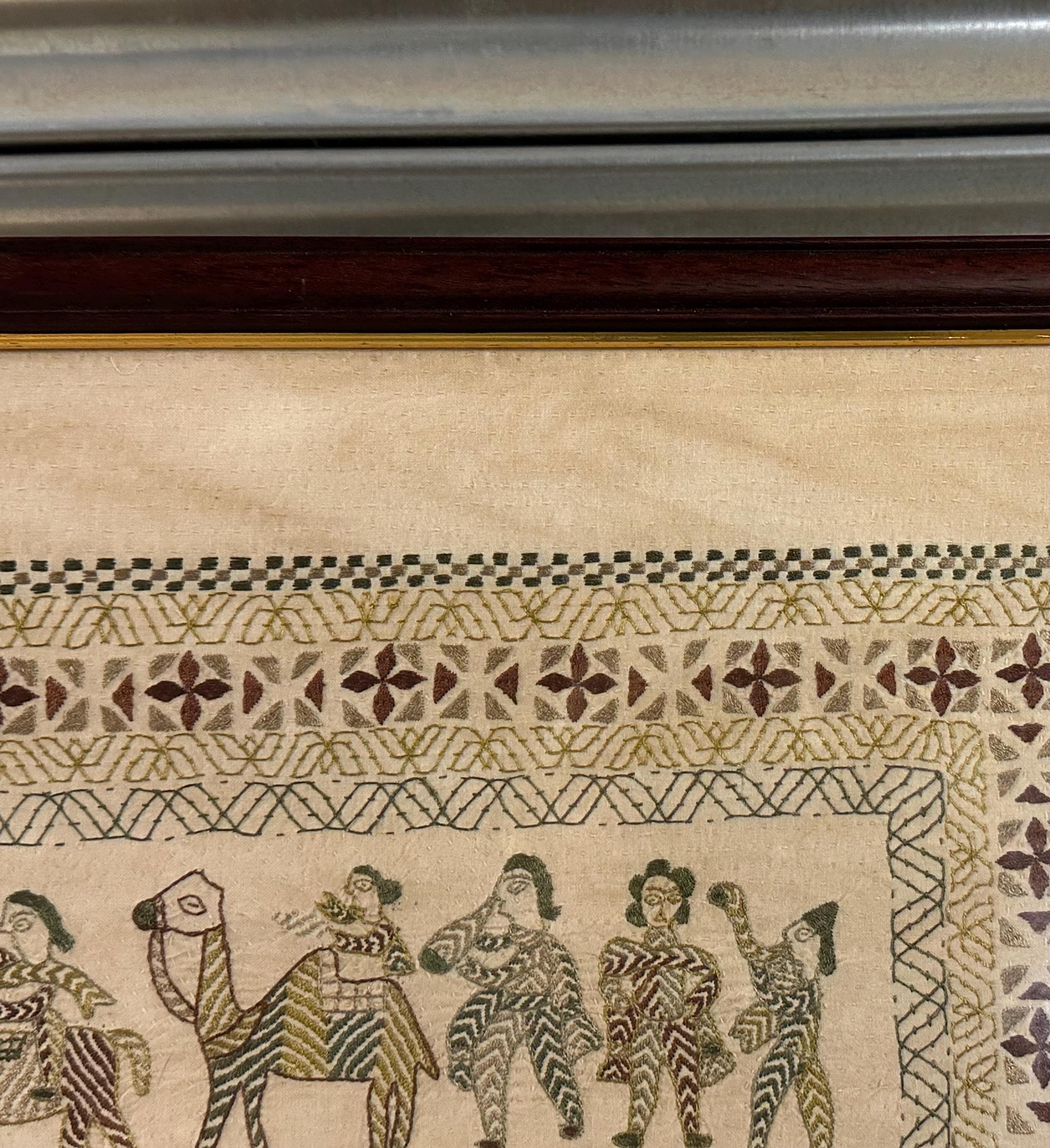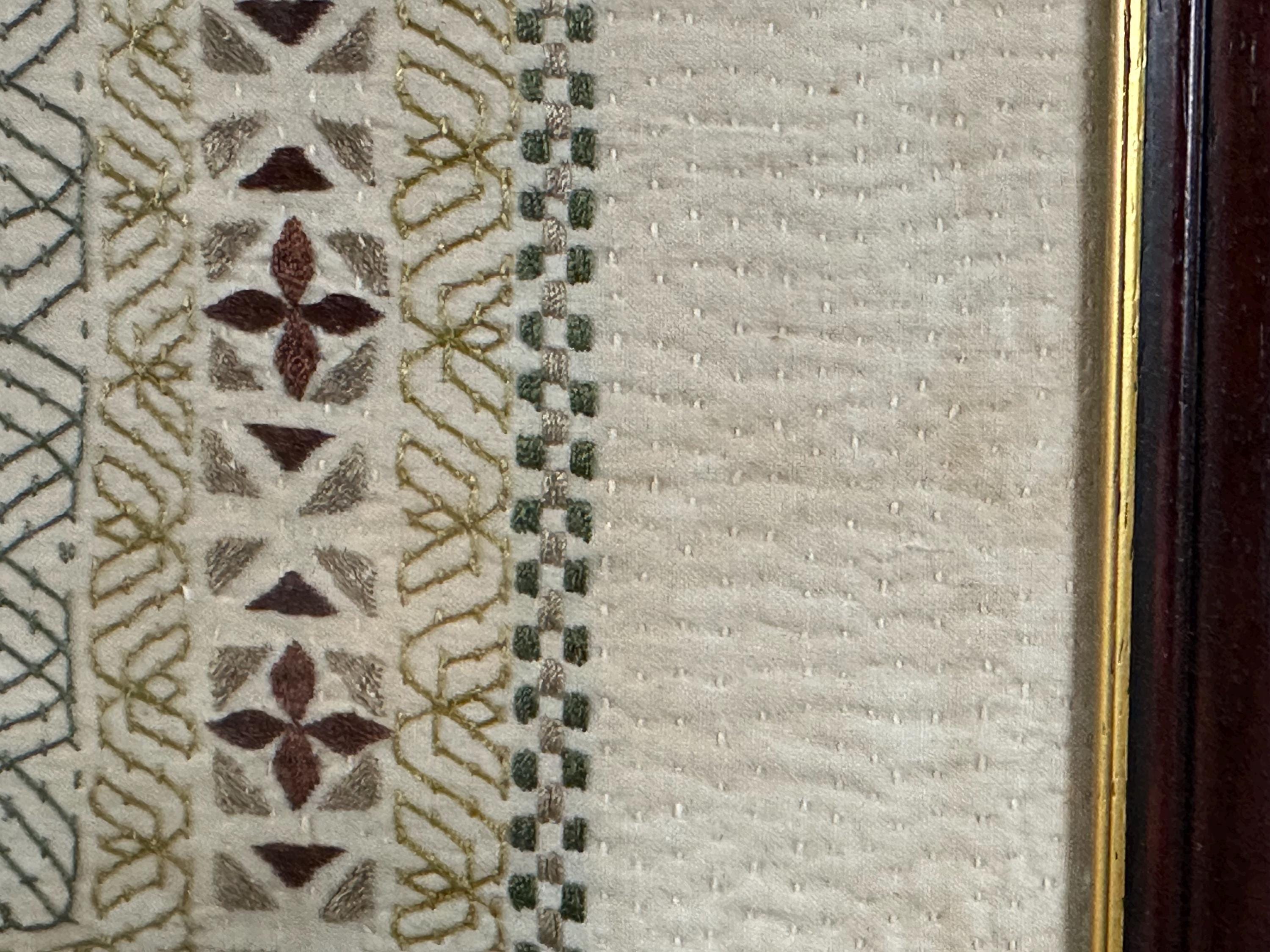 The embroidery is finely stitched on a natural linen/canvas ground in earthy muted tones, giving it a warm, rustic character. The piece is professionally mounted and presented in a dark wood frame with cream mount, ready to hang.