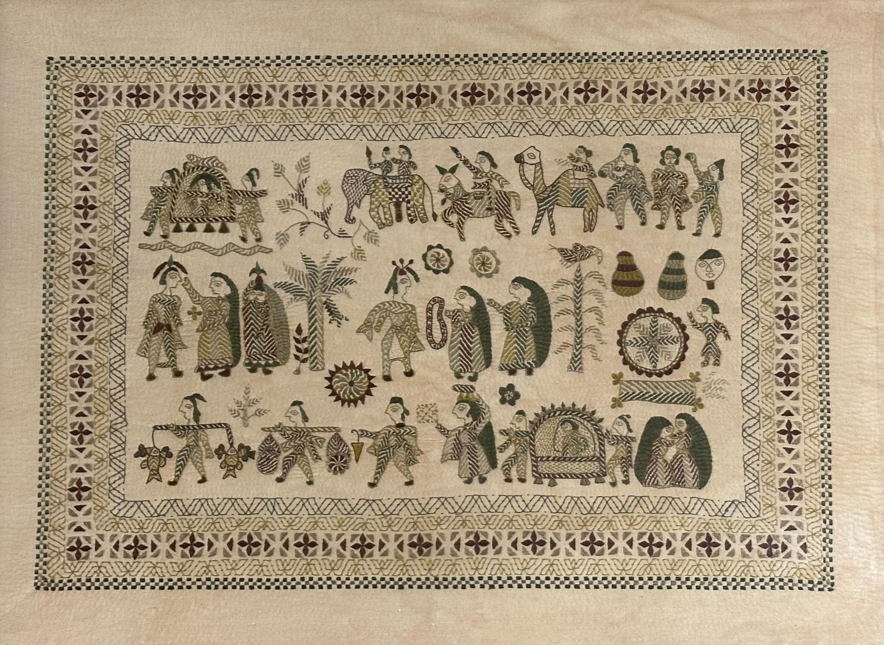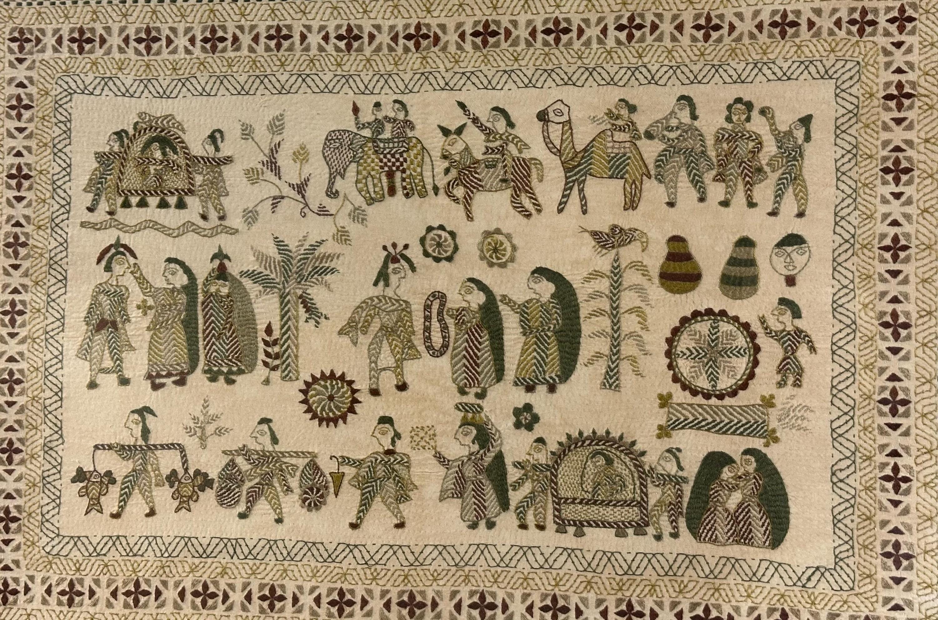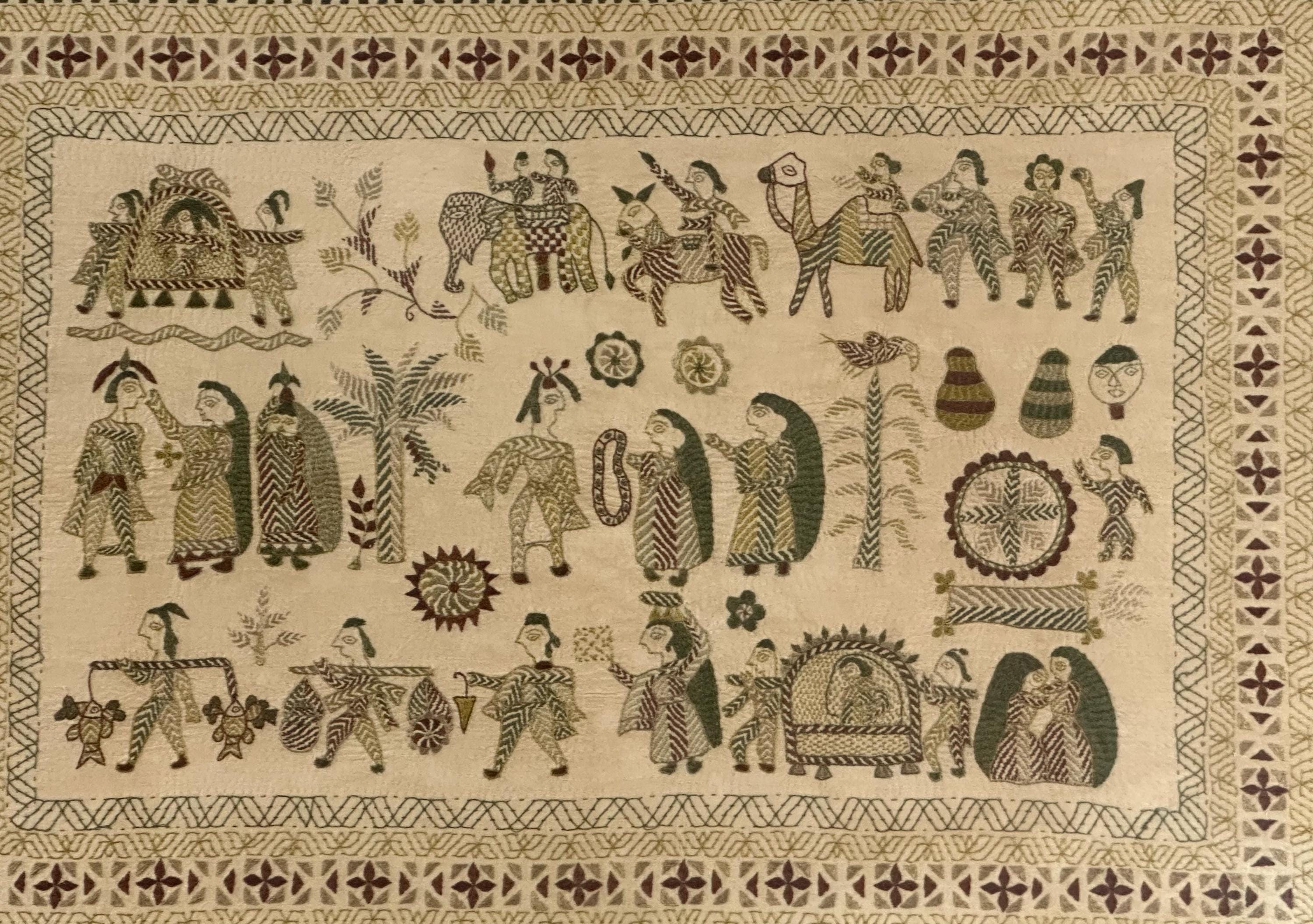 • Folk art style multi-figure scene with animals and decorative borders