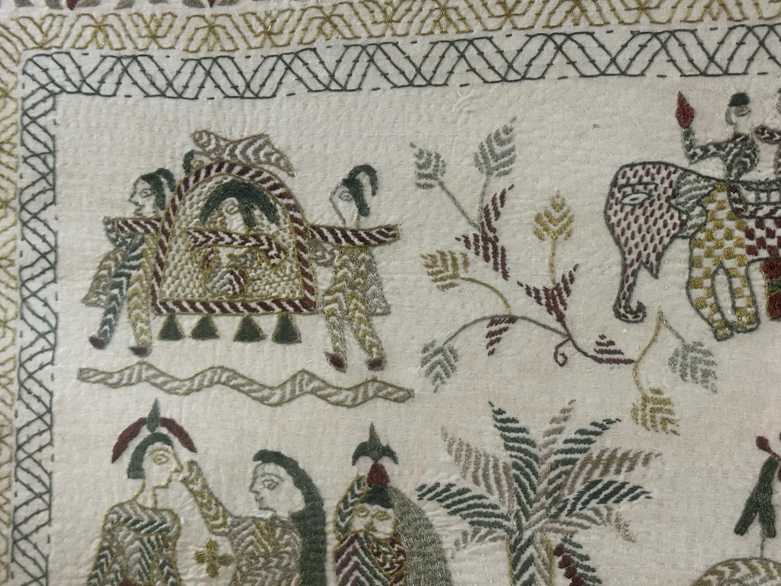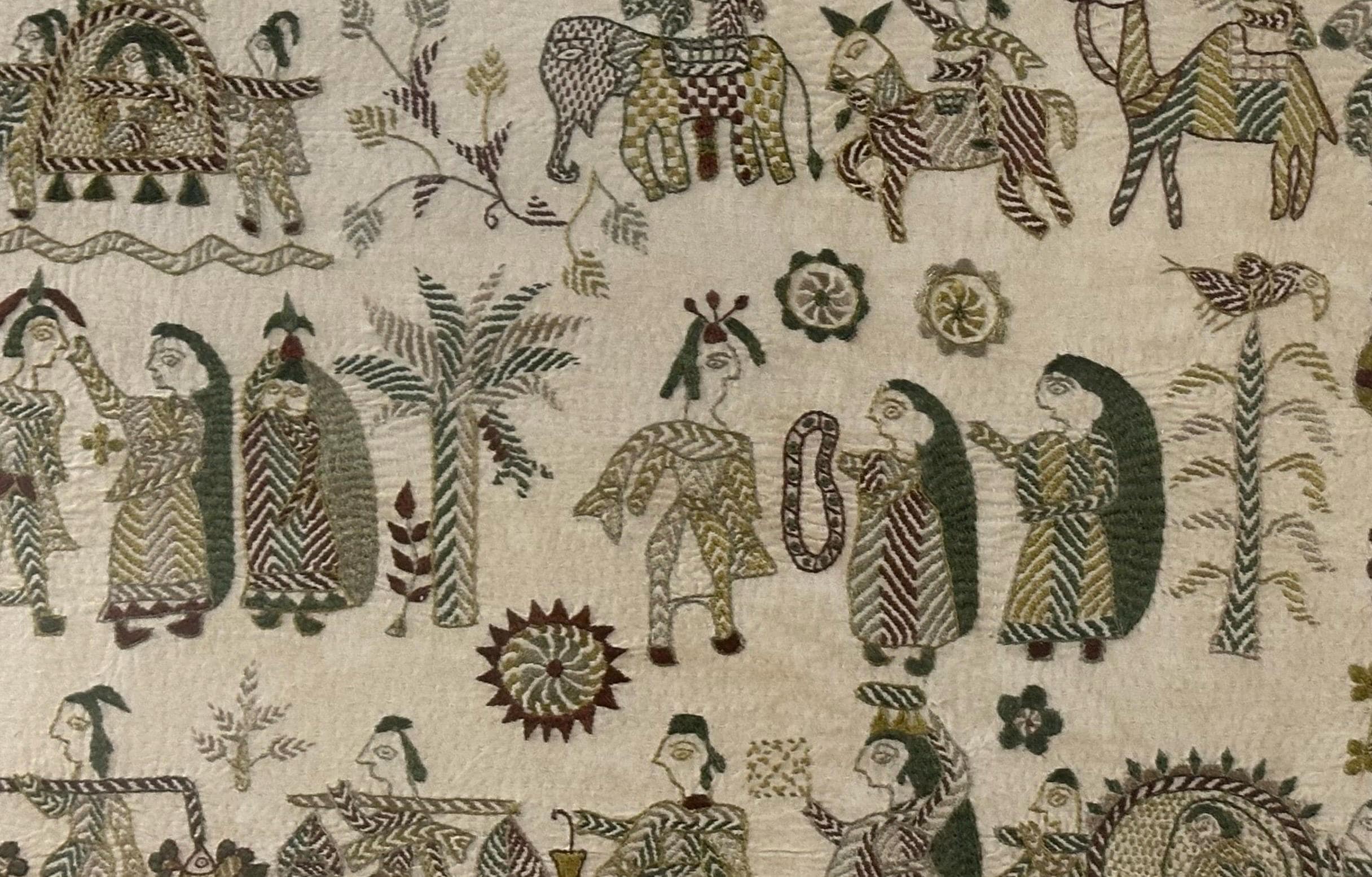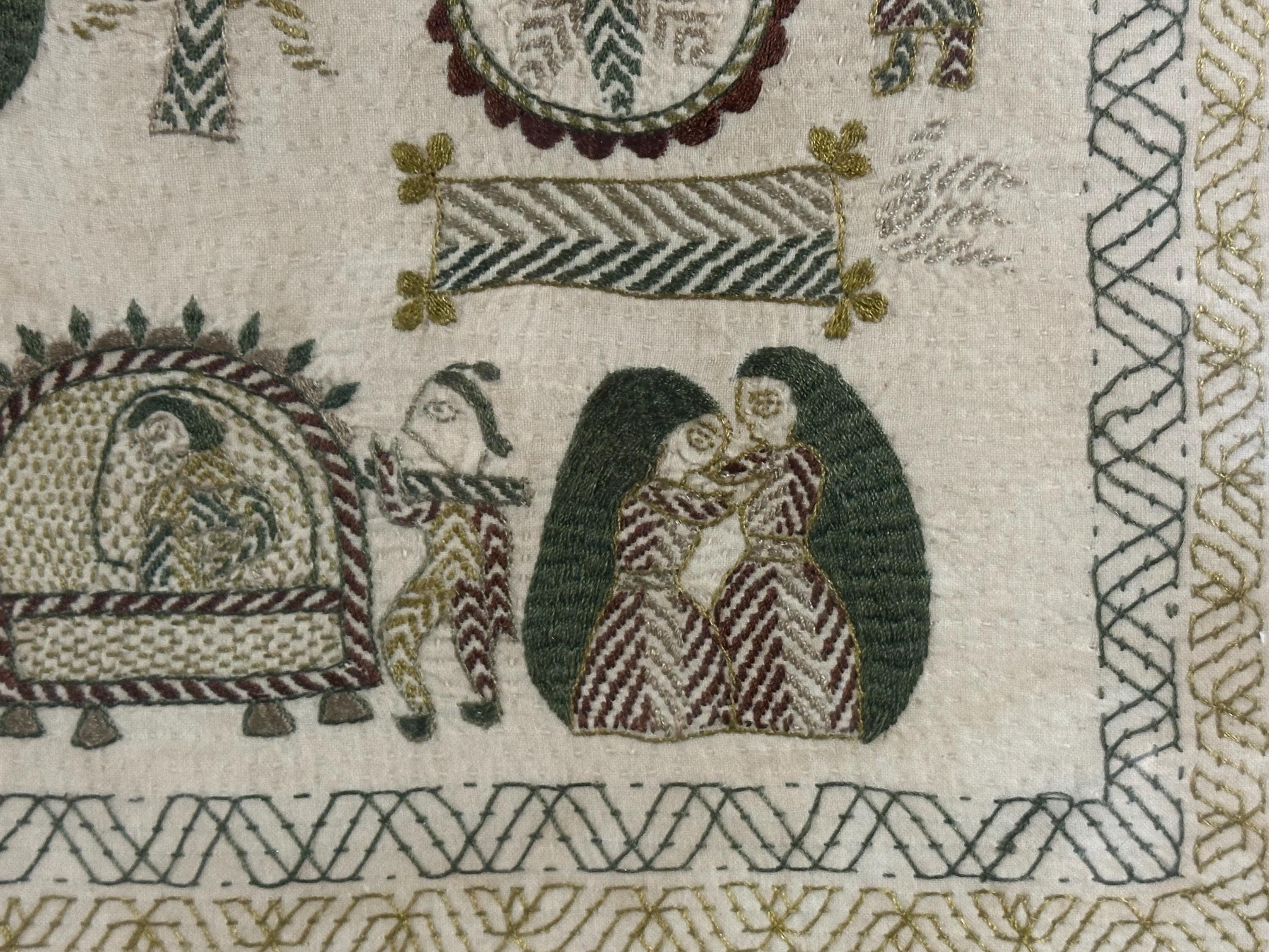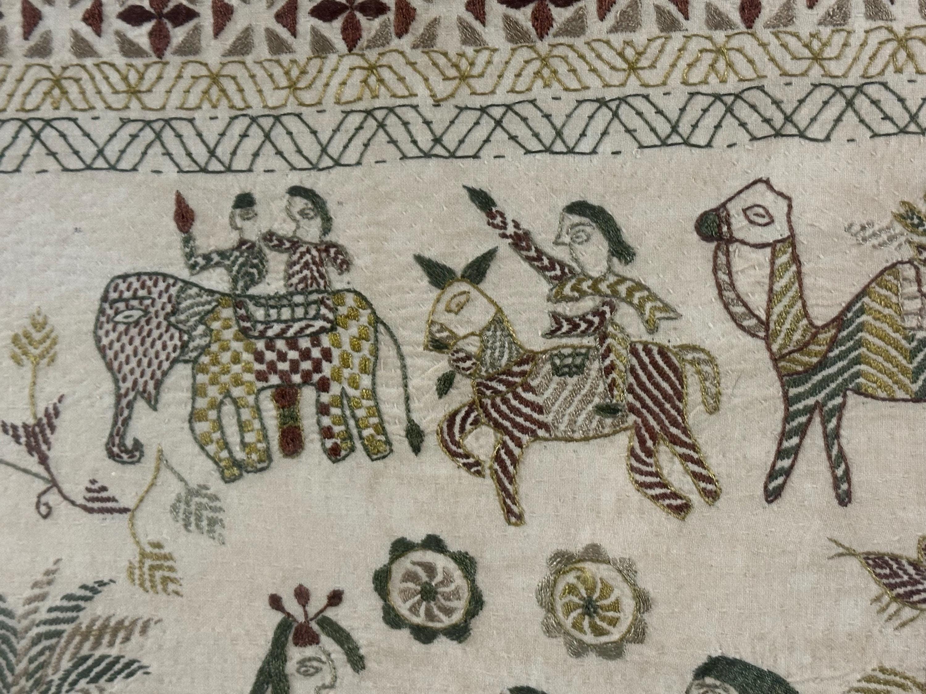 • Folk art style multi-figure scene with animals and decorative borders