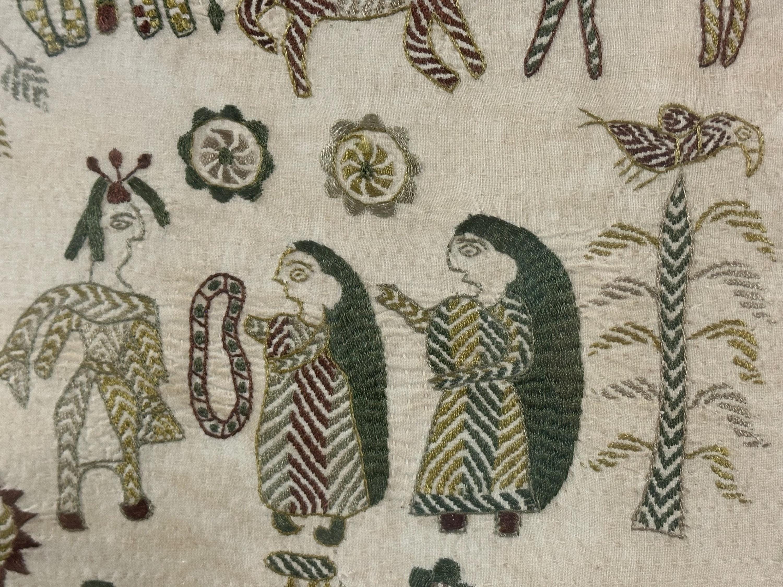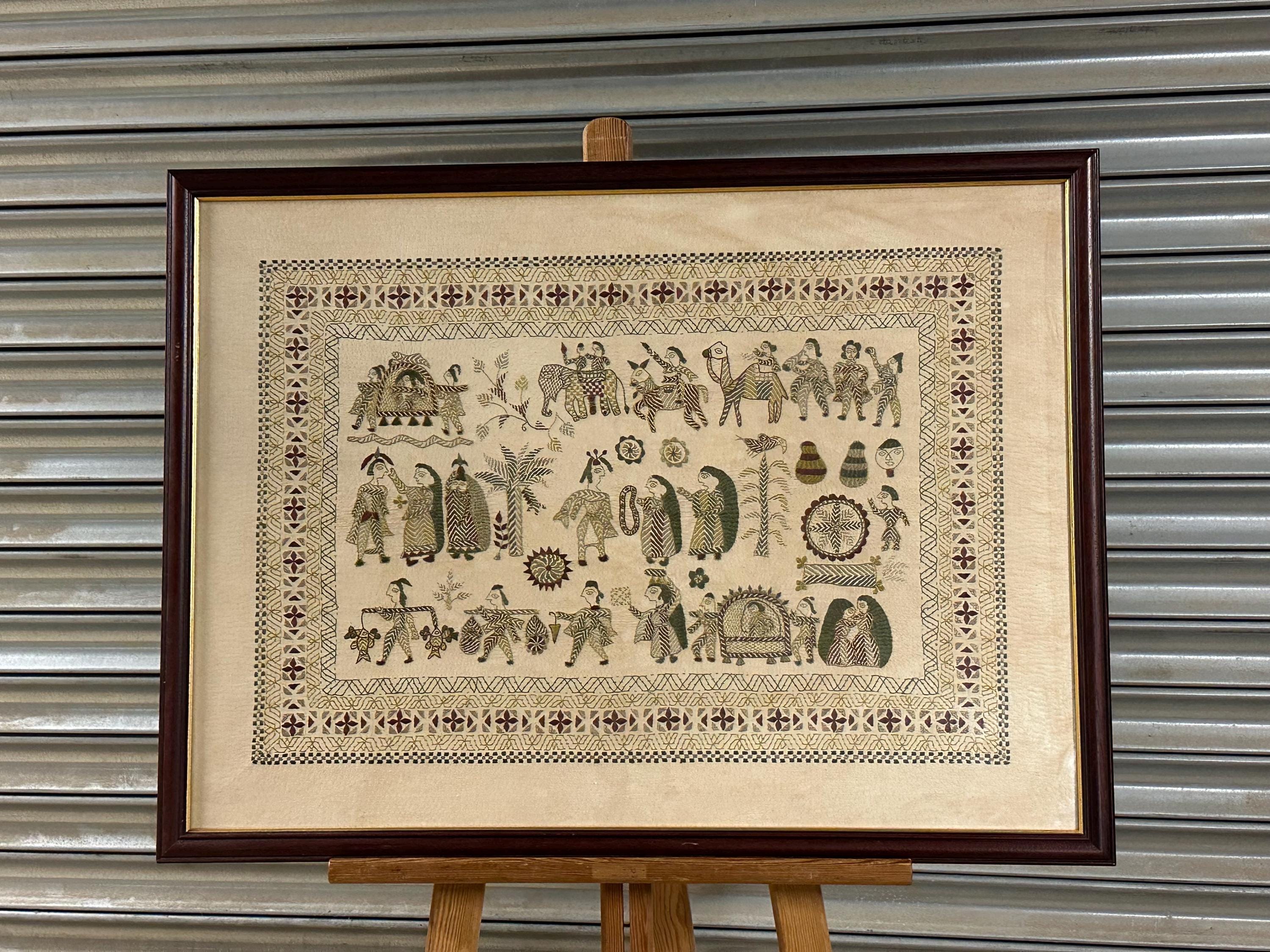 A charming vintage framed embroidery / needlework picture, beautifully worked with a whimsical folk-art style scene featuring figures, animals, trees and decorative motifs, all surrounded by an intricate patterned border.