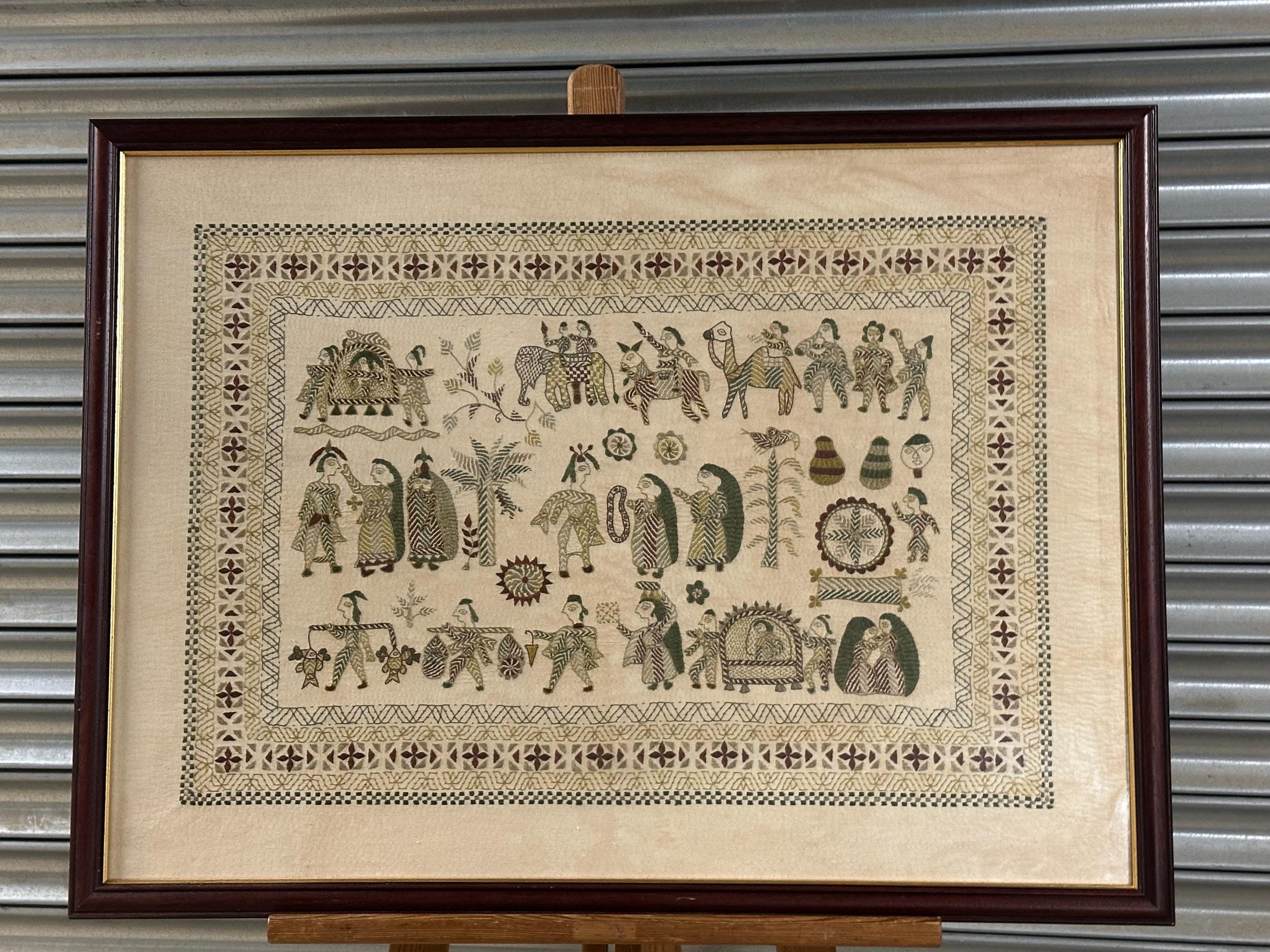 This delightful textile artwork would make a lovely statement piece for a country cottage, boho interior, or eclectic gallery wall — equally appealing to collectors of vintage textiles or folk art.