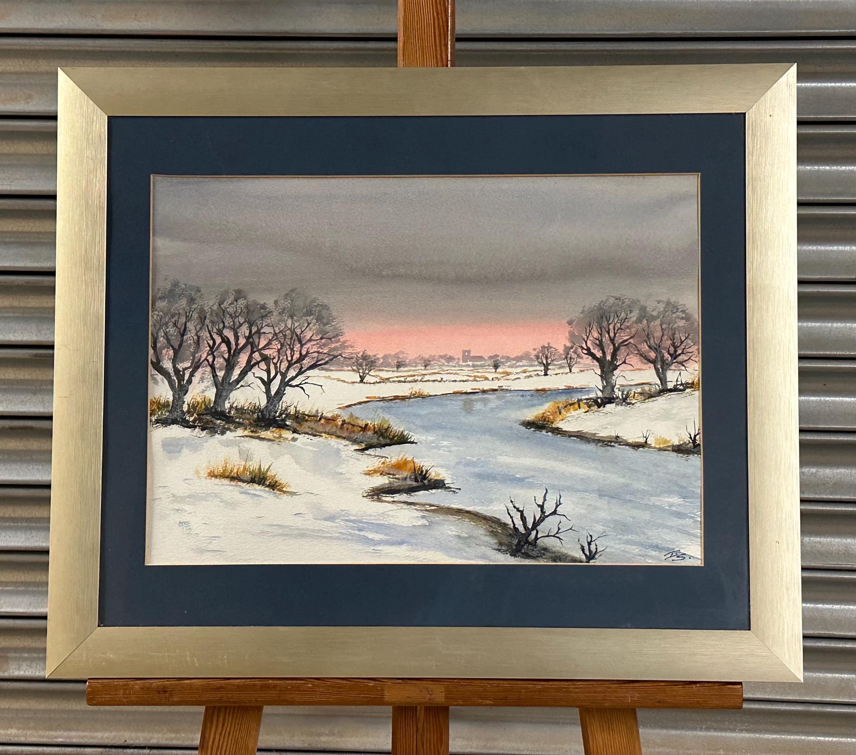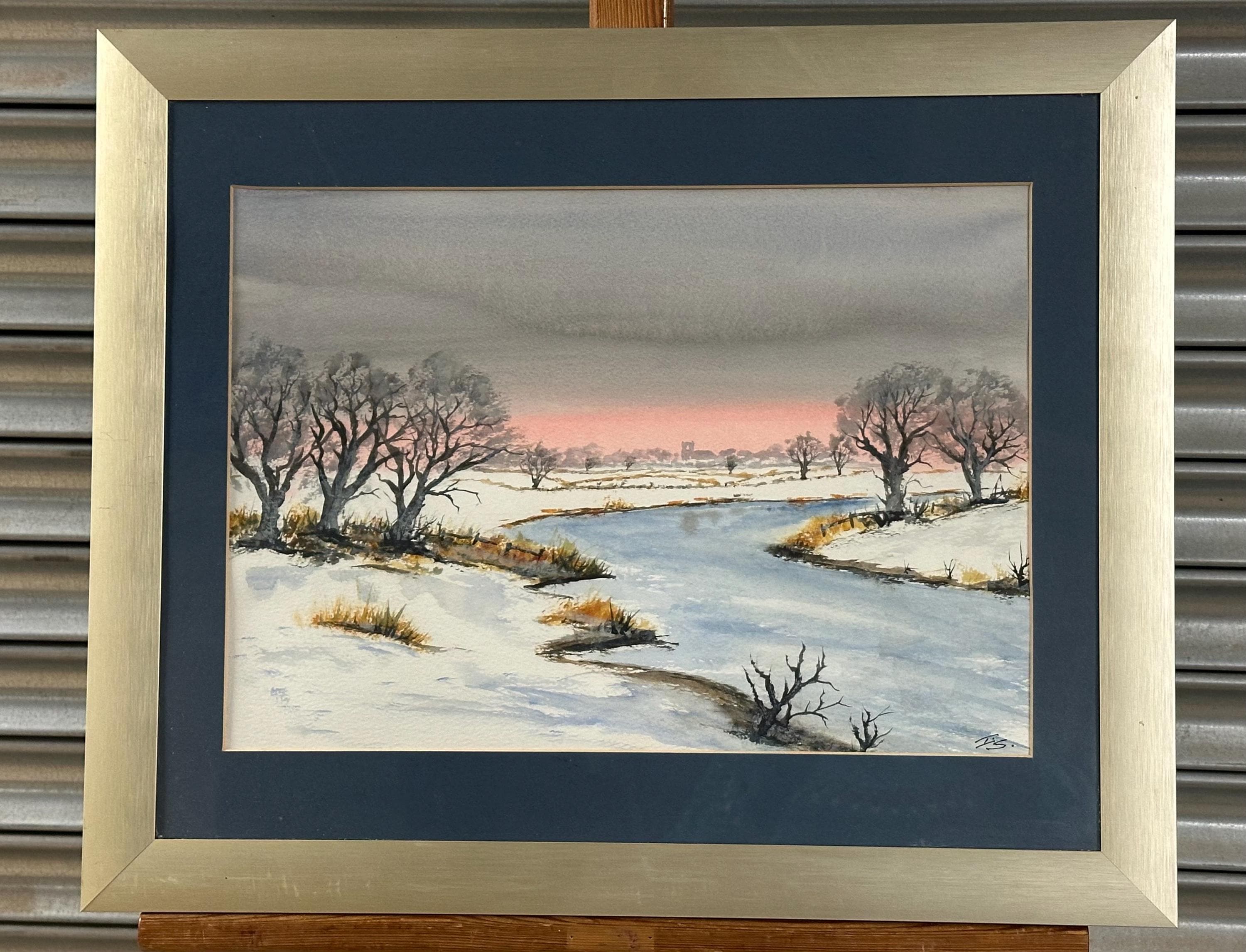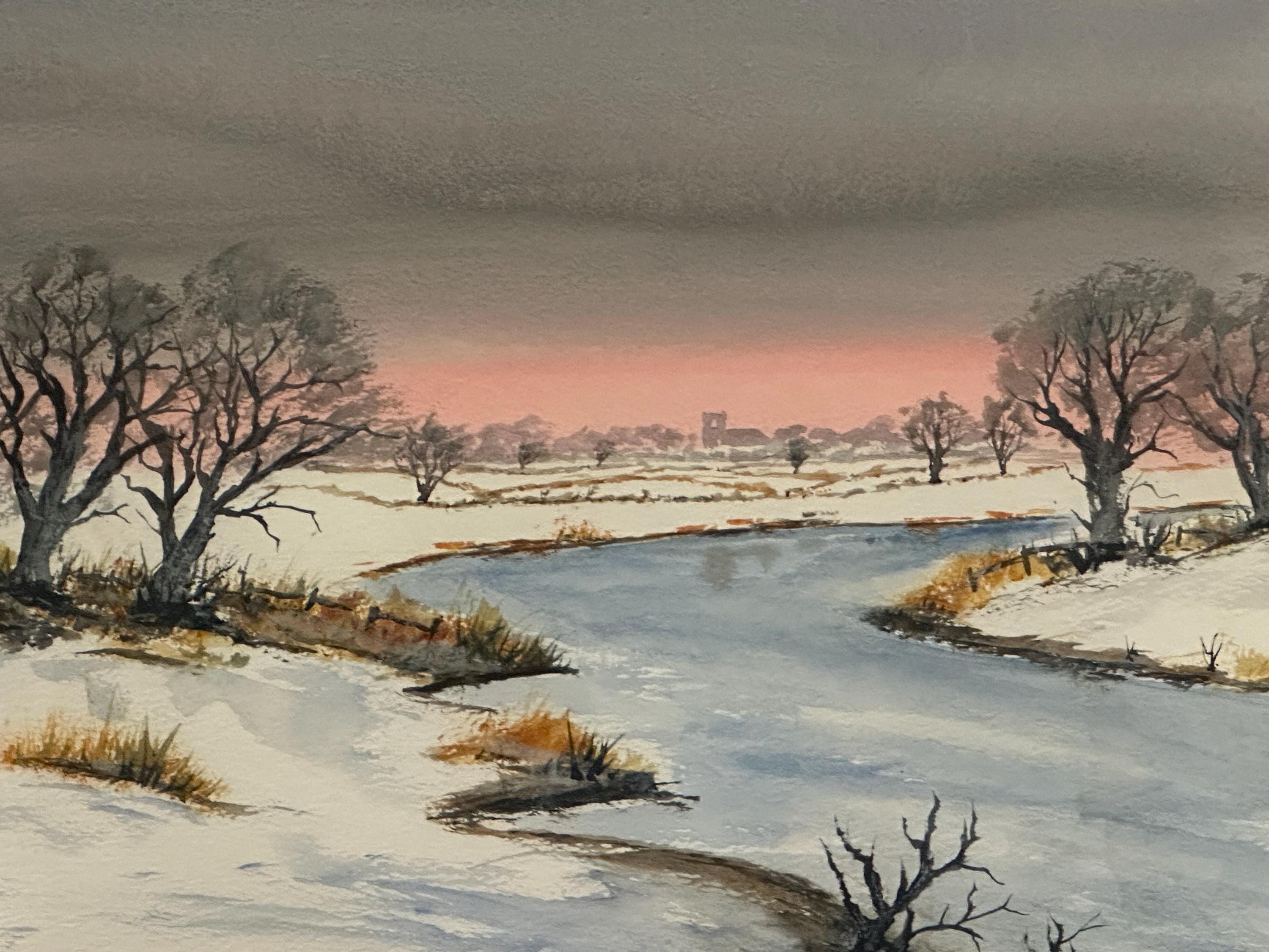 An original watercolour painting depicting a tranquil winter landscape. The scene shows a gently winding river bordered by snow-covered banks and bare winter trees, with soft pastel tones in the sky creating a peaceful dusk or dawn atmosphere. The artist has used subtle washes and fine detail to capture the stillness and beauty of a frosty countryside setting.