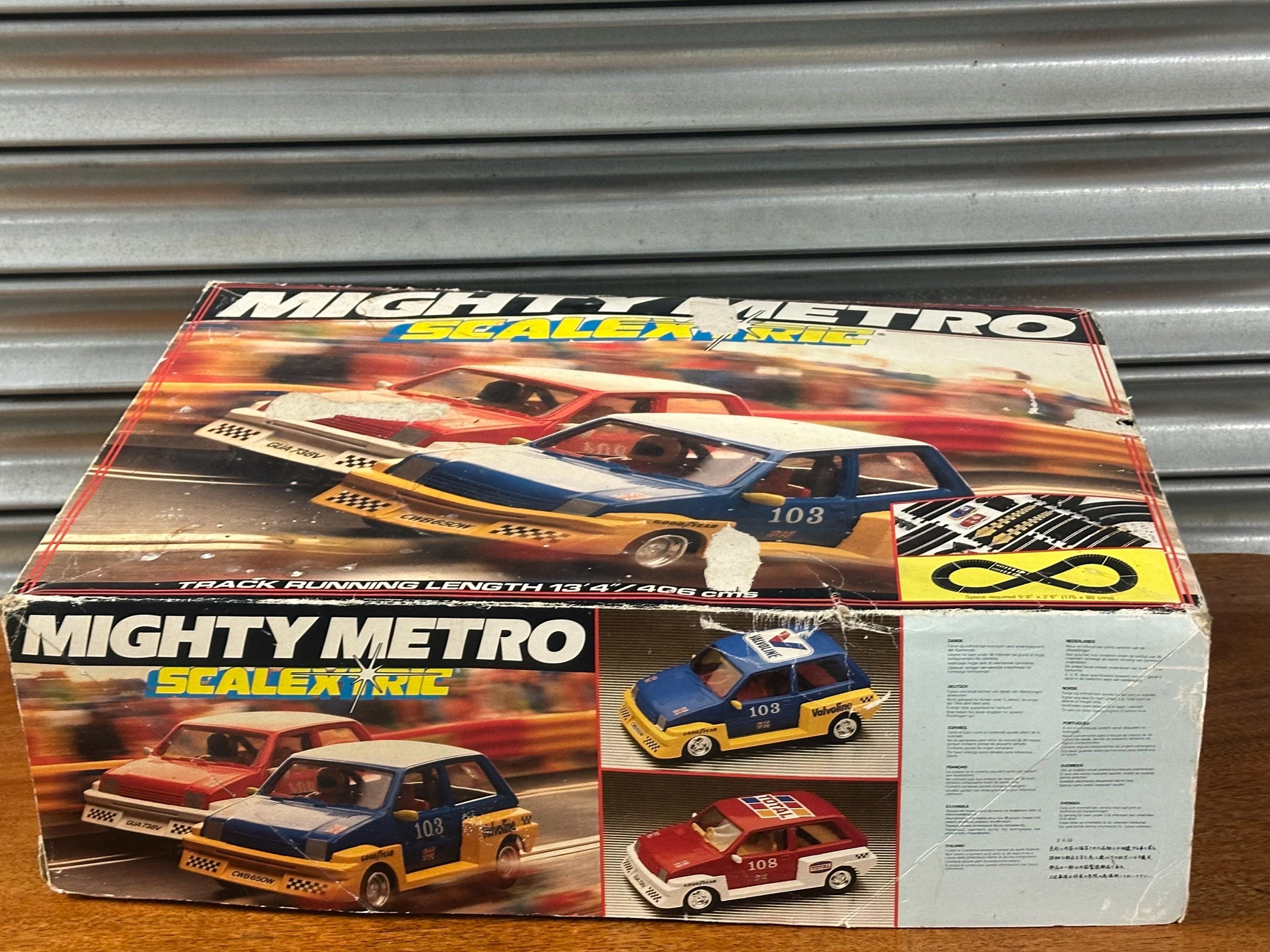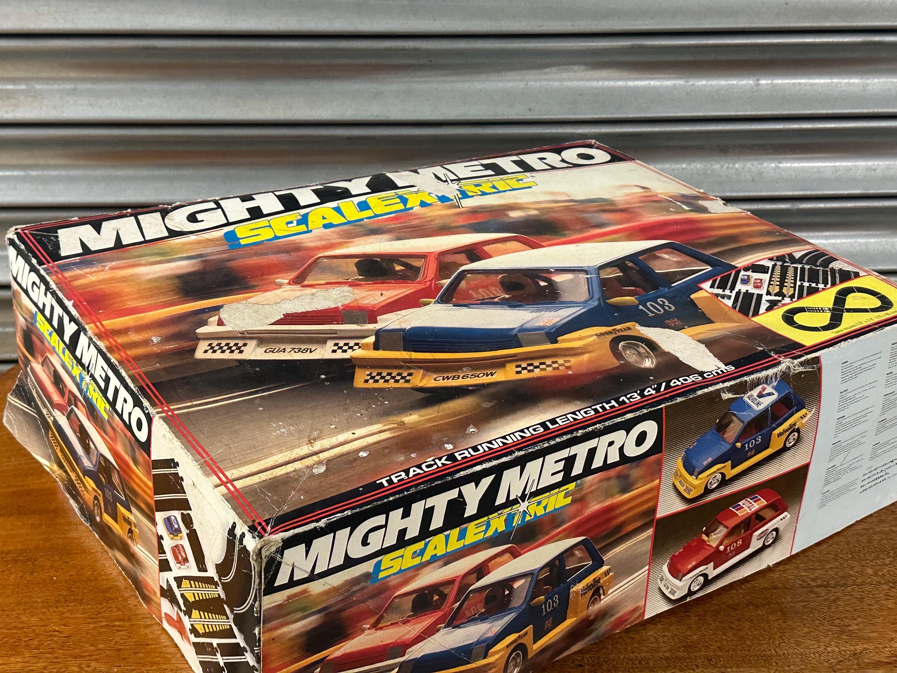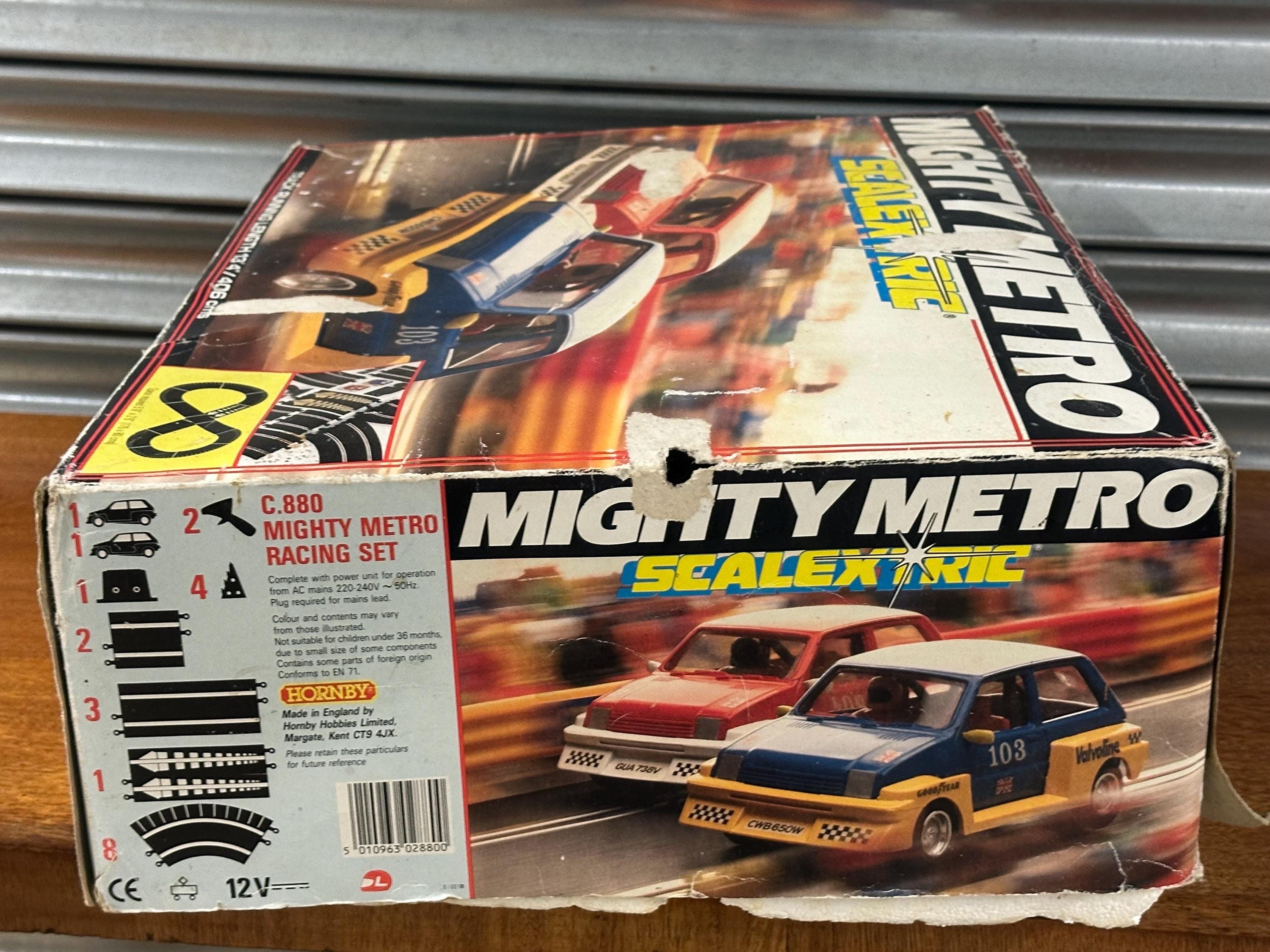 Classic Scalextric “Mighty Metro” electric slot car racing set, model C880 – a brilliant retro set featuring two Metro-style rally cars and an oval figure-of-eight track layout.