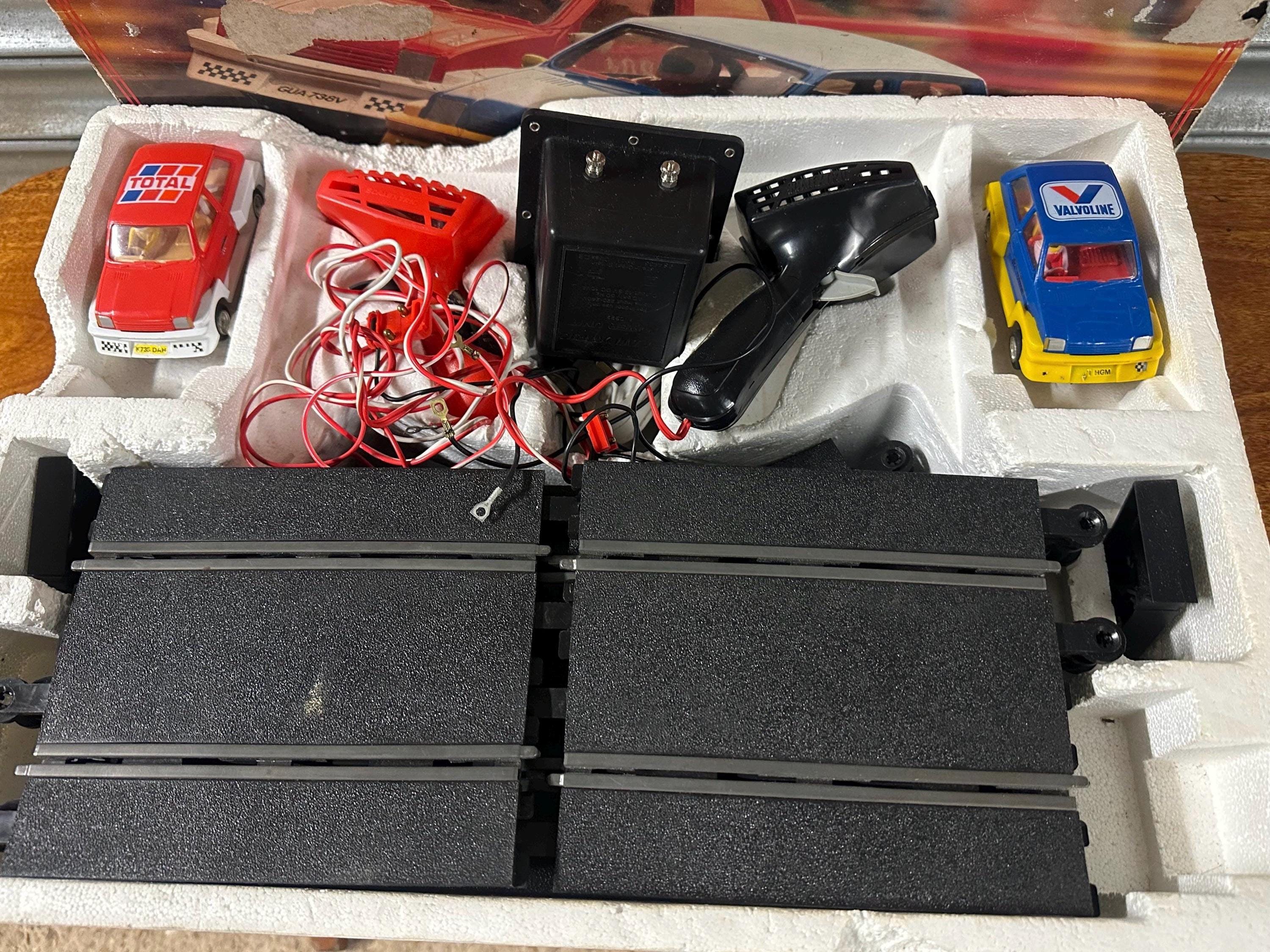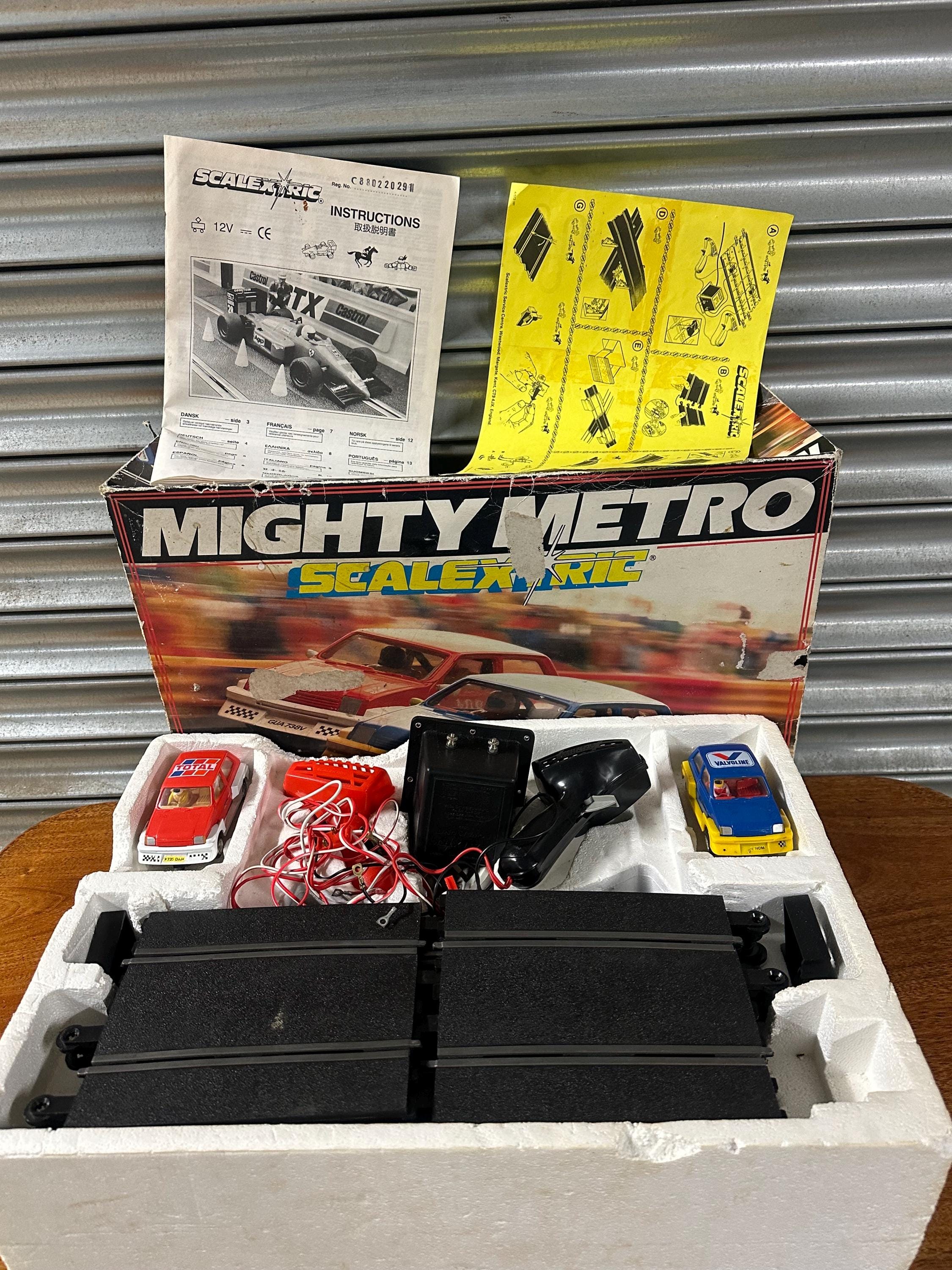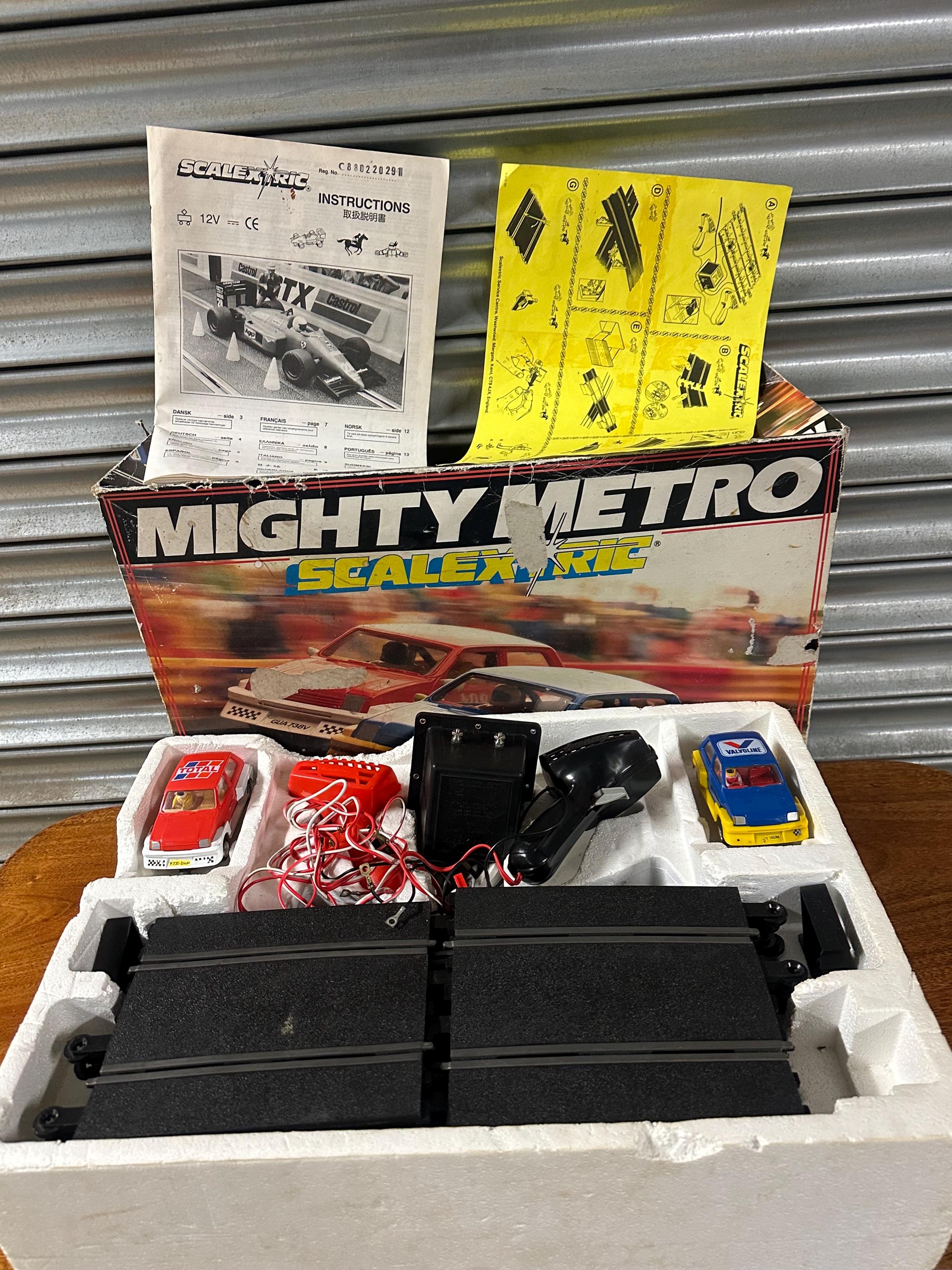 Classic Scalextric “Mighty Metro” electric slot car racing set, model C880 – a brilliant retro set featuring two Metro-style rally cars and an oval figure-of-eight track layout.
