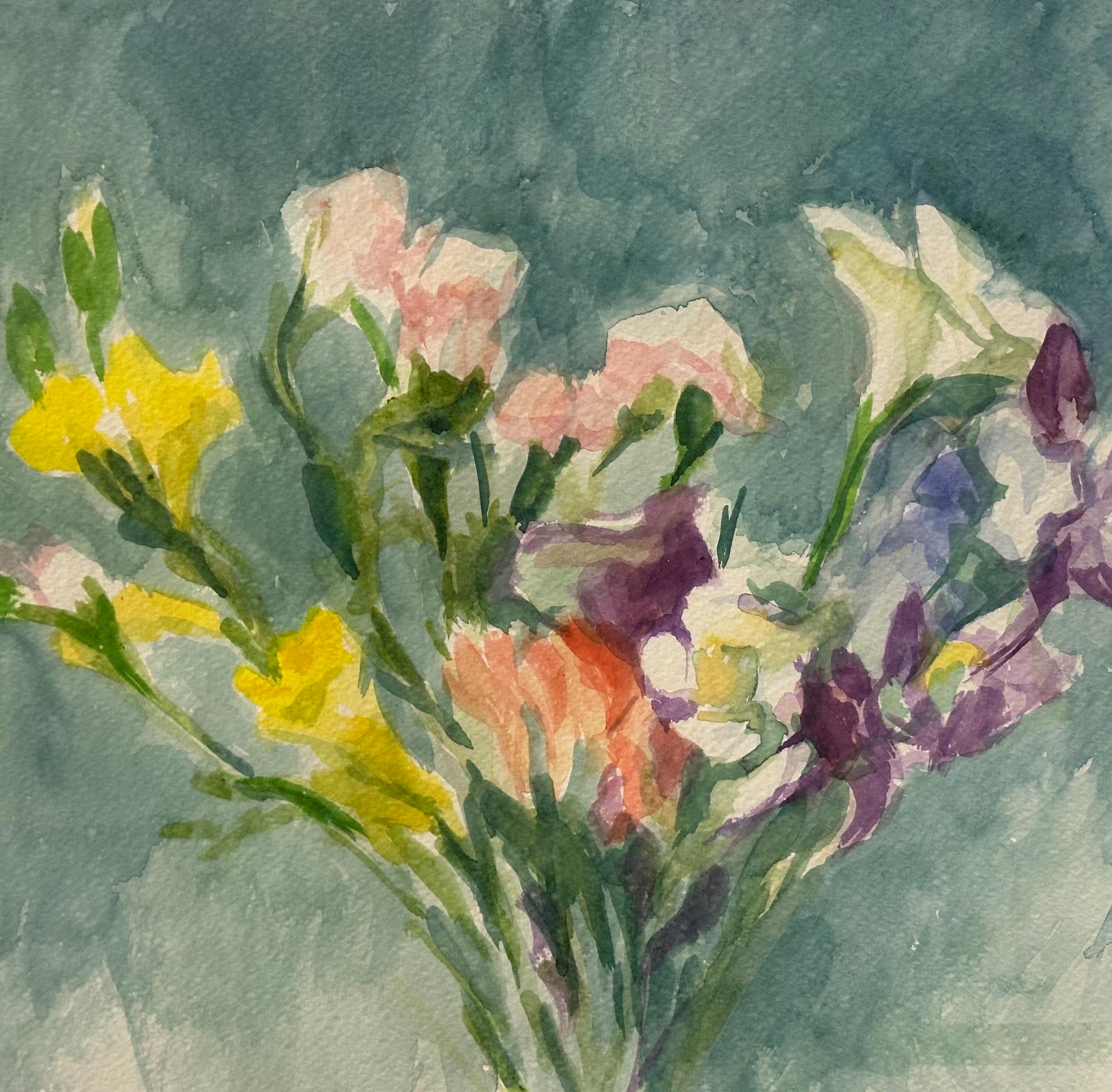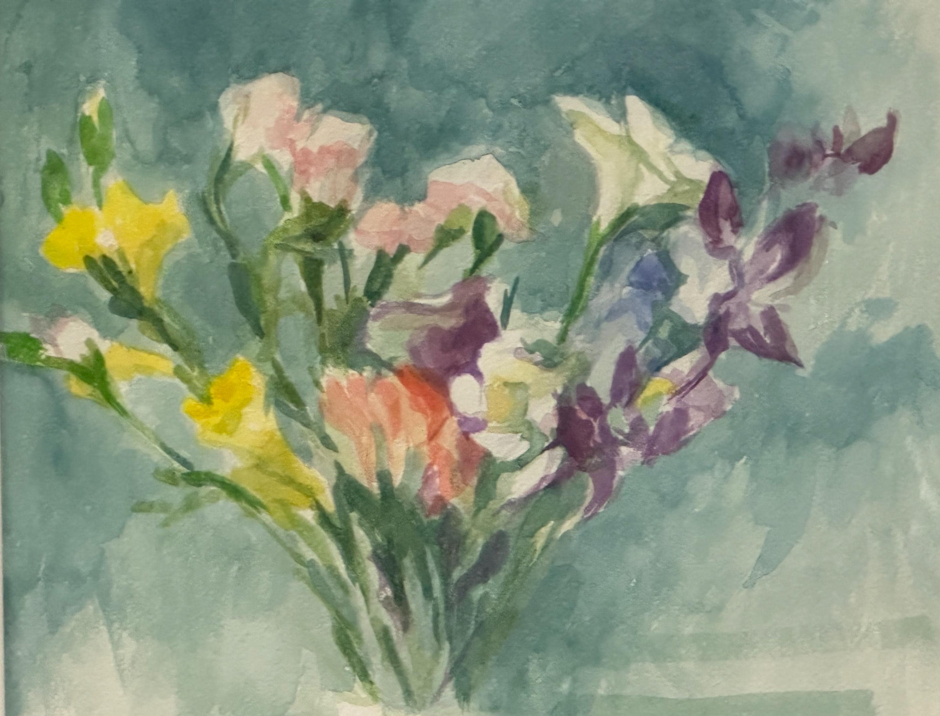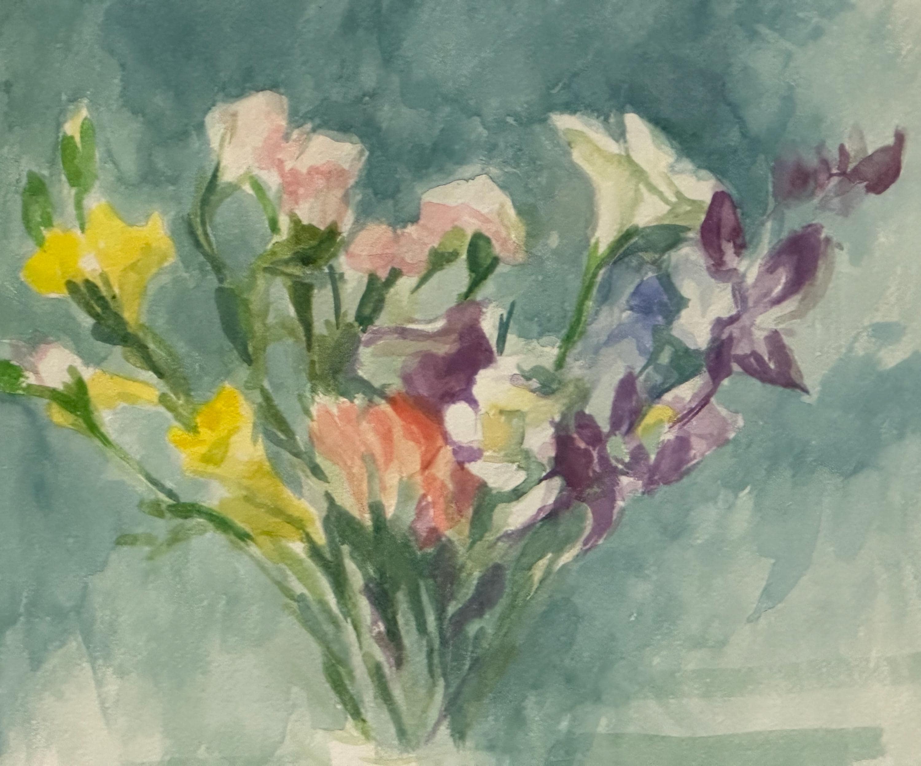 This beautifully balanced composition depicts a vibrant spring bouquet arranged in a simple white vase. The flowers — painted in expressive shades of purple, yellow, pink and soft crimson — are brought to life with confident, fluid brushstrokes.