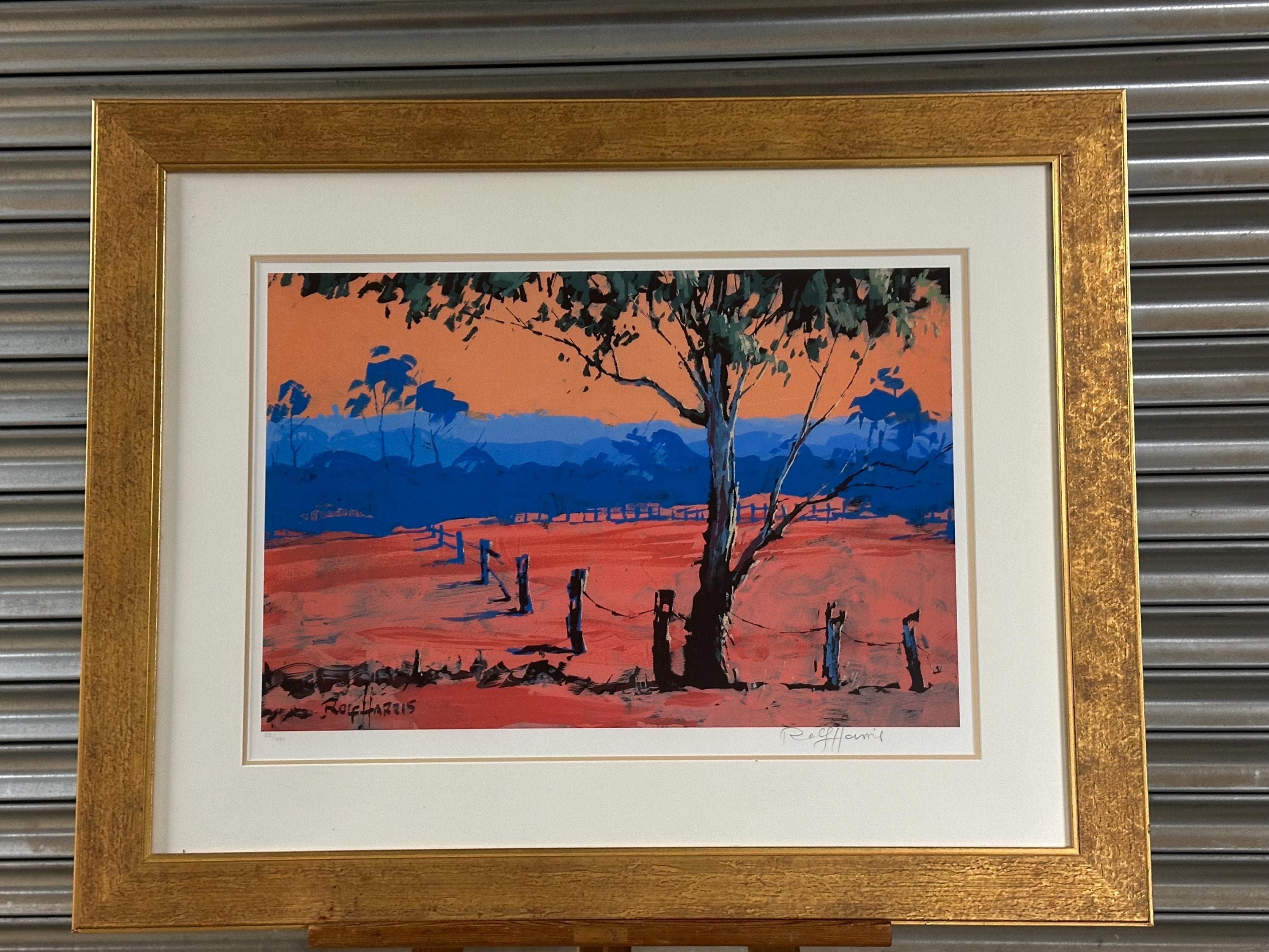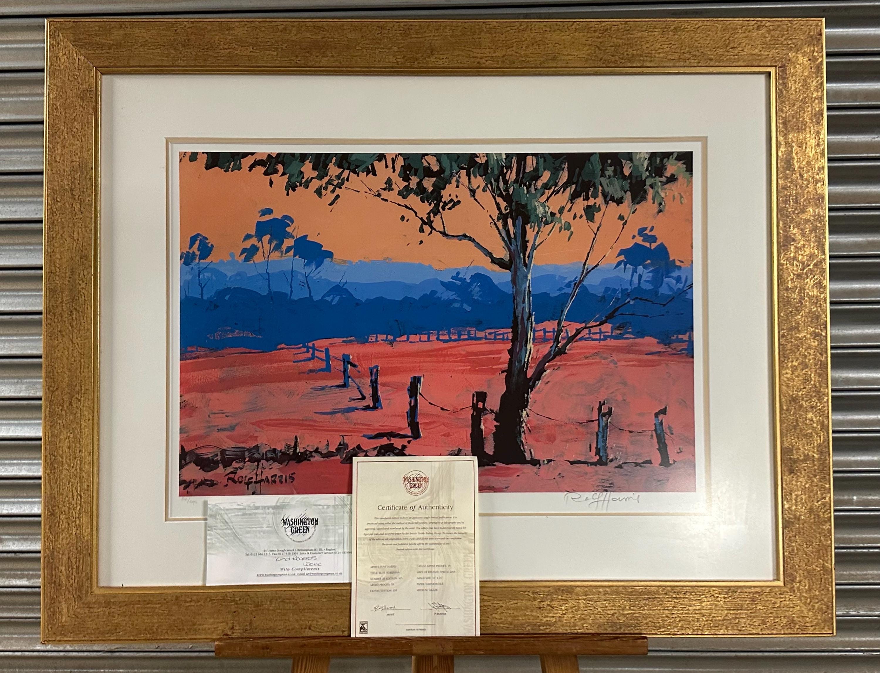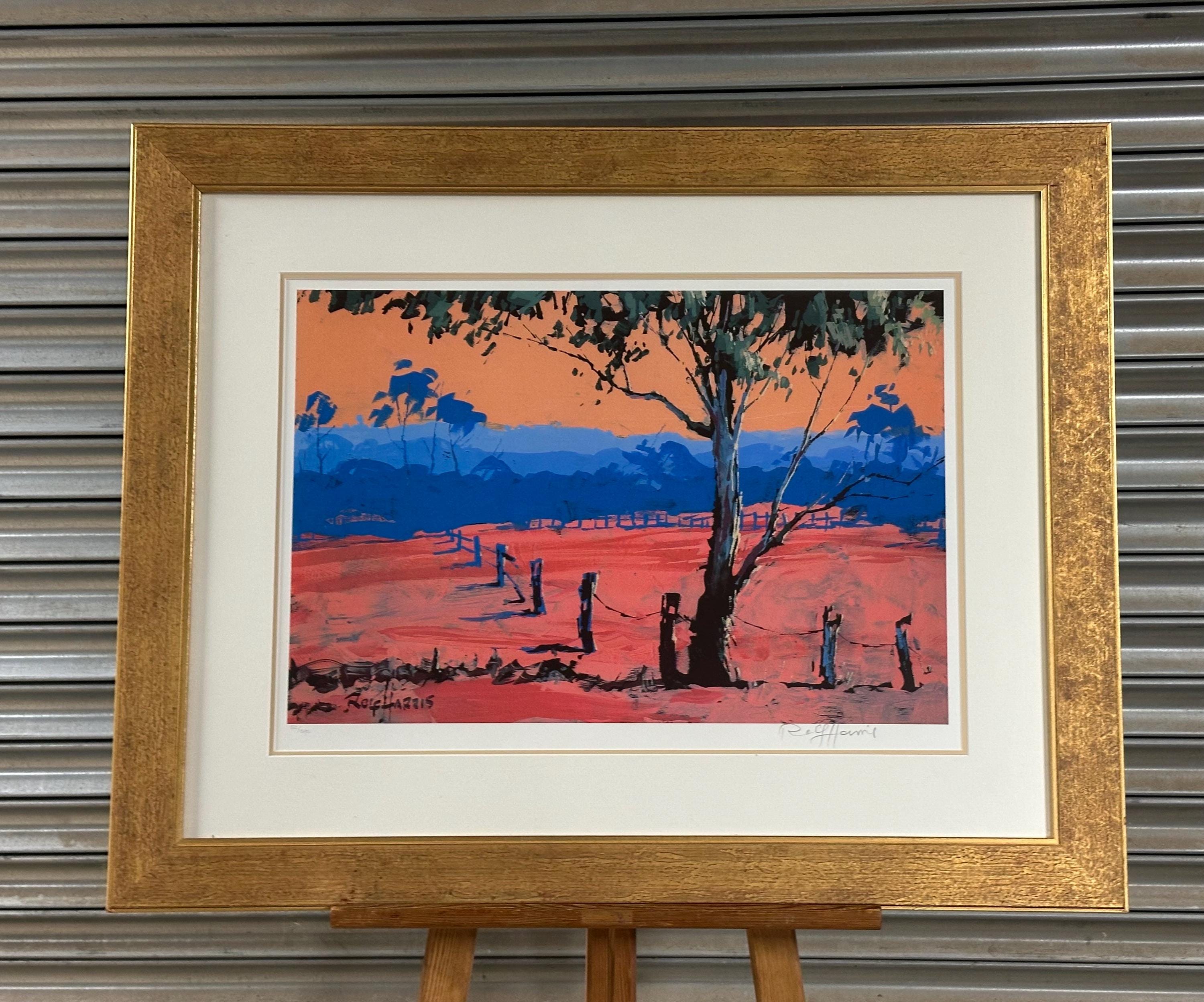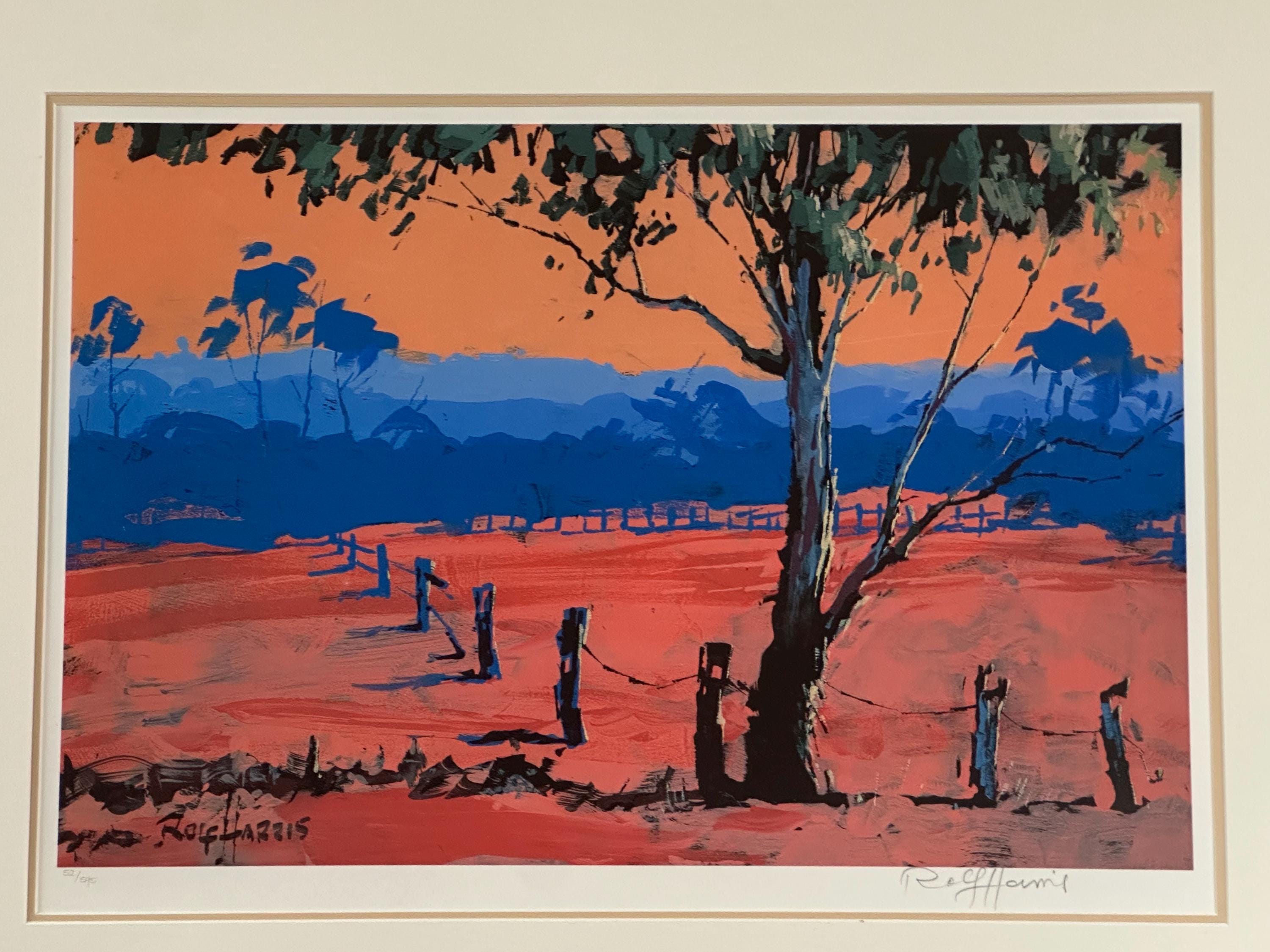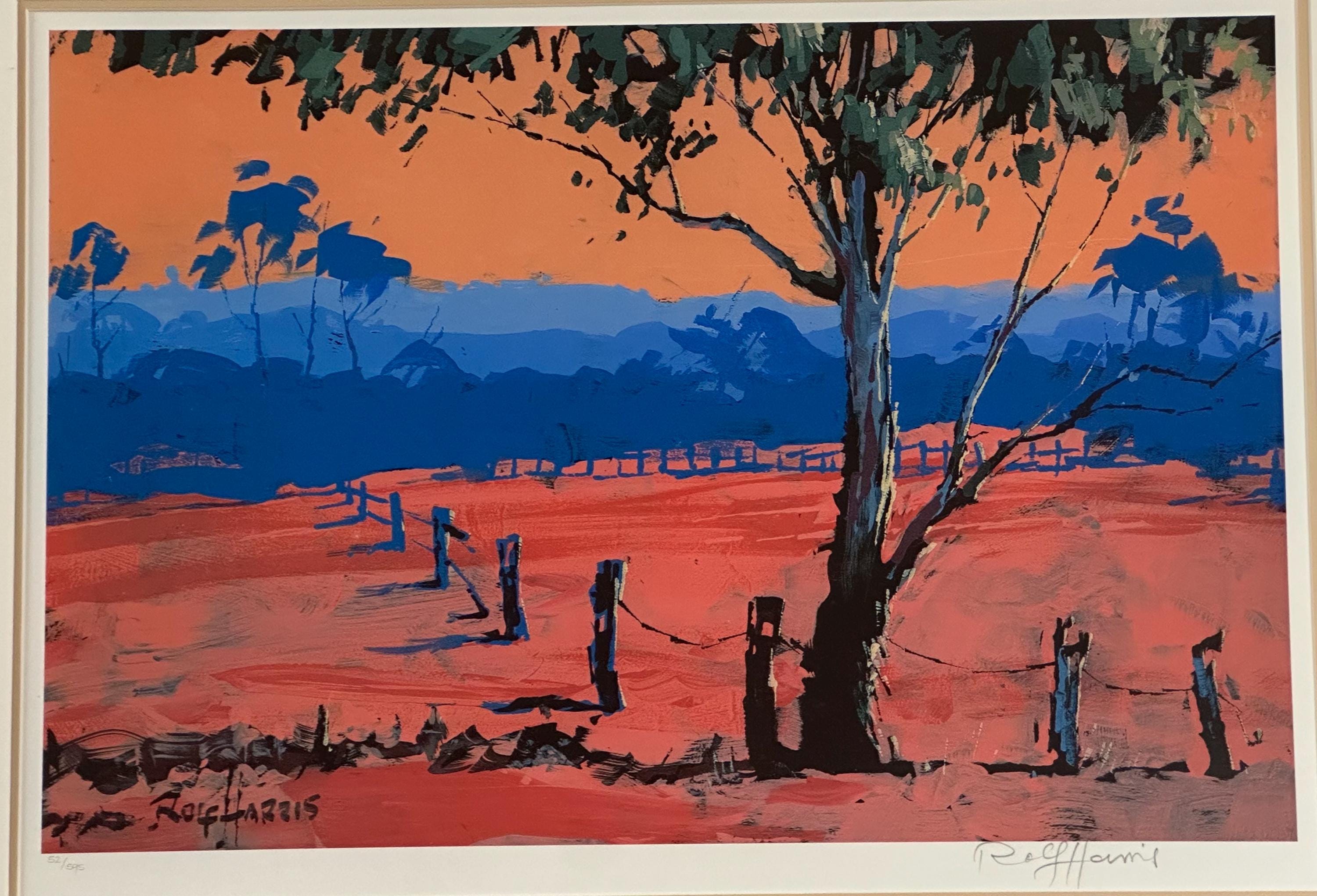 A striking signed limited edition print titled Blue Horizons, featuring Rolf Harris’s instantly recognisable bold landscape style, with vibrant bands of colour and expressive brushwork depicting an Australian rural scene with fencing and trees against a dramatic horizon.