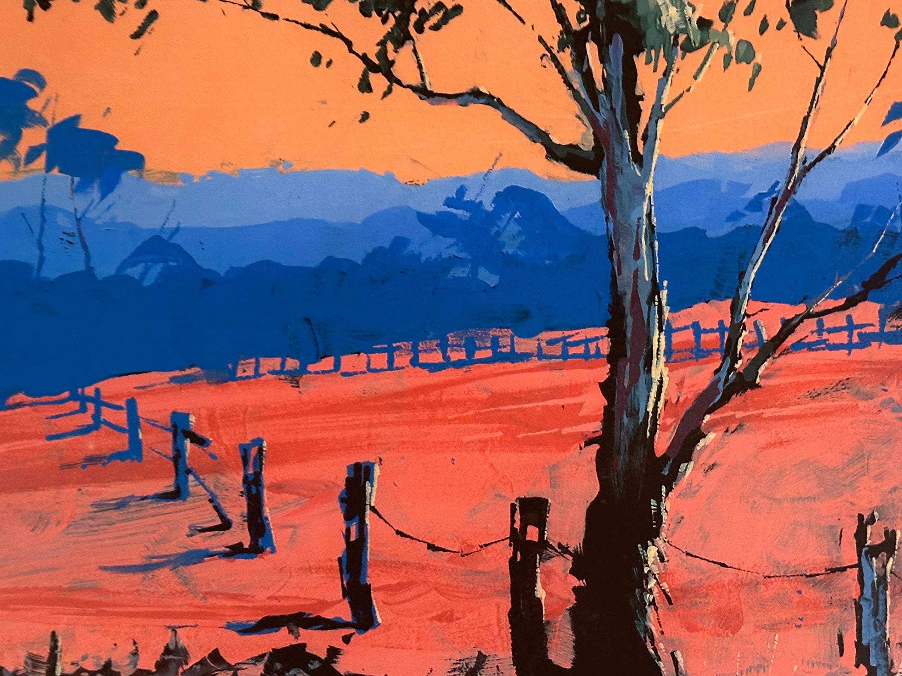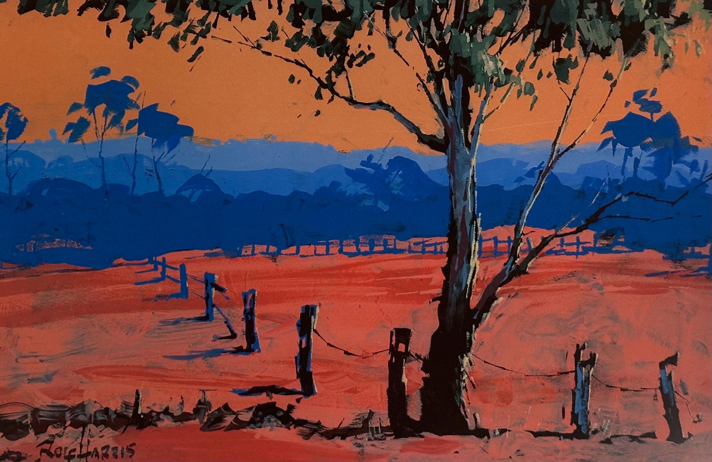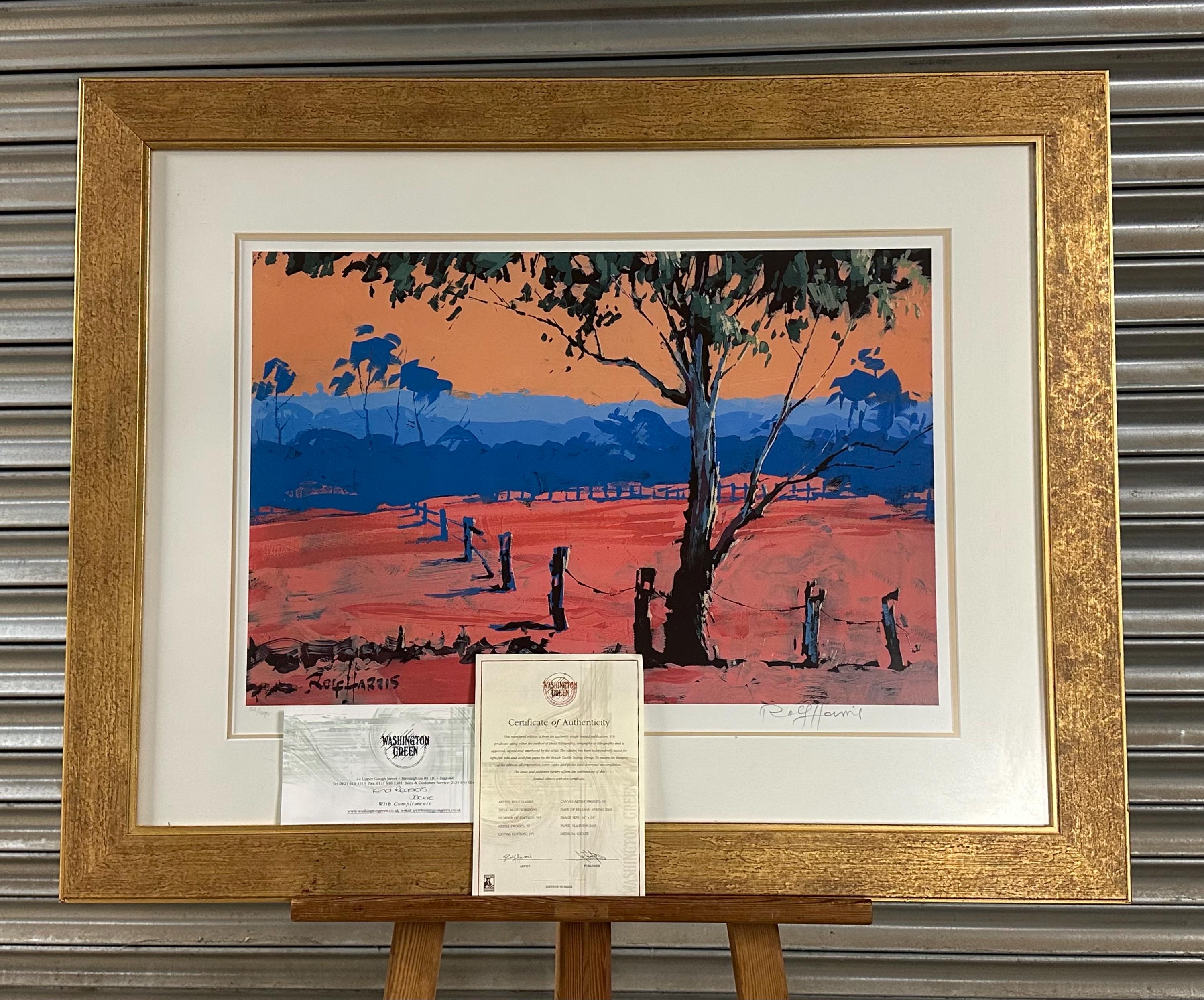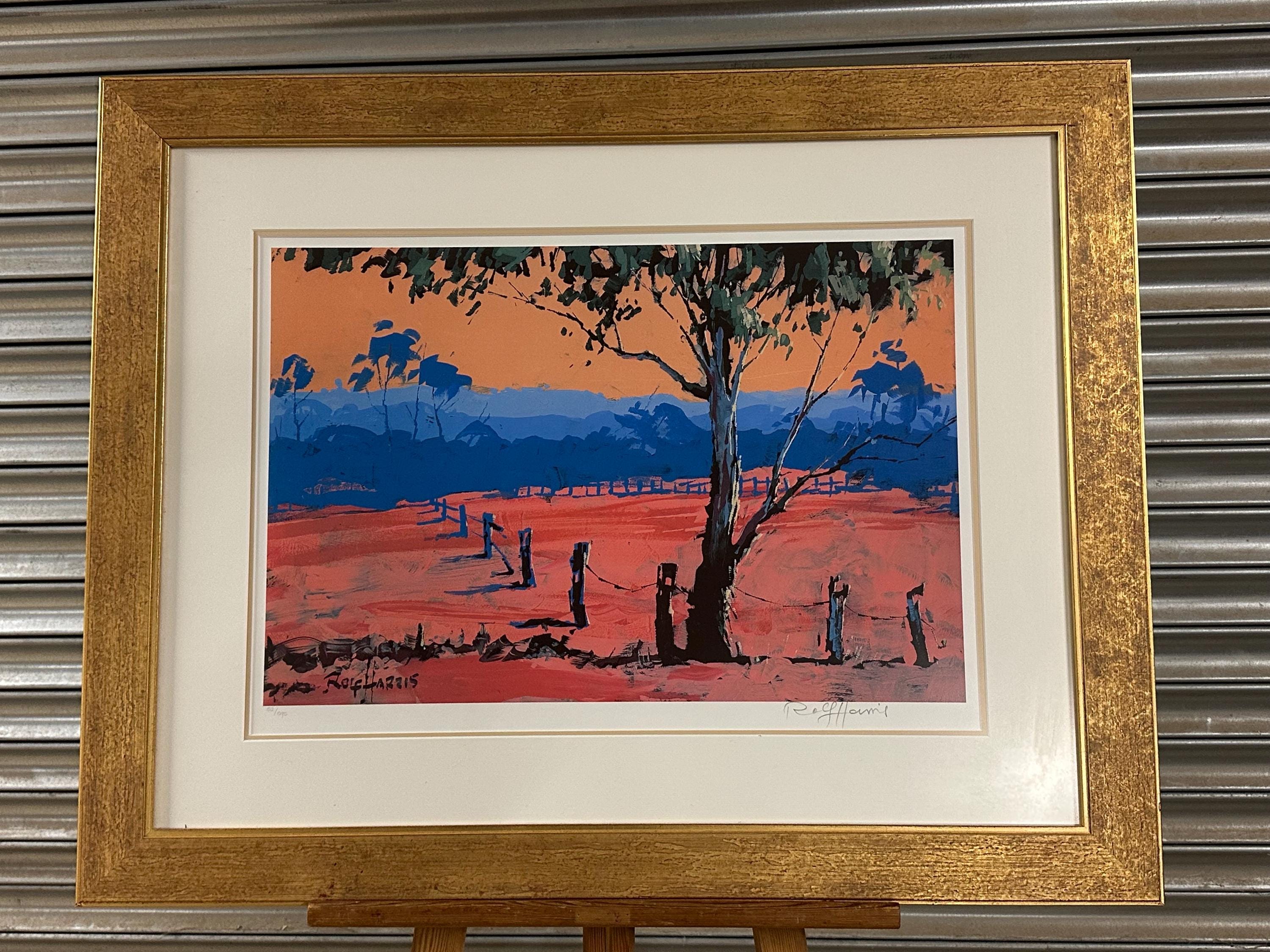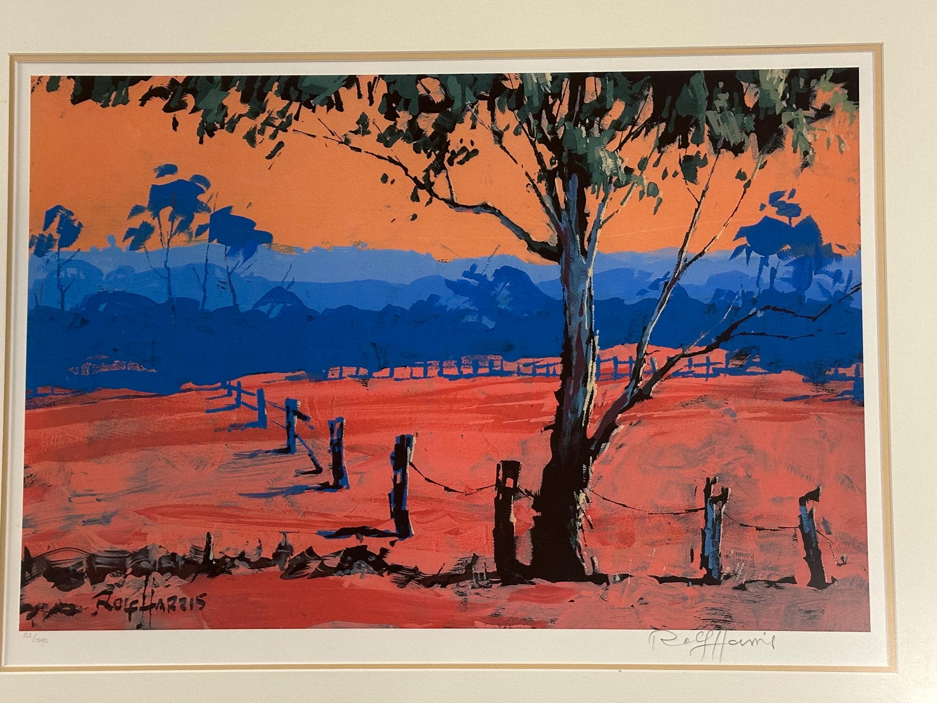 A striking signed limited edition print titled Blue Horizons, featuring Rolf Harris’s instantly recognisable bold landscape style, with vibrant bands of colour and expressive brushwork depicting an Australian rural scene with fencing and trees against a dramatic horizon.