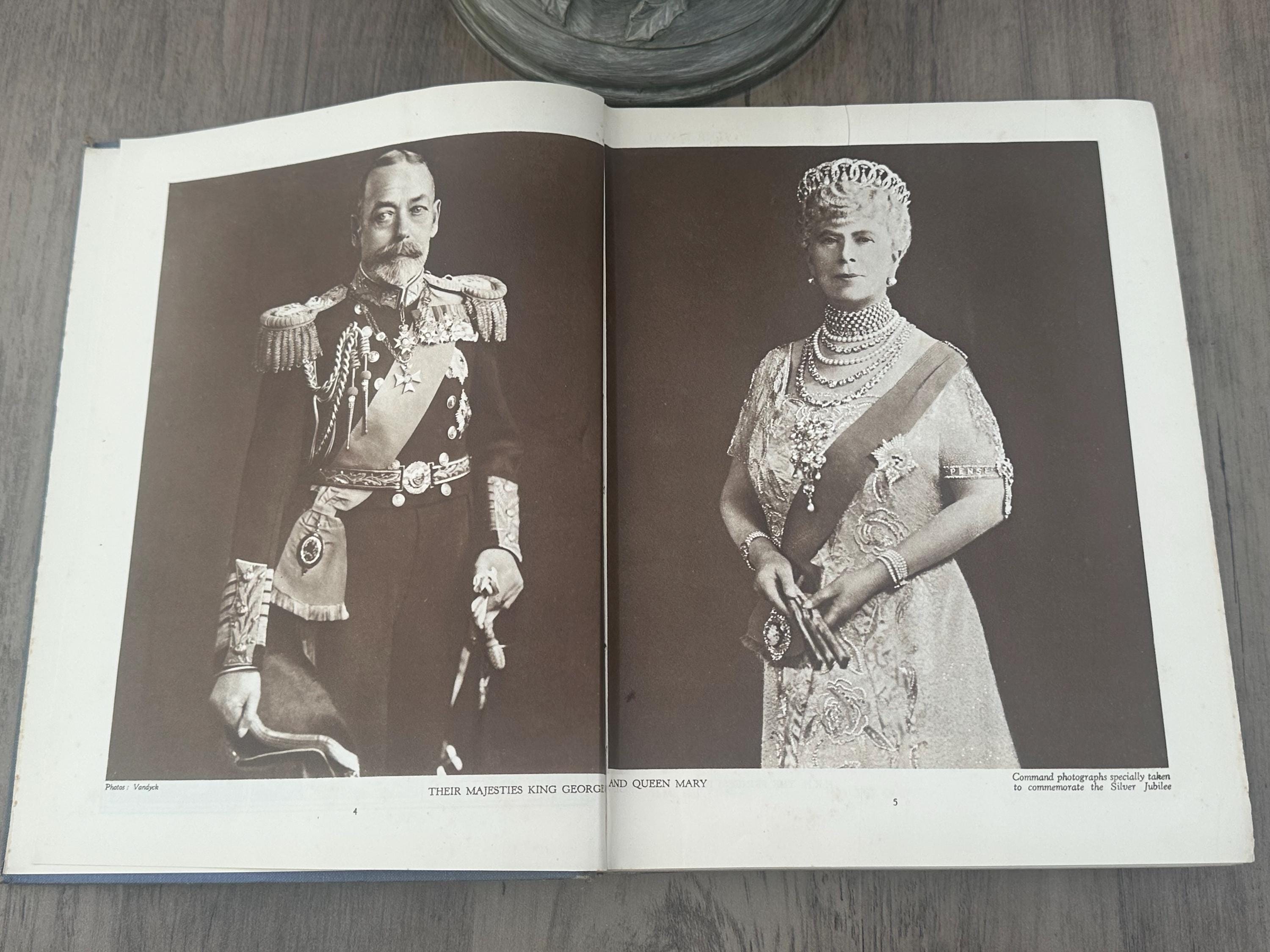 Blue cover with silver print on front cover and spine. Front cover has embossing in a floral pattern.Inside front and back covers the paper is patterned in silver and blue with crowns and flags. 512 pages with mainly photographs in sepia colours.