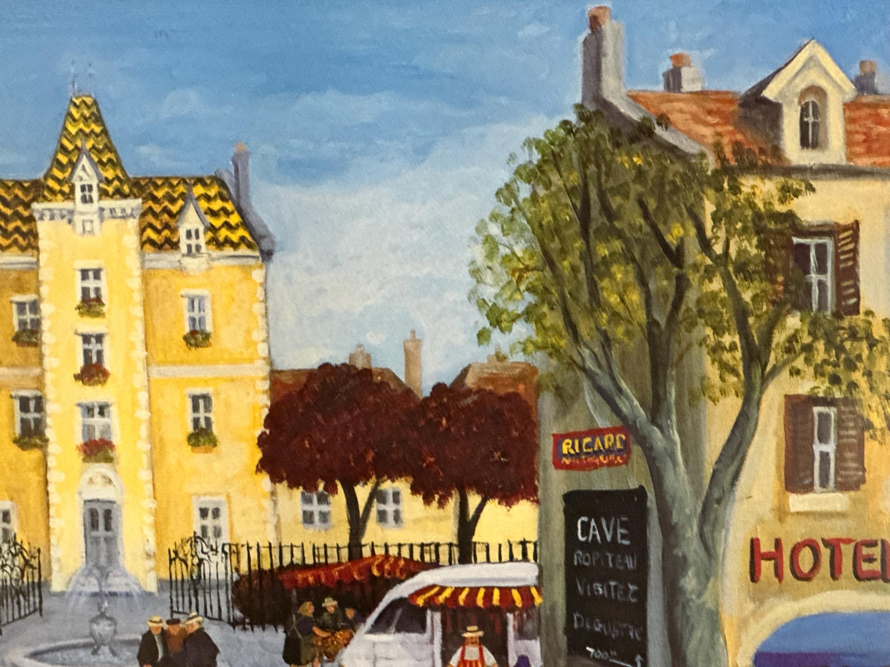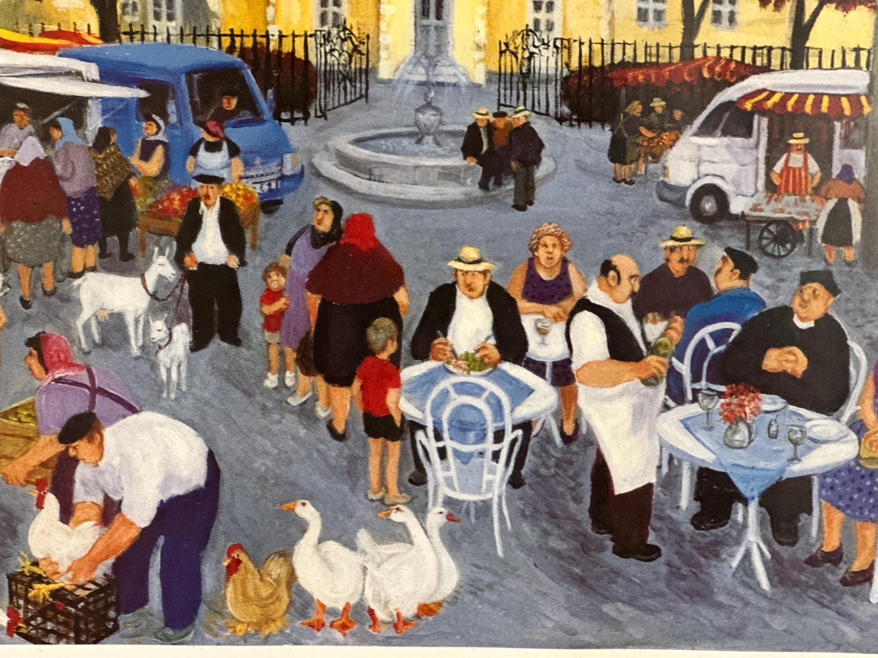 This lively European town-square scene captures a bustling French market day, complete with café tables, villagers, produce stalls and architectural details, all rendered in Loxton’s distinctive naïve folk-art style.