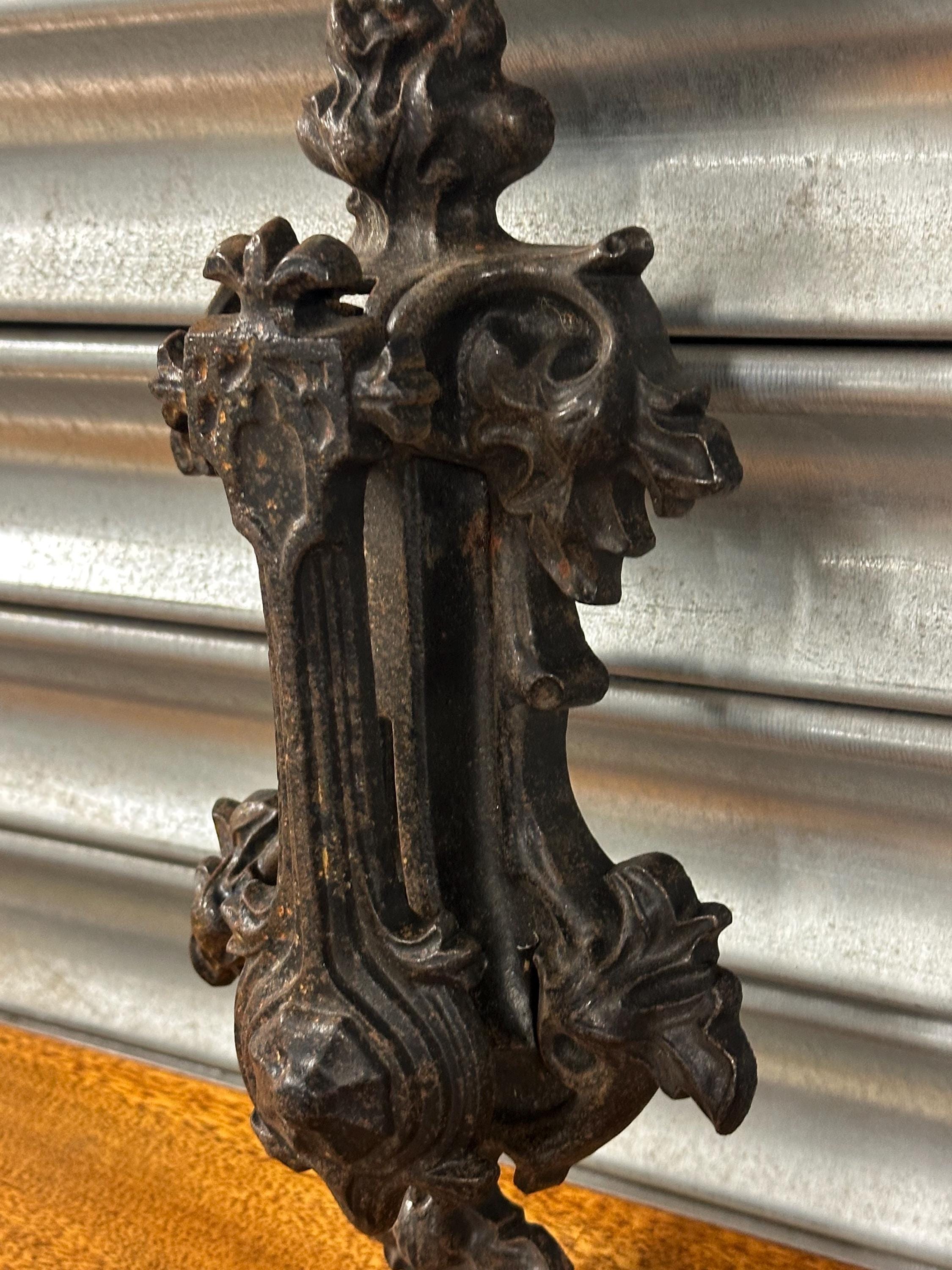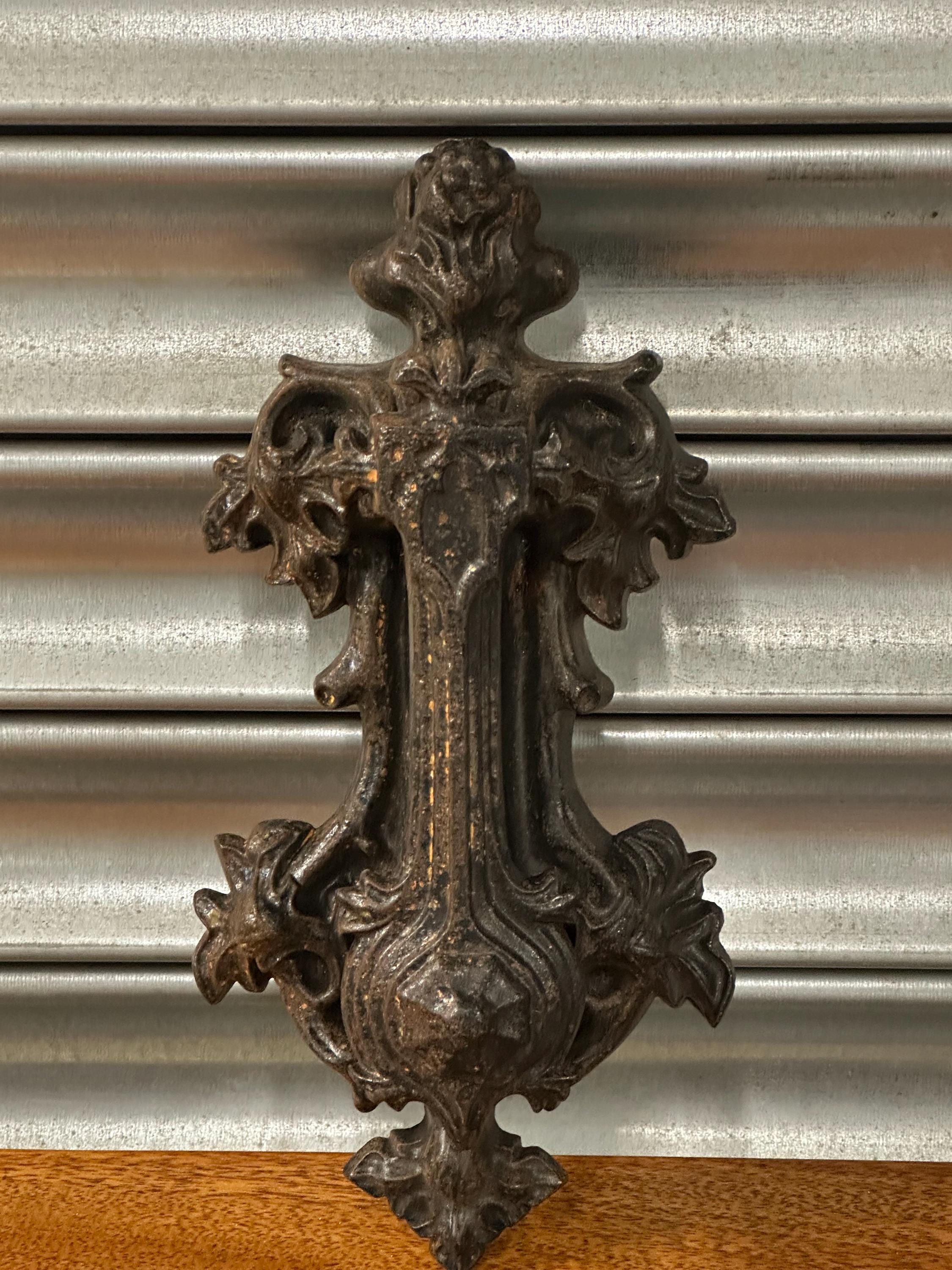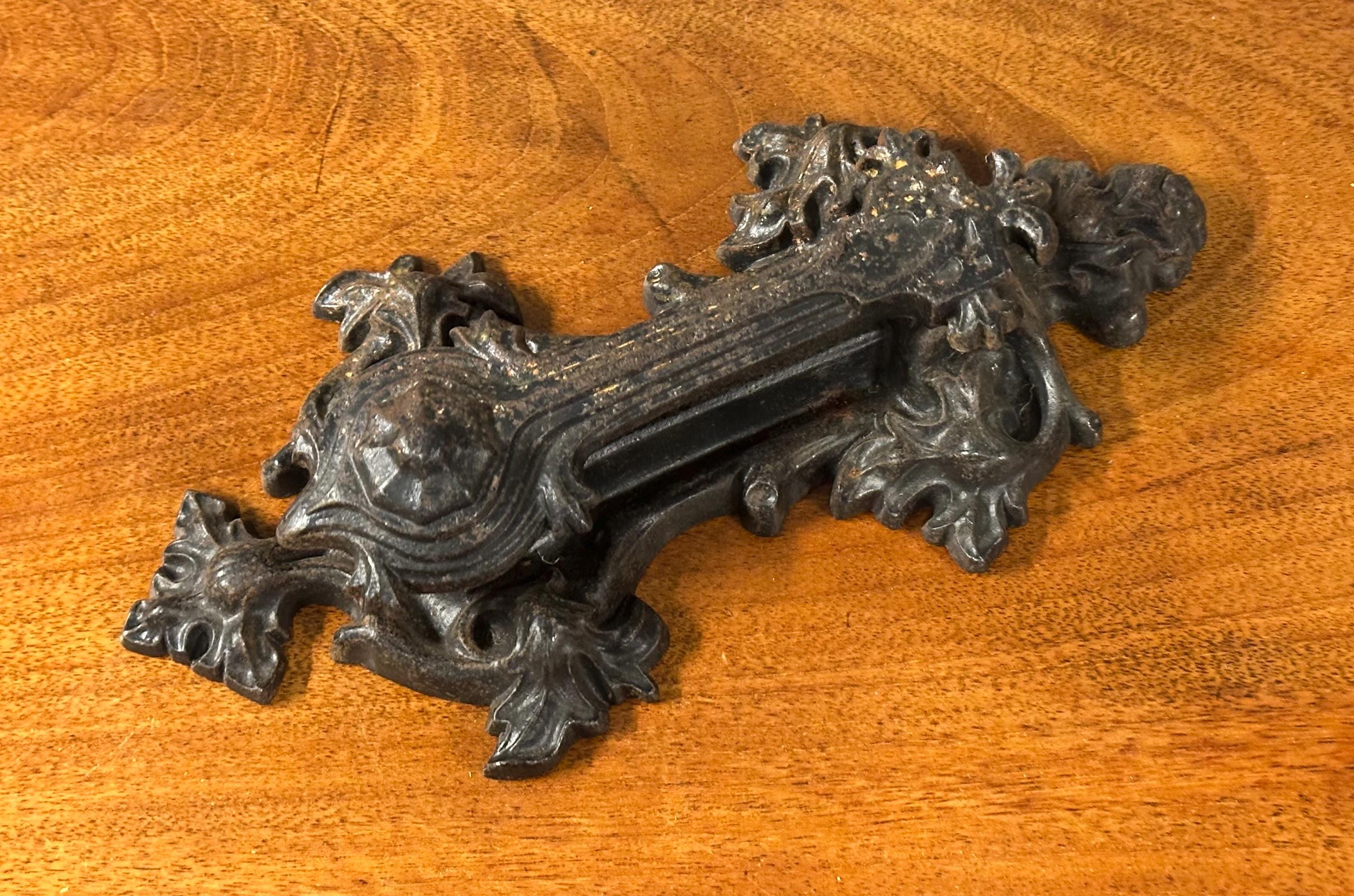 This is a substantial, well-cast example with lovely age-darkened patina, ideal for restoring or enhancing a period front door, hallway project, or architectural salvage collection.