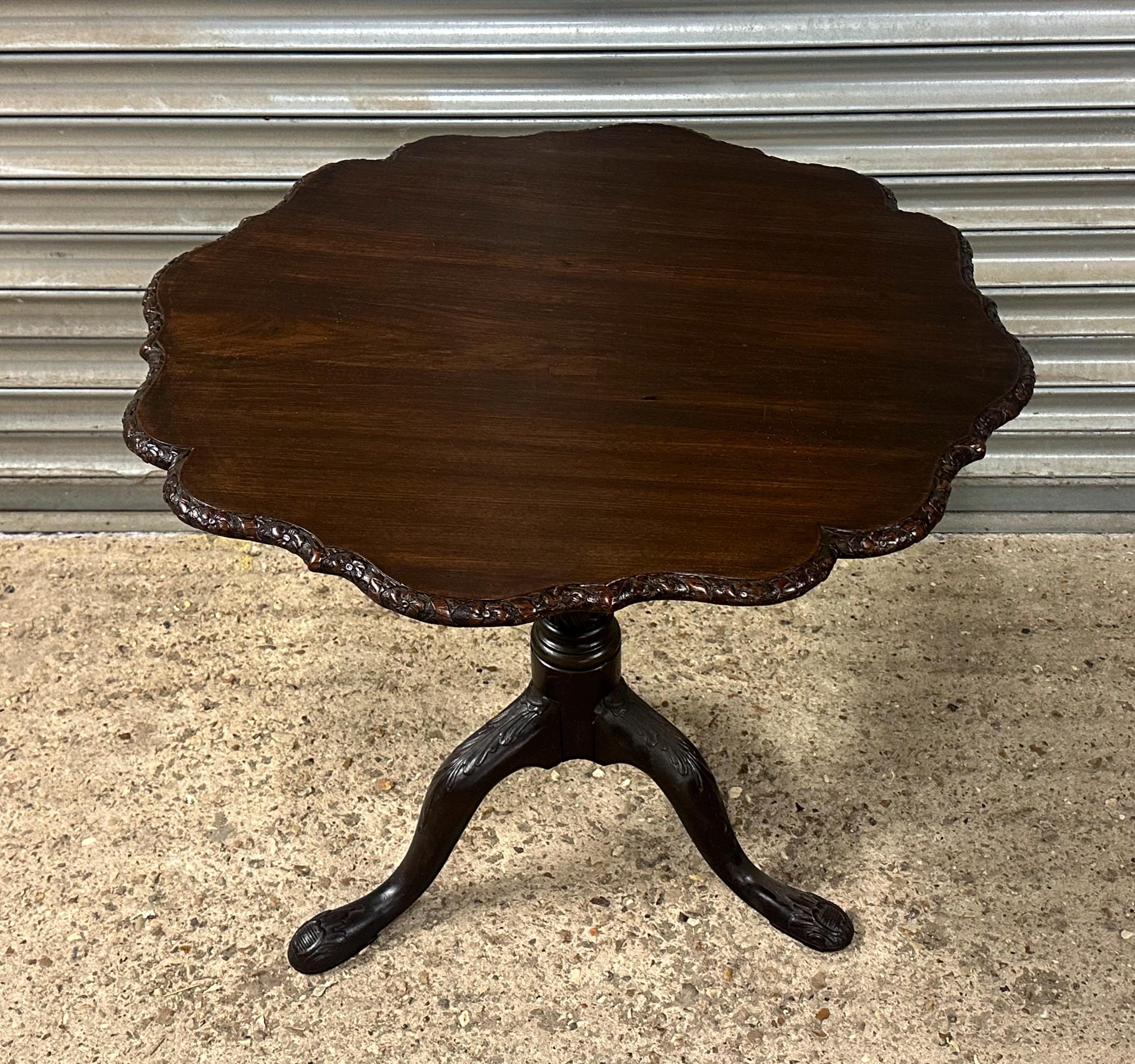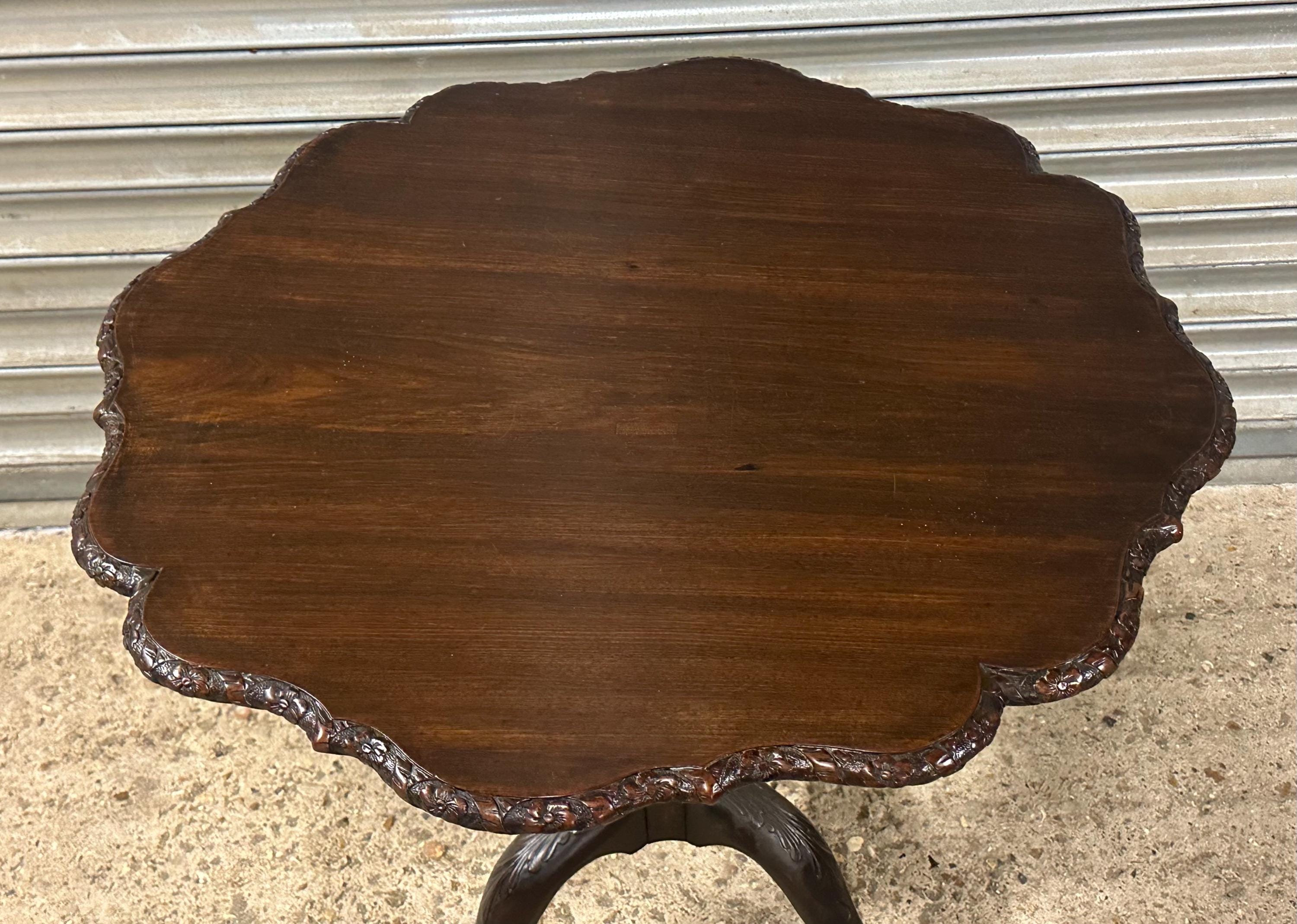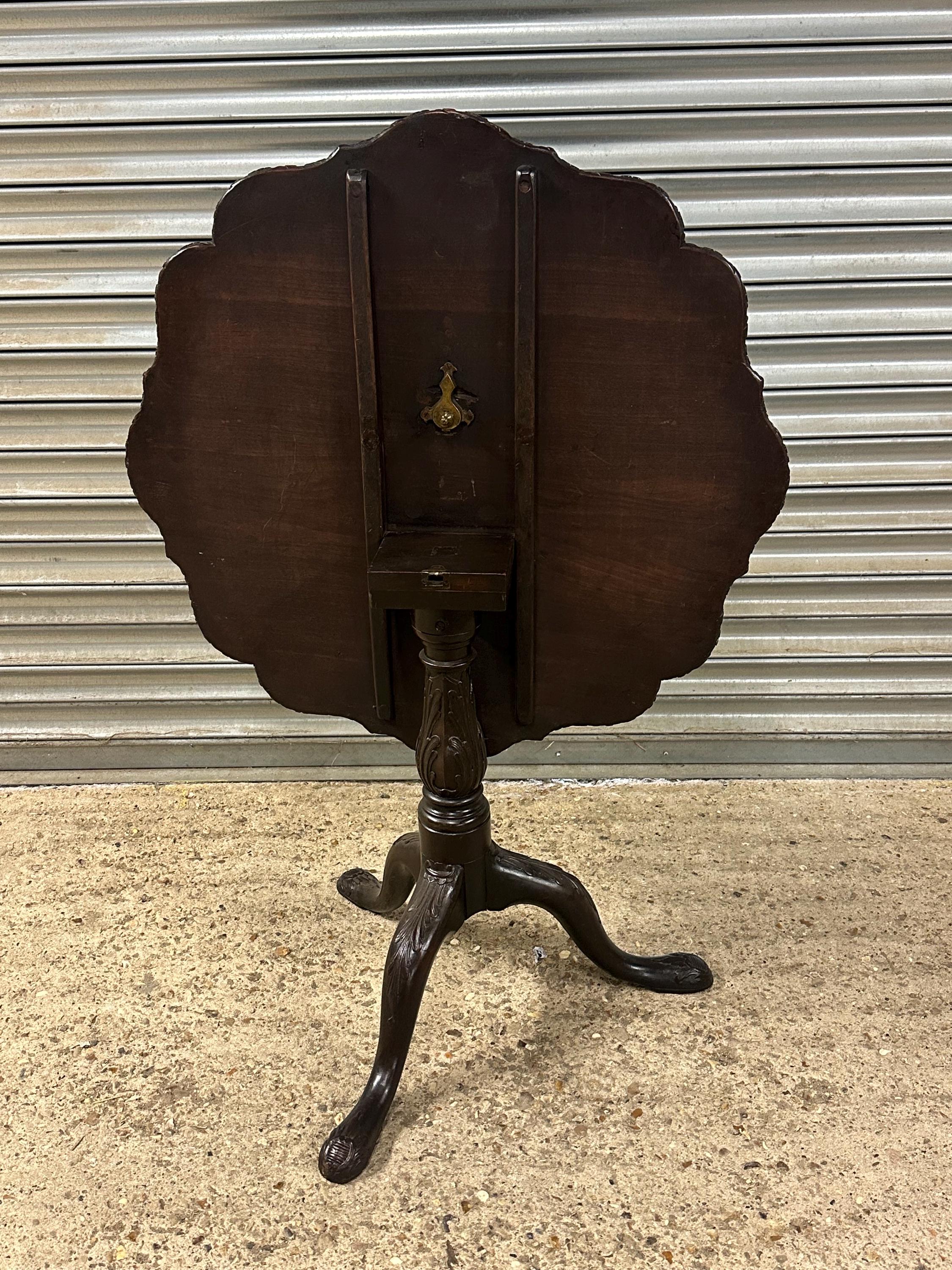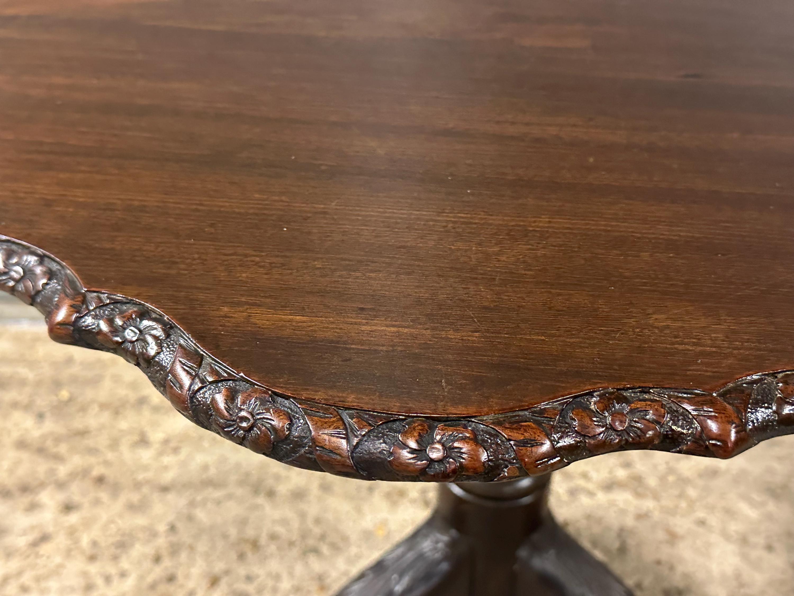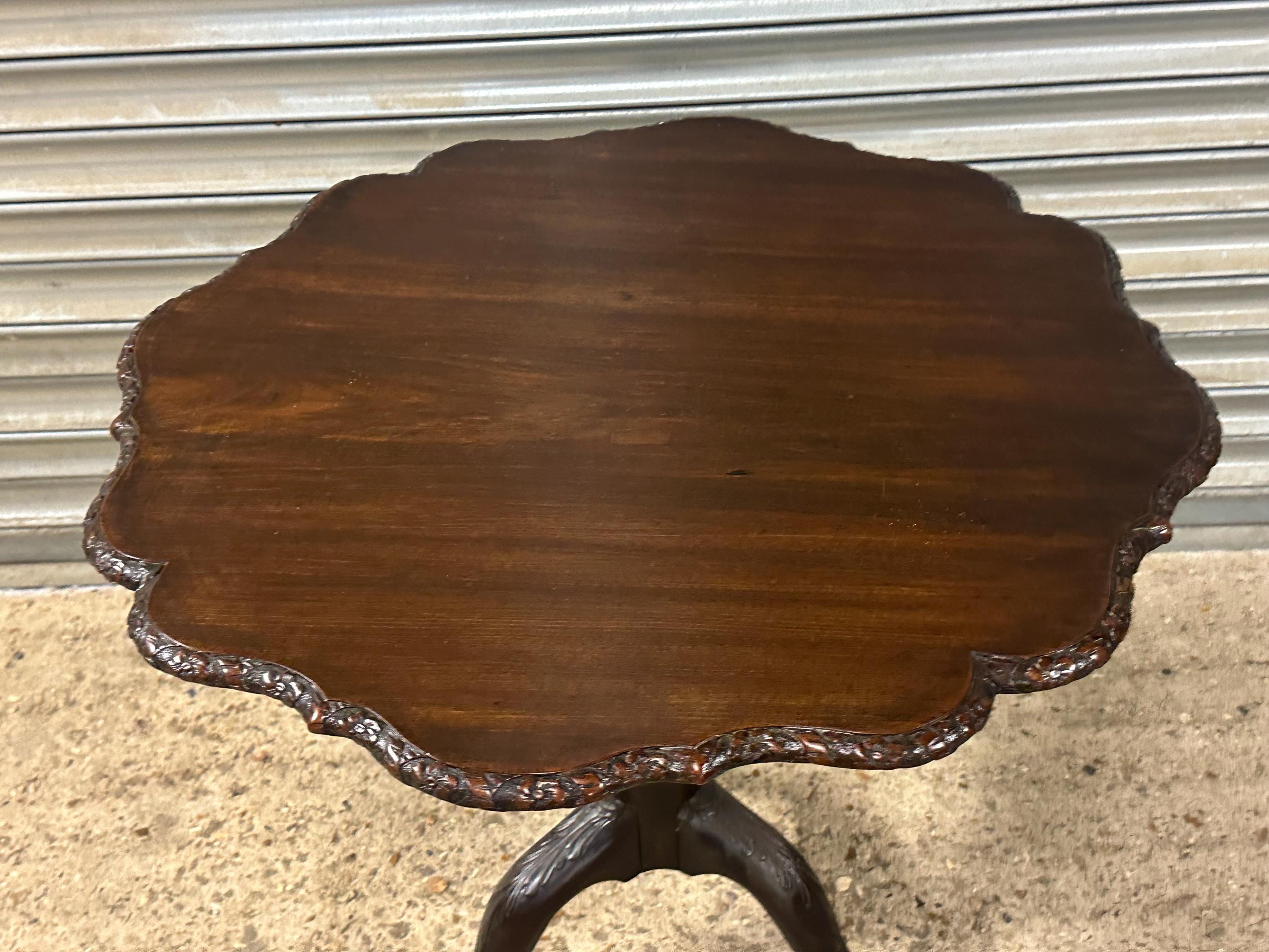 Beautiful late Victorian tilt-top occasional table dating to approximately 1880β1900, featuring a wonderfully shaped scalloped pie-crust top and elegant tripod cabriole base with carved feet.