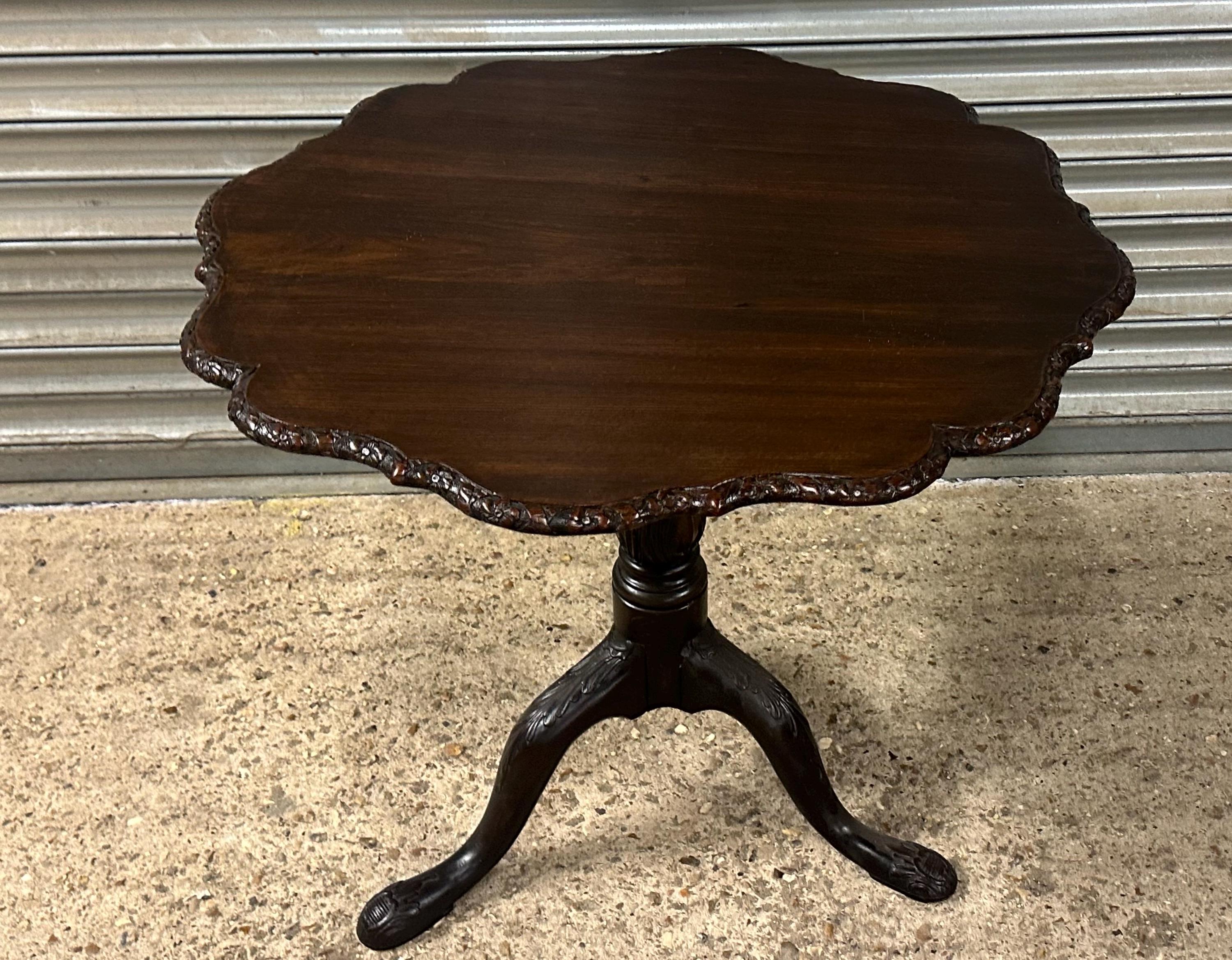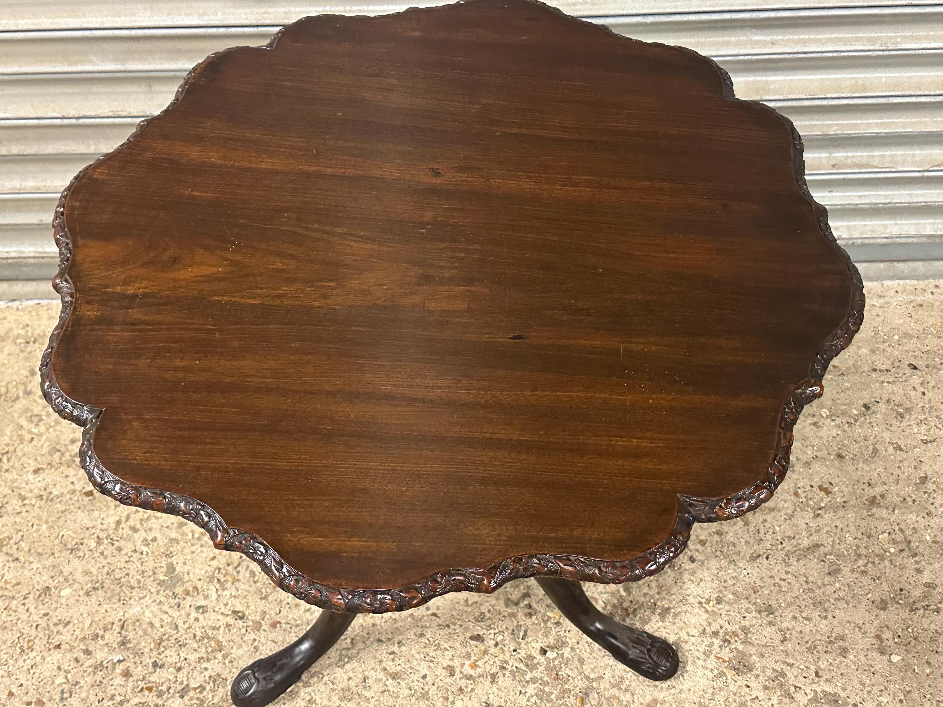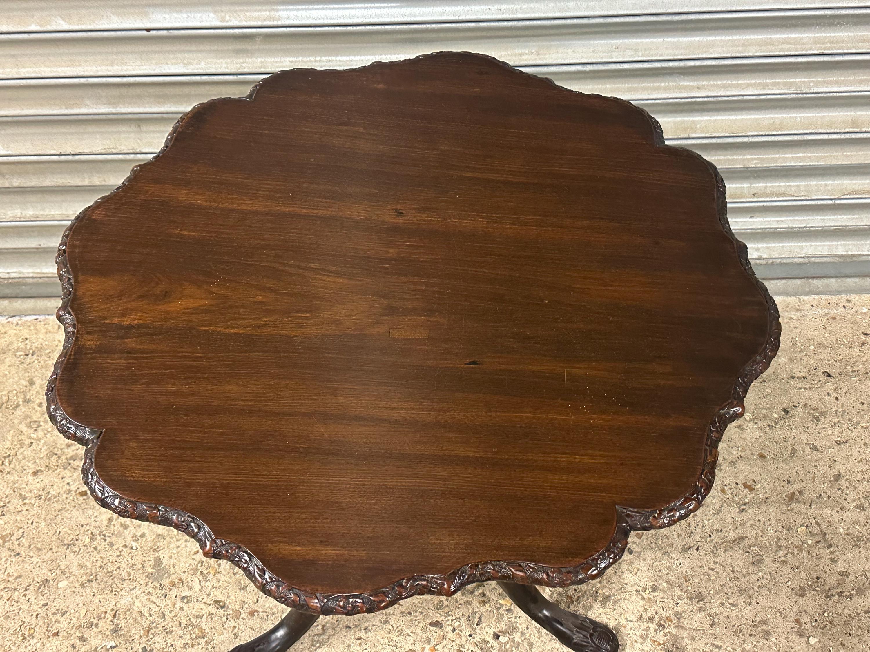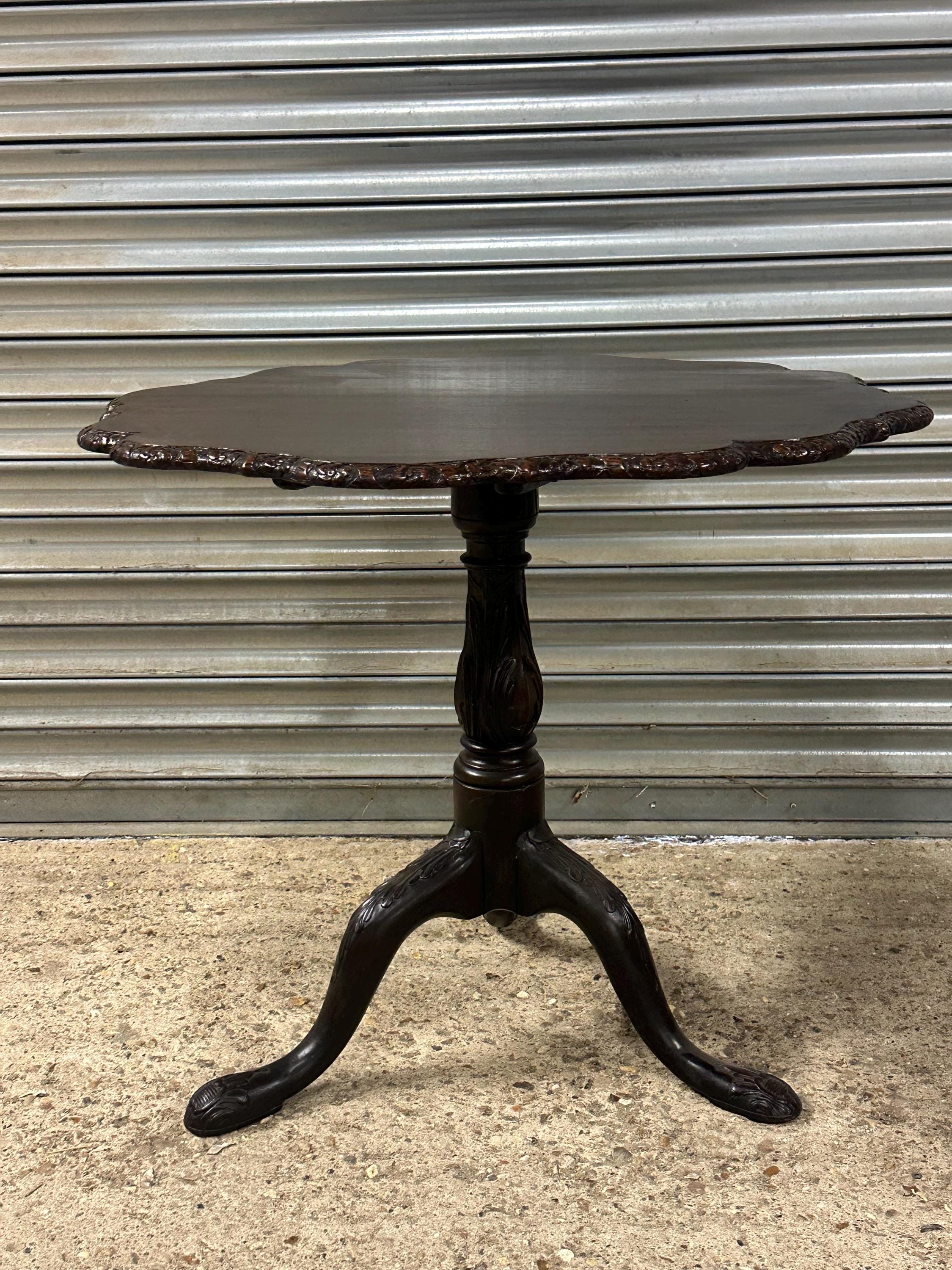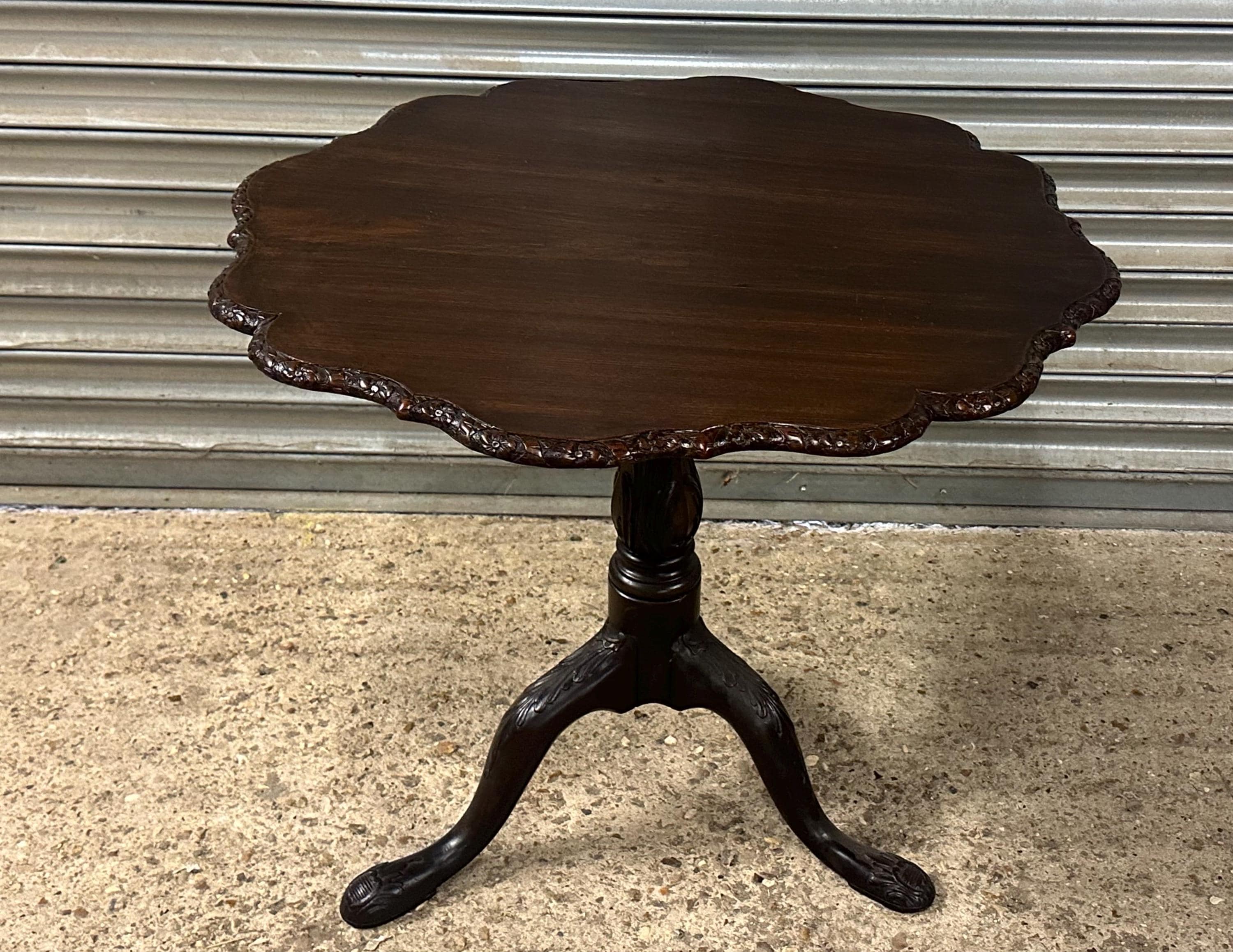 Beautiful late Victorian tilt-top occasional table dating to approximately 1880β1900, featuring a wonderfully shaped scalloped pie-crust top and elegant tripod cabriole base with carved feet.