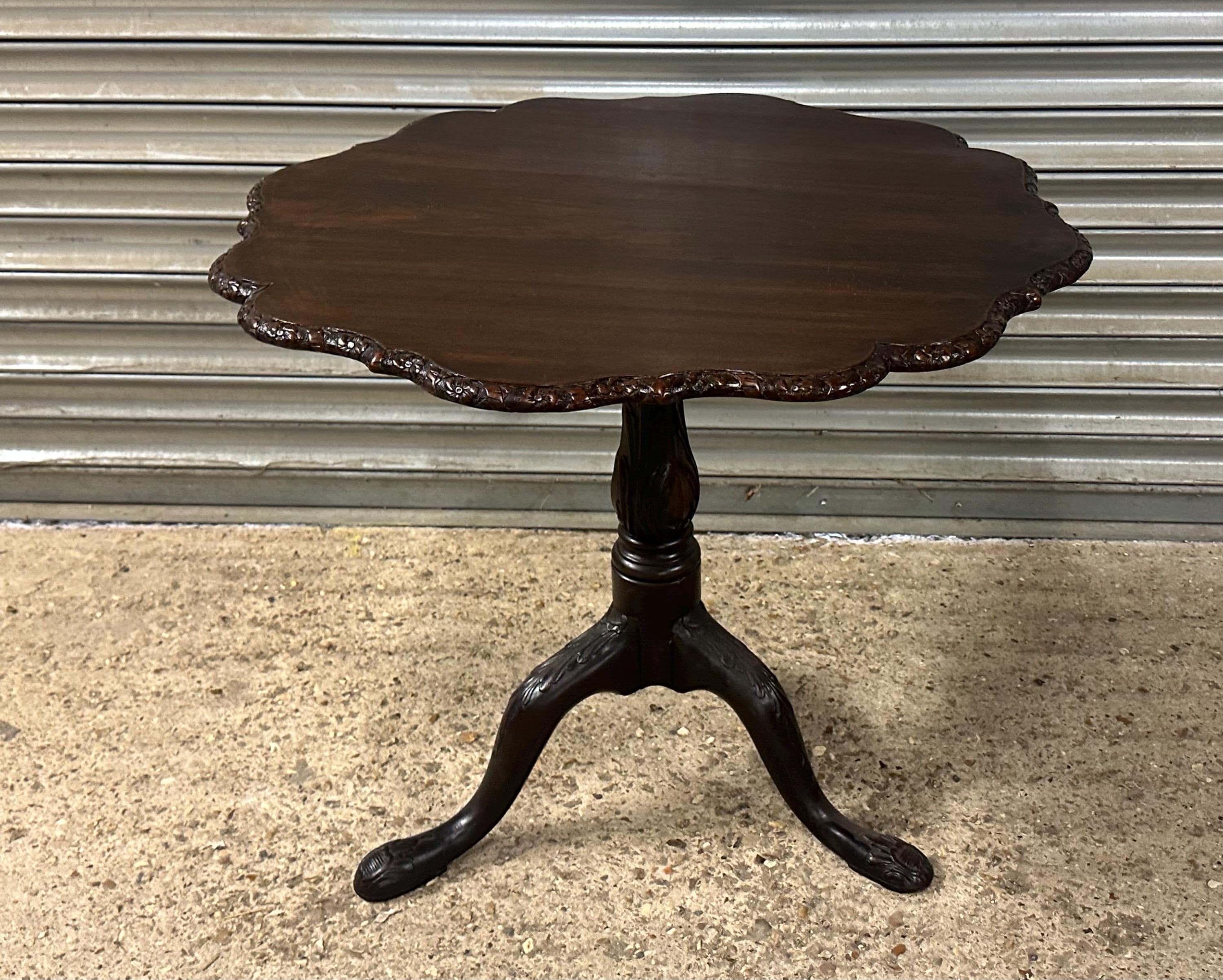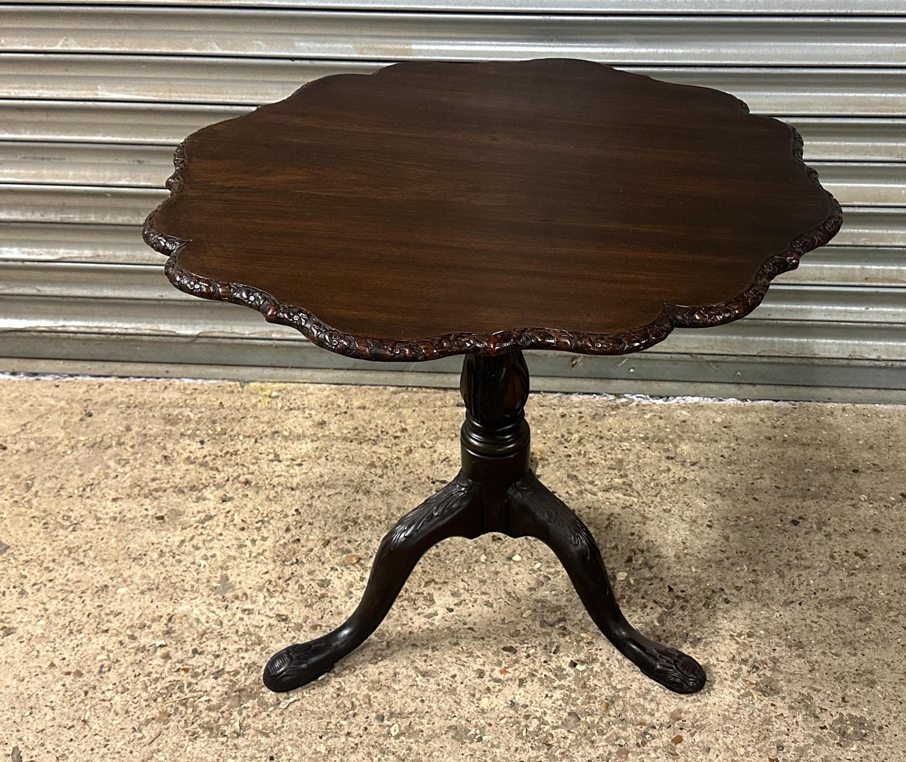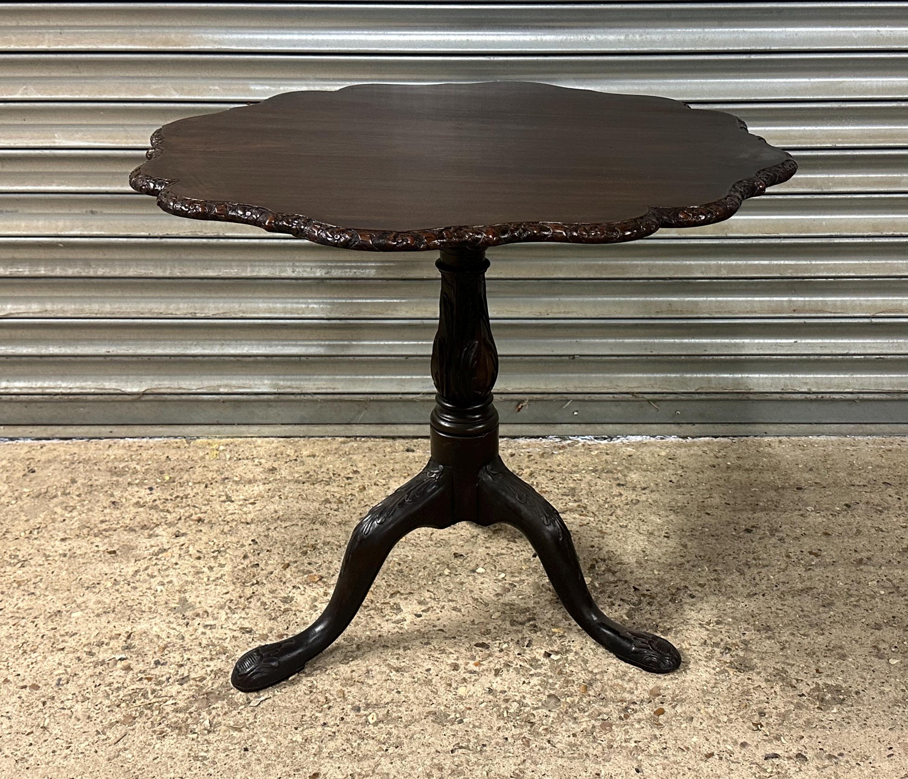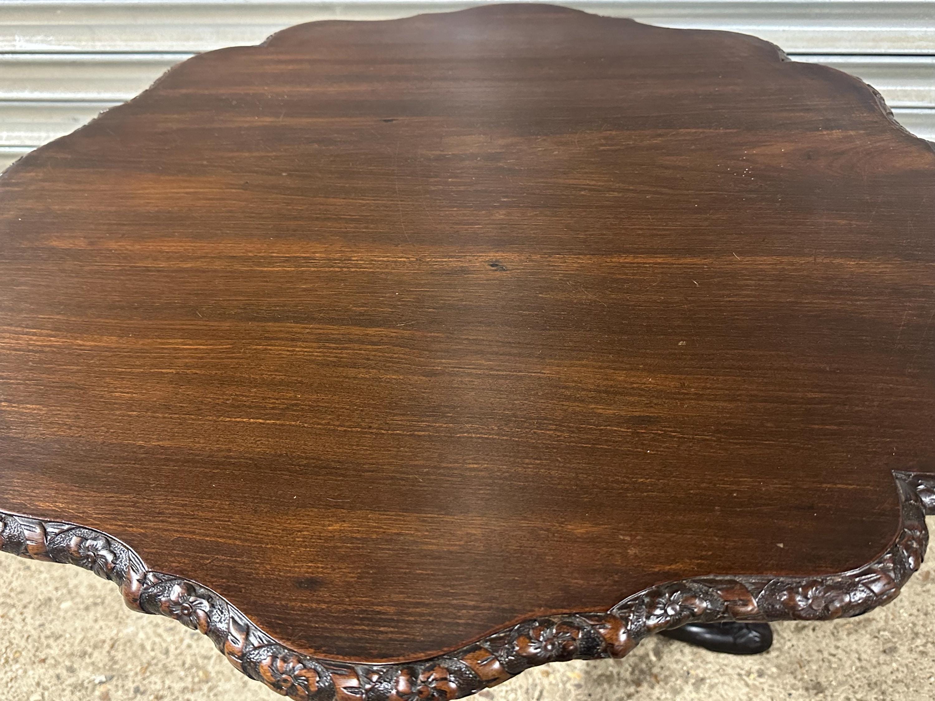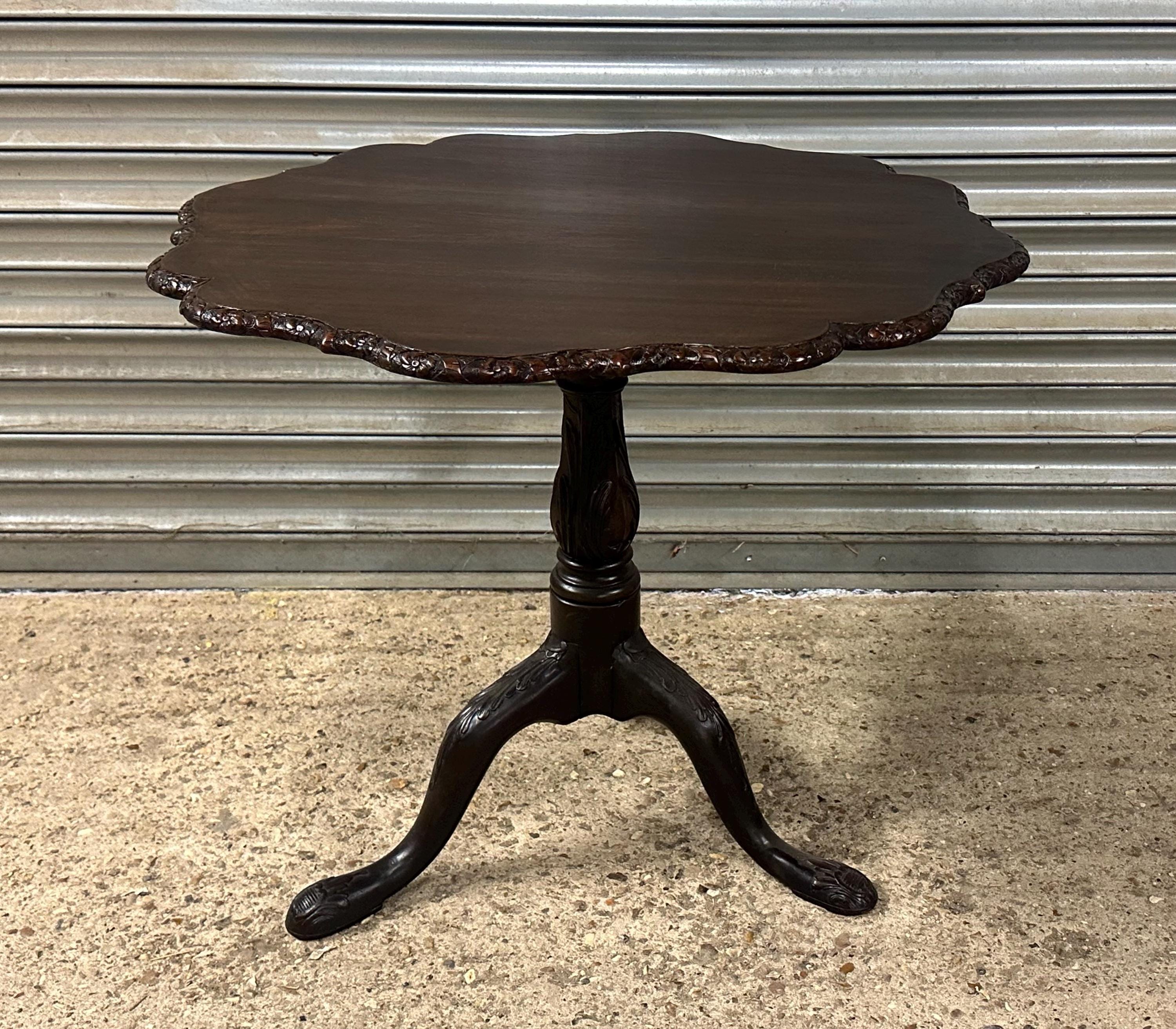Beautiful late Victorian tilt-top occasional table dating to approximately 1880β1900, featuring a wonderfully shaped scalloped pie-crust top and elegant tripod cabriole base with carved feet.