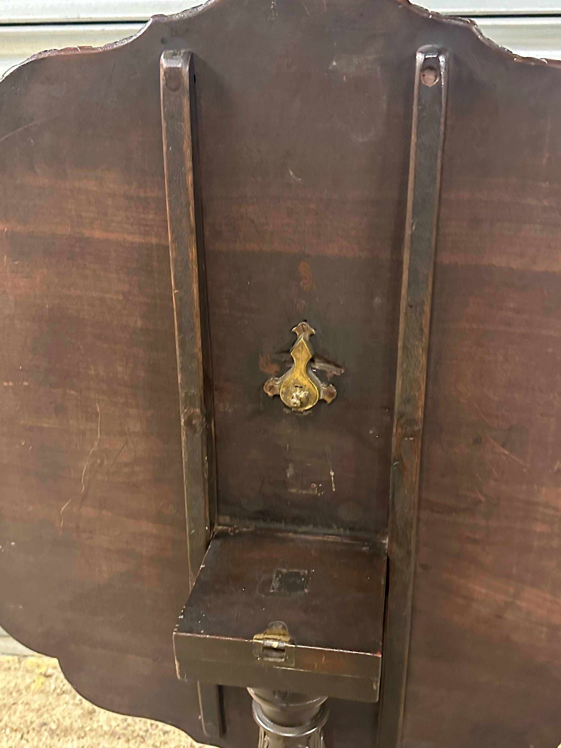 The solid hardwood top tilts smoothly into the upright position, allowing easy storage or display β a classic and practical Victorian feature. The shaped rim is crisply carved, framing the rich aged surface which displays a lovely warm patina developed over more than a century.