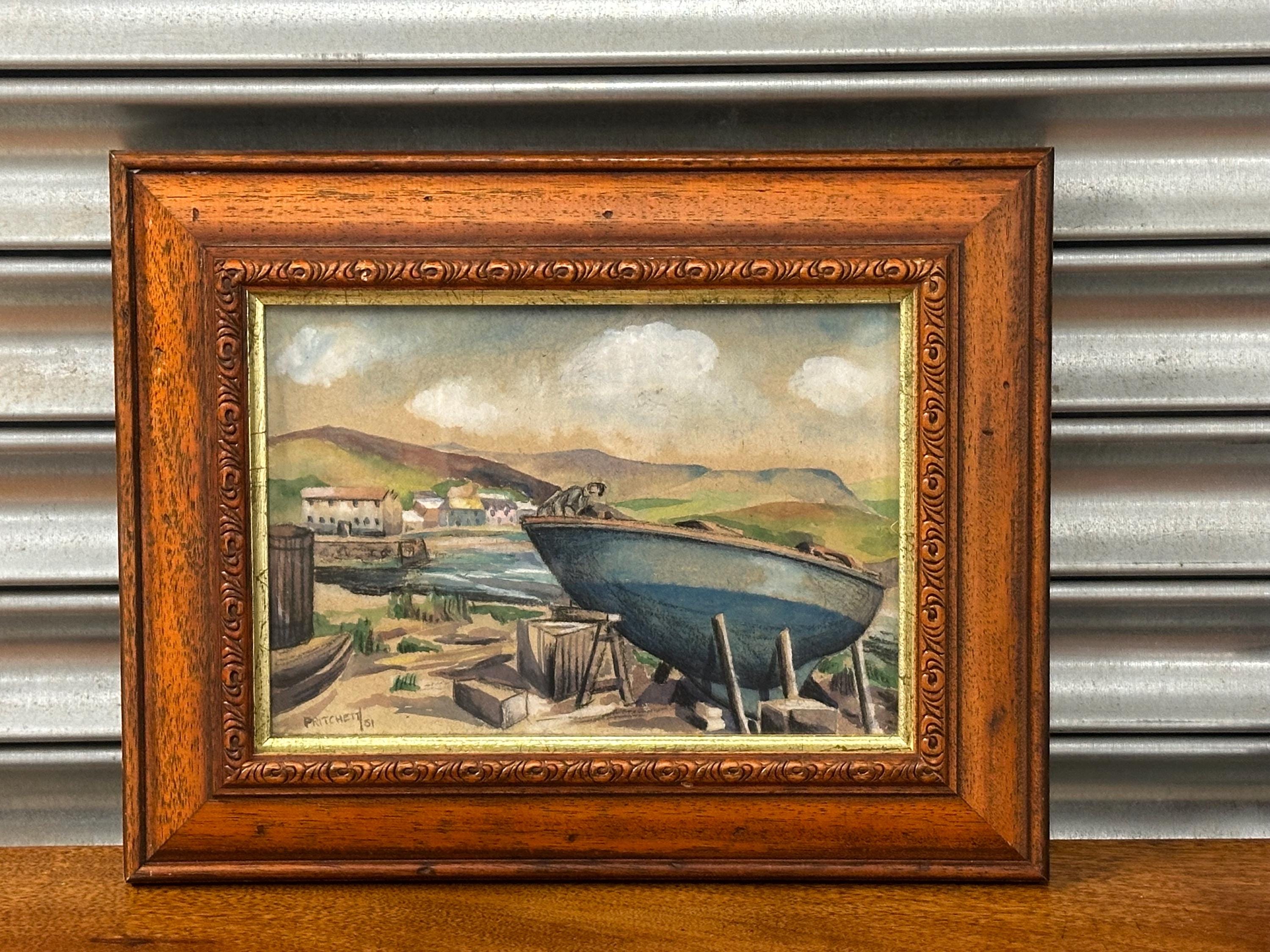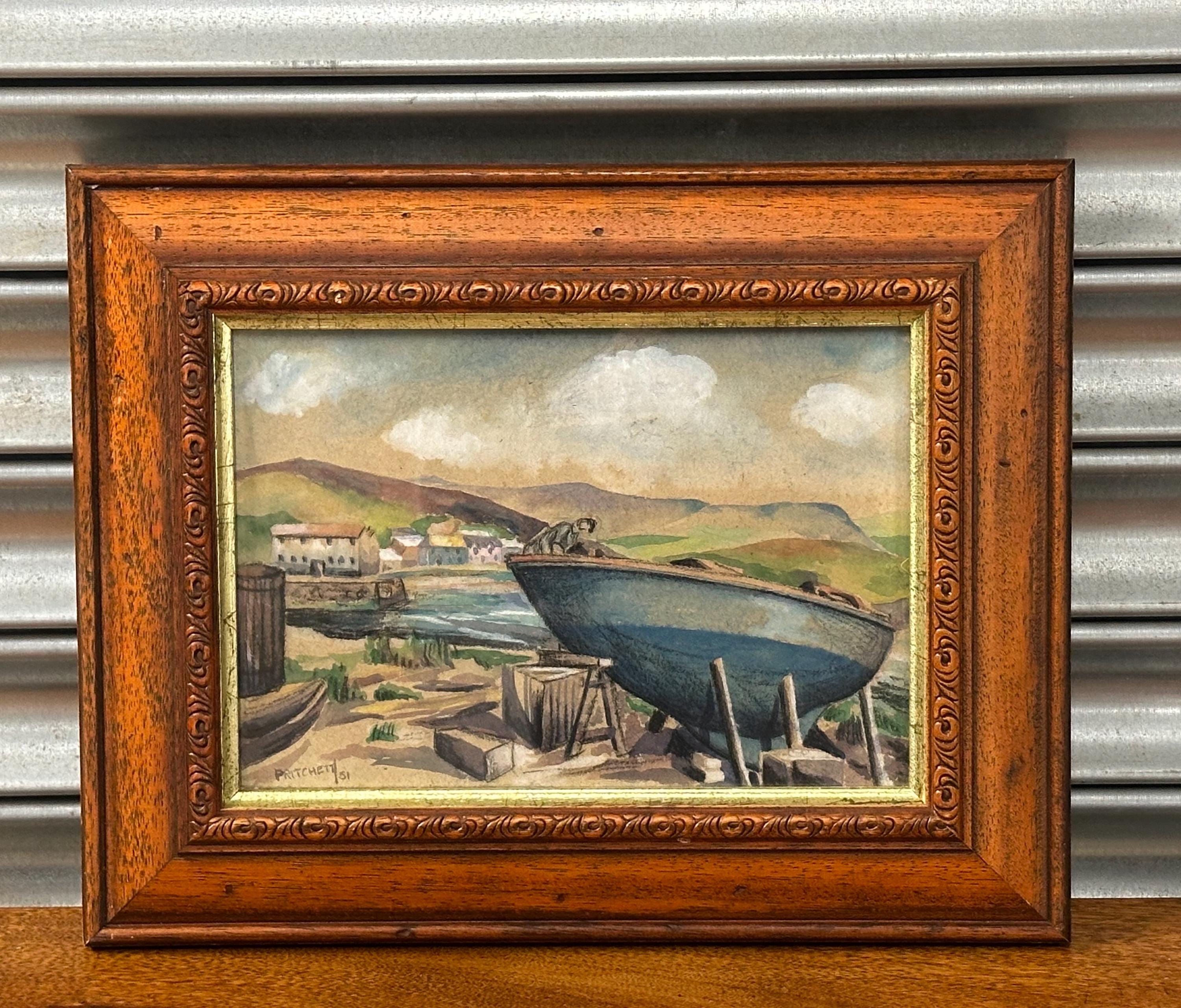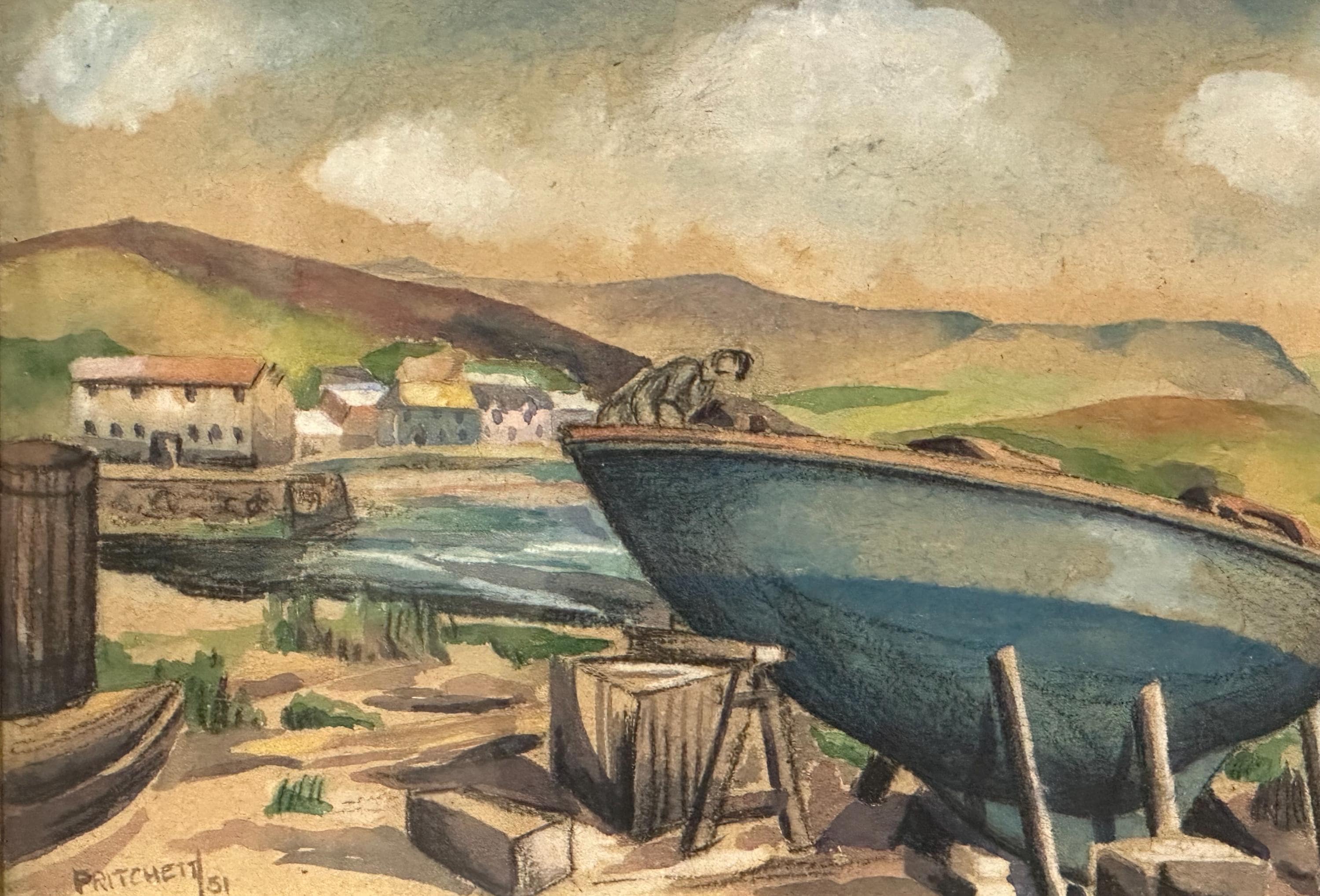 Charming original mid-century watercolour depicting a coastal harbour scene with fishing boat drawn up on the shore, village buildings beyond and rolling hills under a softly clouded sky.