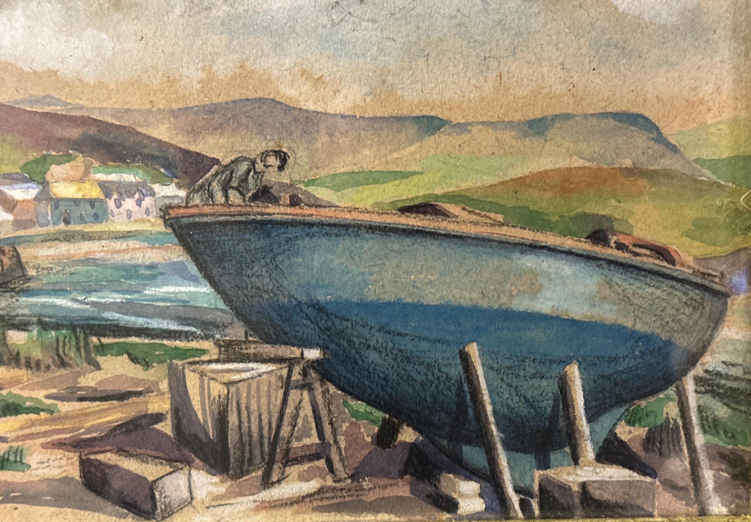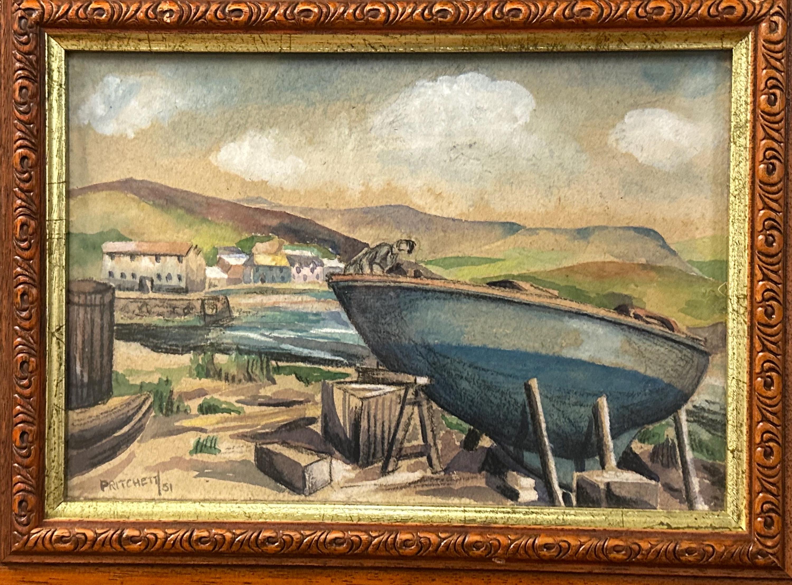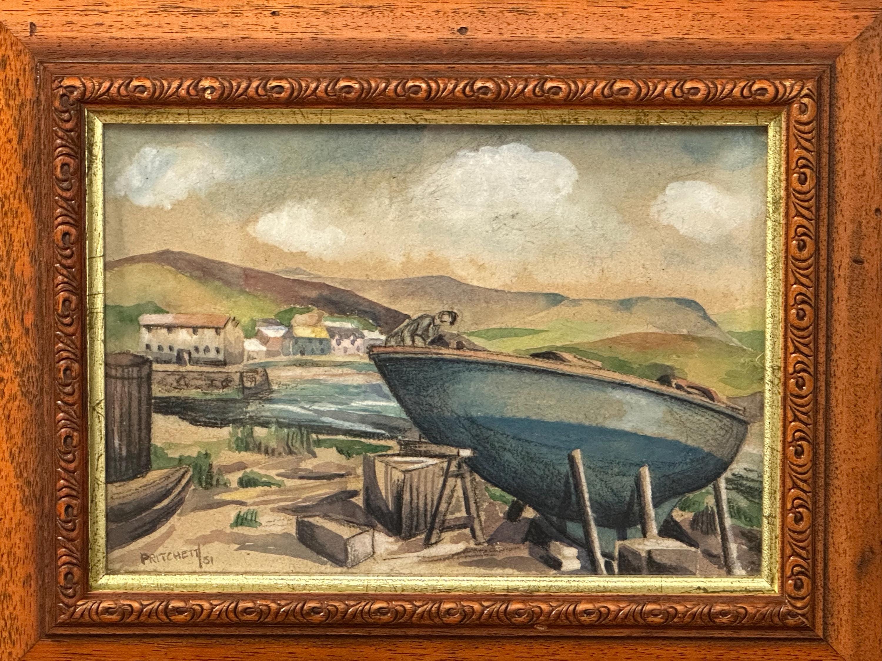 Charming original mid-century watercolour depicting a coastal harbour scene with fishing boat drawn up on the shore, village buildings beyond and rolling hills under a softly clouded sky.