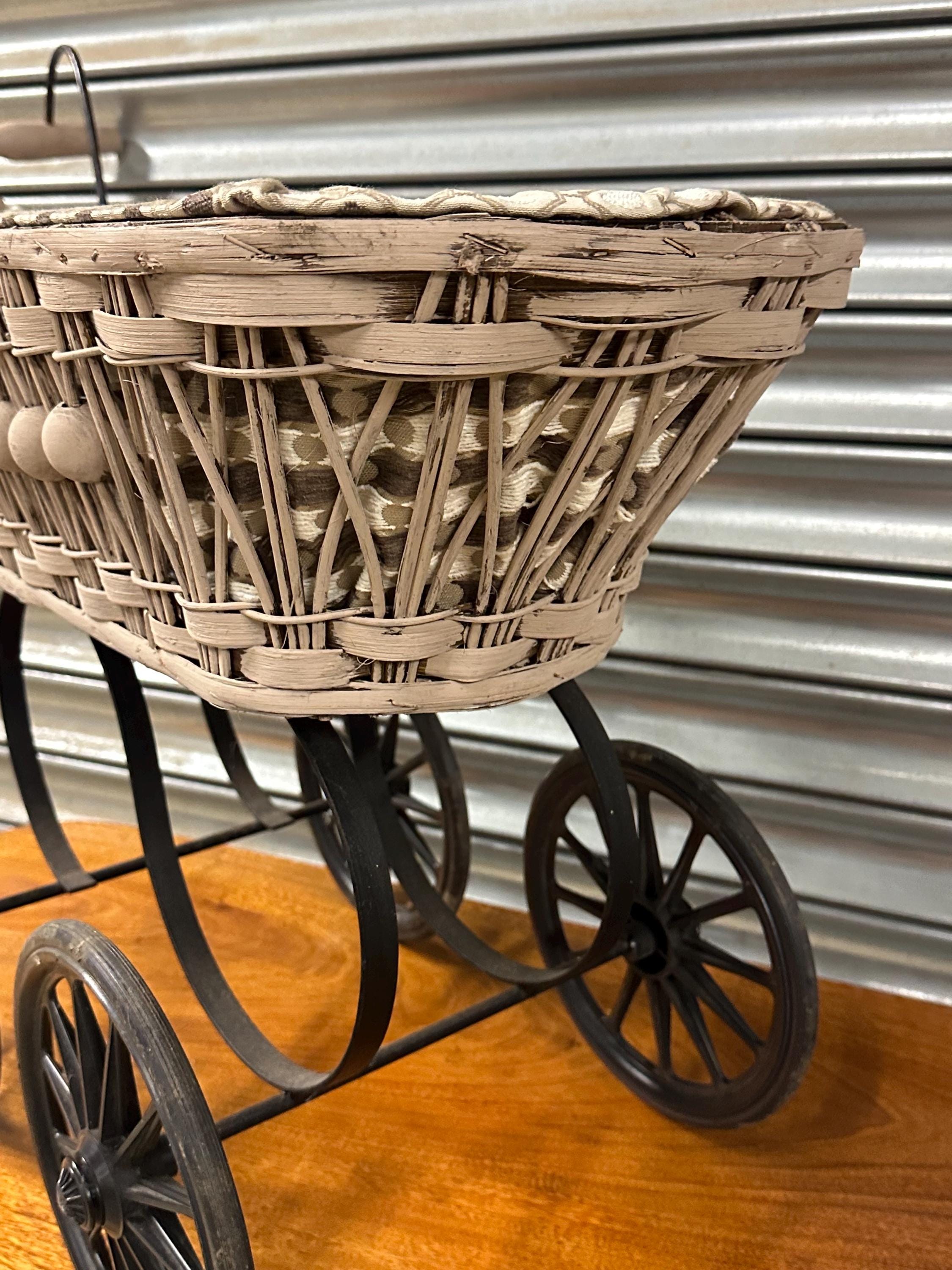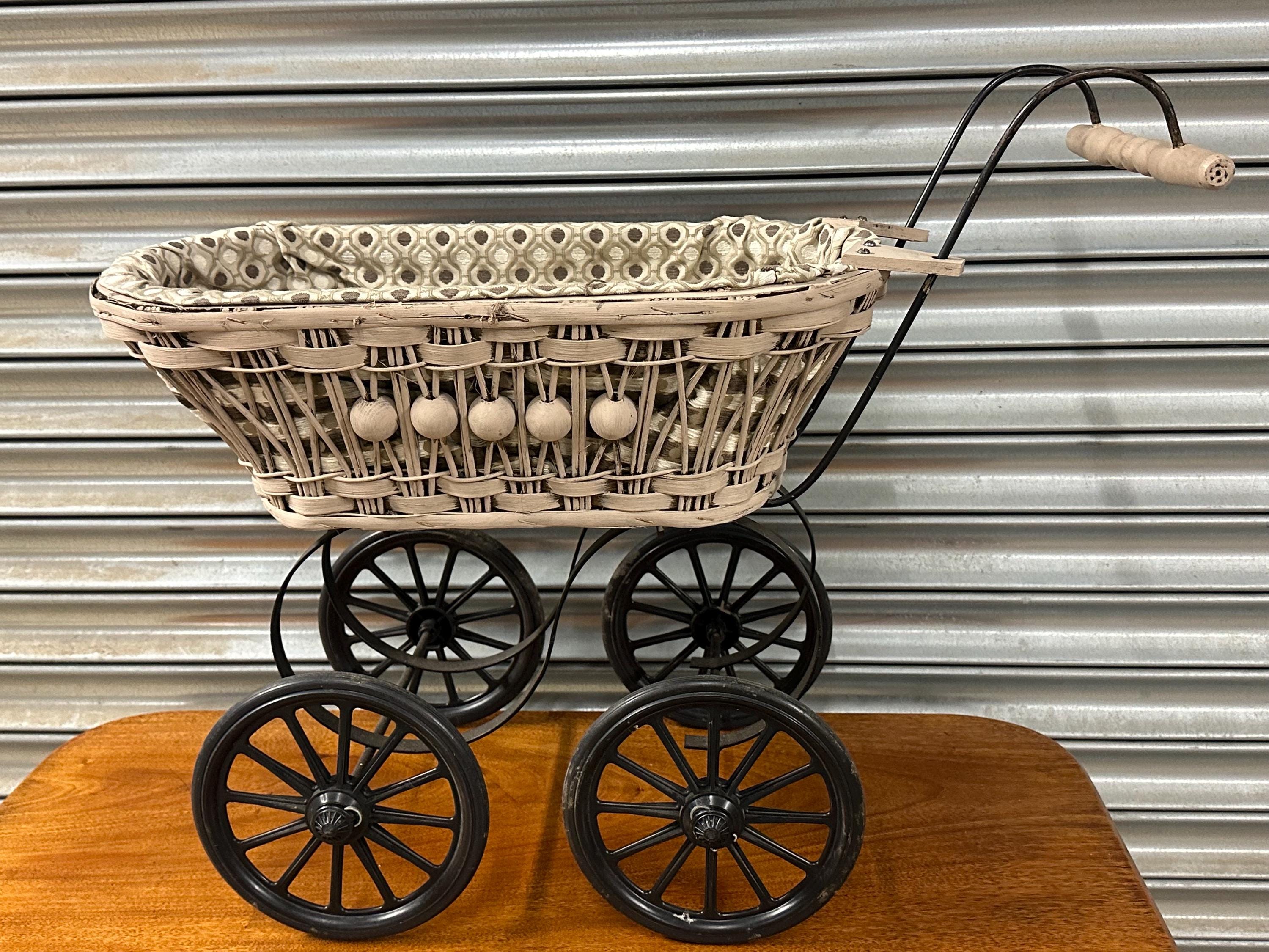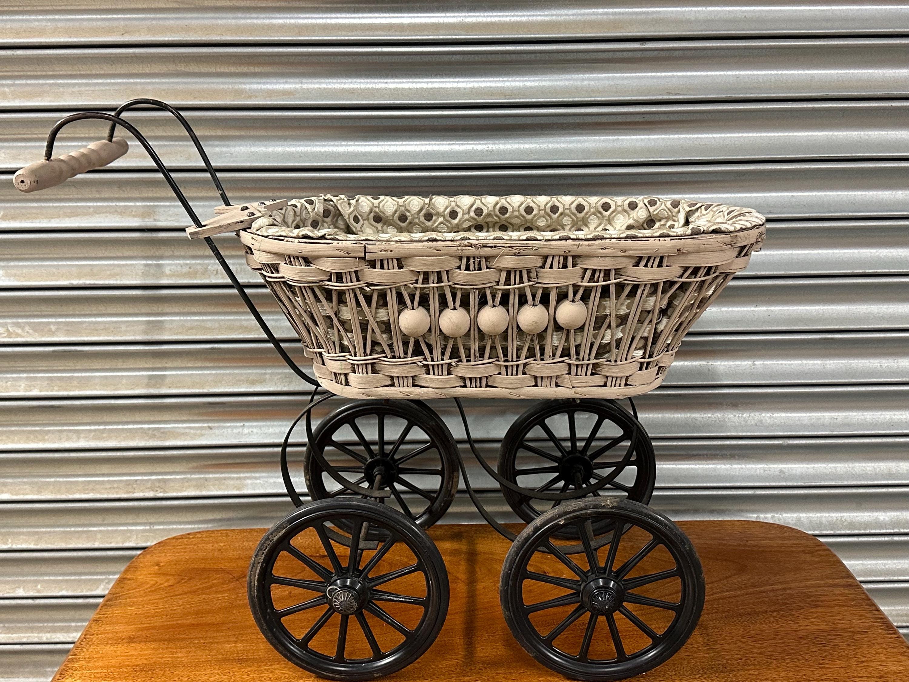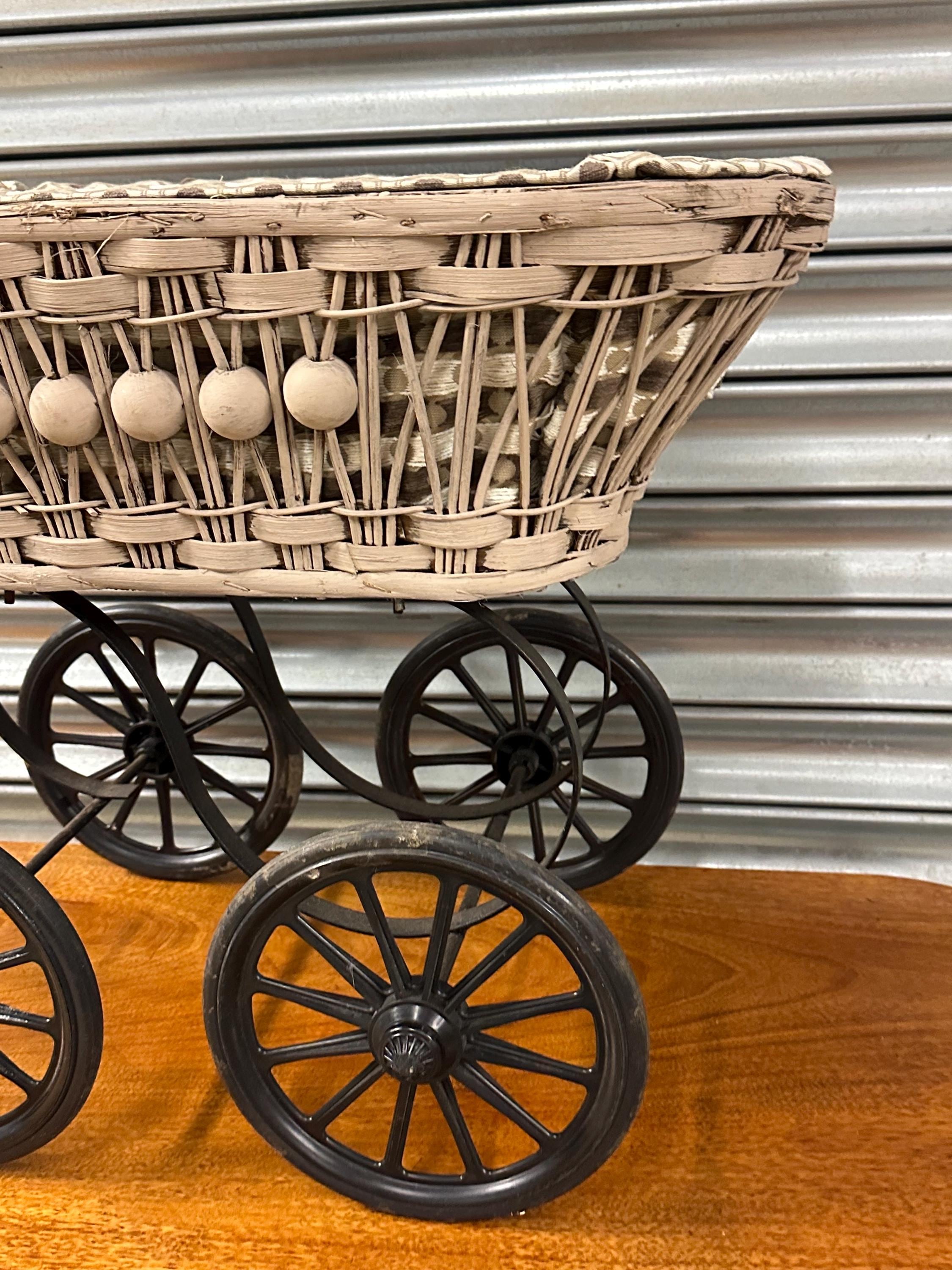 Charming vintage-style wicker dolls pram / decorative pushchair featuring a beautifully woven basket body with bead detailing, fabric liner, and classic four-wheel metal chassis with spoked wheels and wooden handle grip.