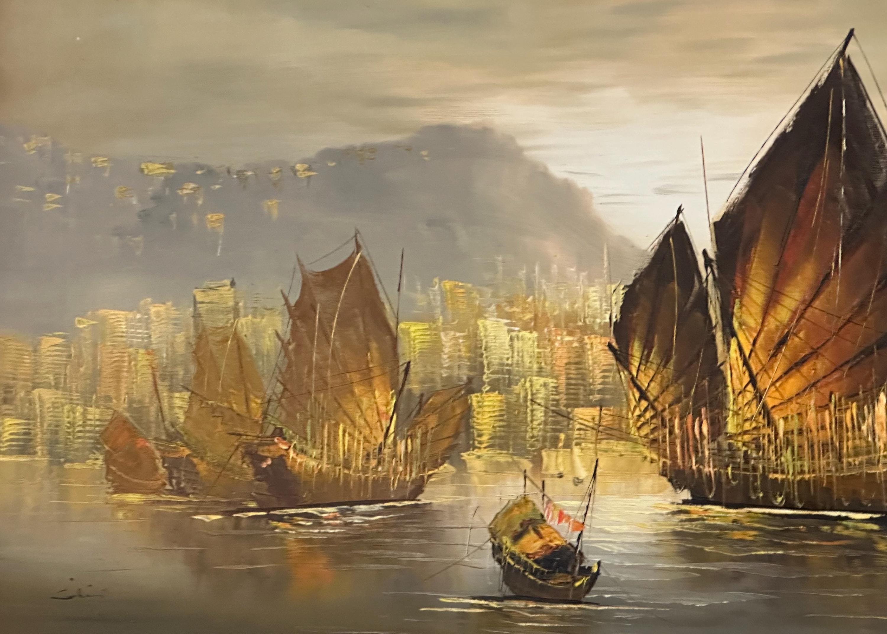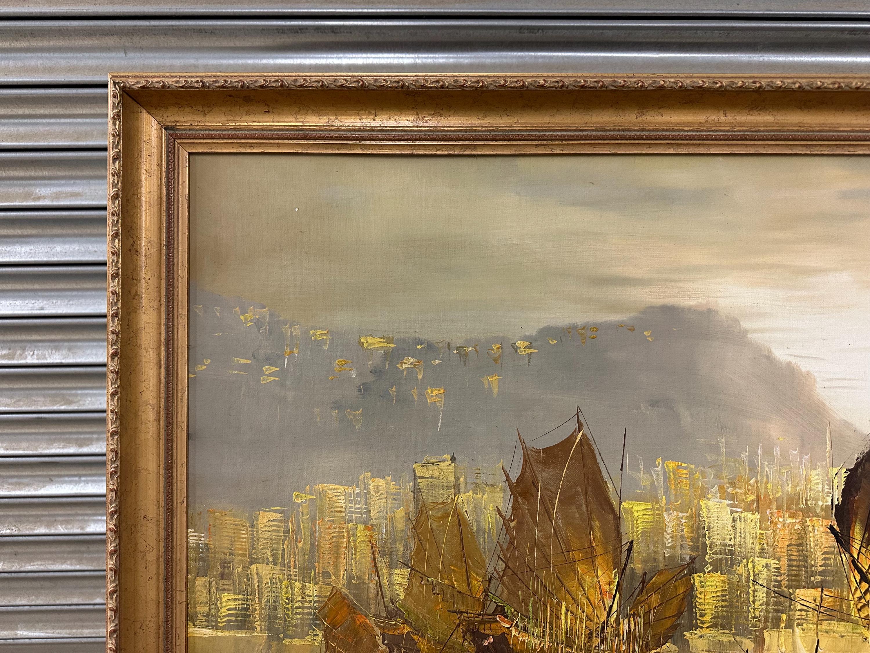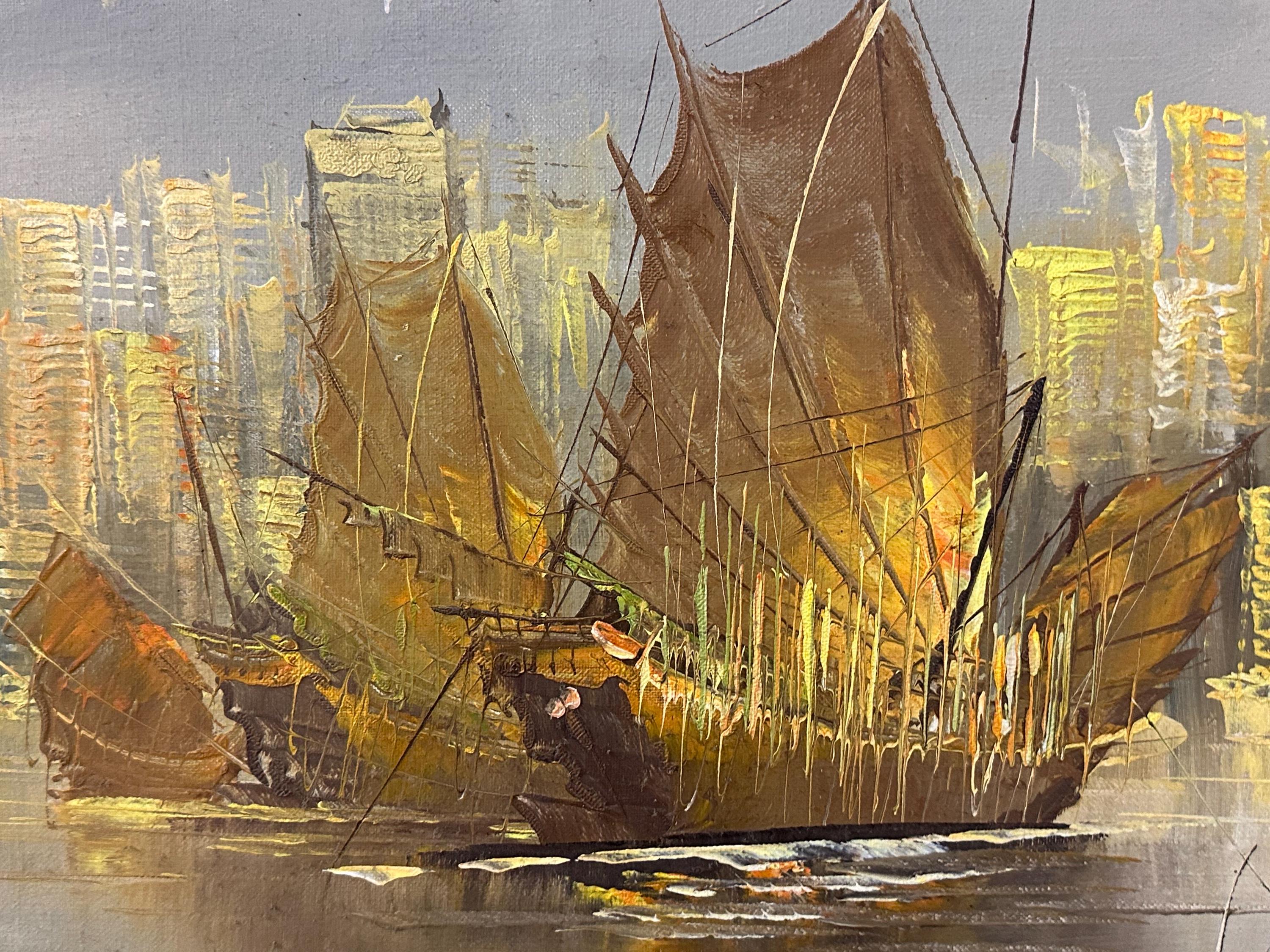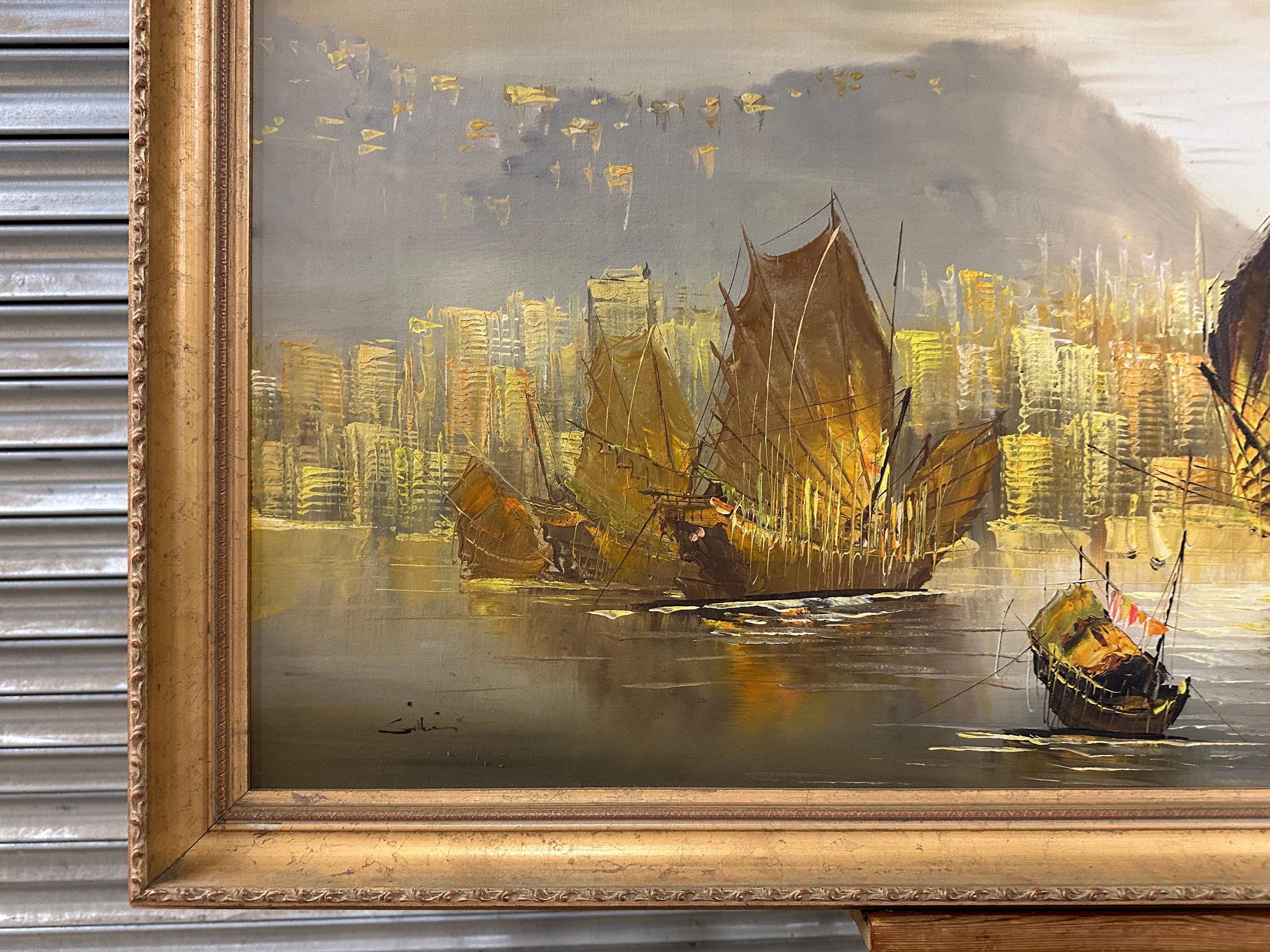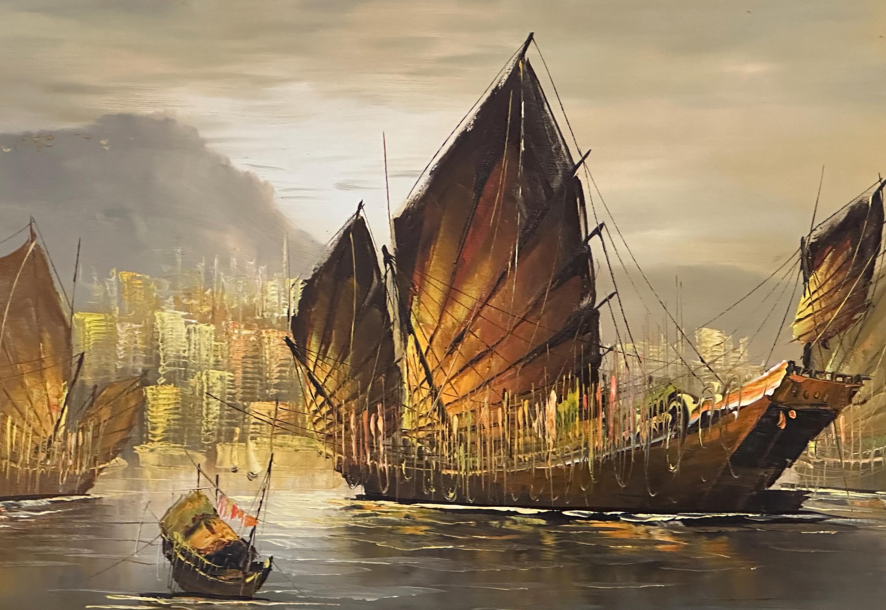 A striking large panoramic oil painting depicting an atmospheric Oriental harbour scene, featuring traditional Chinese junk boats sailing across calm waters with a glowing cityscape beyond β reminiscent of Hong Kong or similar Far Eastern ports.