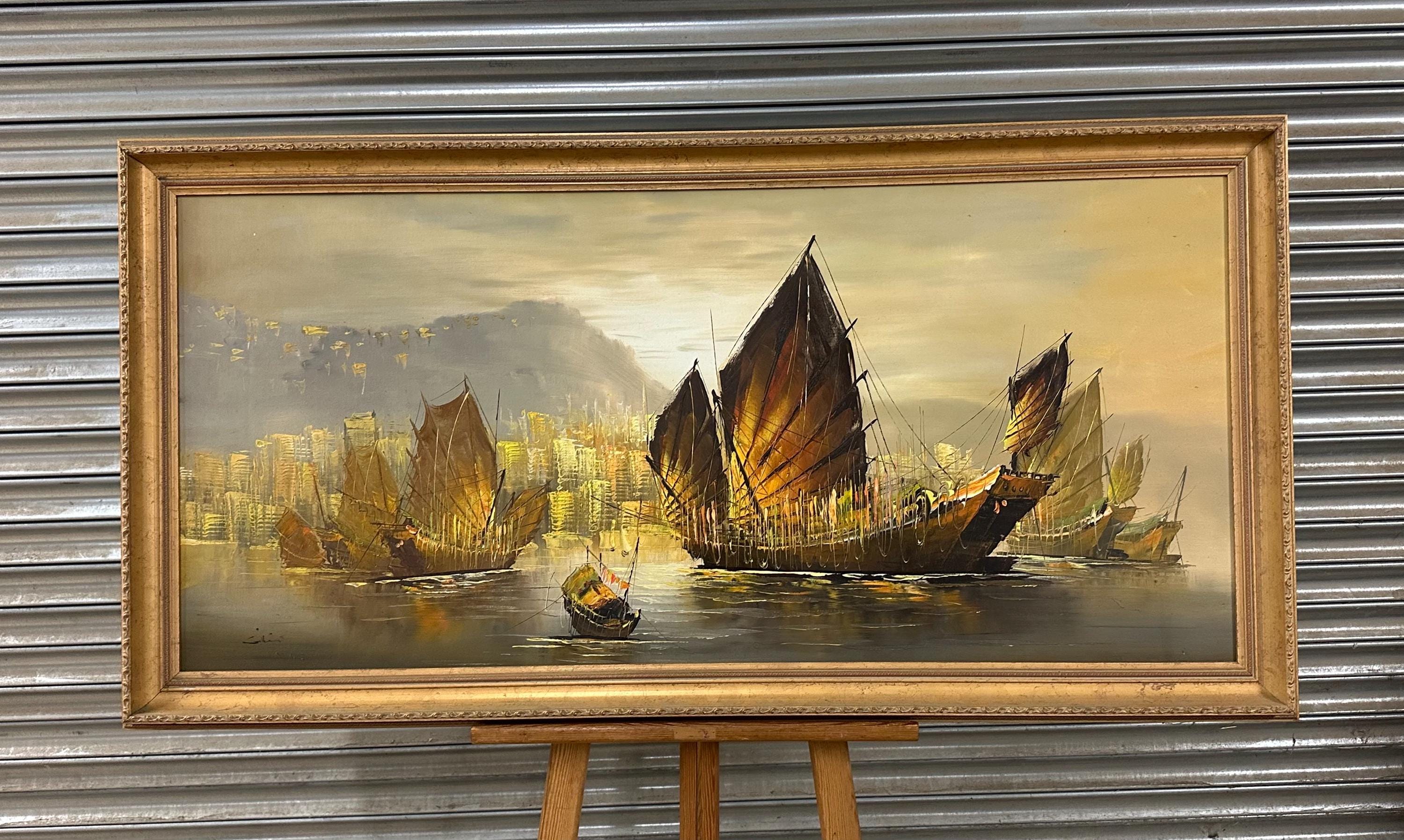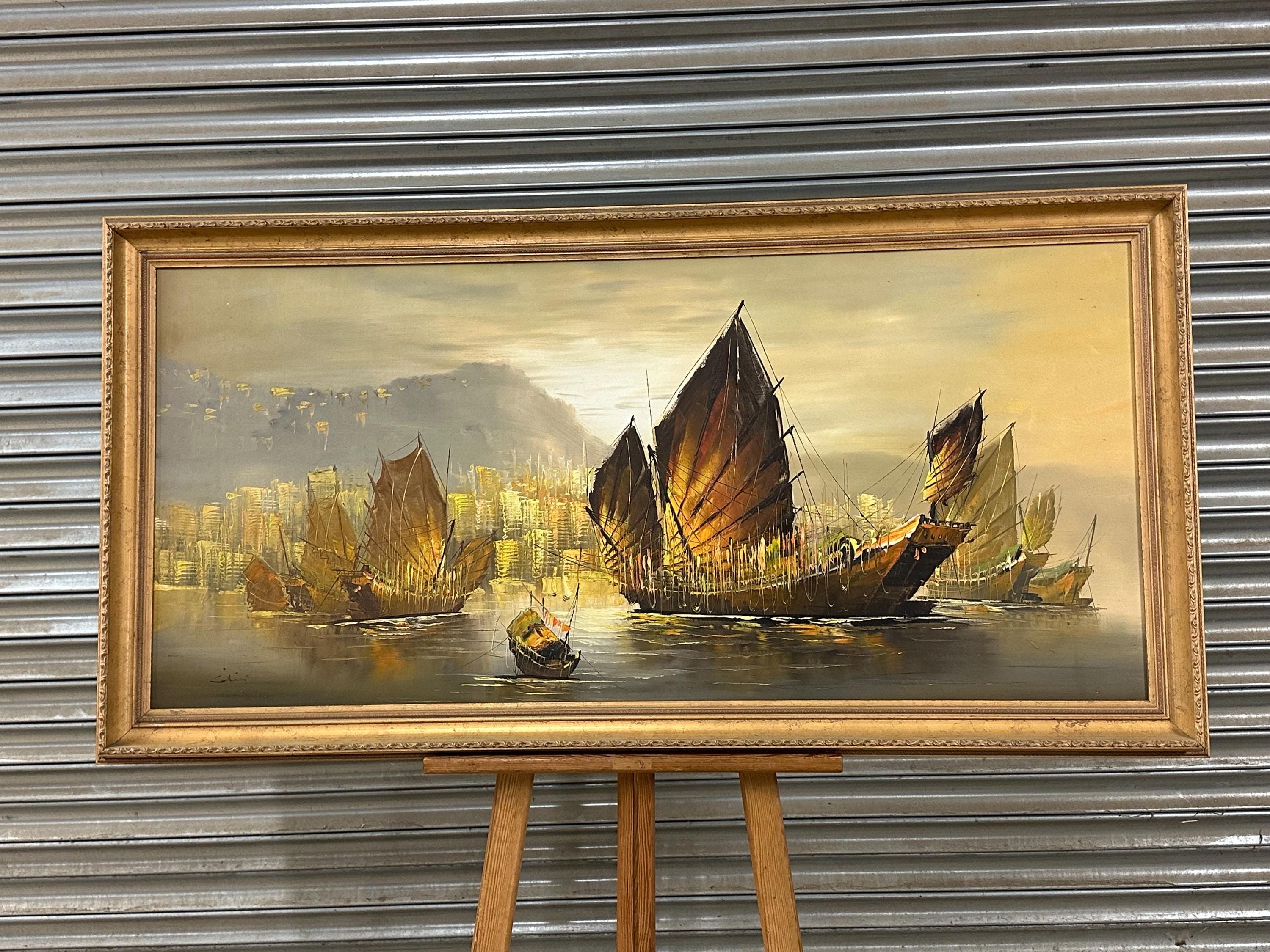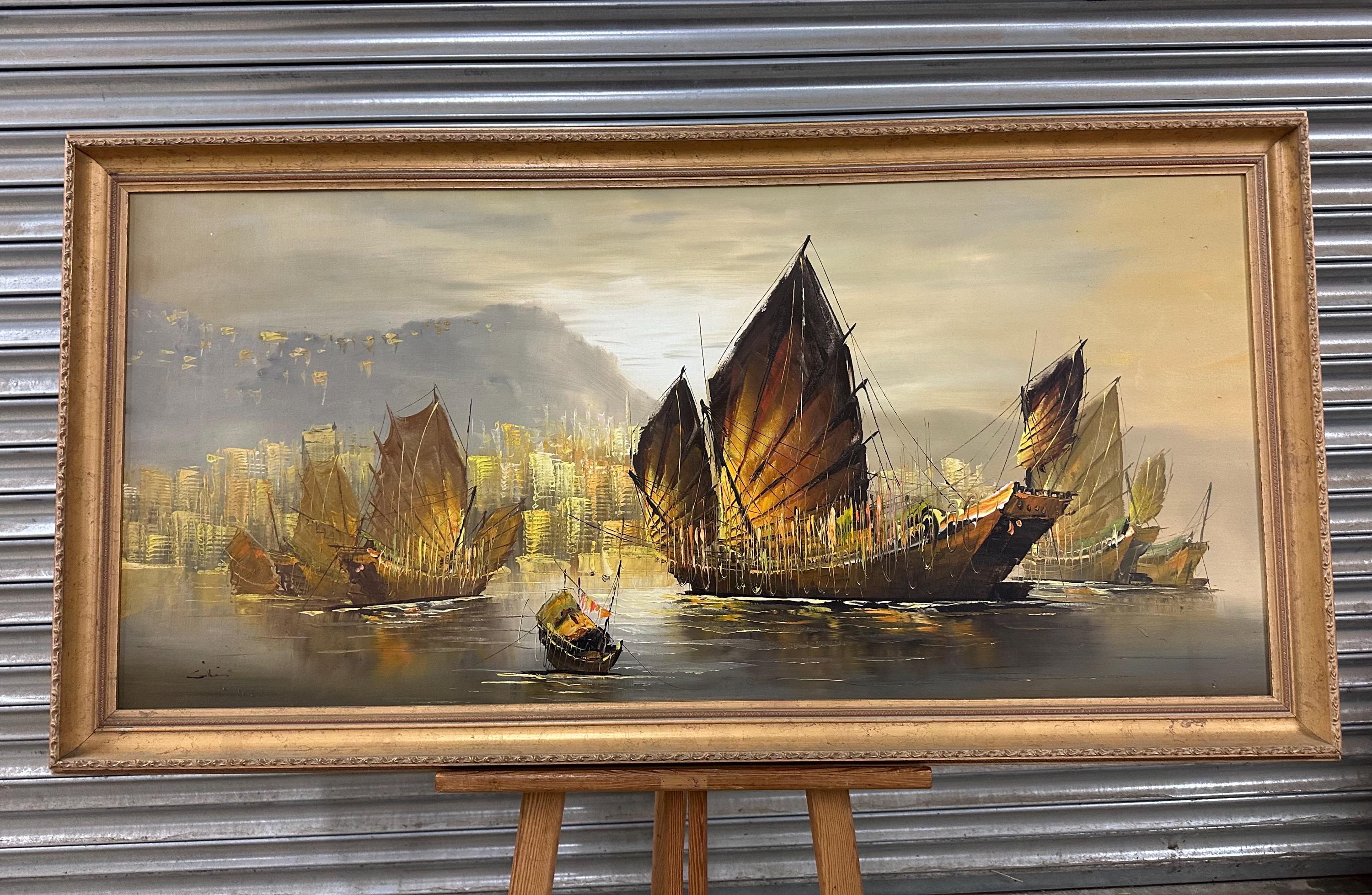π¨ Large Vintage Oil Painting β Oriental Harbour Scene with Junk Boats - Indistinctly signed