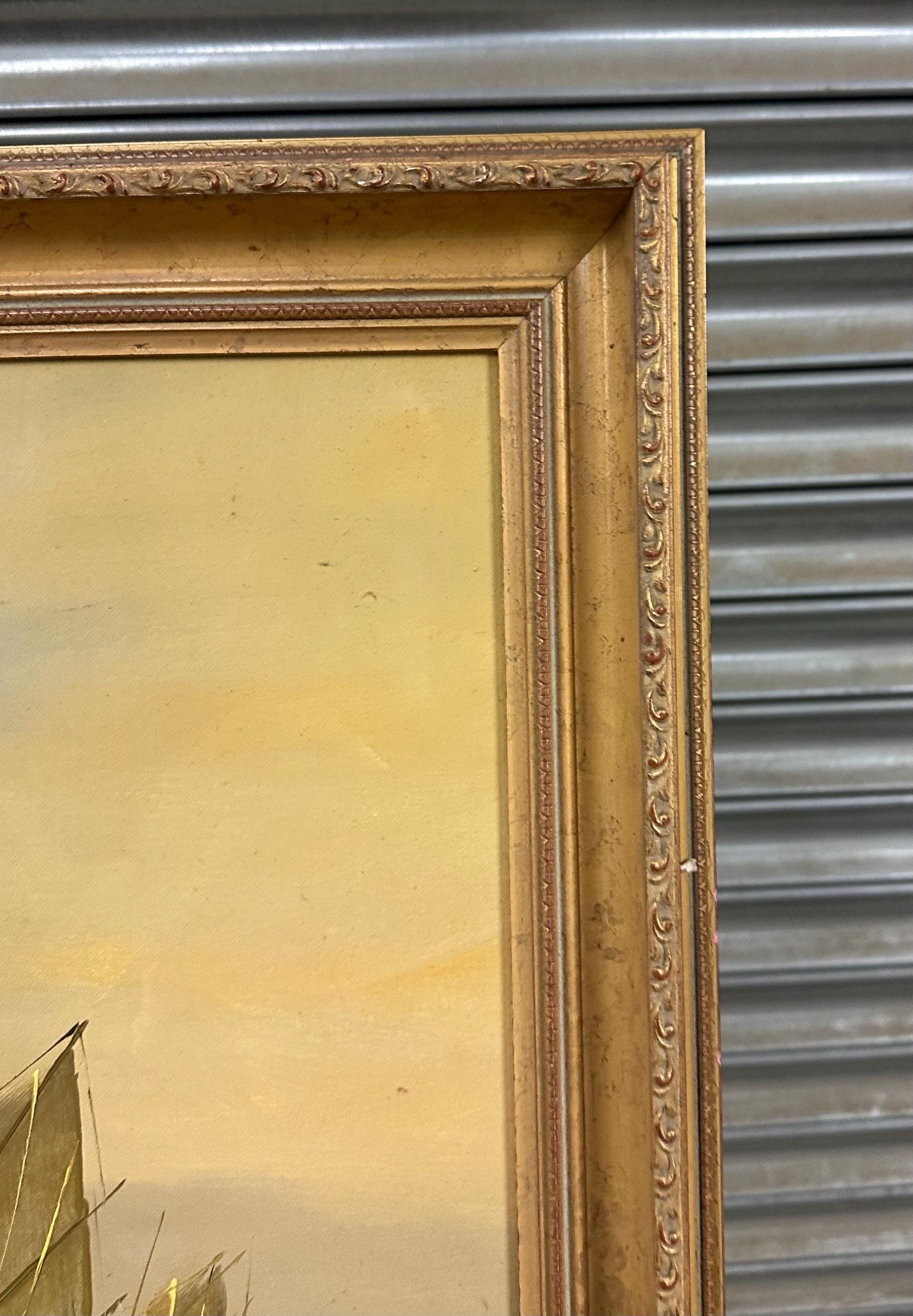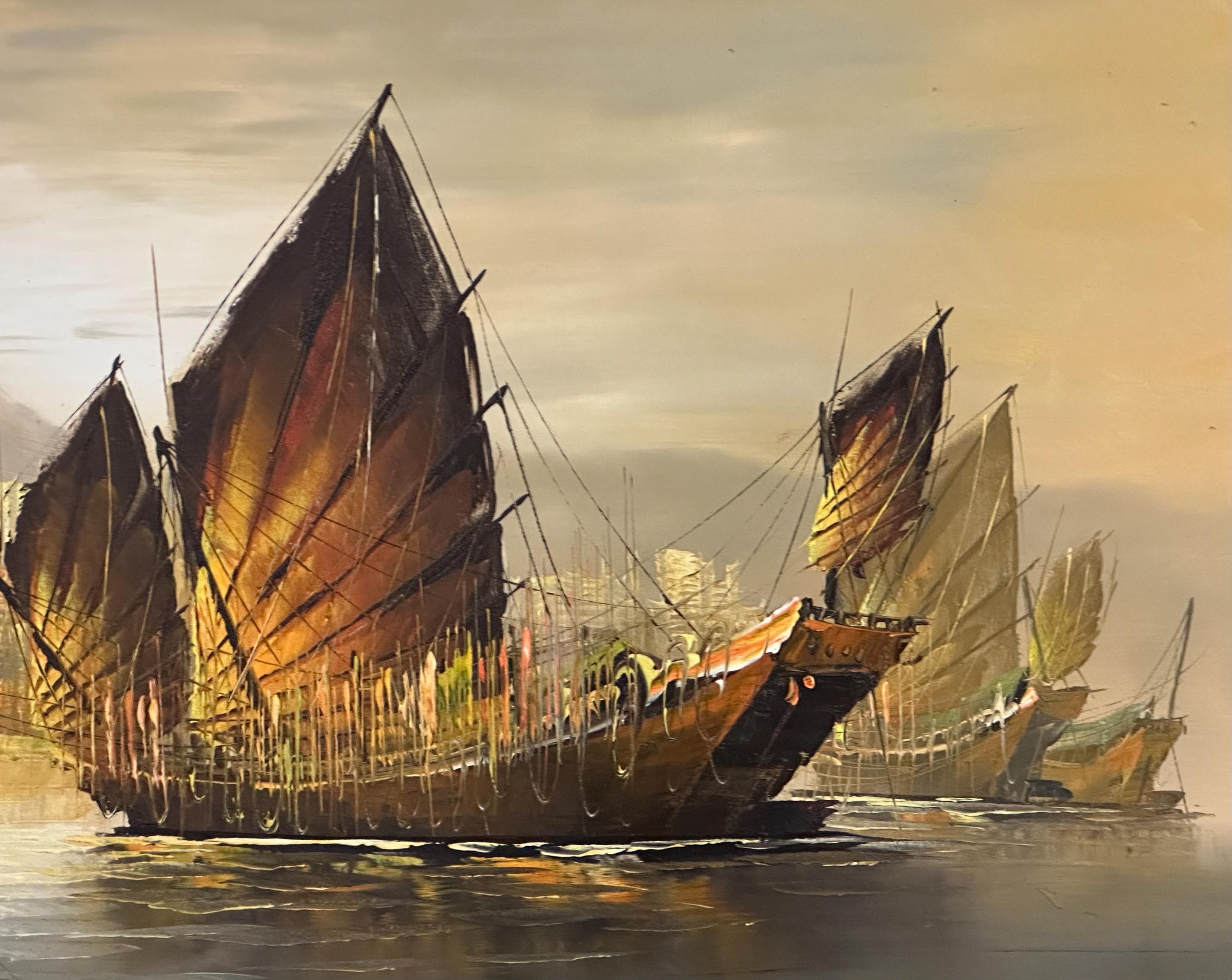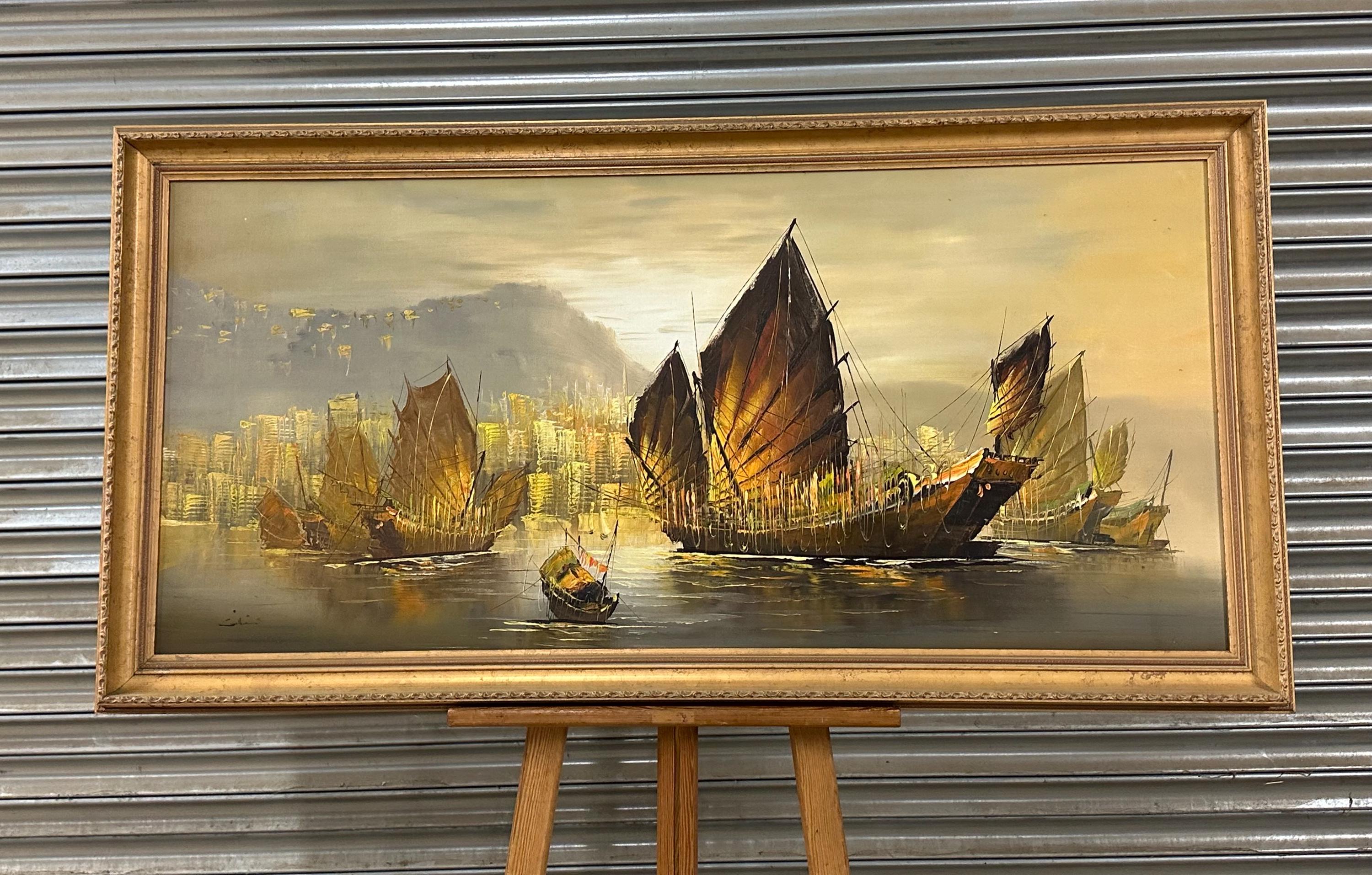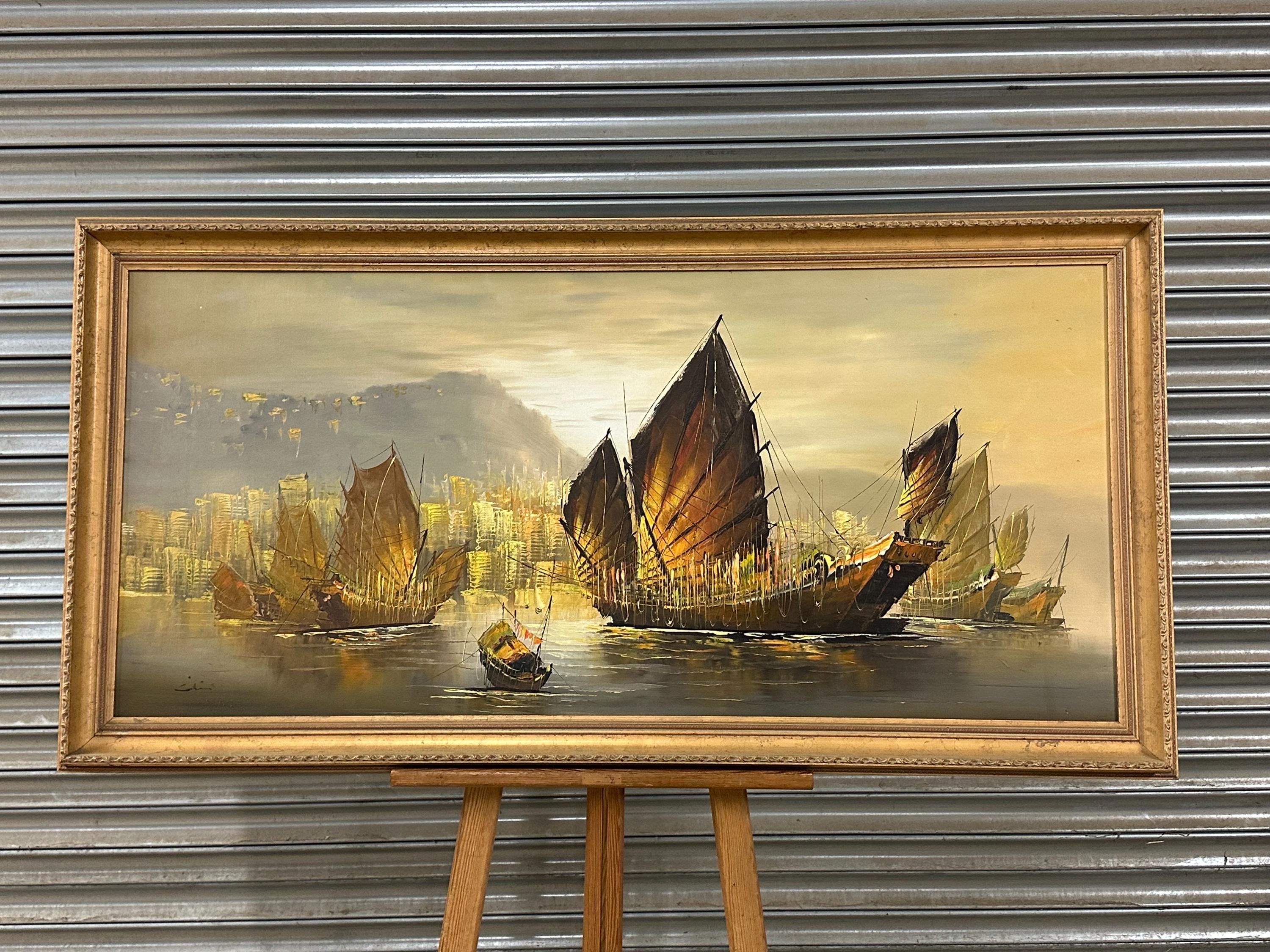 π¨ Large Vintage Oil Painting β Oriental Harbour Scene with Junk Boats - Indistinctly signed