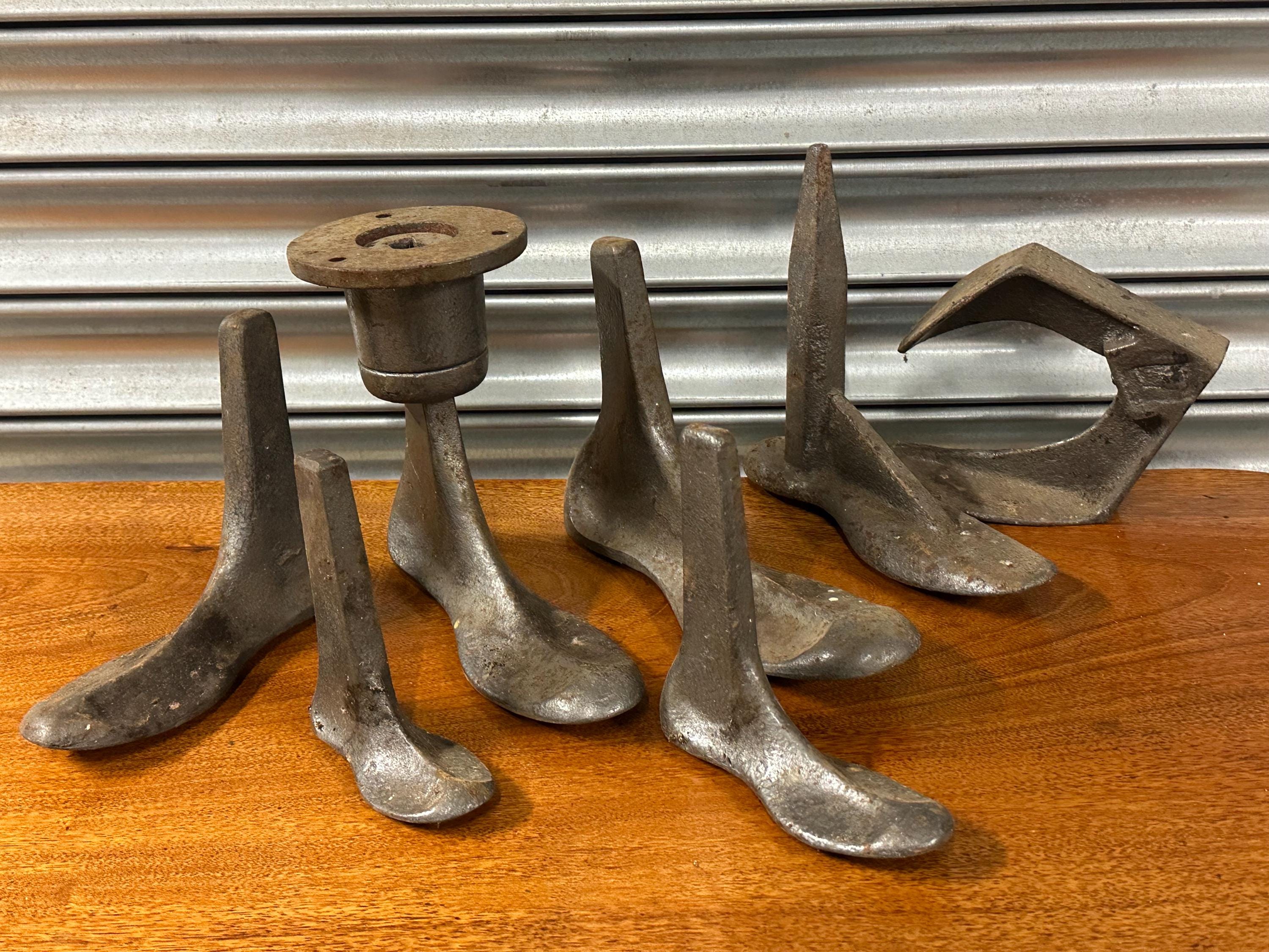 A fantastic mixed set of vintage cast iron cobbler’s / shoemaker’s lasting stakes and anvils, ideal for traditional leatherworking, shoe repair, or as striking industrial décor.