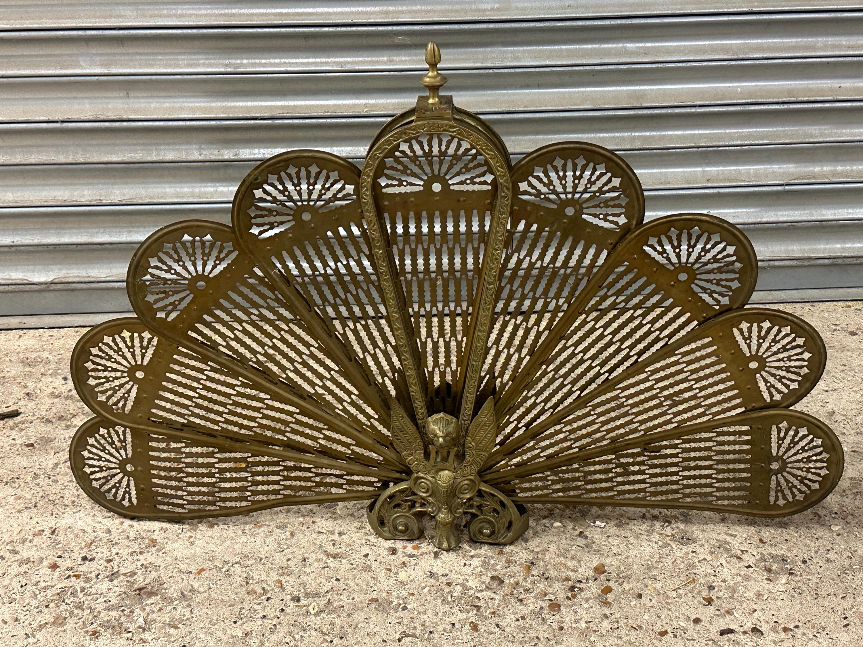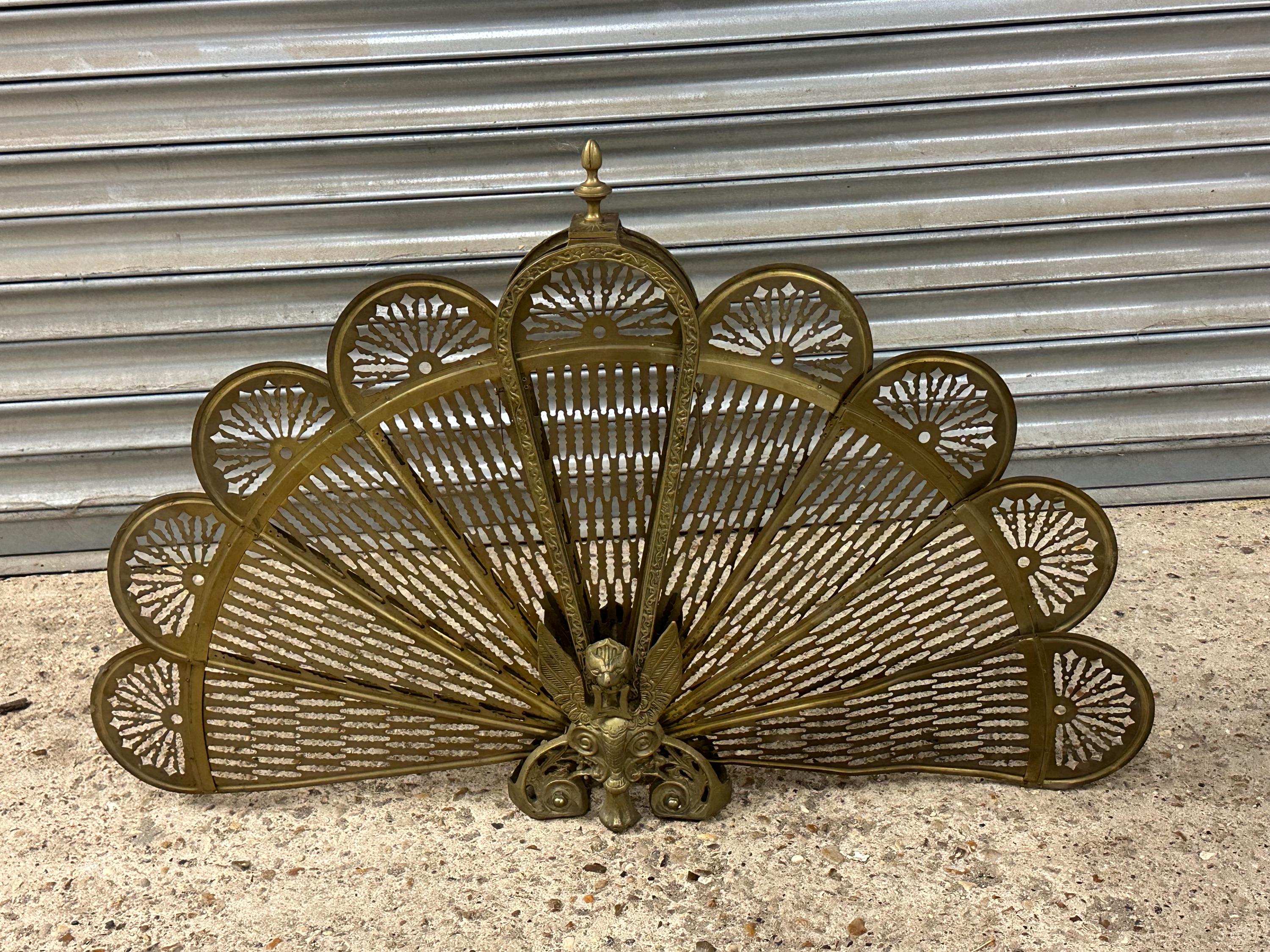Crafted in warm brass, this piece features fold-out articulated wings, allowing it to sit neatly in front of the hearth while creating a dramatic focal point. The central peacock body is finely detailed, with stylised feathers radiating outward in classic Art Deco taste.