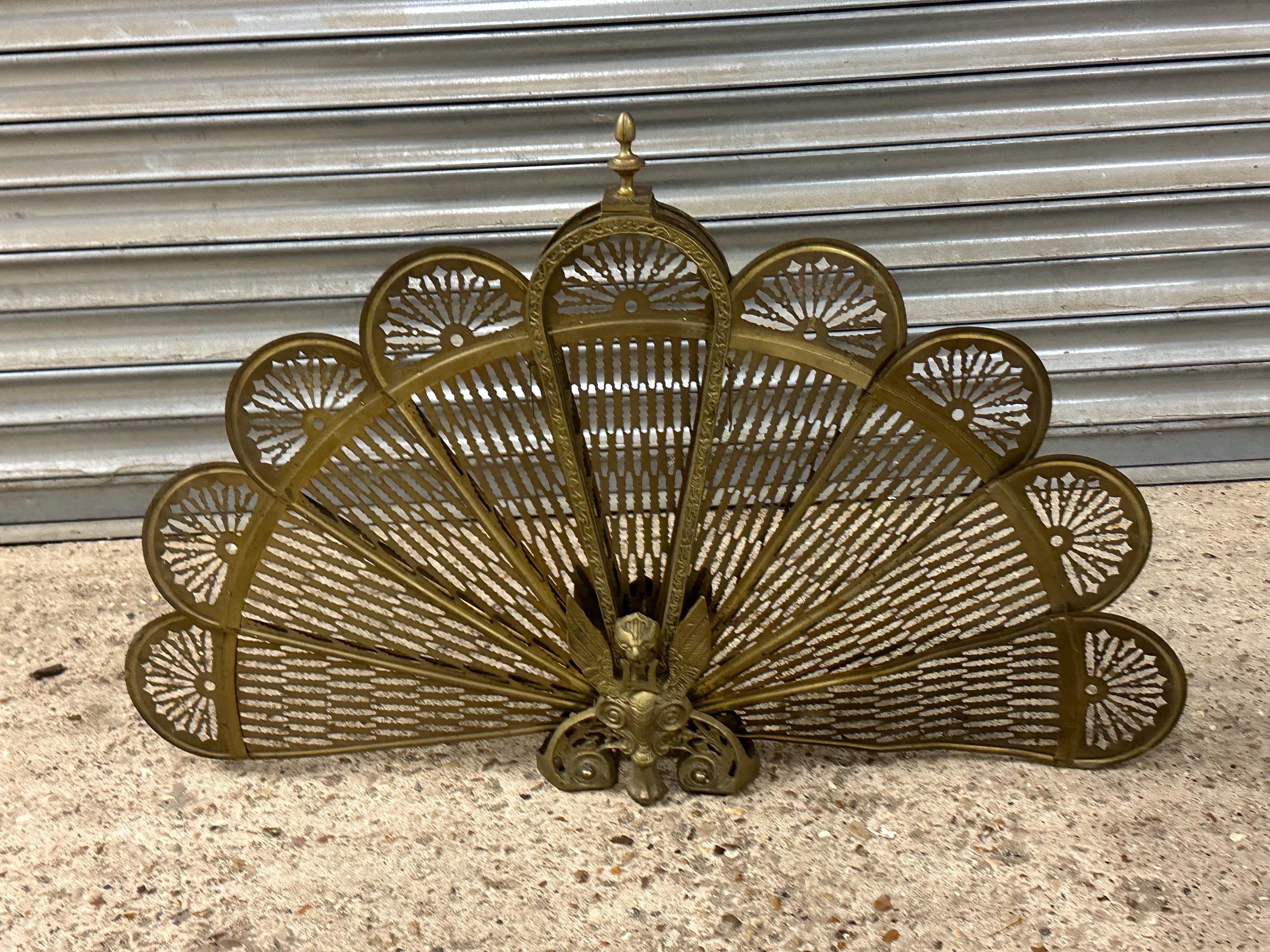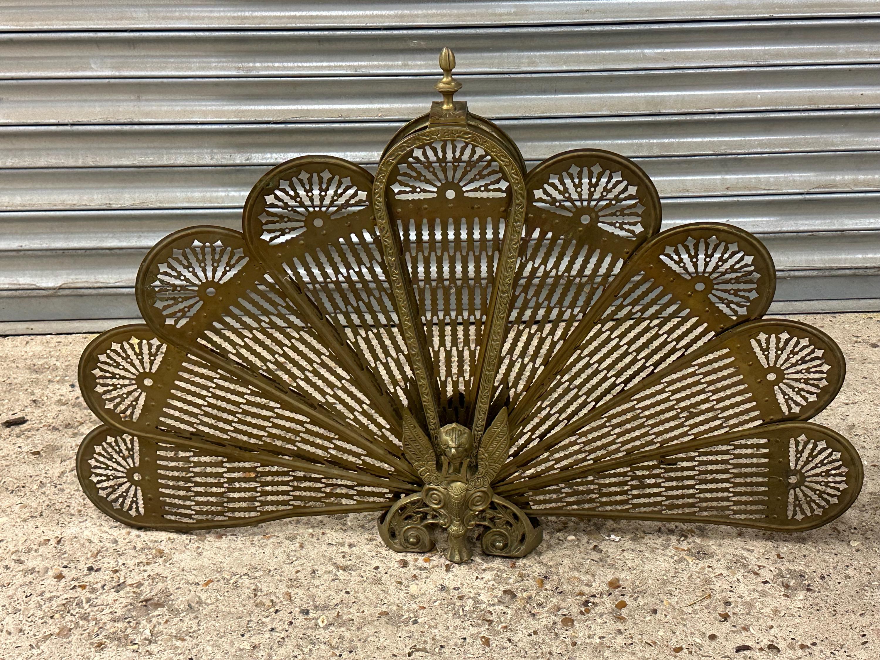 A striking and highly decorative early 20th-century brass peacock fireplace screen, dating to around the 1920s–1930s, beautifully formed as a fan-shaped peacock with pierced feather panels and ornate cast base.
