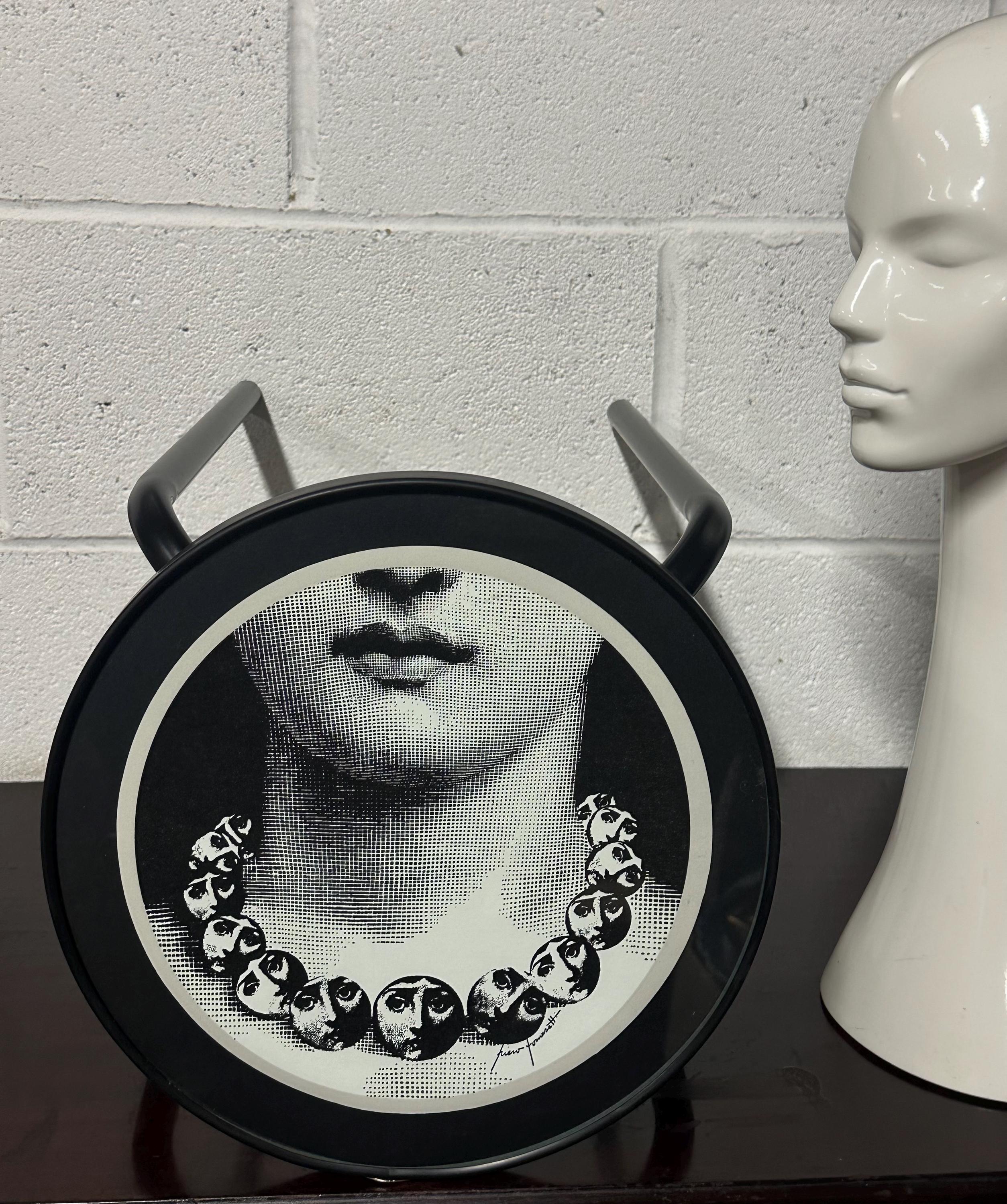This stylish occasional table showcases a monochrome portrait top set within a black circular surround, supported by three sleek black legs. Inspired by Fornasetti’s celebrated Tema e Variazioni series, it makes a bold statement piece for any interior – perfect beside a sofa, armchair, or as a unique bedside table.